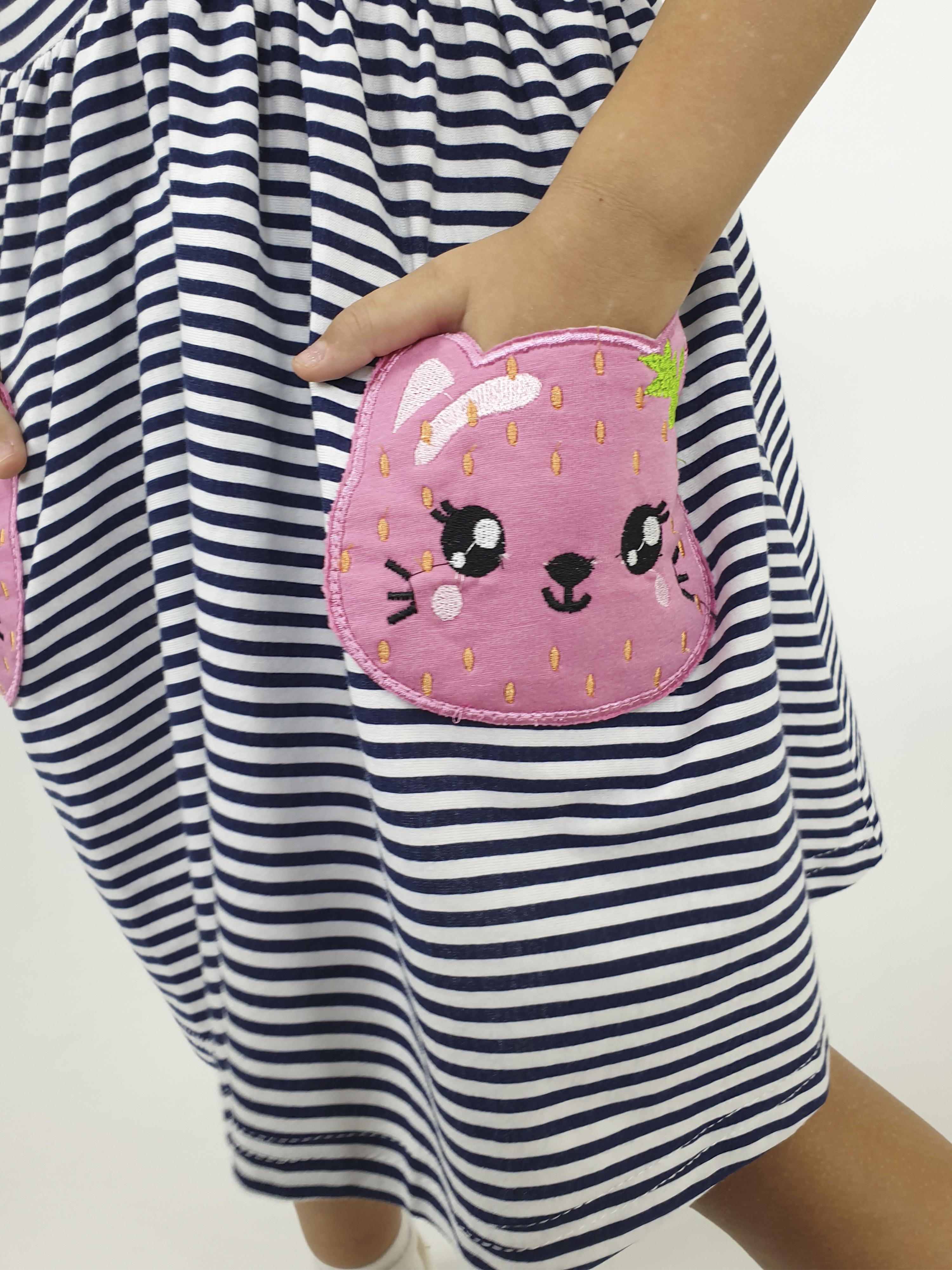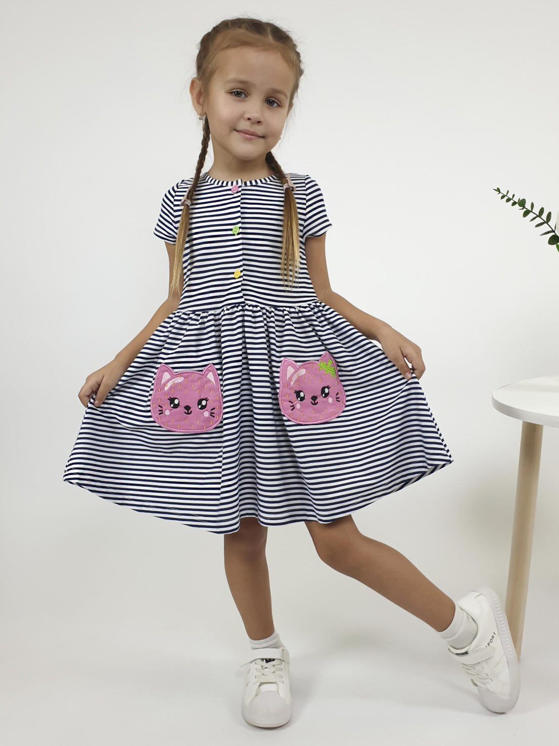 Кулирное полотно (набивка): 100% х/б. Платье-приталенного силуэта,отрезная юбка со сборкой и два накладных-вышитых кармана.Короткий рукав,застежка по переду на пуговицы.Горловина окантована.