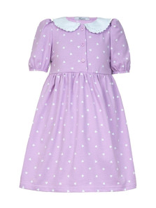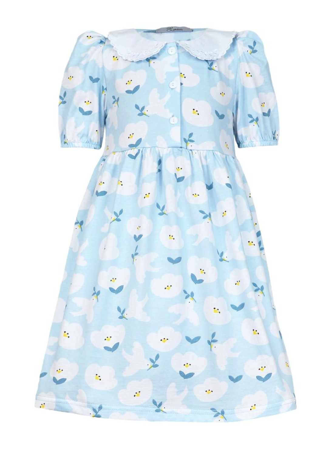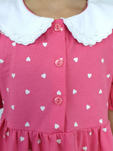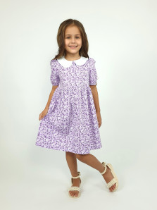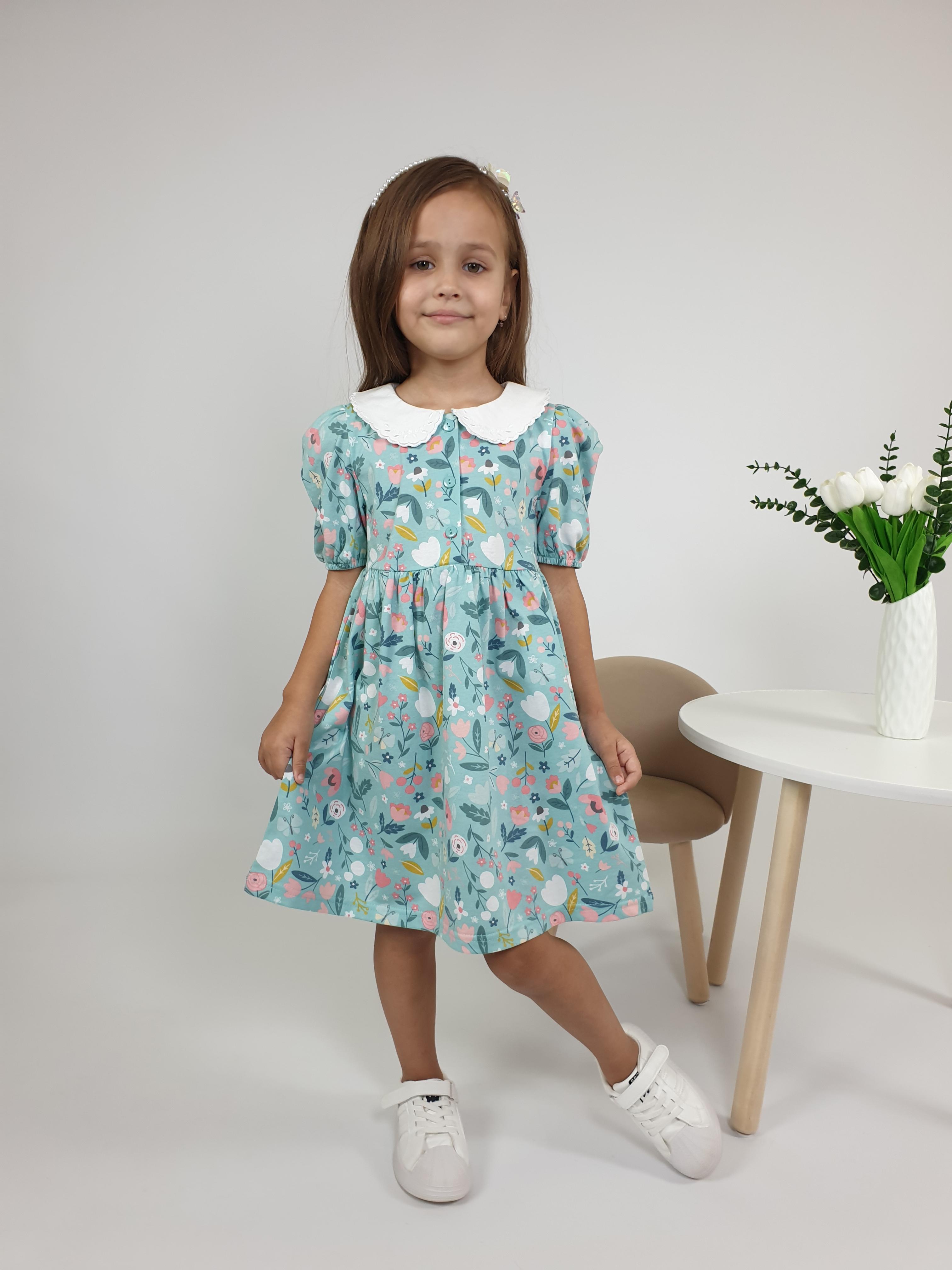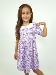Кулирное полотно(набивка):100% х/б. Платье-с отрезной юбкой в сборку.Короткий рукав с резинкой внизу,сборка по окату.Горловина окантована и подшита.Вышитый отделочный воротник,настрочен на окантовку.Застежка центральная на пуговицы.
