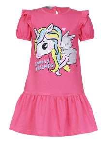 Кулирное полотно:100% х/б. Платье-силуэт трапеция,короткий рукав "фонарик" на резинке,в пройму вставлена рюша.Юбка отрезная со сборкой.Горловина окантована,застежка по спинке на пуговицу.Печать на переде.