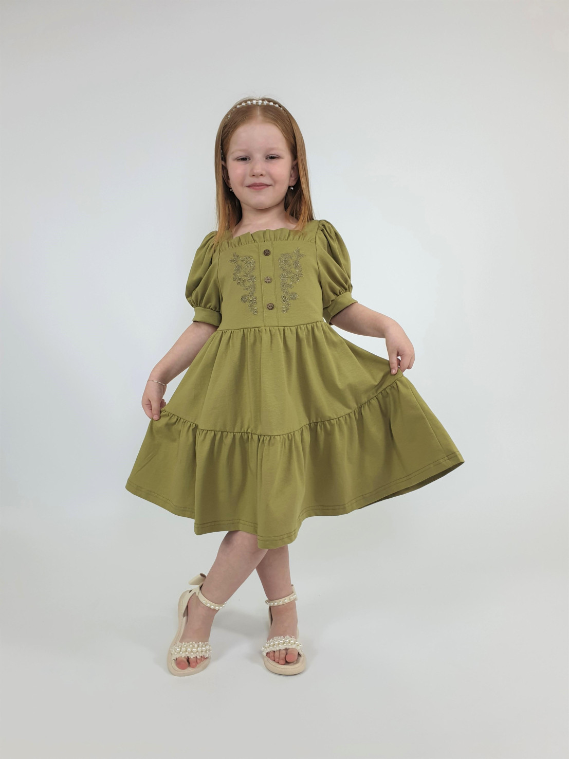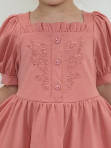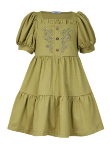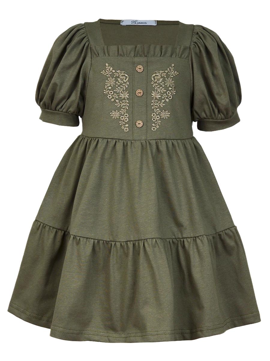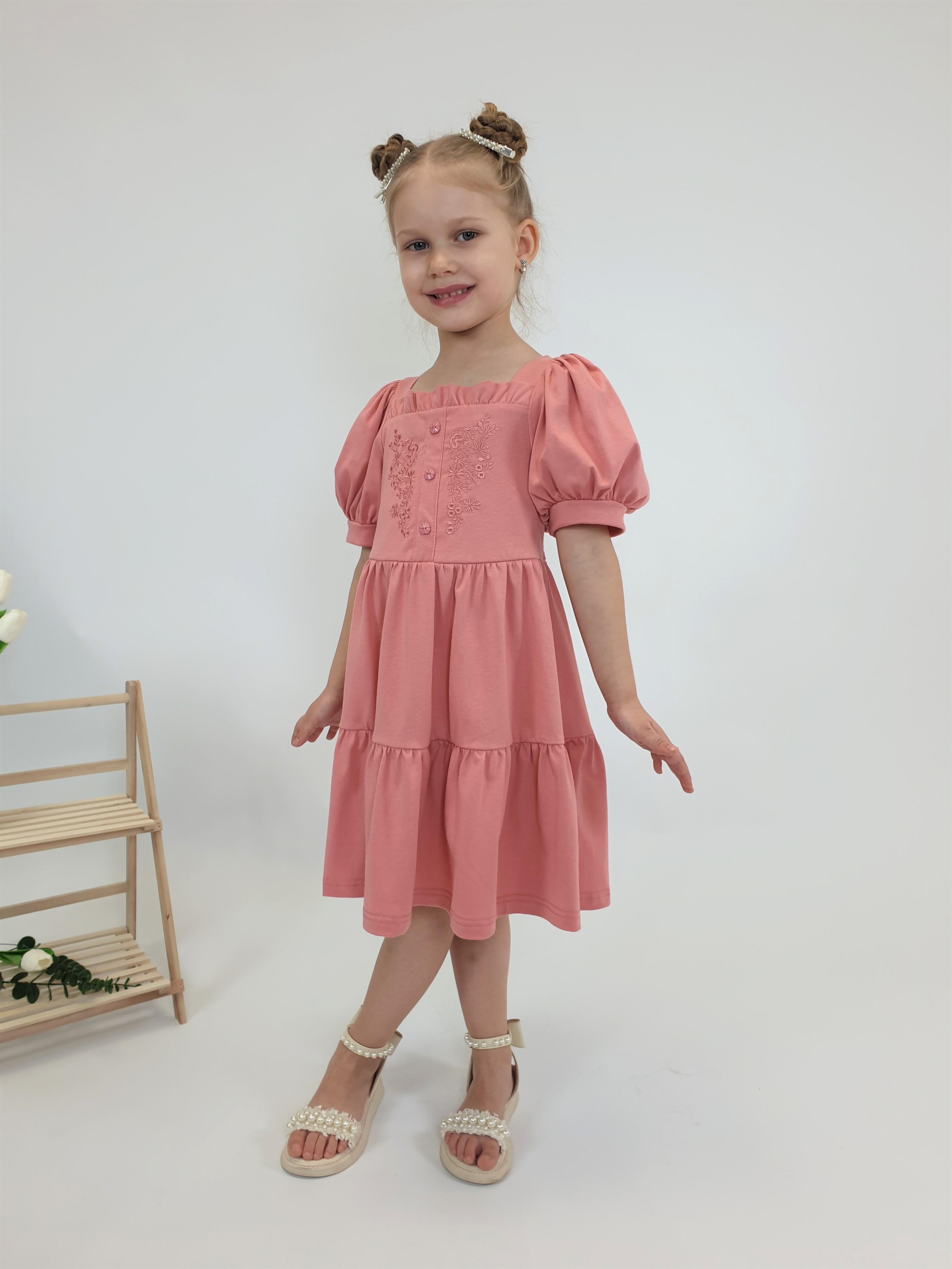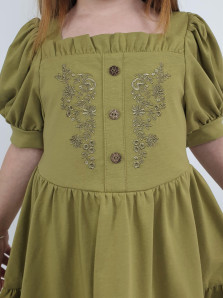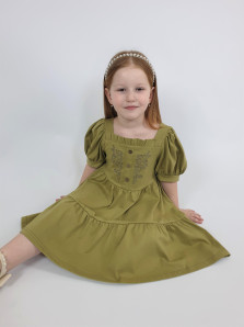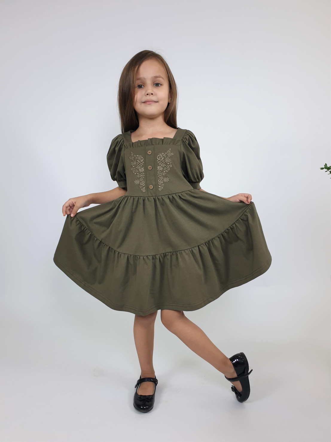 Кулирное полотно:100% х/б. Платье-свободное с поясом,с отрезной юбкой из двух воланов со сборкой.Короткий рукав (объемный) фонарик на манжете. Перед на подкладке с вышивкой,имитация застежки с декоративными пуговицами.Вырез квадратный с рюшей,горловина спинки окантована.