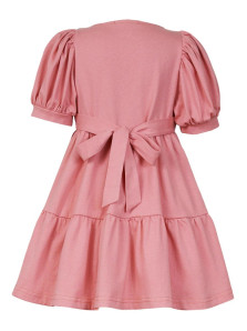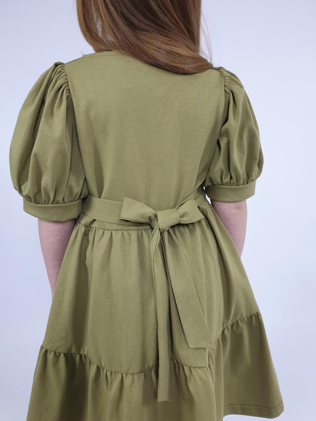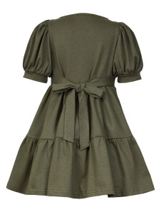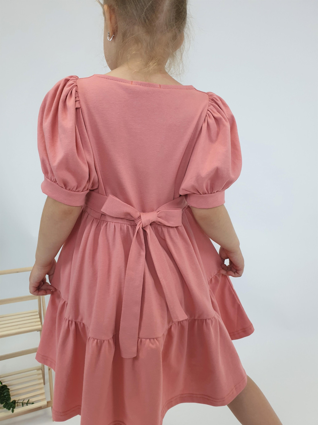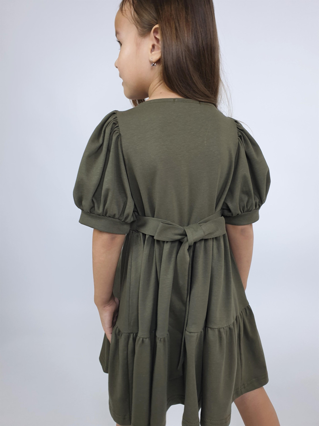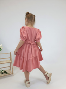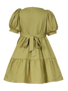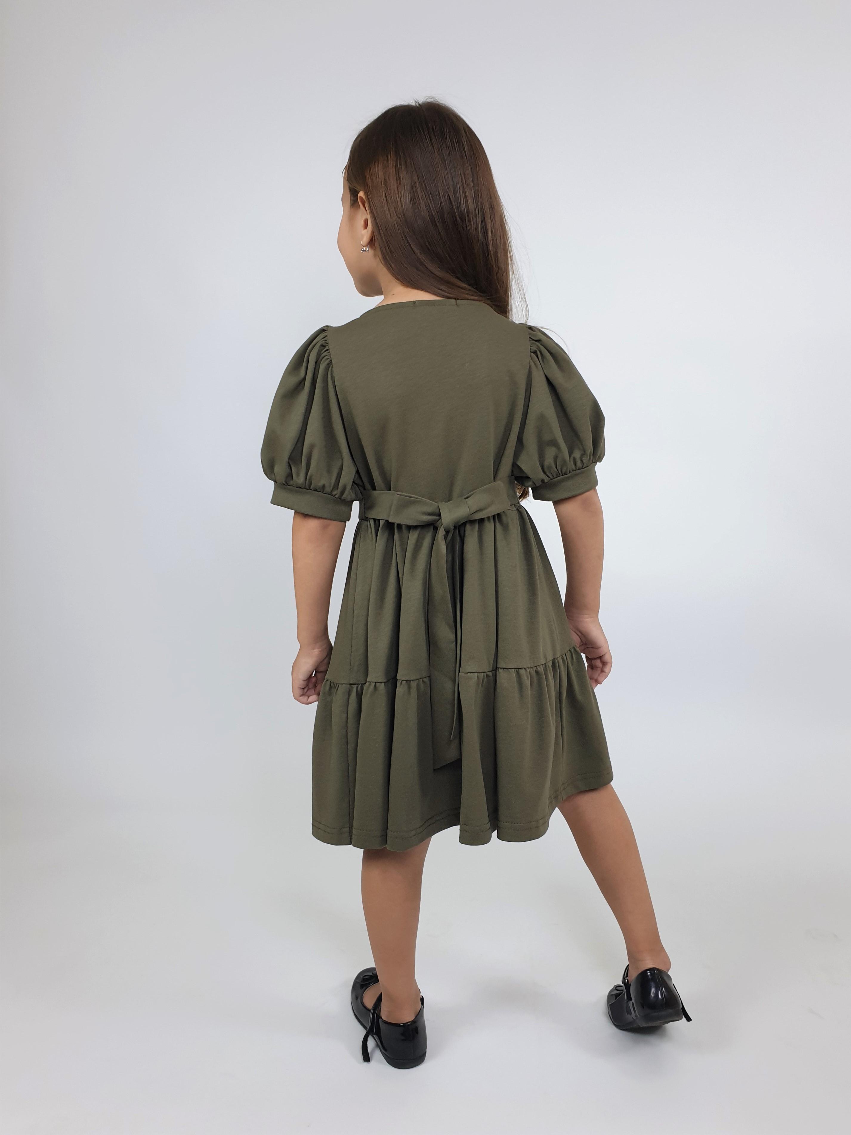 Кулирное полотно:100% х/б. Платье-свободное с поясом,с отрезной юбкой из двух воланов со сборкой.Короткий рукав (объемный) фонарик на манжете. Перед на подкладке с вышивкой,имитация застежки с декоративными пуговицами.Вырез квадратный с рюшей,горловина спинки окантована.