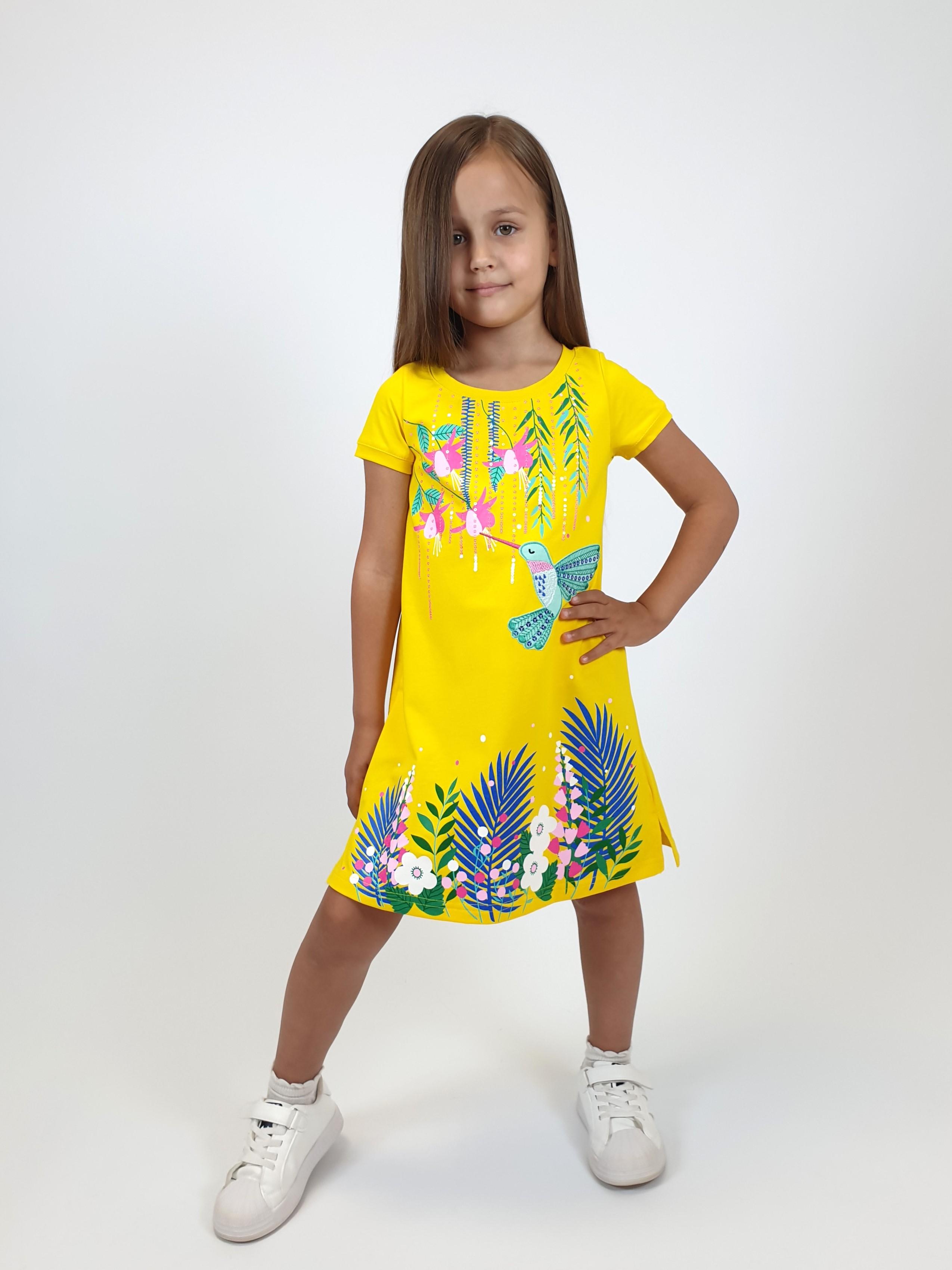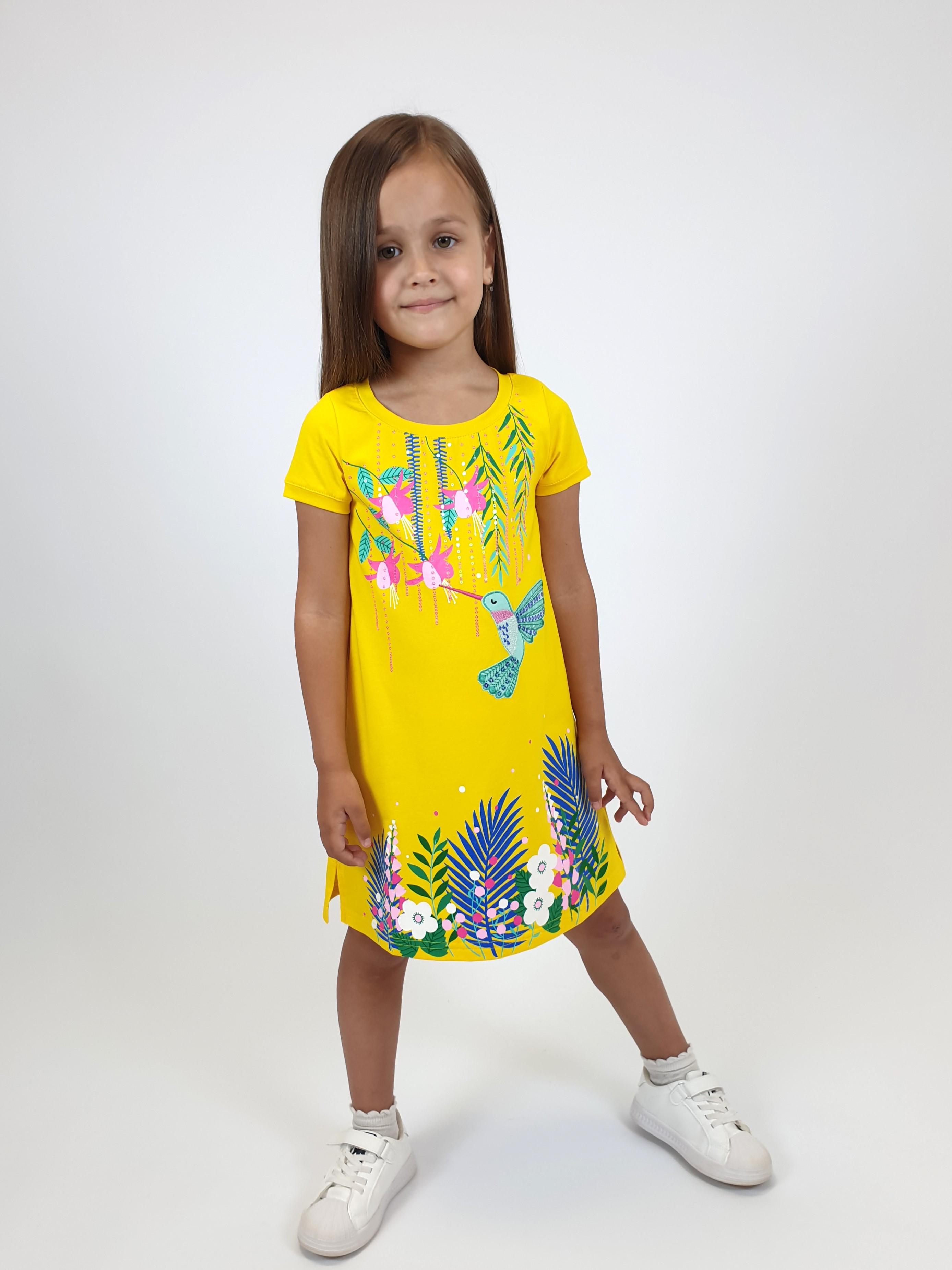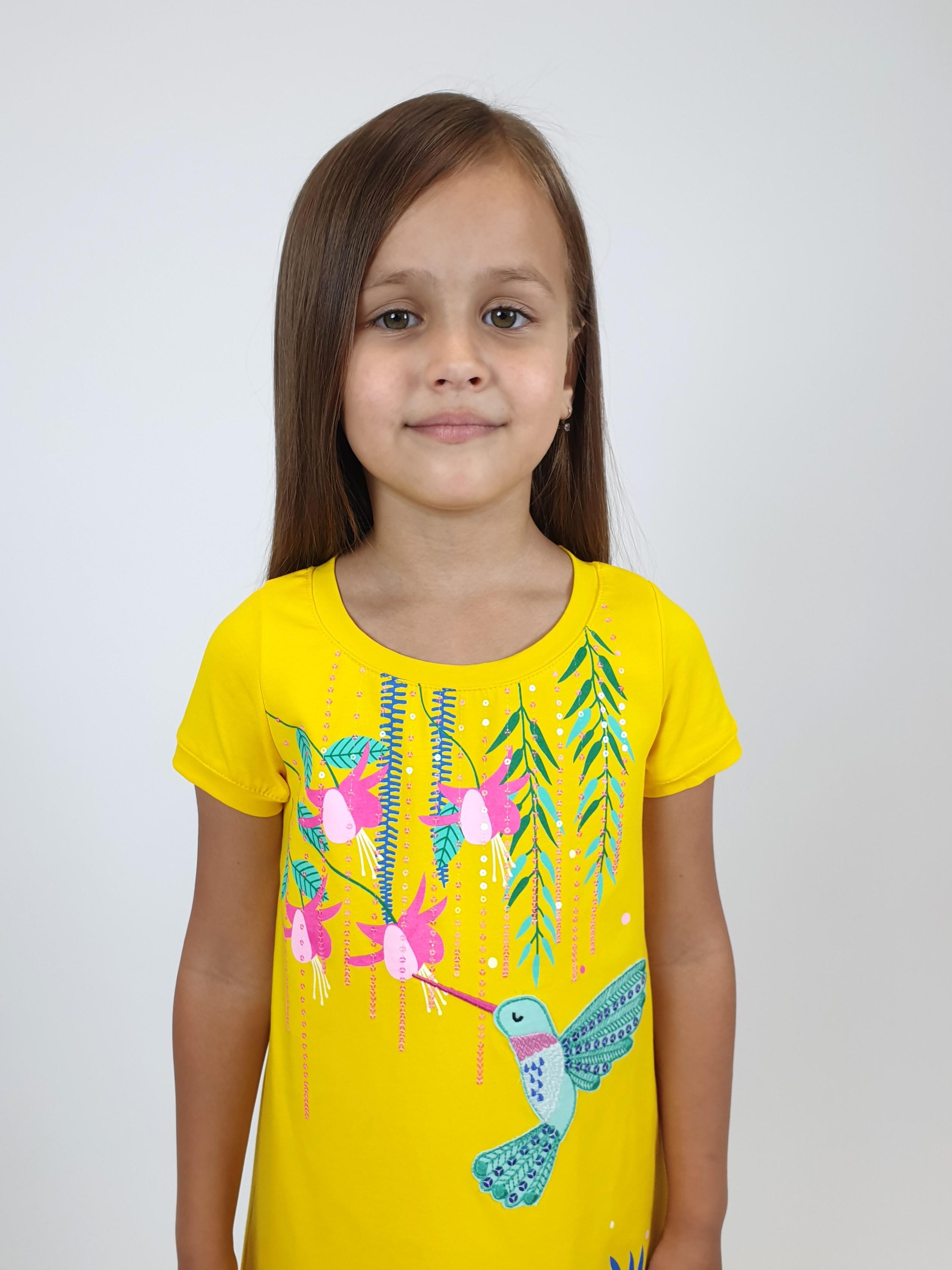 Кулирное полотно:95% х/б,5% лайкра. Платье-силуэт трапеция,короткий втачной рукав на манжете.Перед с печатью и вышивкой-аппликацией,пайетки,сбоку разрезы.Горловина обработана планкой.