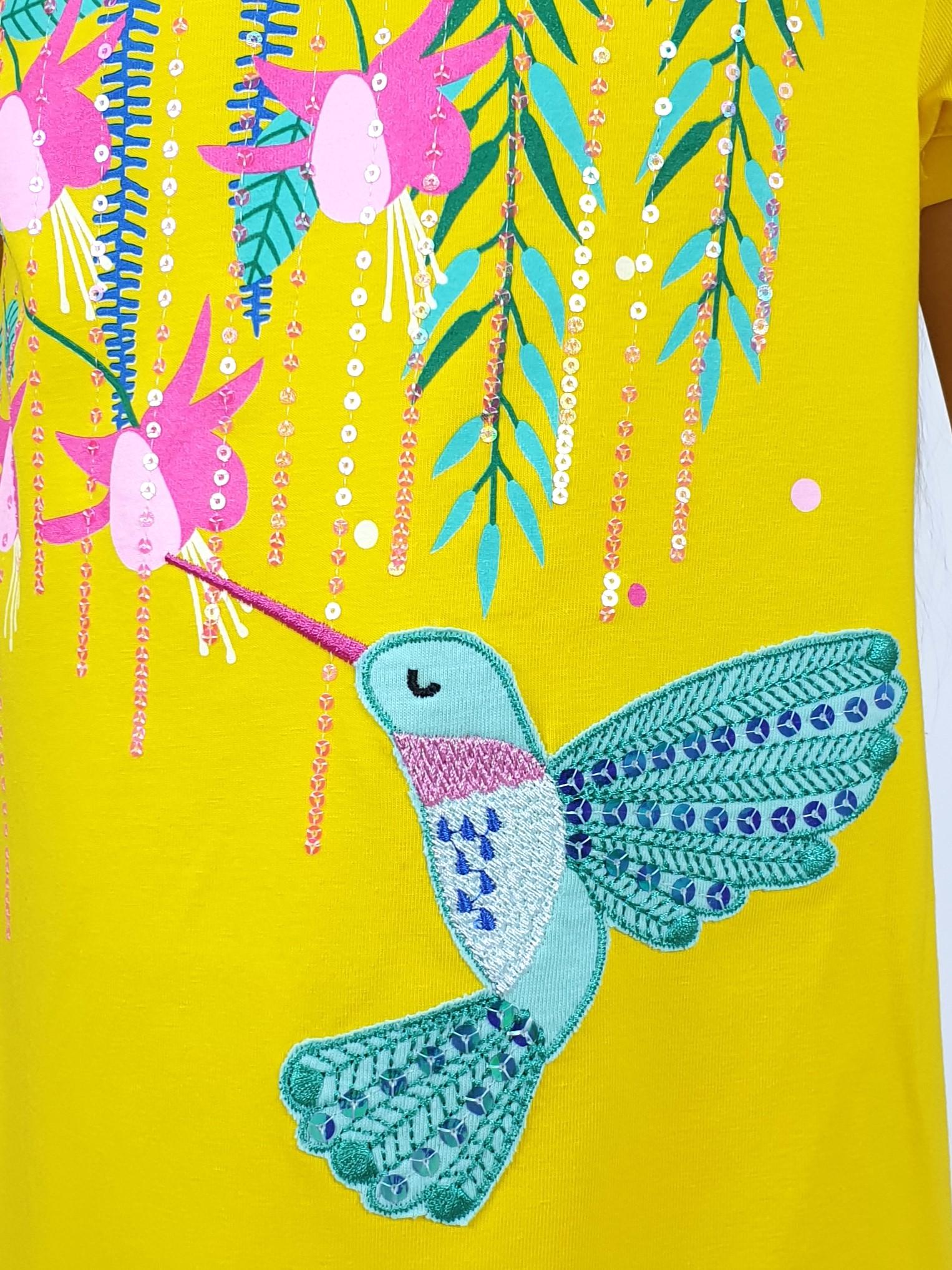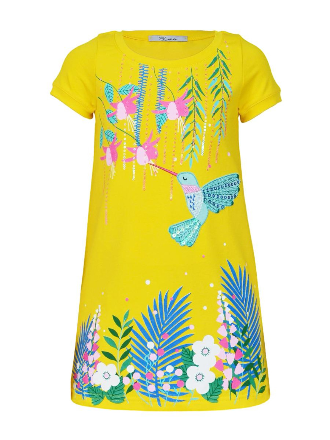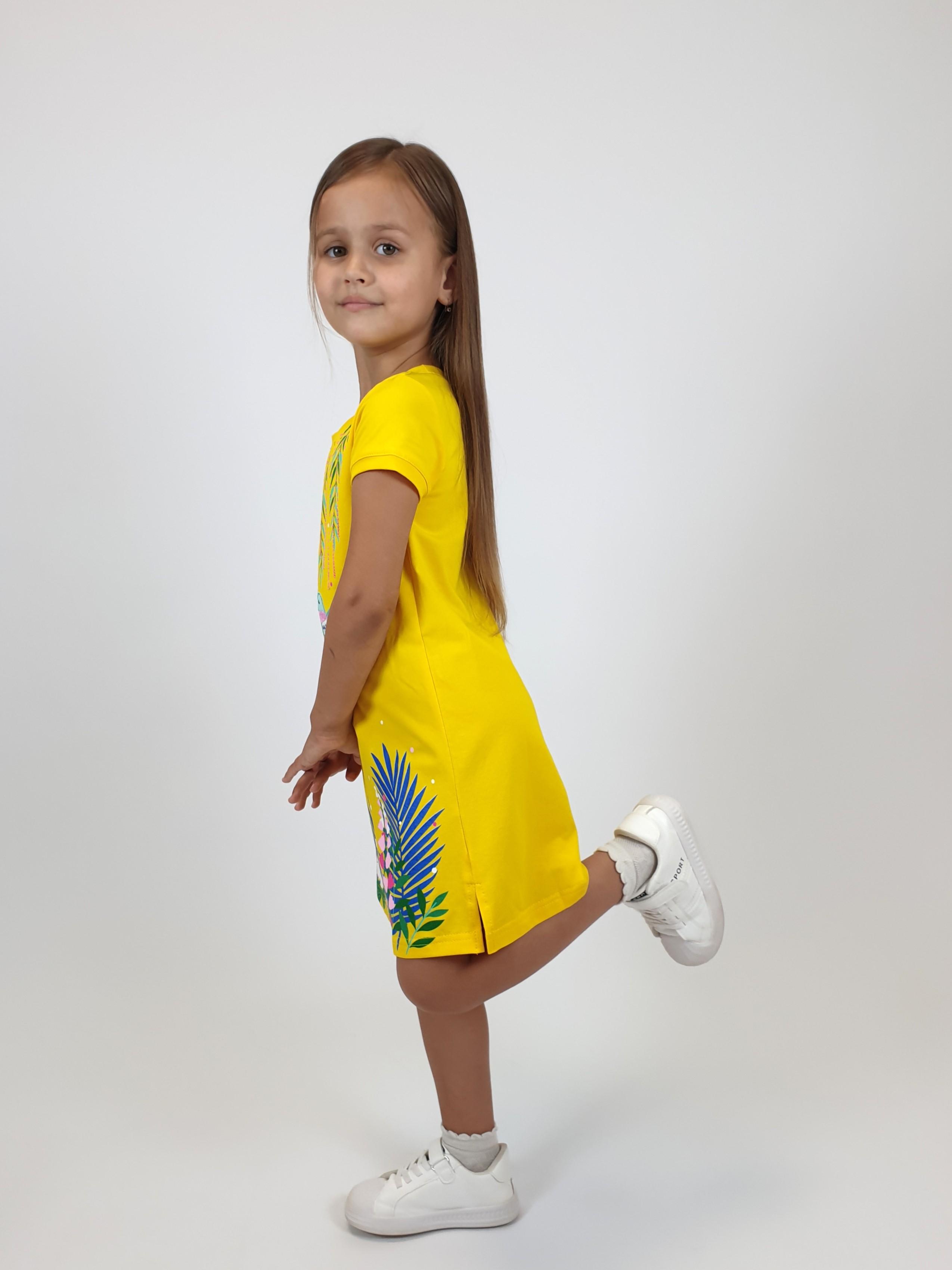 Кулирное полотно:95% х/б,5% лайкра. Платье-силуэт трапеция,короткий втачной рукав на манжете.Перед с печатью и вышивкой-аппликацией,пайетки,сбоку разрезы.Горловина обработана планкой.