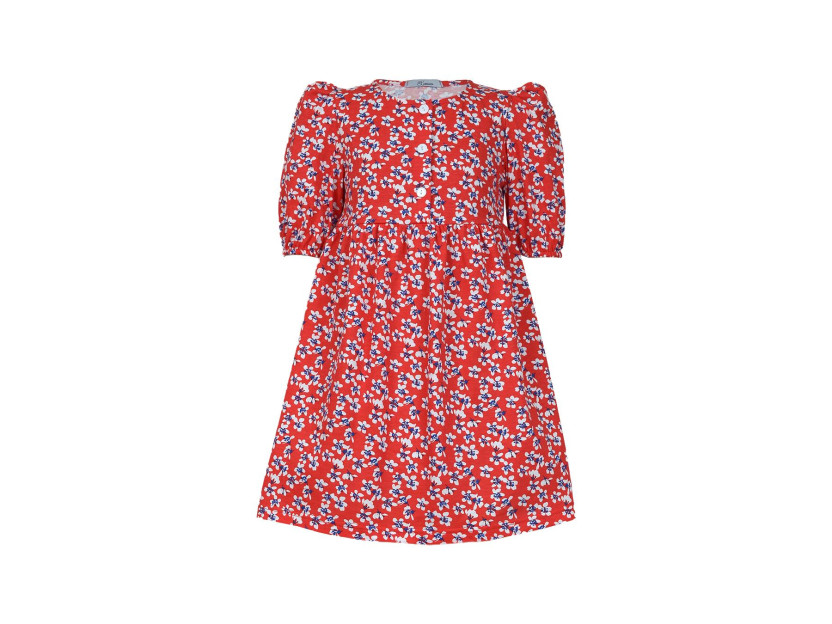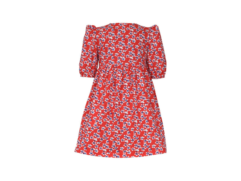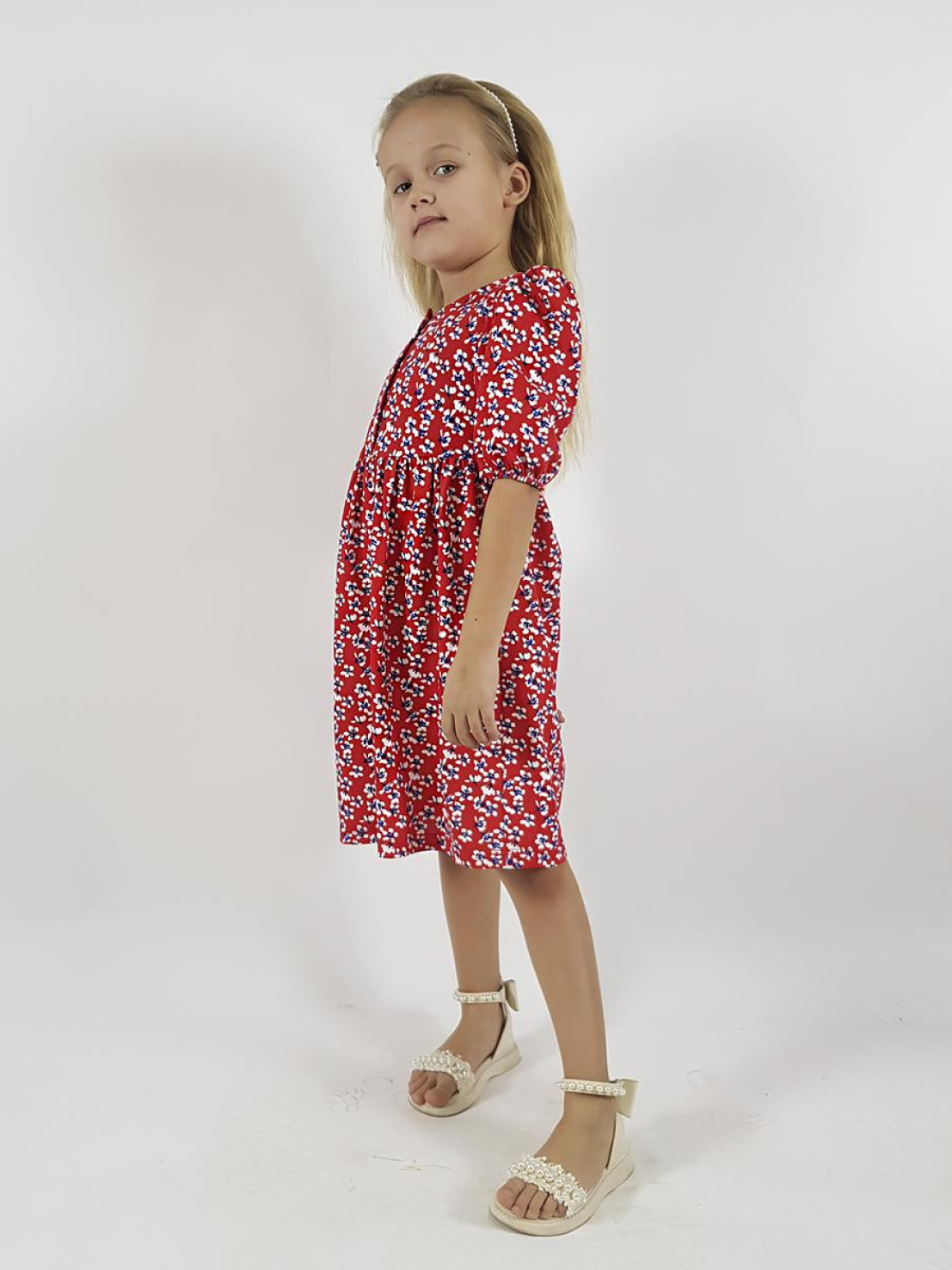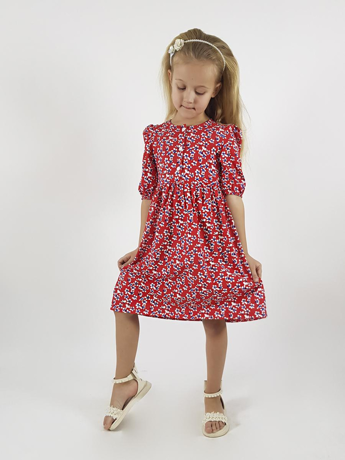 Кулирное полотно (набивка): 100% х/б. Платье-с отрезной юбкой в сборку.Короткий рукав с резинкой внизу,сборка по окату.Горловина окантована и подшита,застежка центральная на пуговицы.