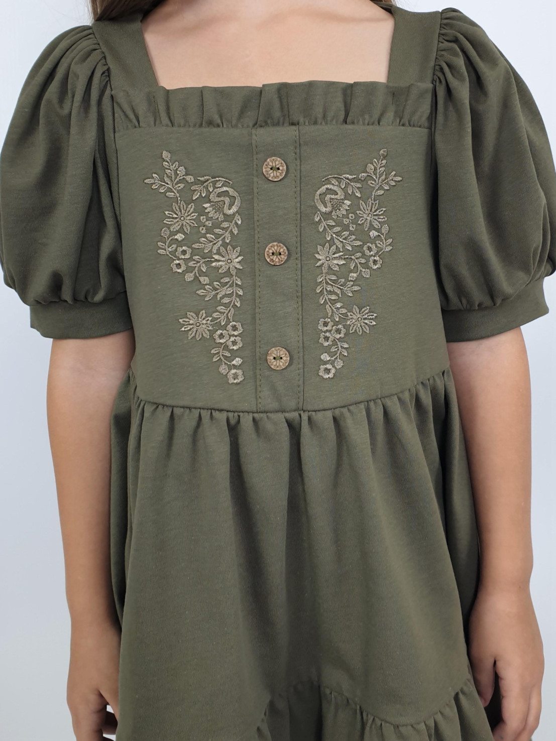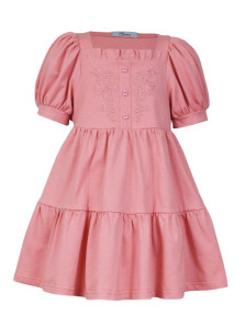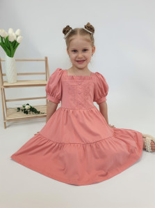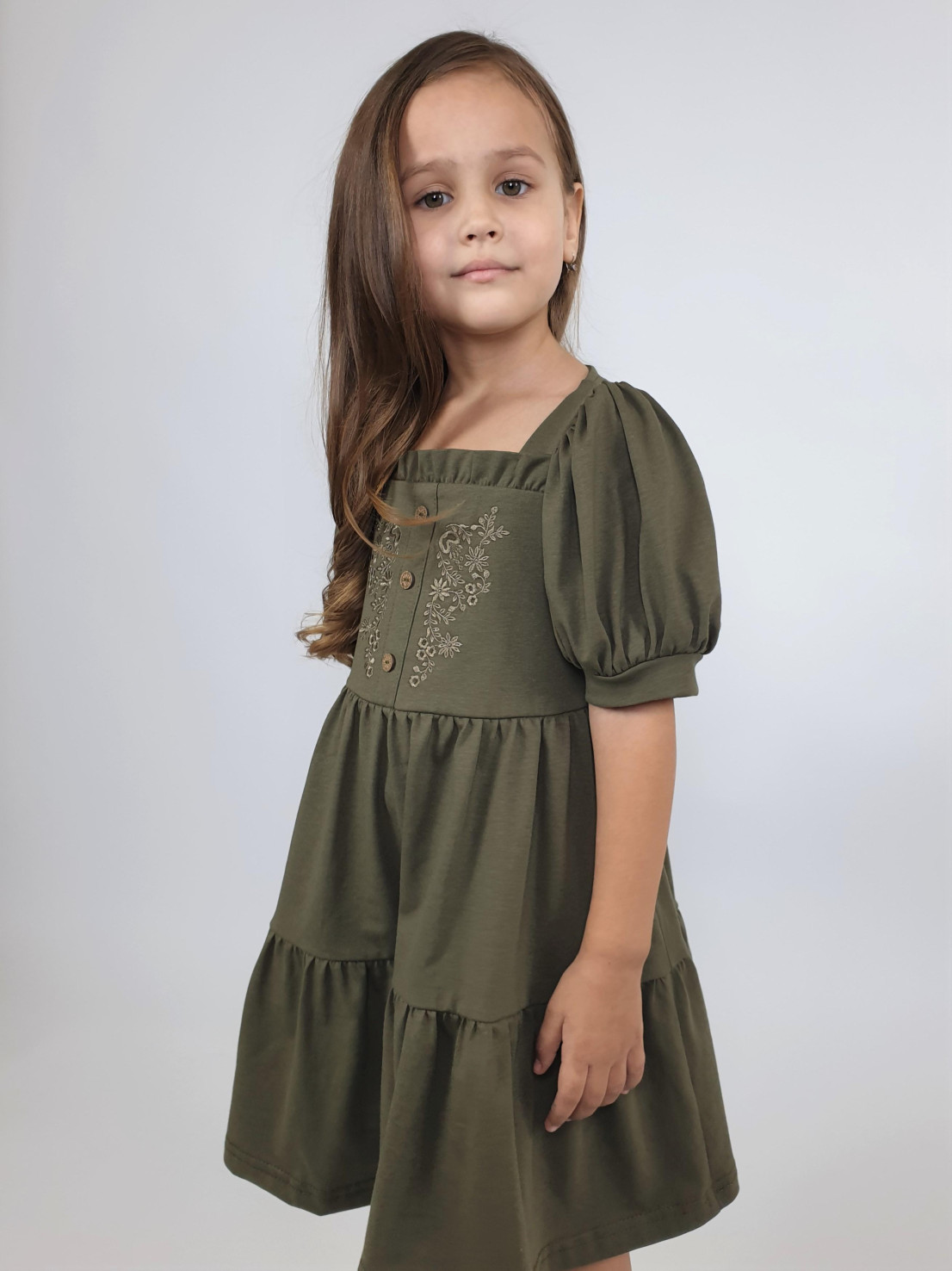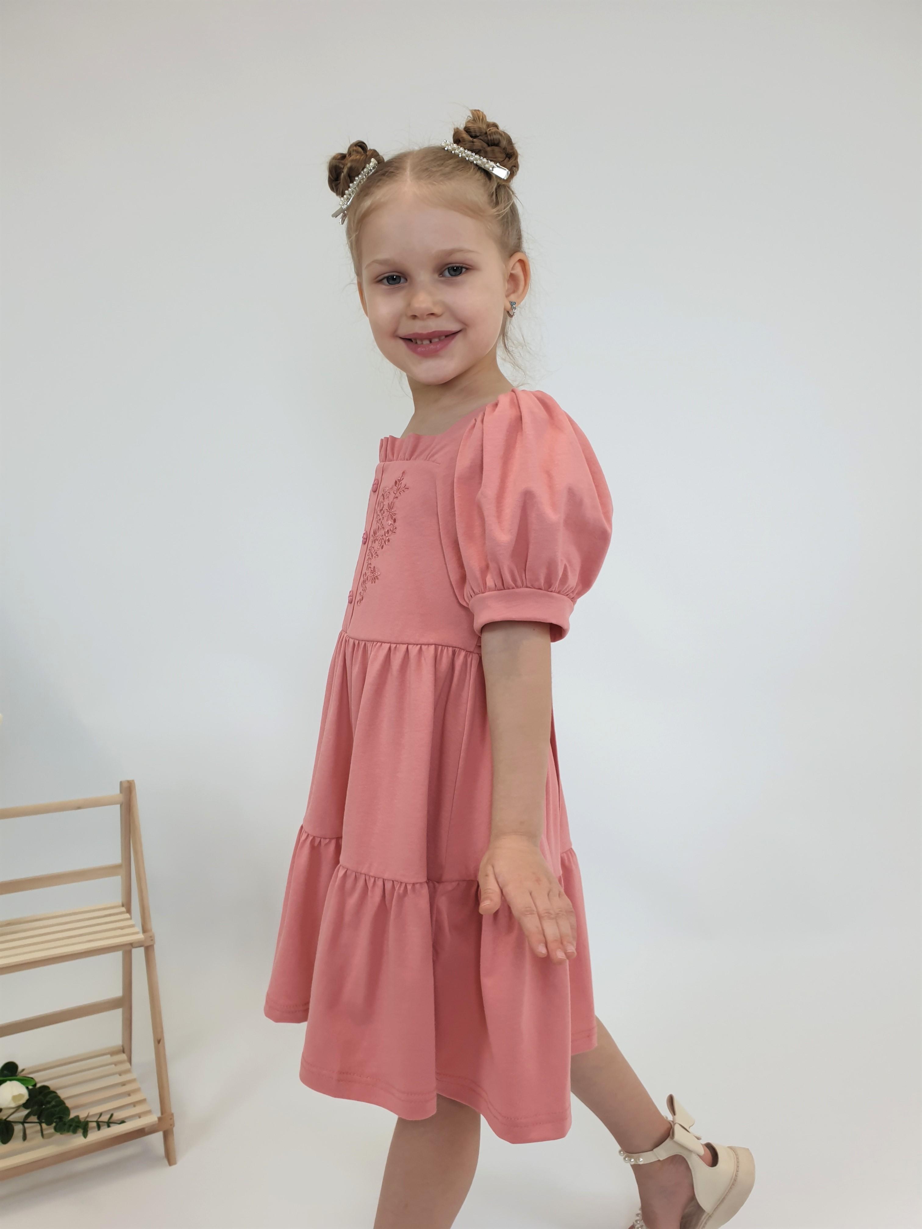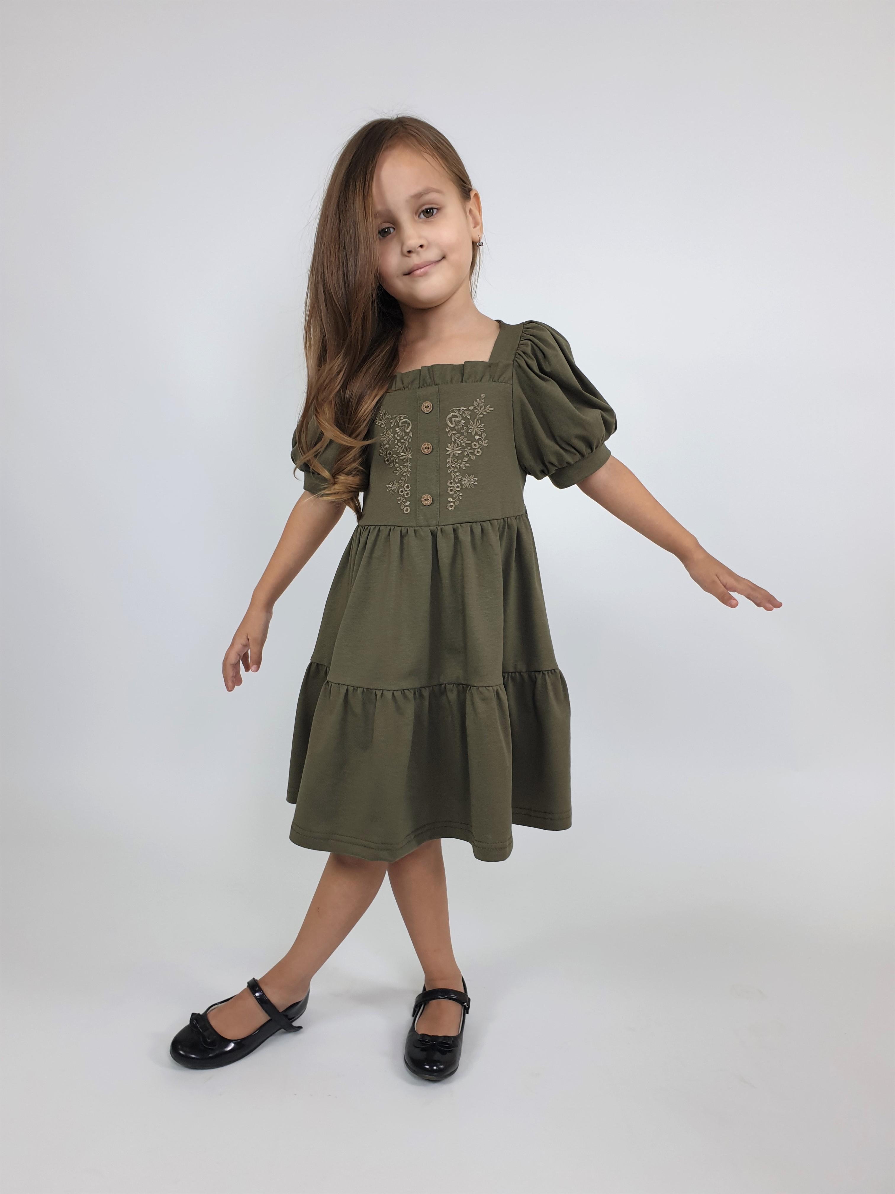 Кулирное полотно:100% х/б. Платье-свободное с поясом,с отрезной юбкой из двух воланов со сборкой.Короткий рукав (объемный) фонарик на манжете. Перед на подкладке с вышивкой,имитация застежки с декоративными пуговицами.Вырез квадратный с рюшей,горловина спинки окантована.