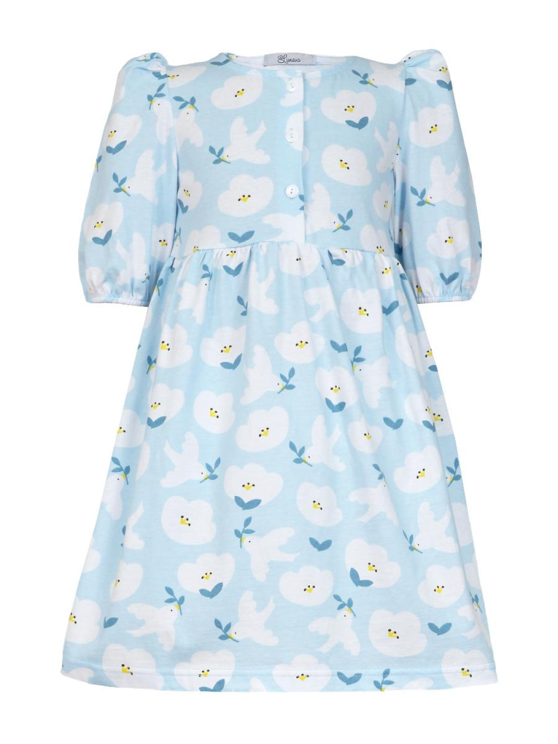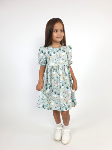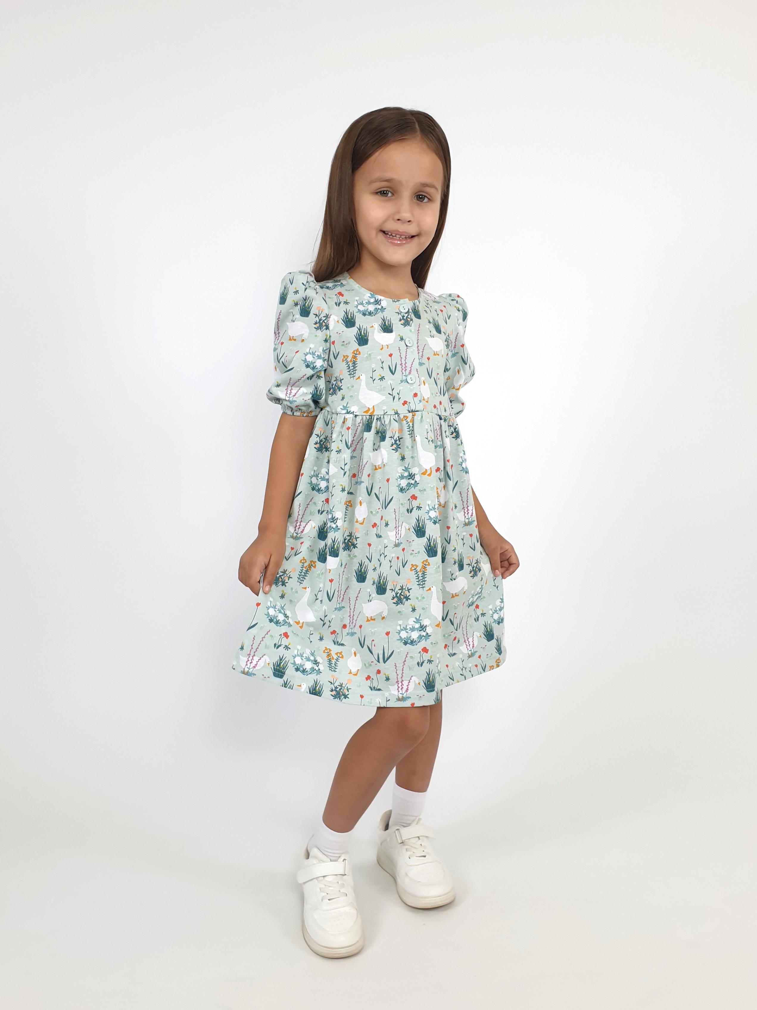 Кулирное полотно (набивка): 100% х/б. Платье-с отрезной юбкой в сборку.Короткий рукав с резинкой внизу,сборка по окату.Горловина окантована и подшита,застежка центральная на пуговицы.