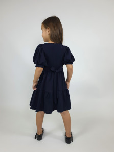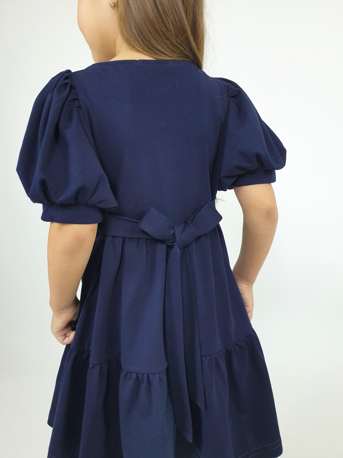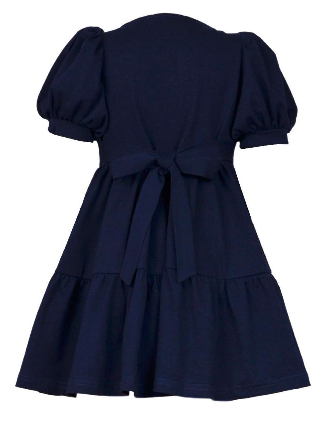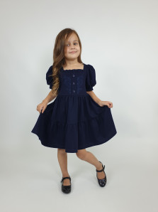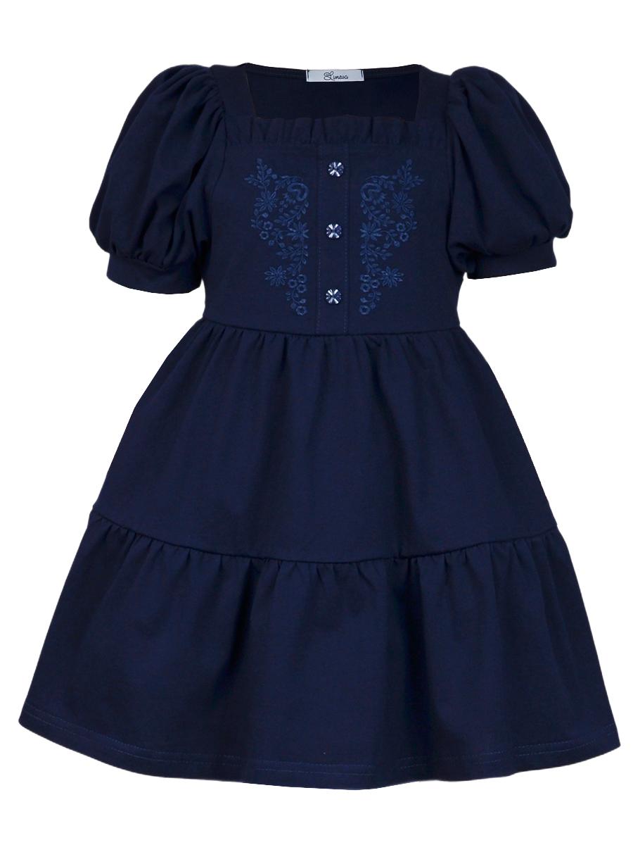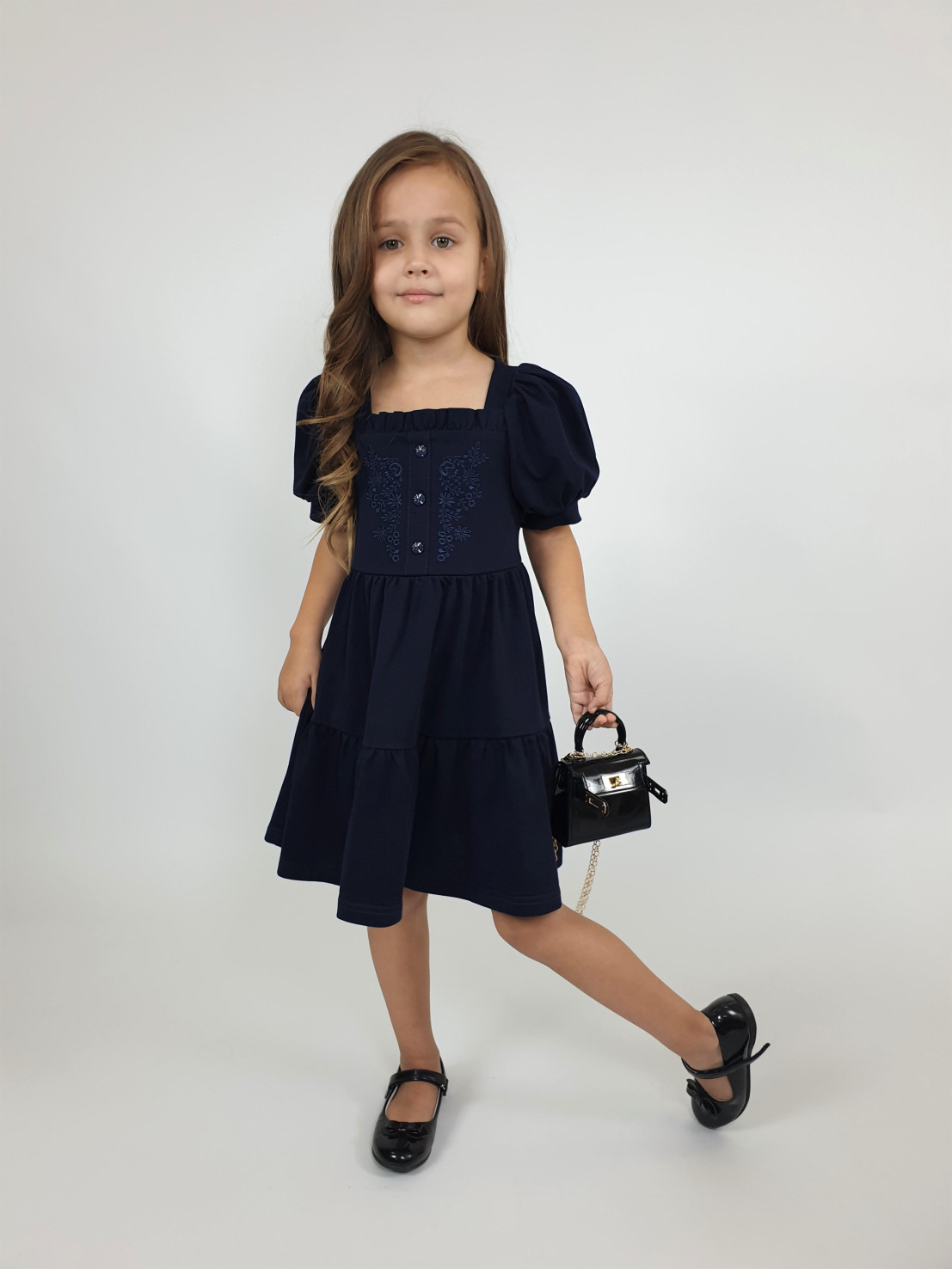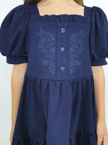 Кулирное полотно:100% х/б. Платье-свободное с поясом,с отрезной юбкой из двух воланов со сборкой.Короткий рукав (объемный) фонарик на манжете. Перед на подкладке с вышивкой,имитация застежки с декоративными пуговицами.Вырез квадратный с рюшей,горловина спинки окантована.