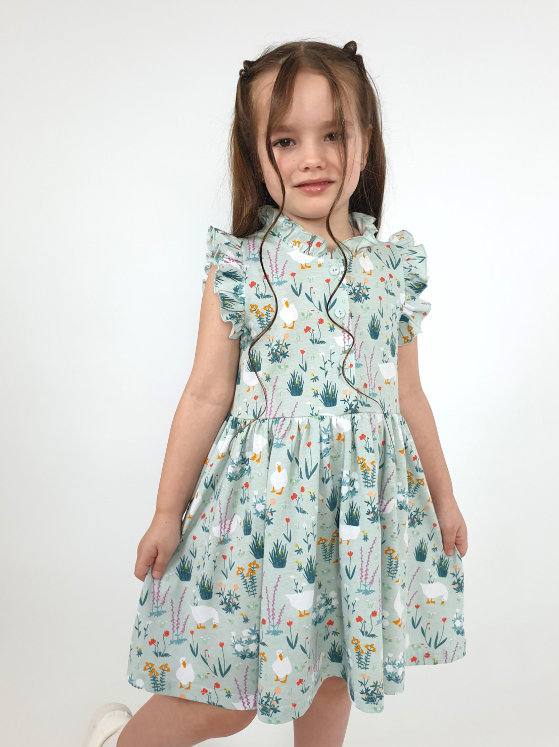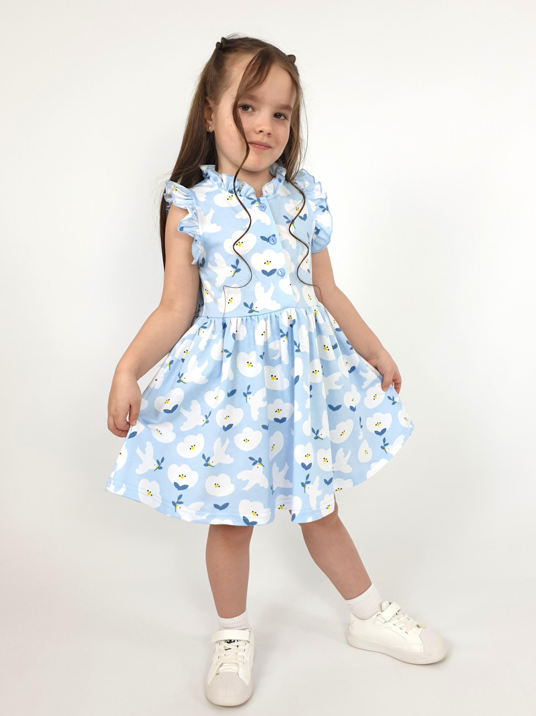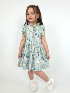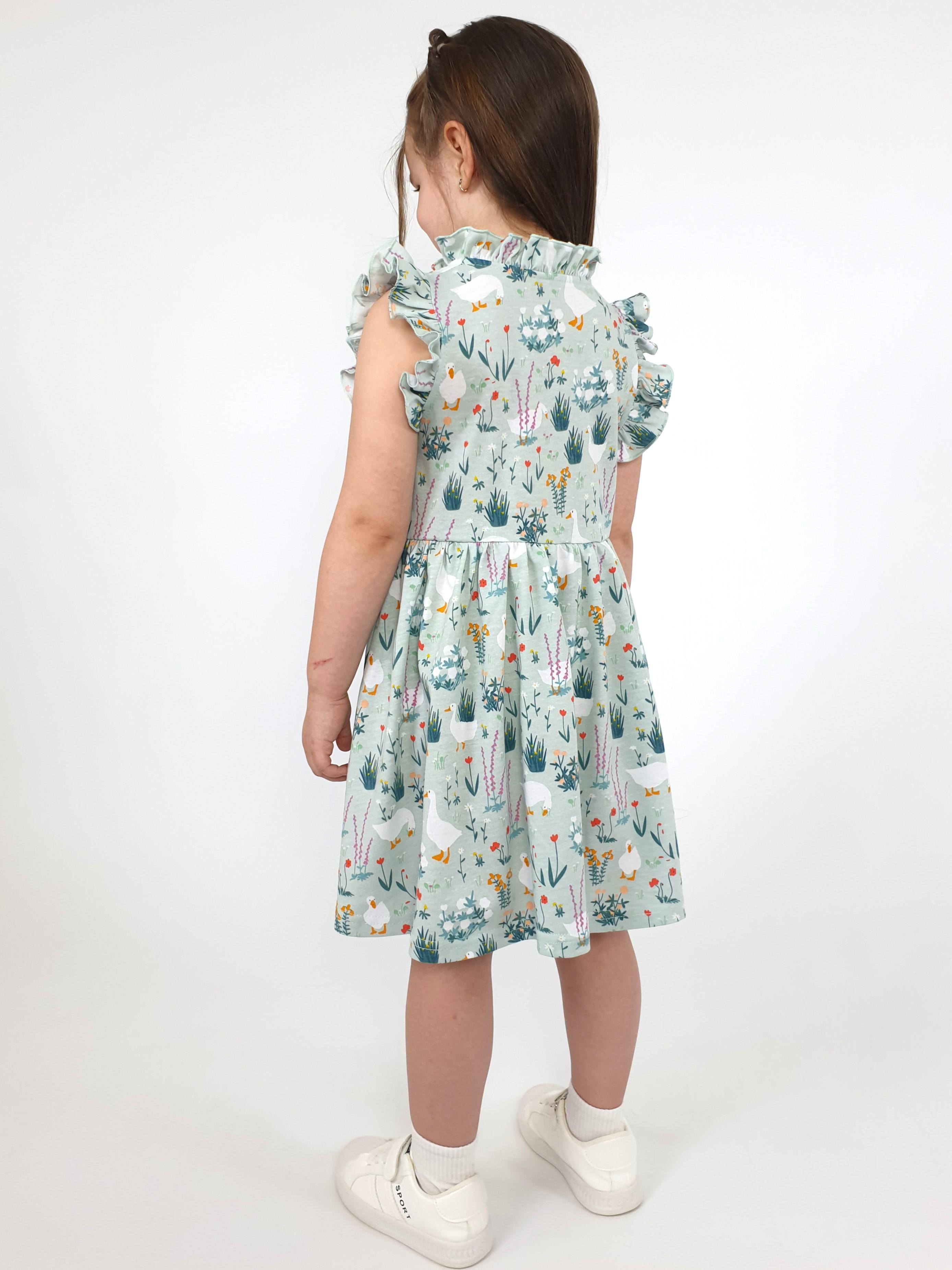 Кулирное полотно(набивка):100% х/б. Платье-полуприлегающего силуэта,без рукава,рюша в горловине и пройме.Отрезная юбка со сборкой.Горловина окантована и подшита,застежка центральная на пуговицы.