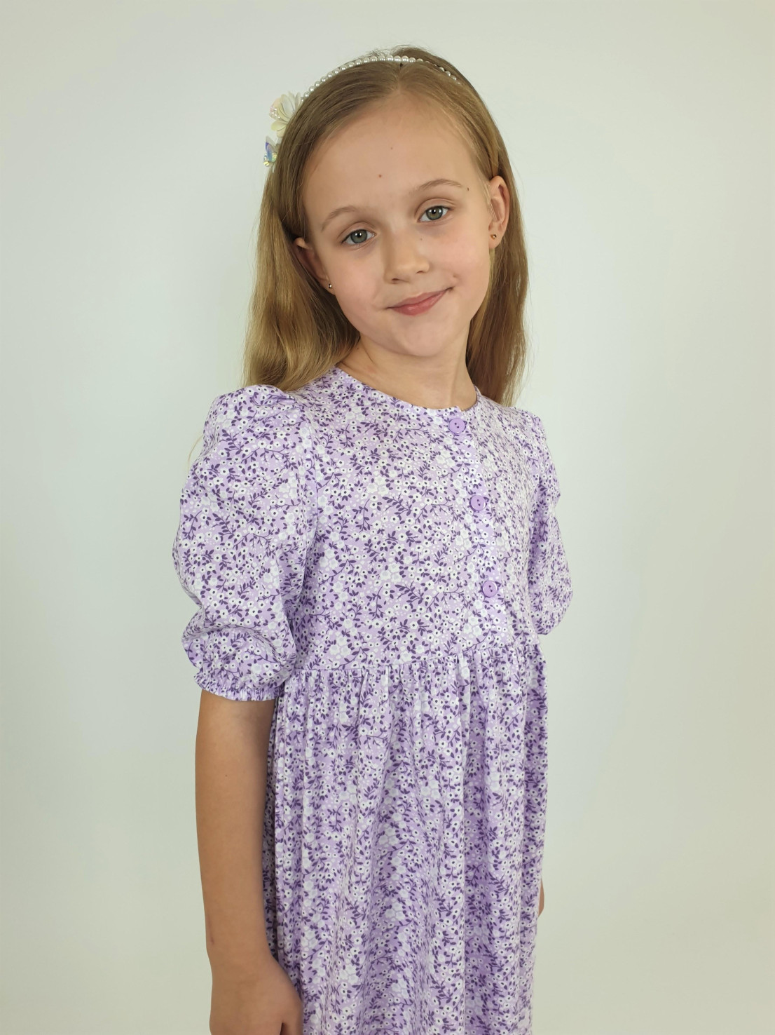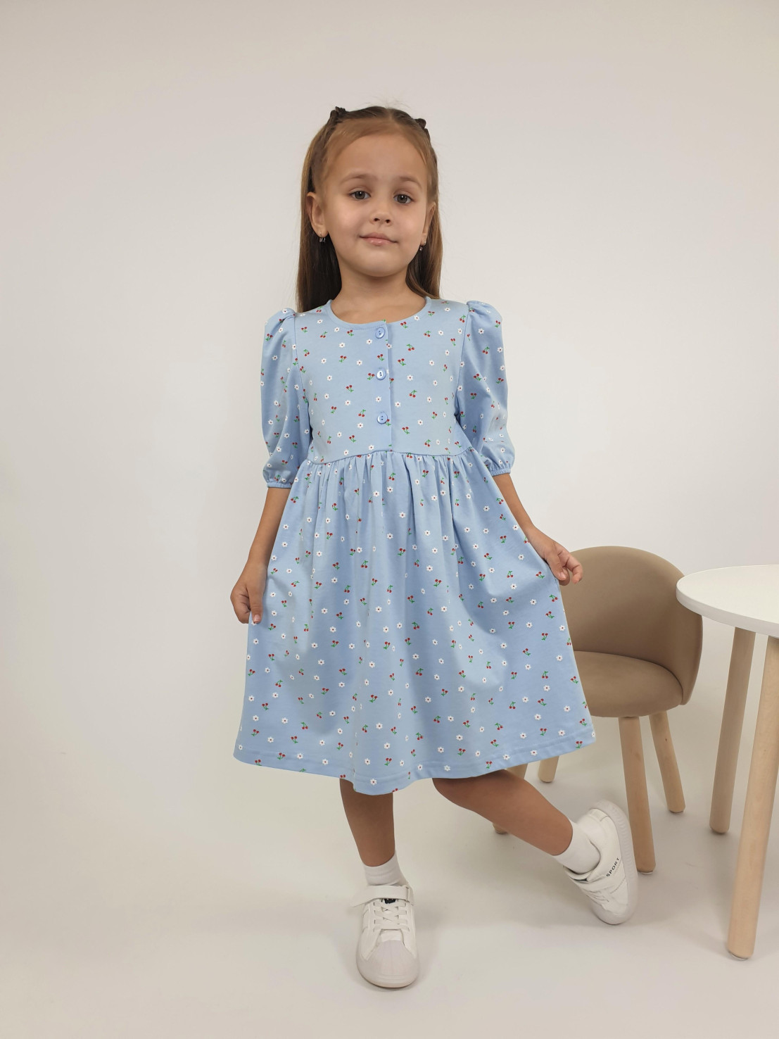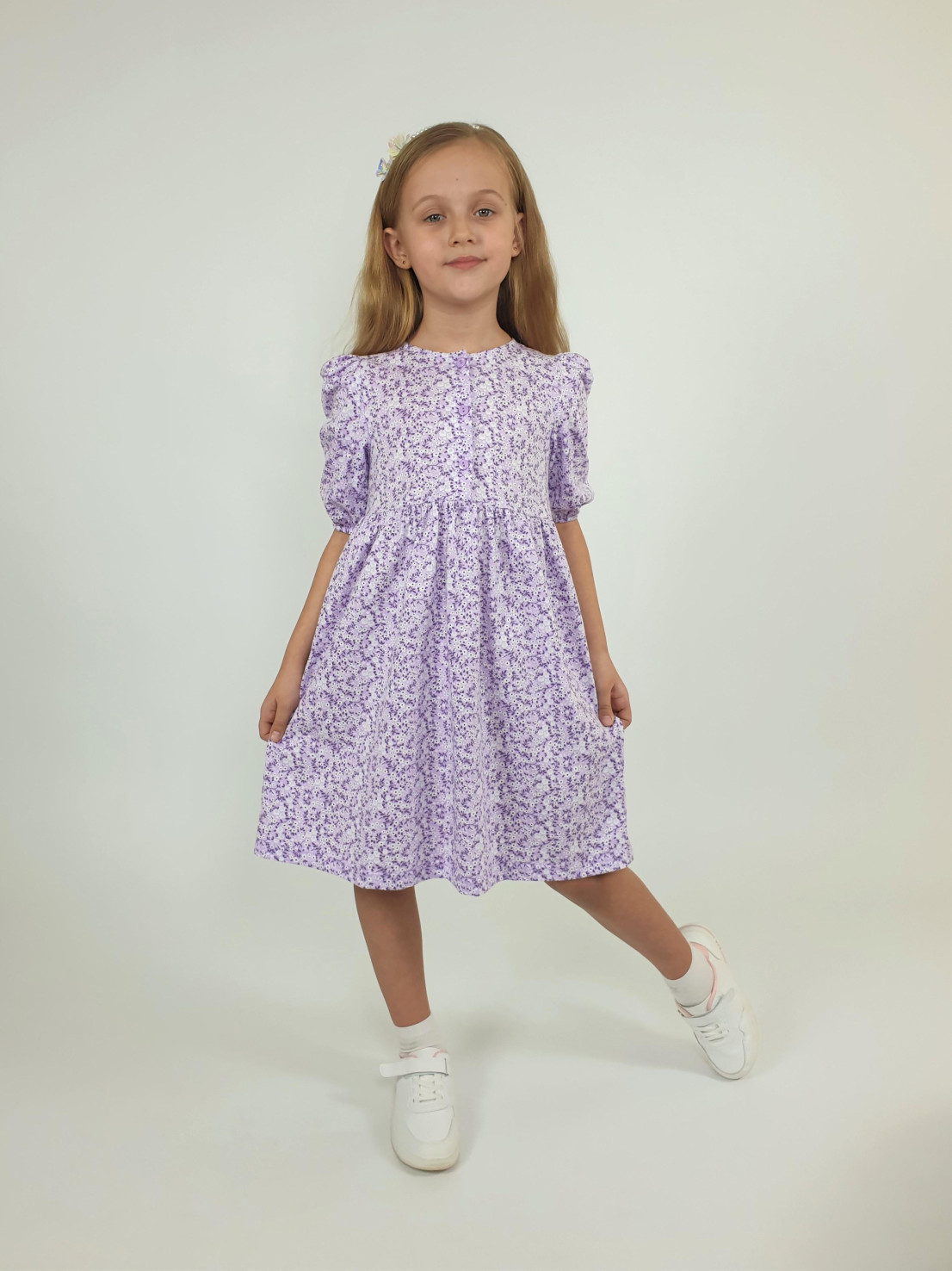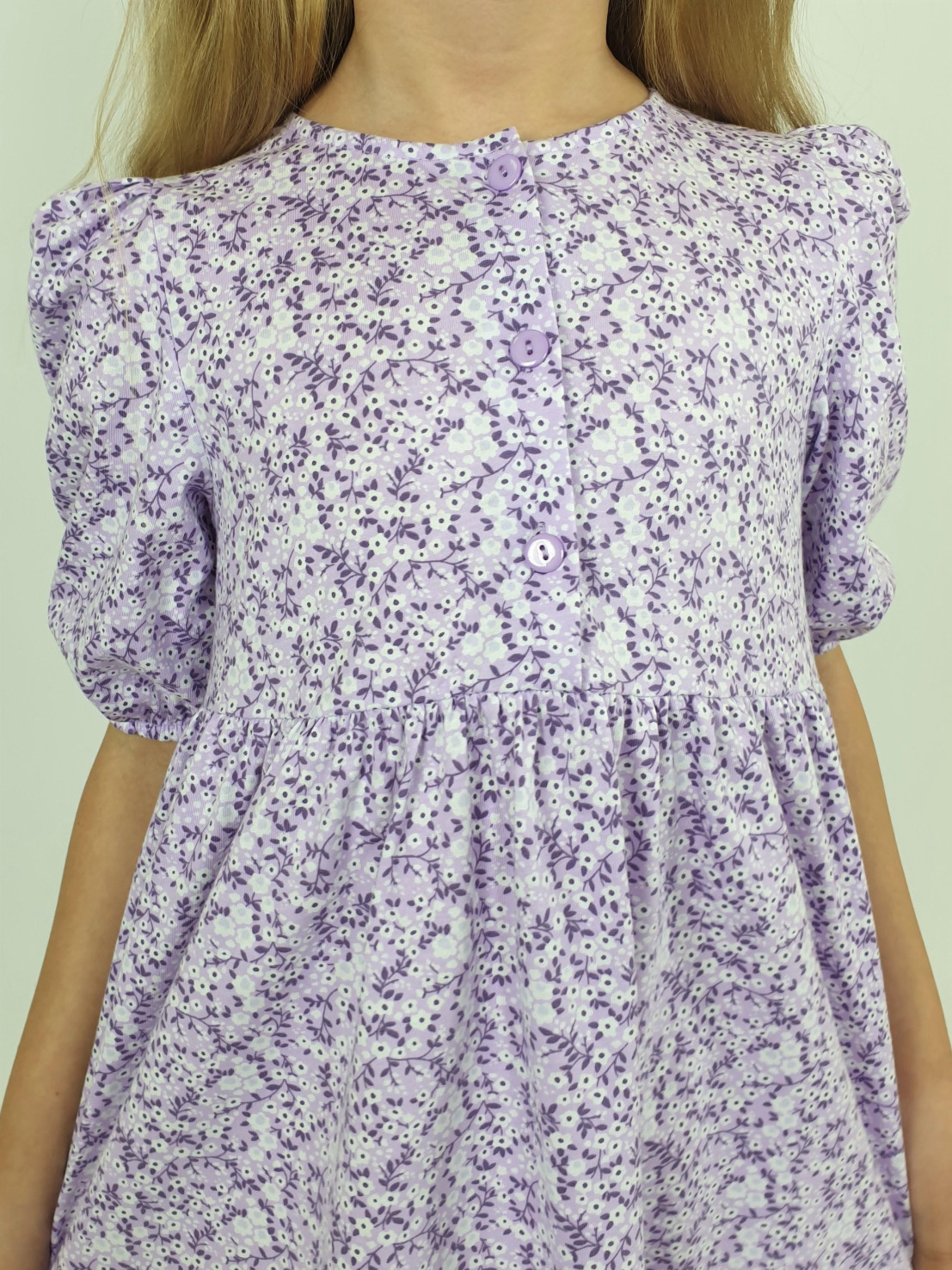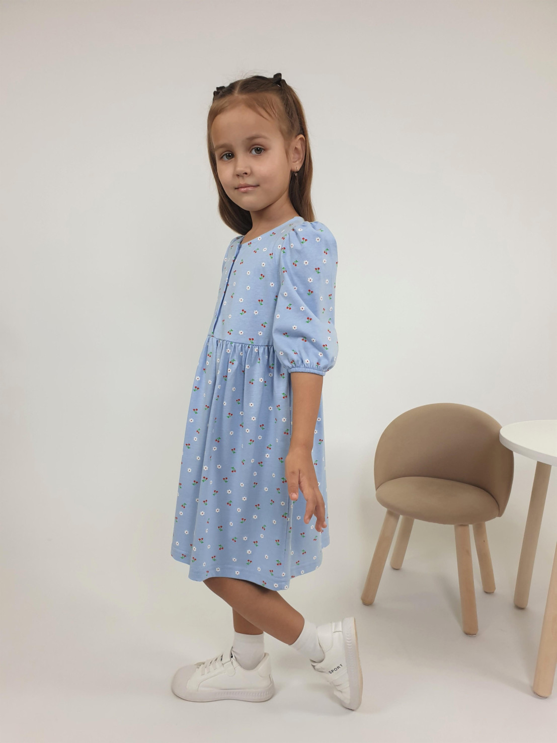 Кулирное полотно (набивка): 100% х/б. Платье-с отрезной юбкой в сборку.Короткий рукав с резинкой внизу,сборка по окату.Горловина окантована и подшита,застежка центральная на пуговицы.