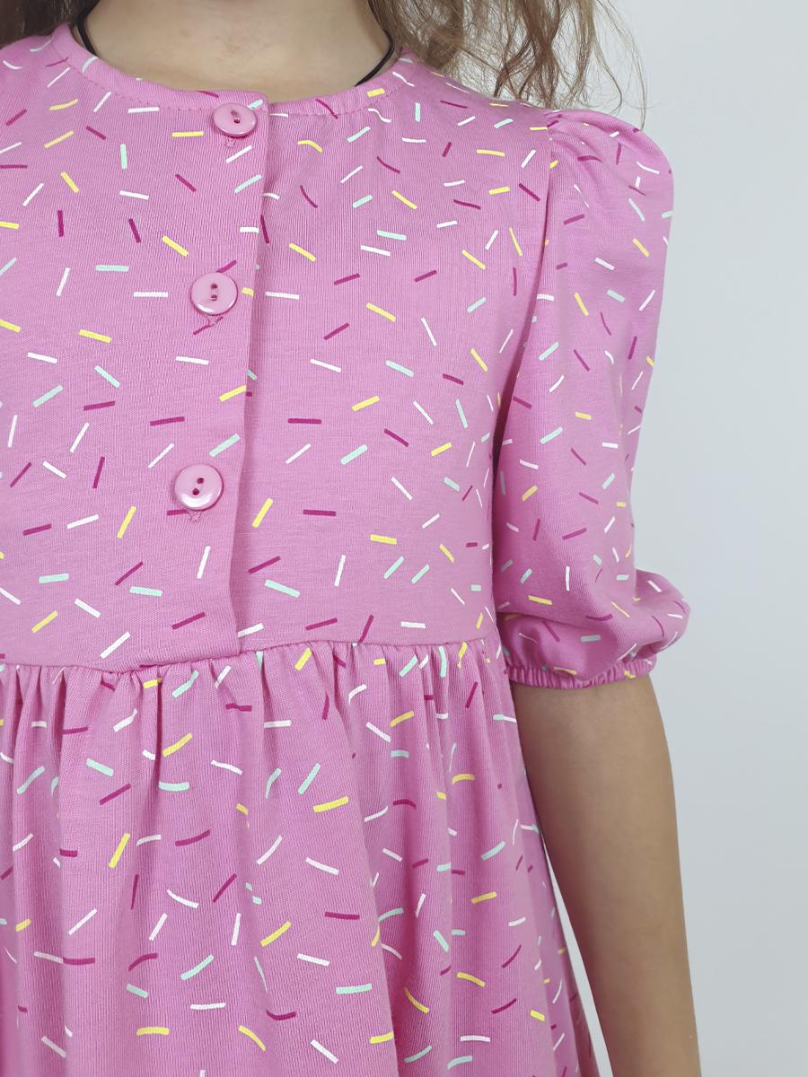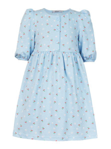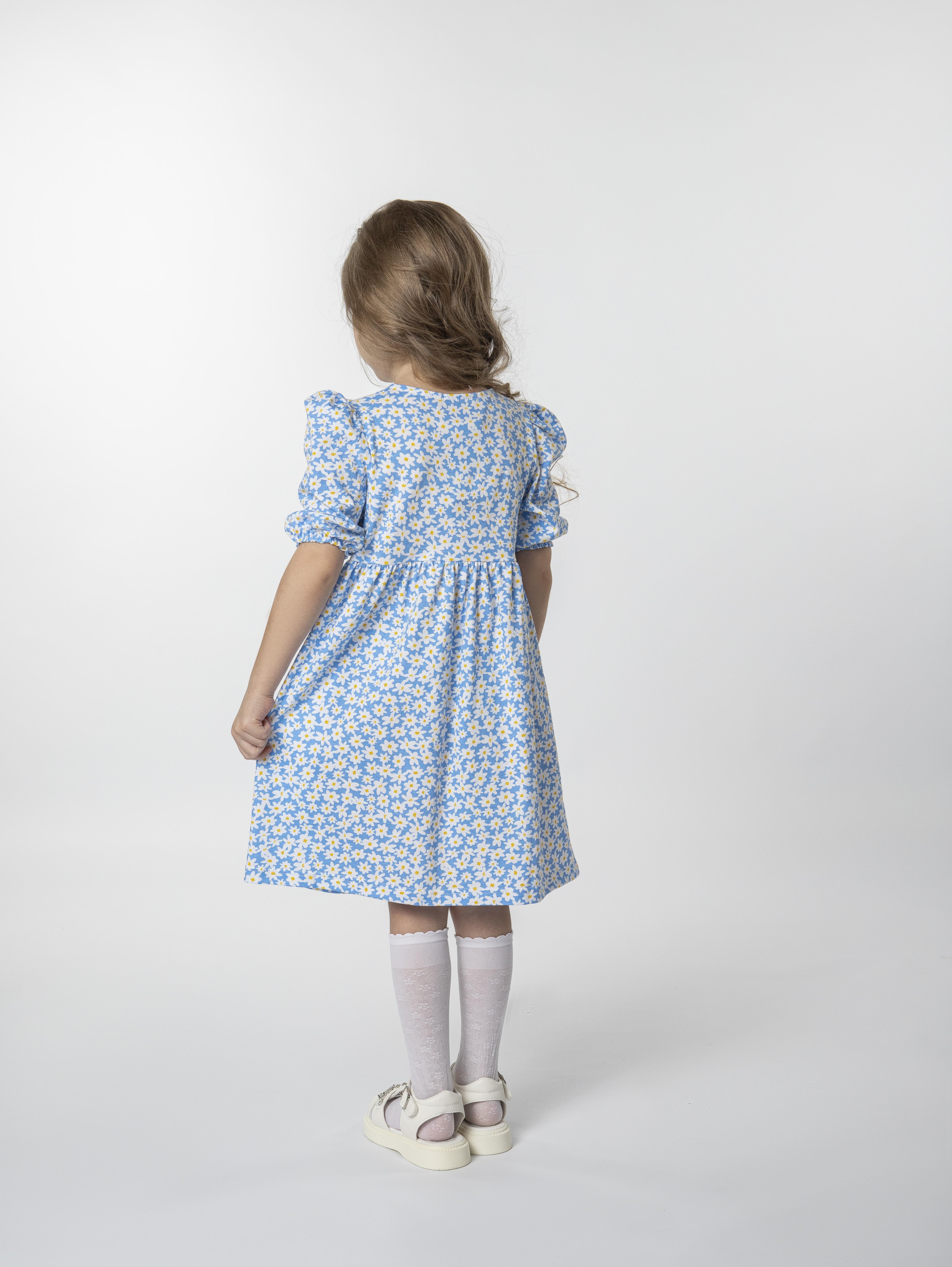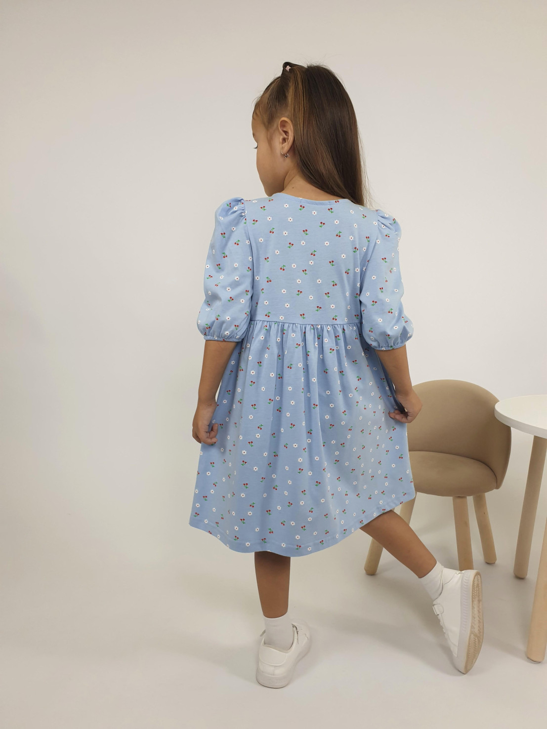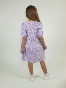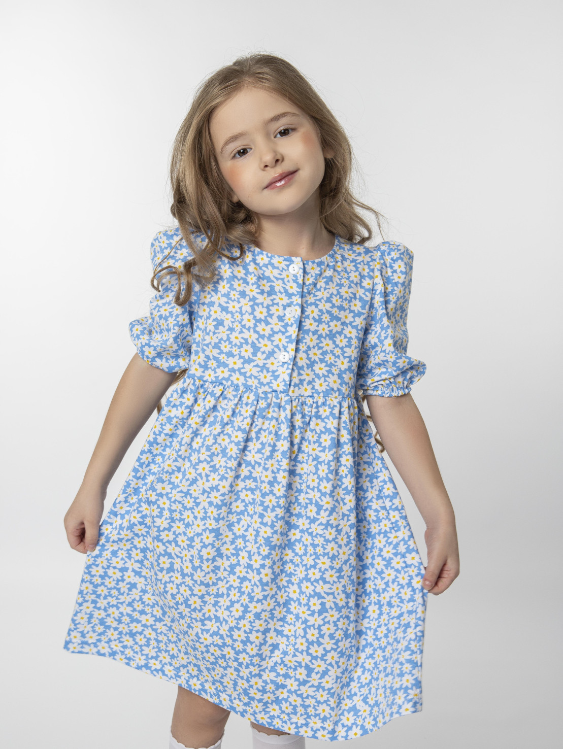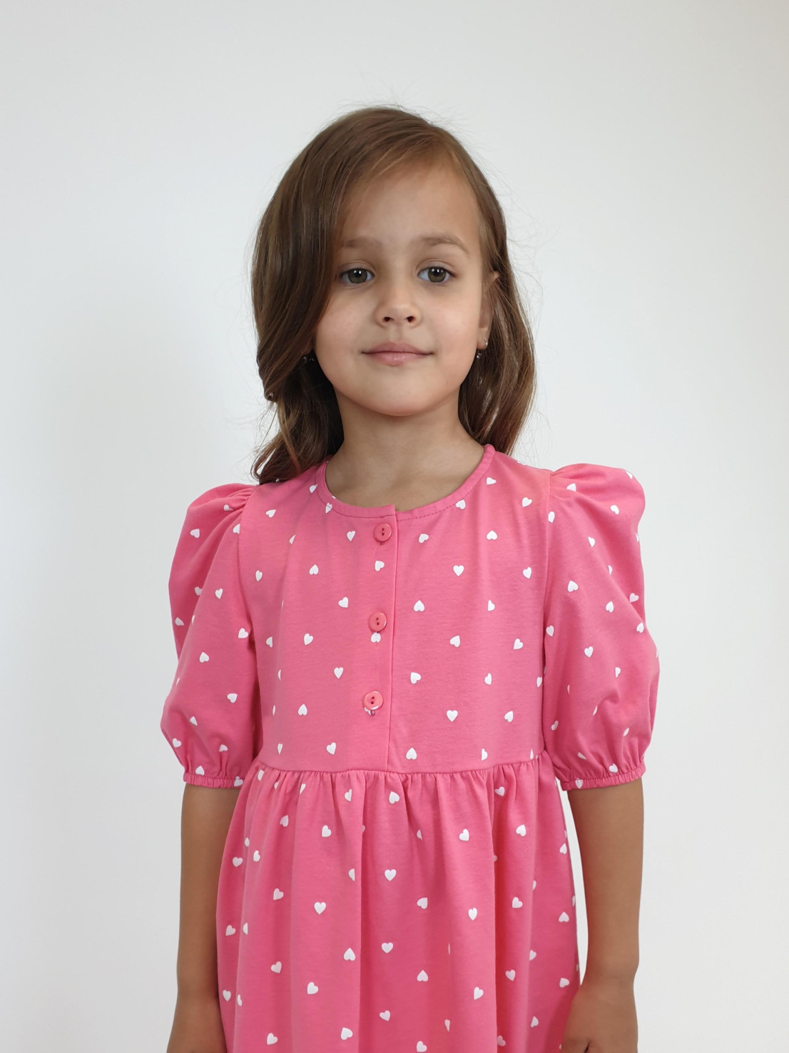 Кулирное полотно (набивка): 100% х/б. Платье-с отрезной юбкой в сборку.Короткий рукав с резинкой внизу,сборка по окату.Горловина окантована и подшита,застежка центральная на пуговицы.