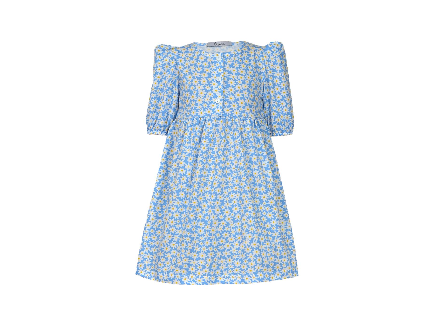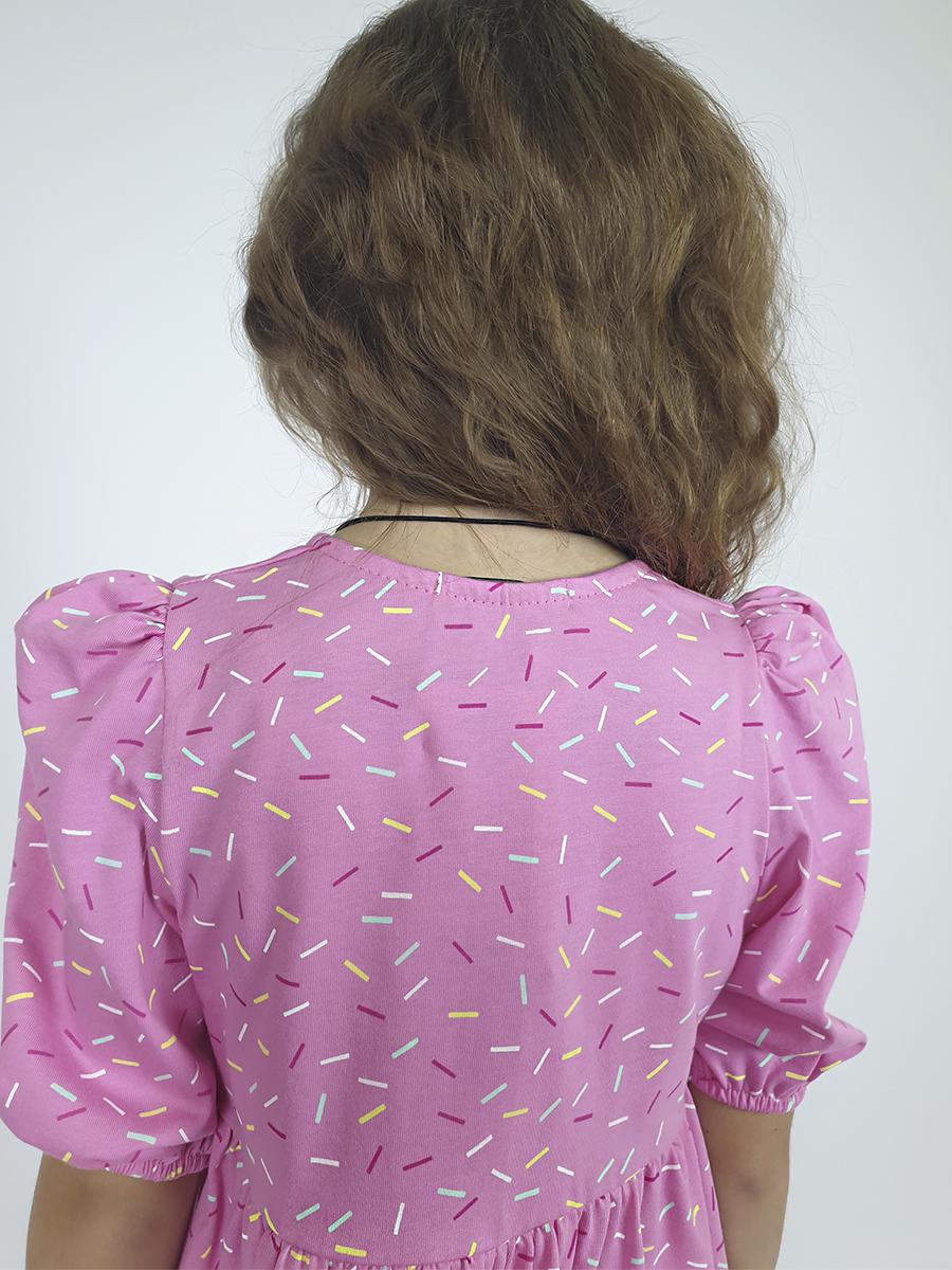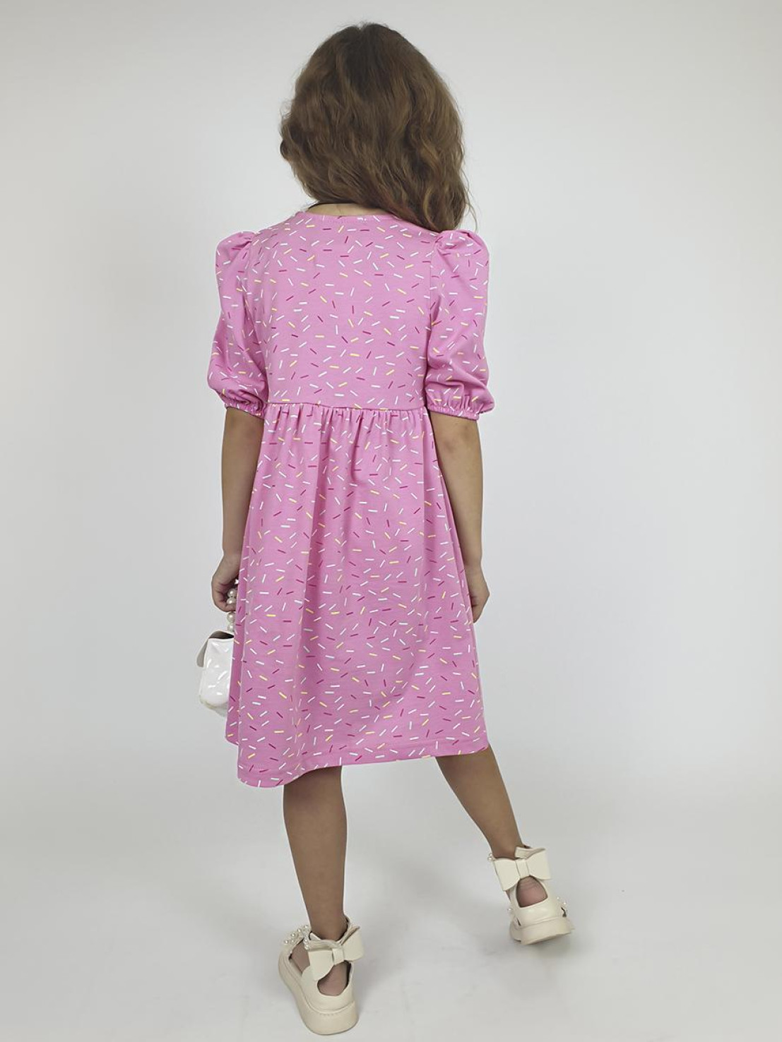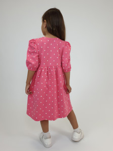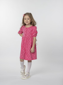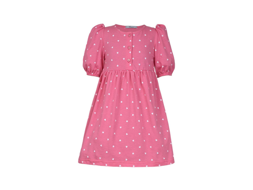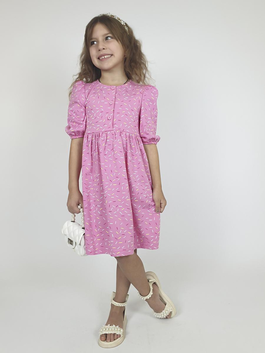 Кулирное полотно (набивка): 100% х/б. Платье-с отрезной юбкой в сборку.Короткий рукав с резинкой внизу,сборка по окату.Горловина окантована и подшита,застежка центральная на пуговицы.