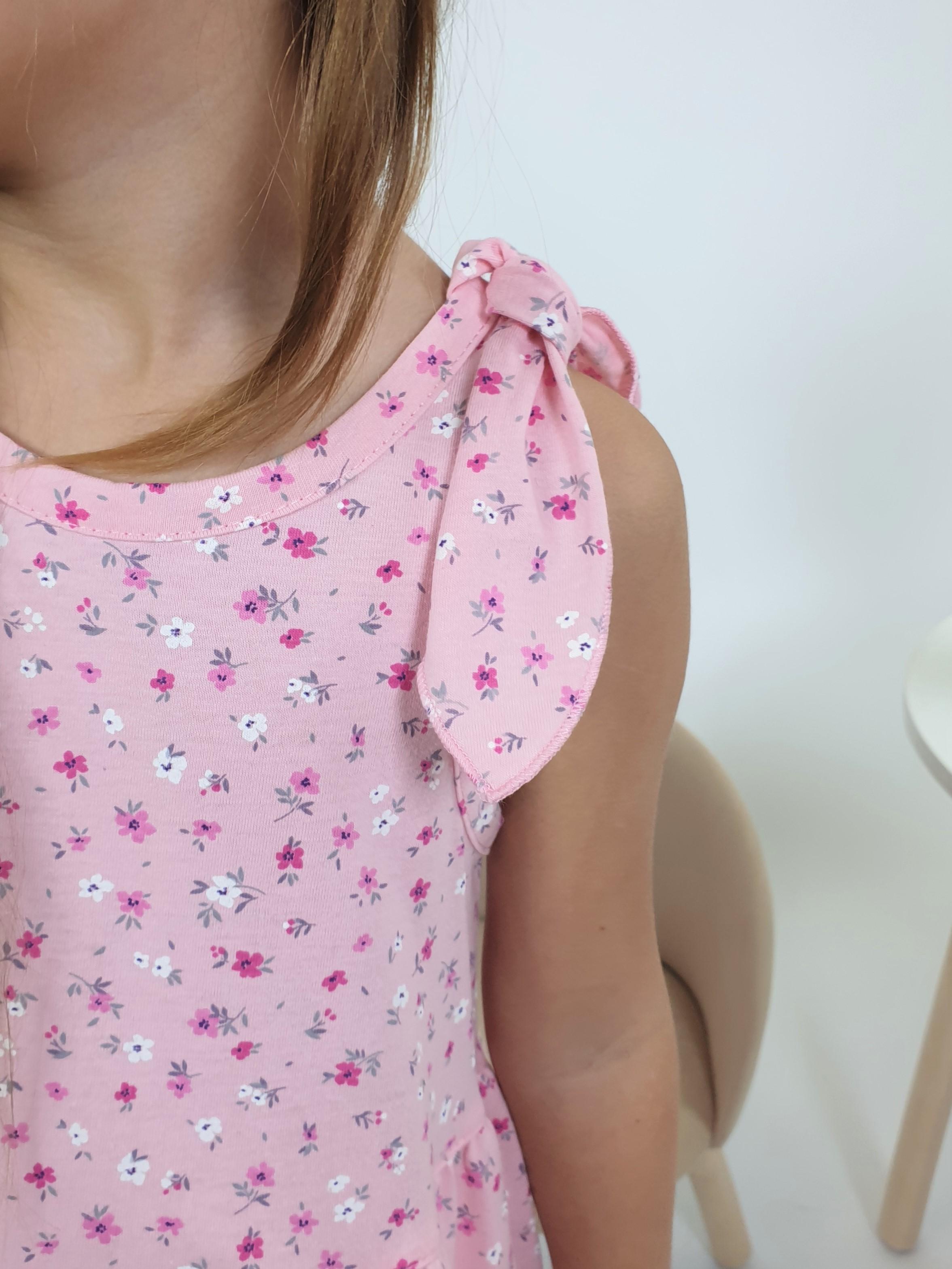 Кулирное полотно(набивка):100% х/б. Платье-силуэт трапеция,без рукава.Юбка из двух воланов,горловина и пройма окантованы.Декоративный элемент-завязка на плече.