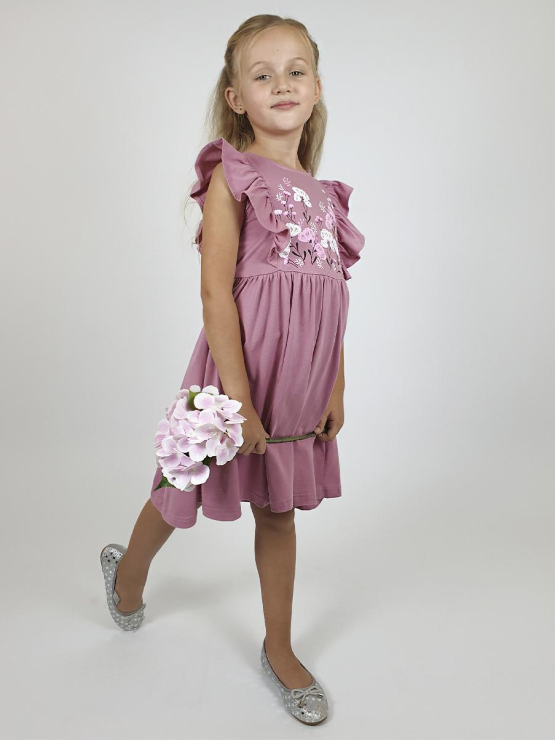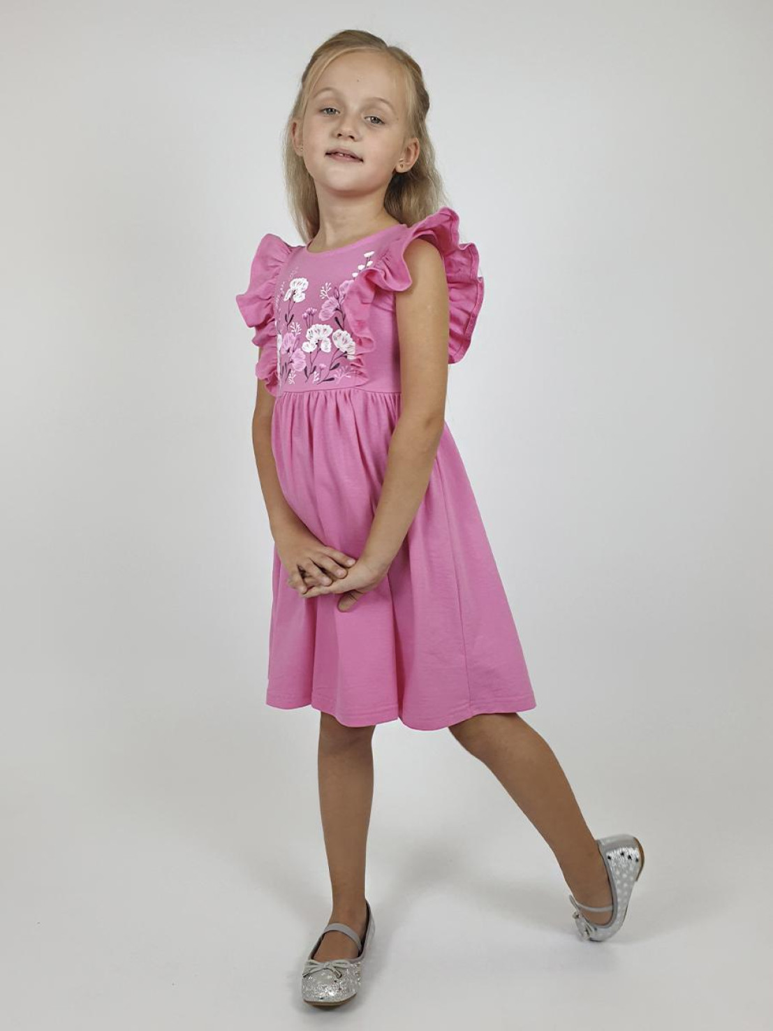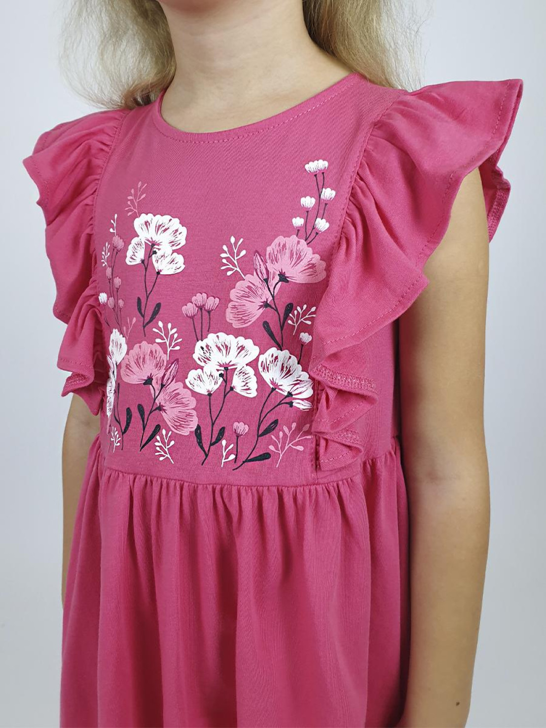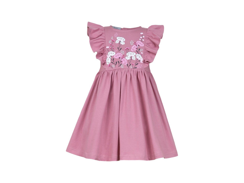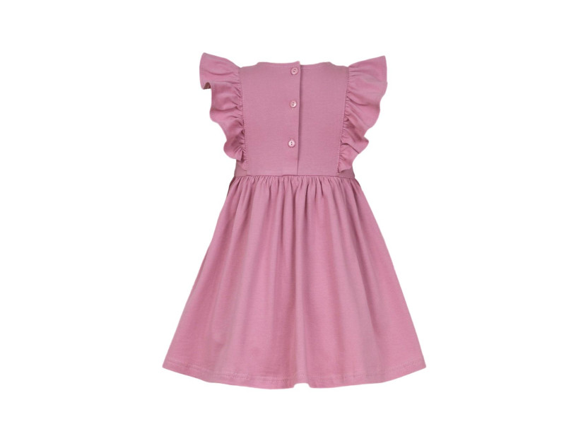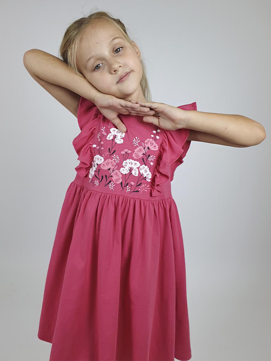Кулирное полотно:100% х/б. Платье- полуприлегающего силуэта. Отрезная юбка со сборкой, рельефы с рюшей. Печать на переде. Горловина окантована и подшита, застежка сзади на пуговицы.