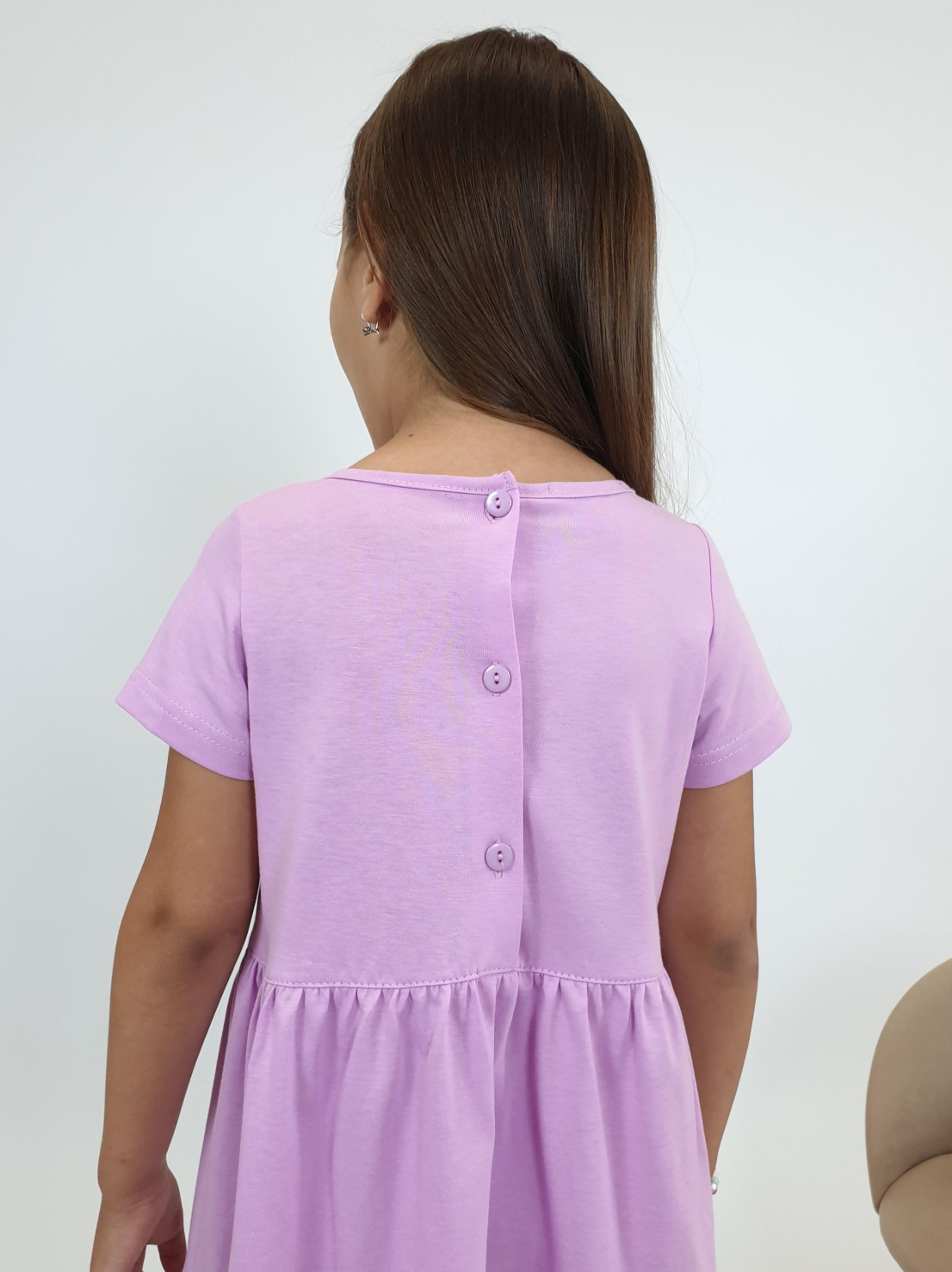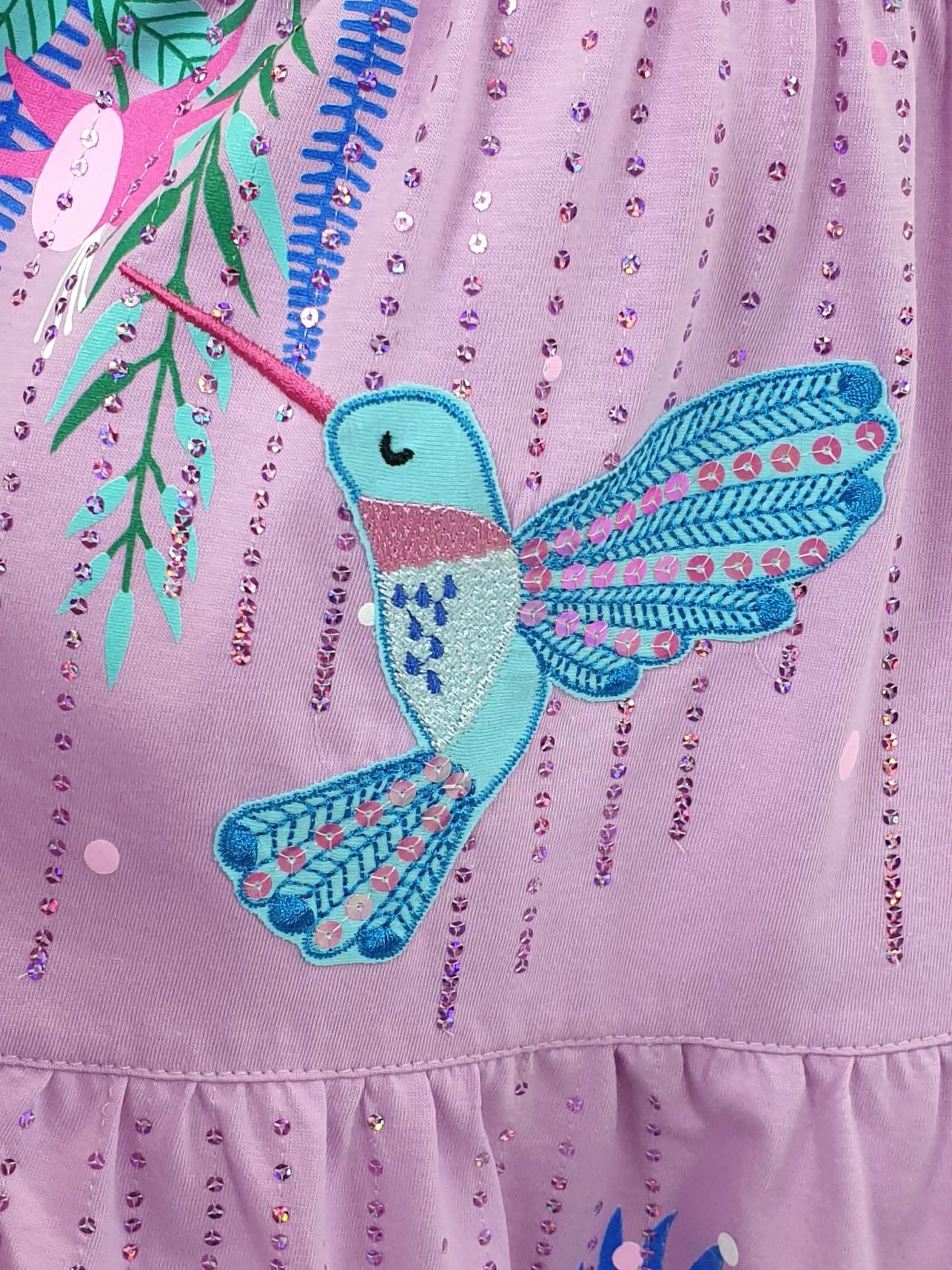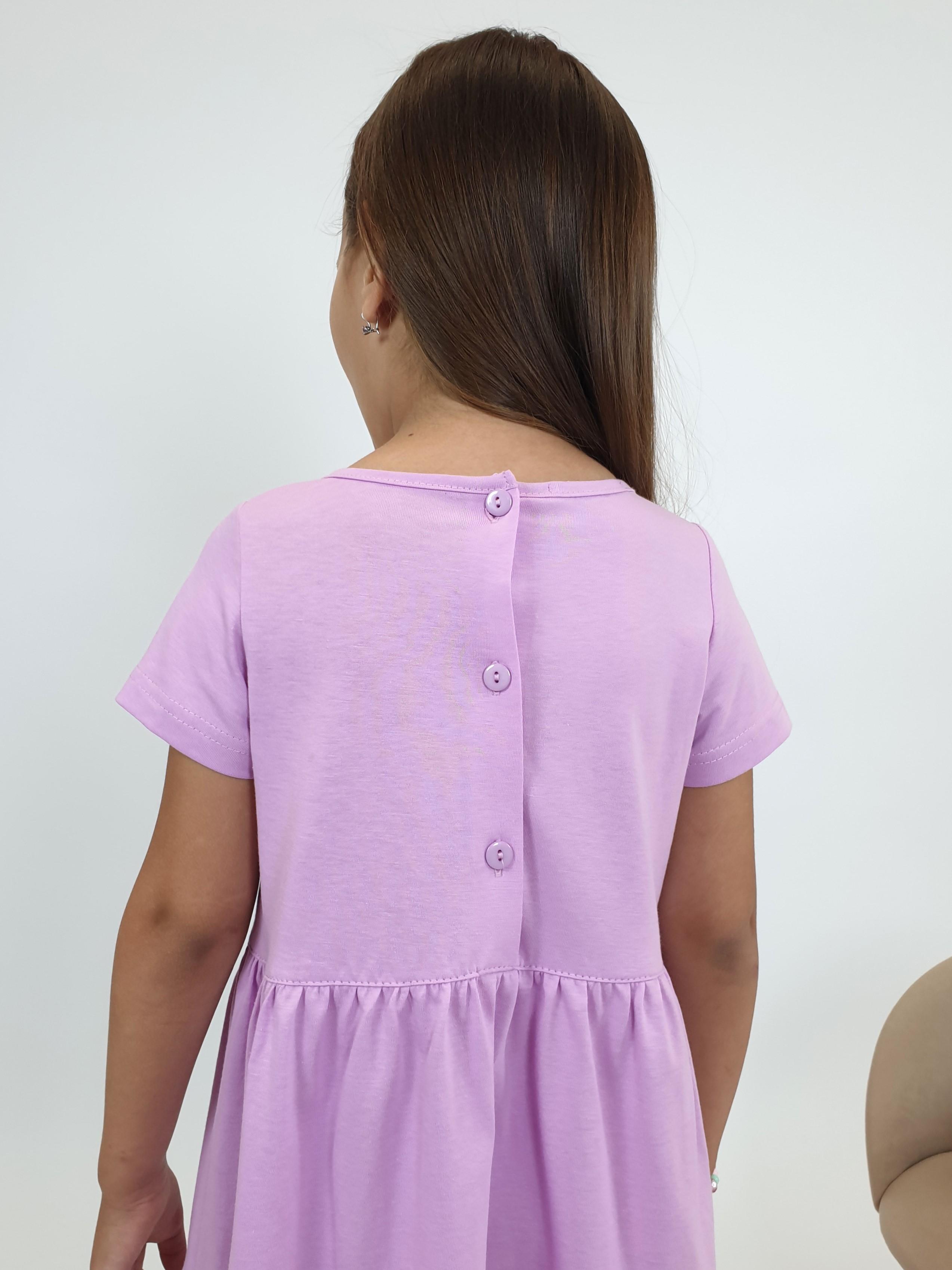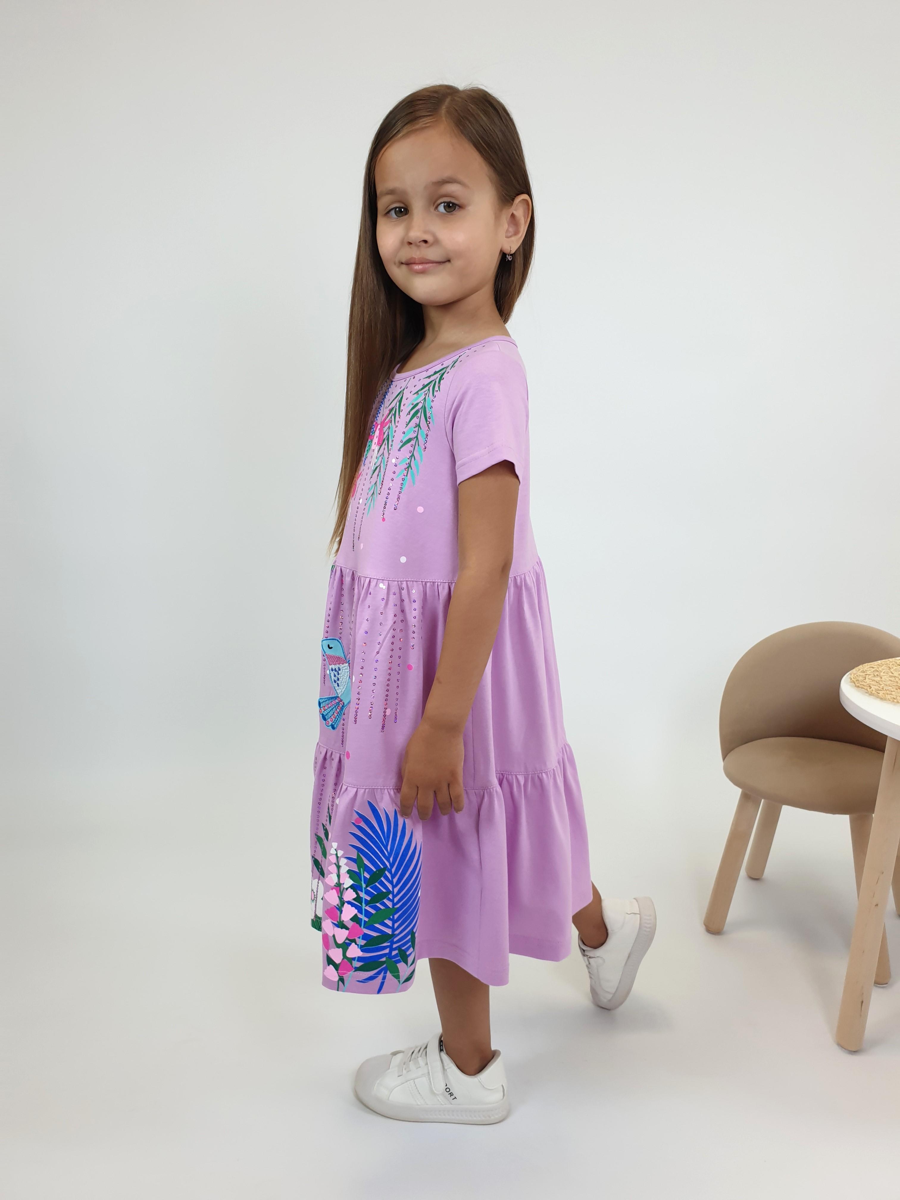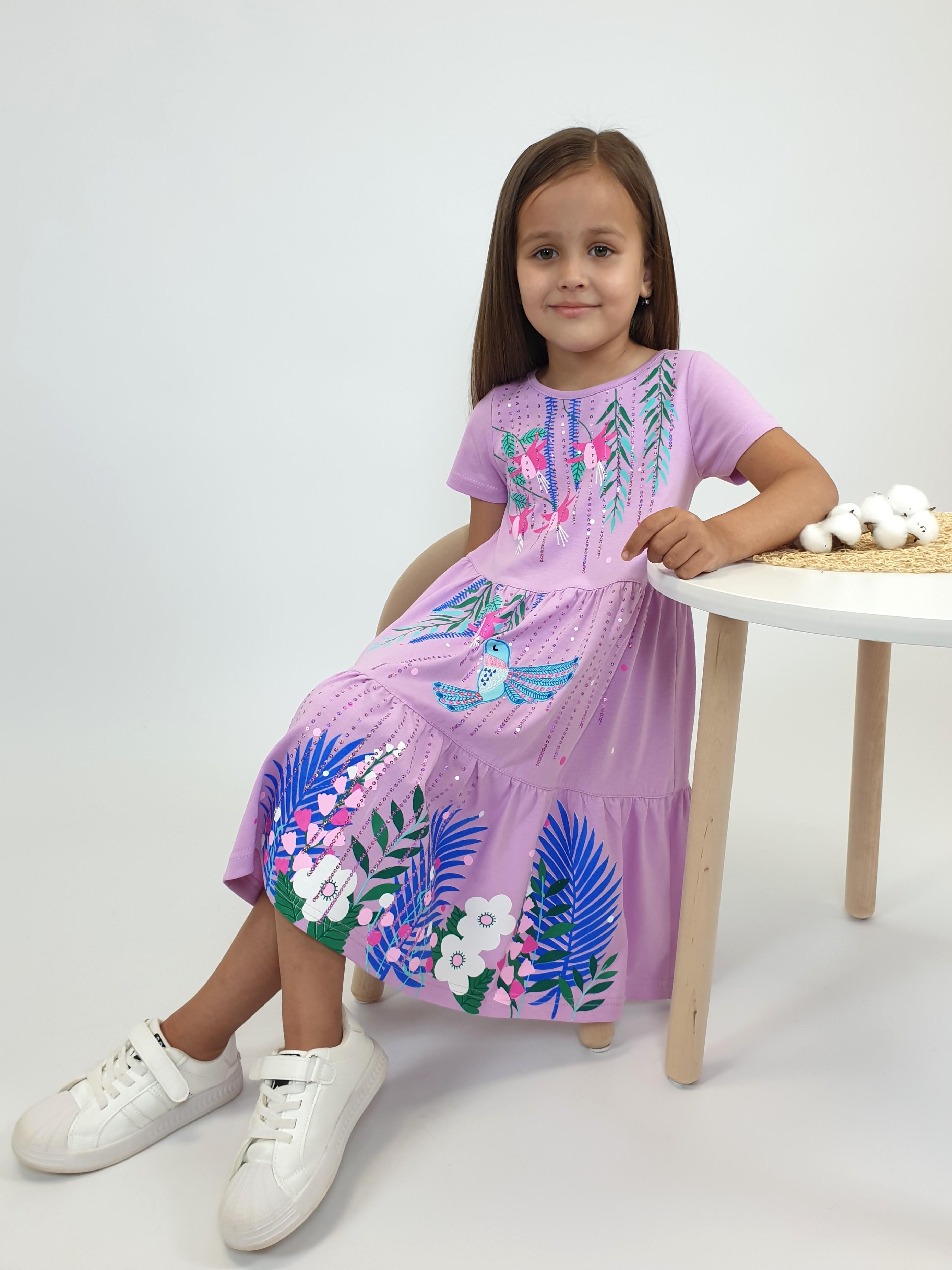Кулирное полотно:100% х/б. Платье-силуэт трапеция,короткий втачной рукав.Юбка переда и спинки из двух воланов.Печать по передним воланам и вышивкой (пайетки).Кокетка переда с печатью и вышивкой (пайетки),застежка по спинке на пуговицы.Горловина окантована.