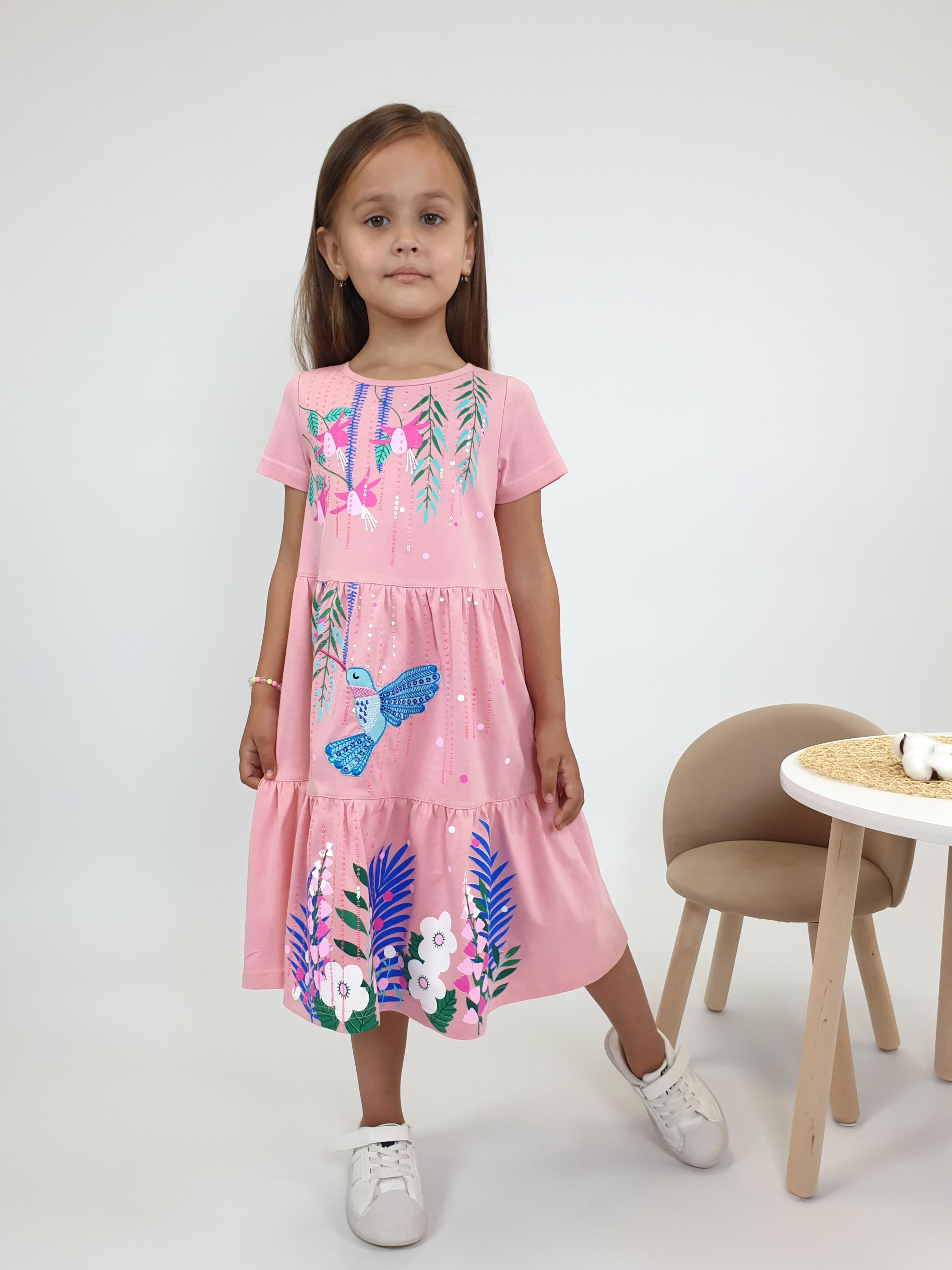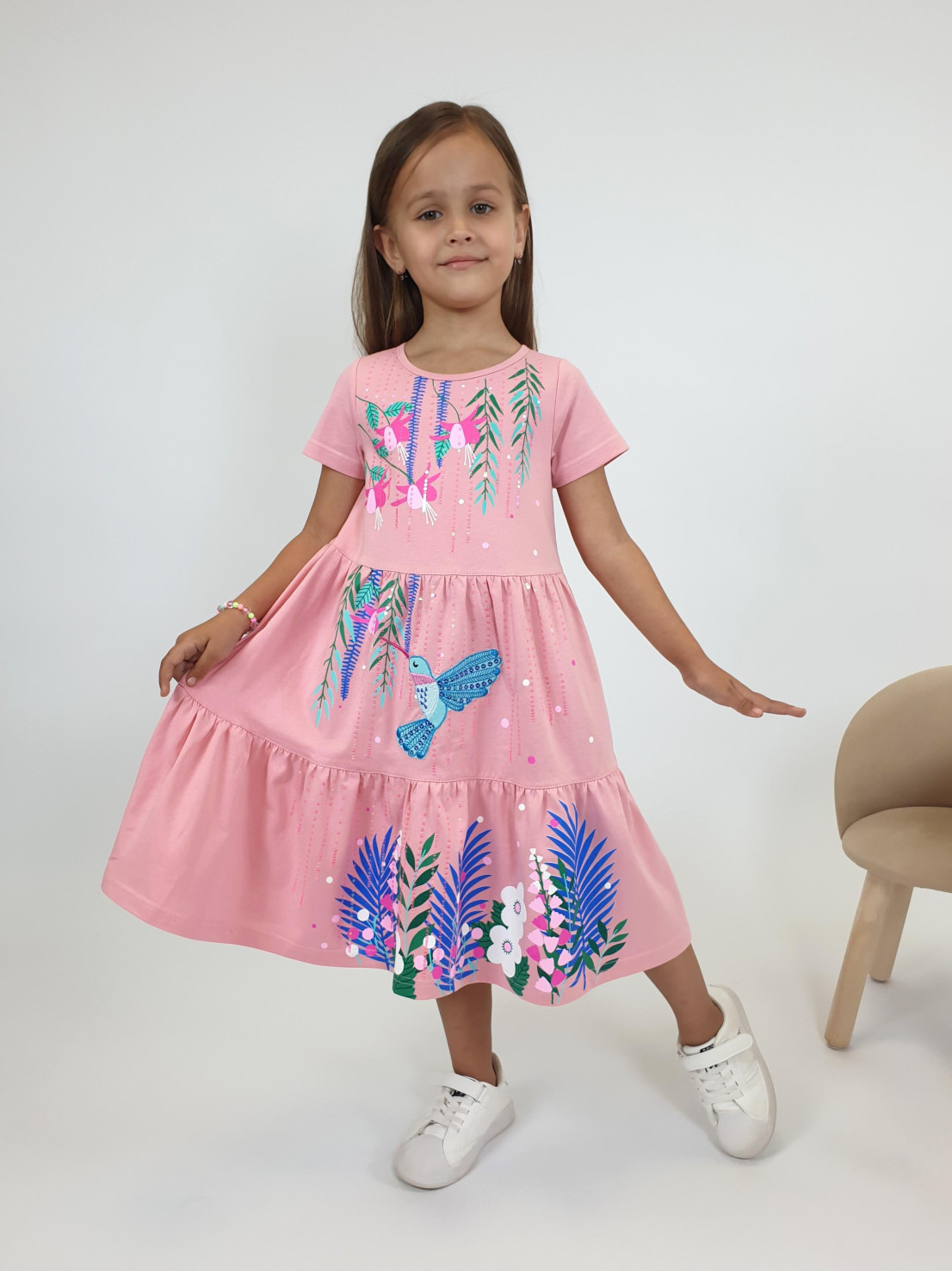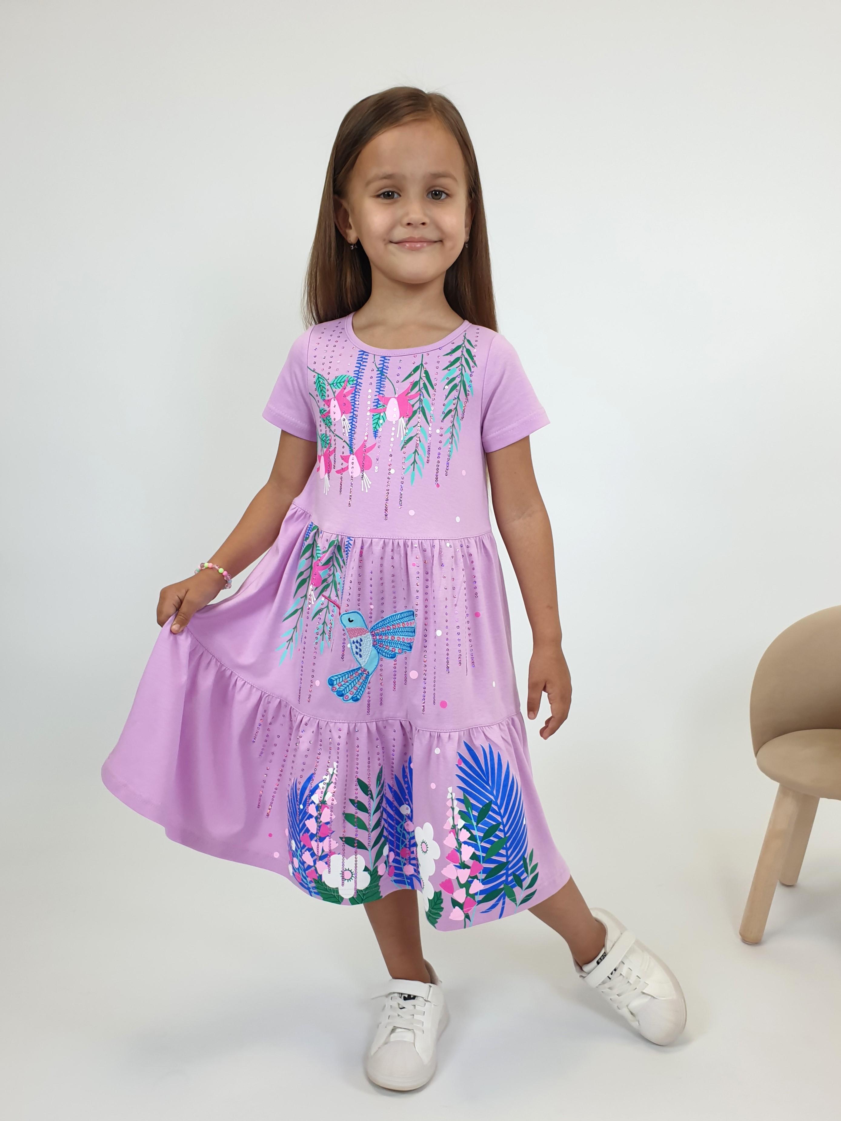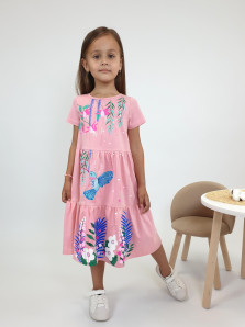 Кулирное полотно:100% х/б. Платье-силуэт трапеция,короткий втачной рукав.Юбка переда и спинки из двух воланов.Печать по передним воланам и вышивкой (пайетки).Кокетка переда с печатью и вышивкой (пайетки),застежка по спинке на пуговицы.Горловина окантована.