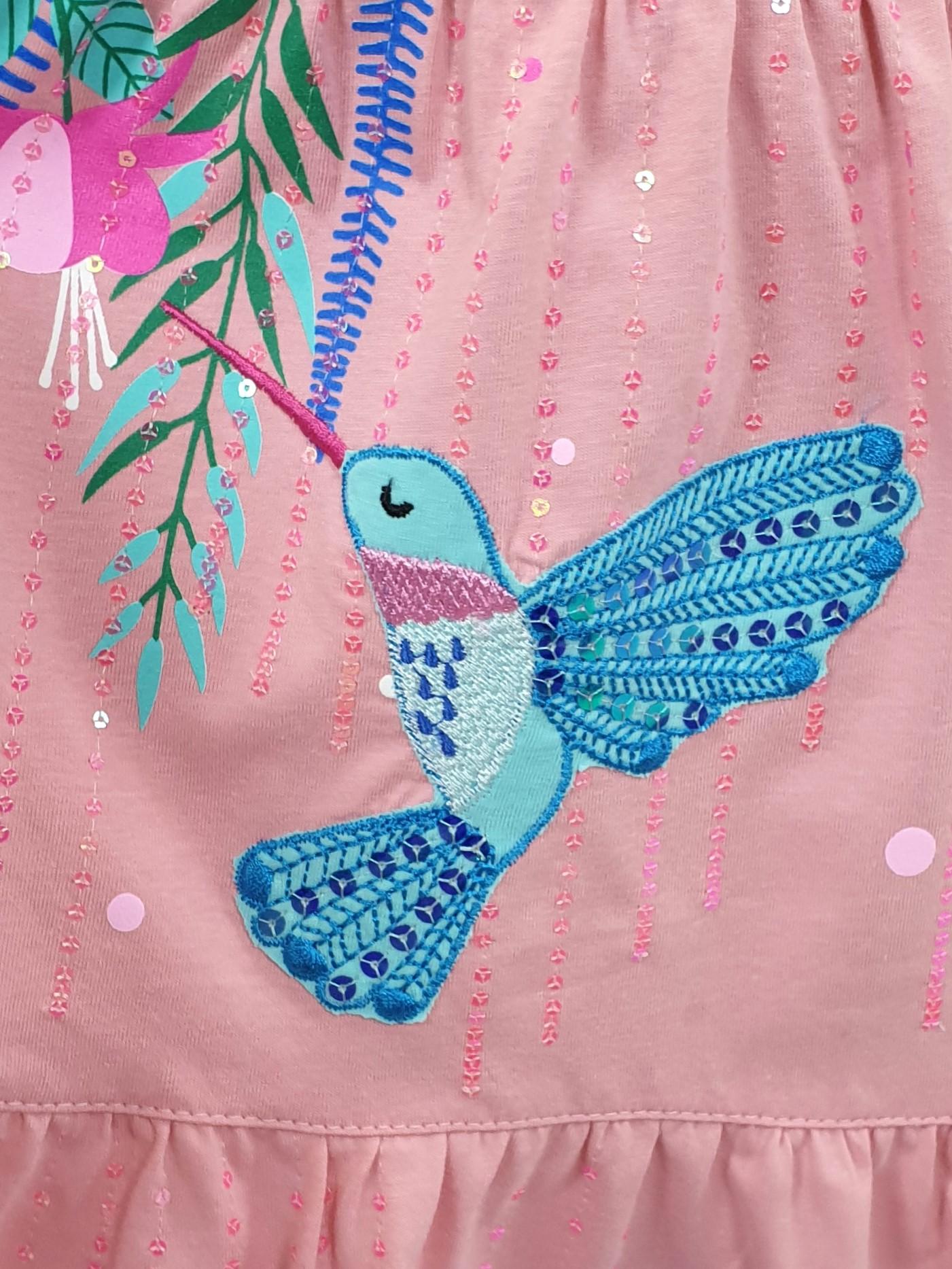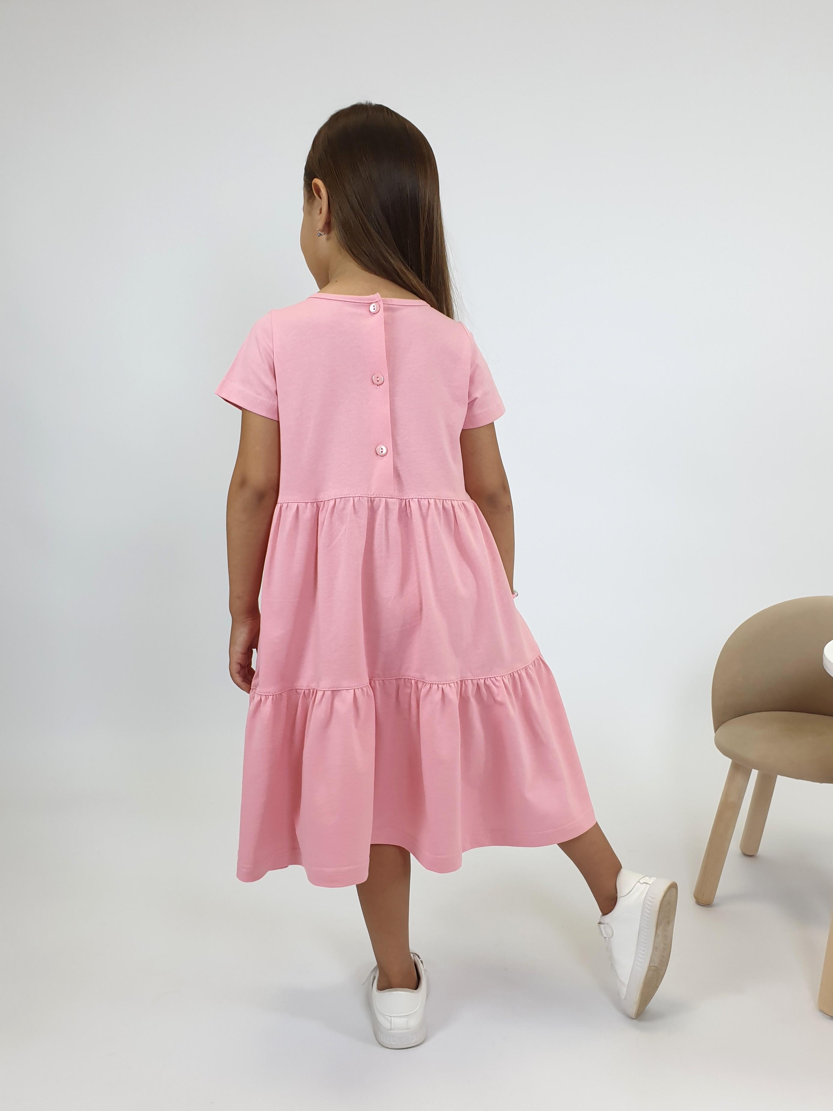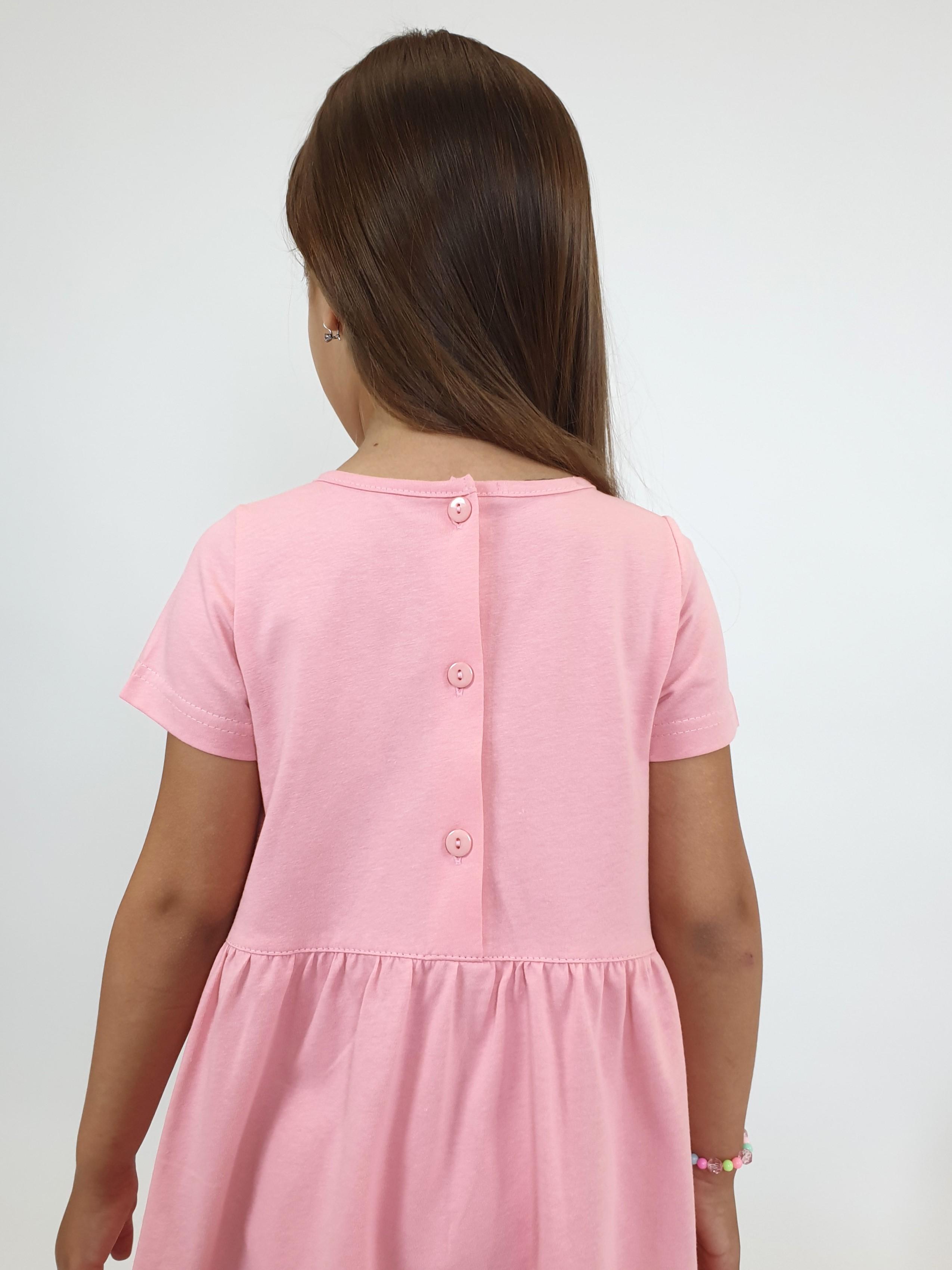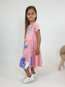 Кулирное полотно:100% х/б. Платье-силуэт трапеция,короткий втачной рукав.Юбка переда и спинки из двух воланов.Печать по передним воланам и вышивкой (пайетки).Кокетка переда с печатью и вышивкой (пайетки),застежка по спинке на пуговицы.Горловина окантована.