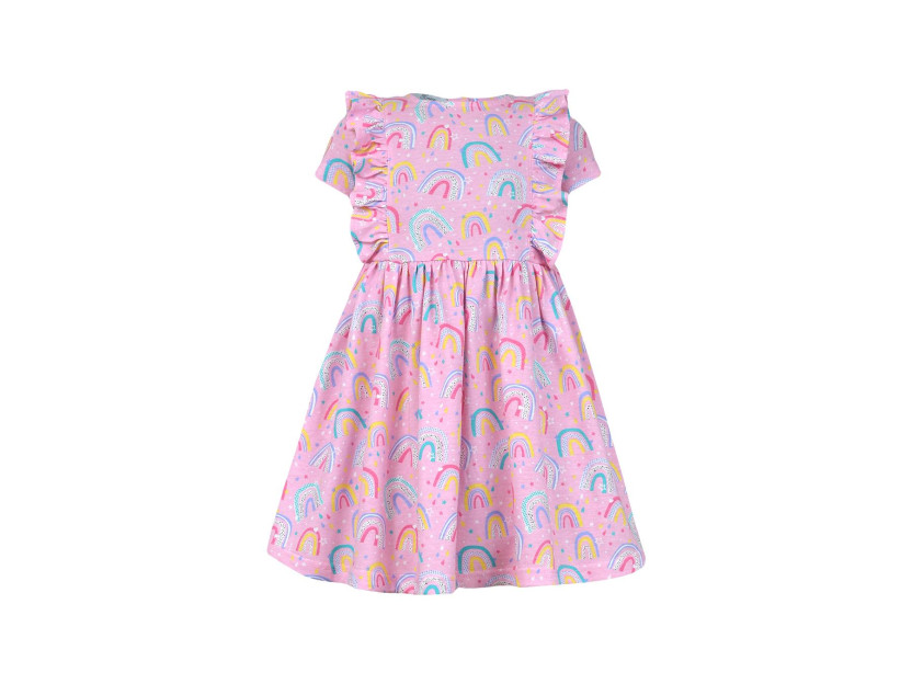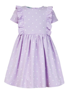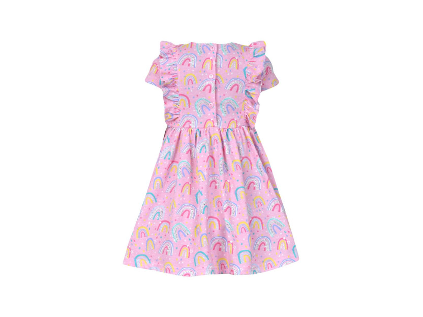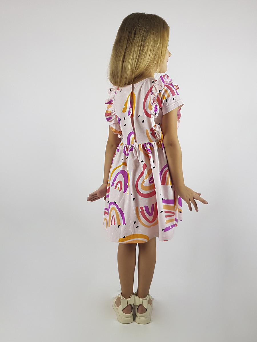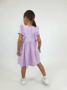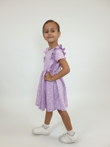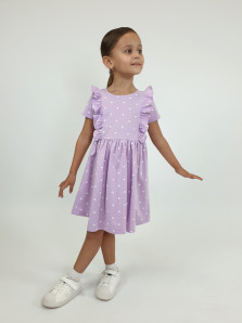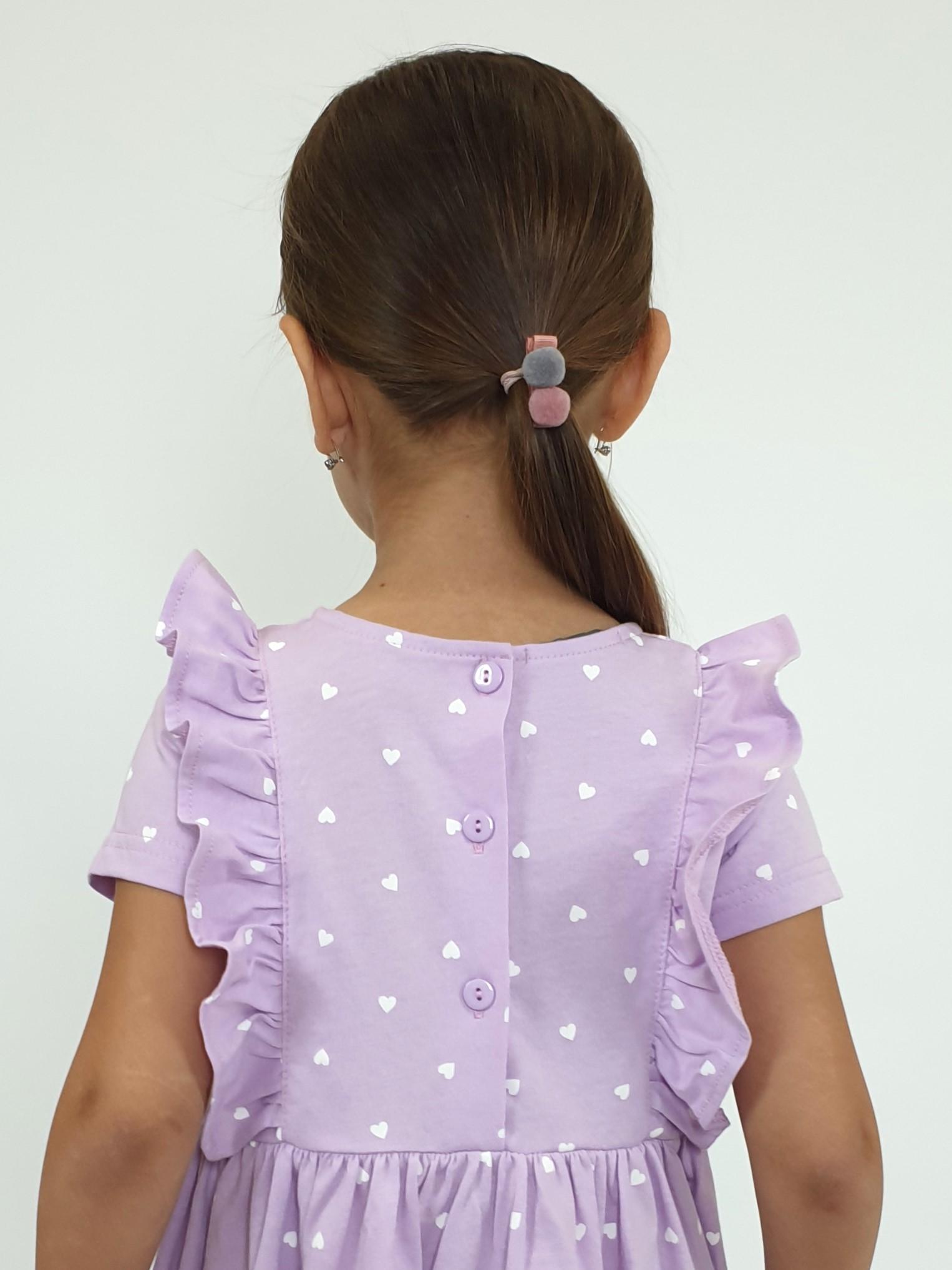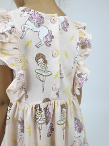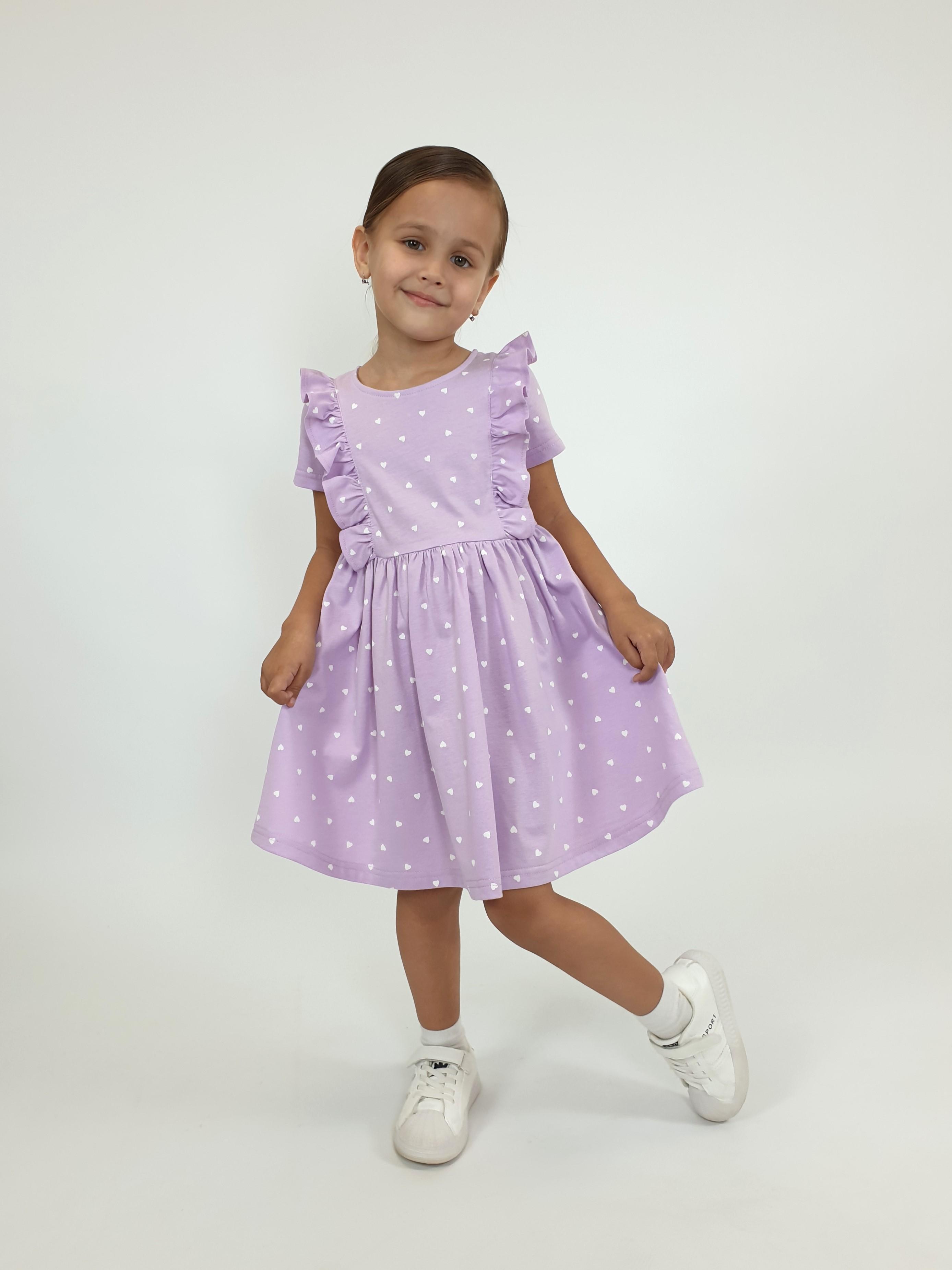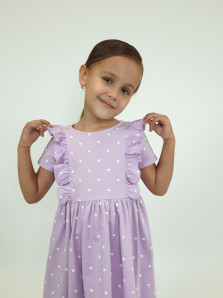 Кулирное полотно:100% х/б. Платье- полуприлегающего силуэта,короткий рукав. Отрезная юбка со сборкой, рельефы с рюшей. Горловина окантована и подшита. Застежка сзади на пуговицы.