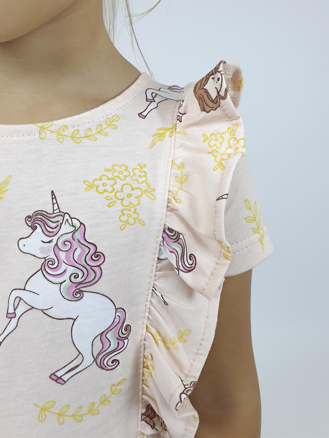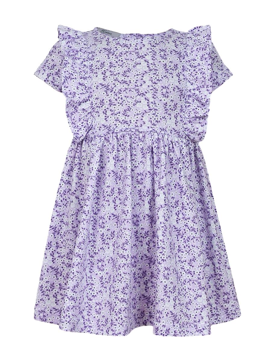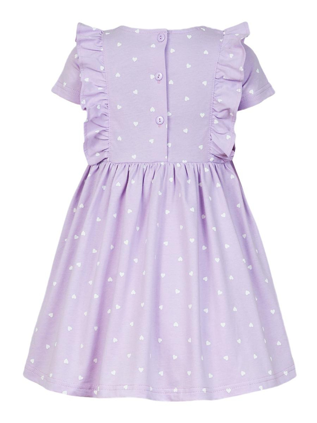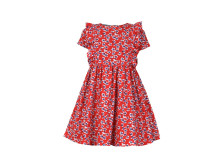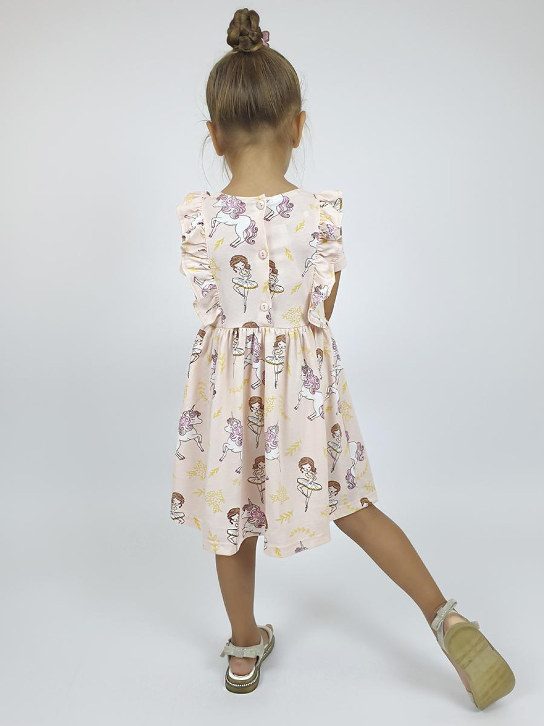 Кулирное полотно:100% х/б. Платье- полуприлегающего силуэта,короткий рукав. Отрезная юбка со сборкой, рельефы с рюшей. Горловина окантована и подшита. Застежка сзади на пуговицы.