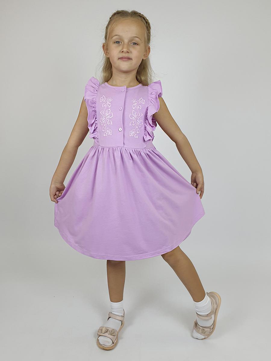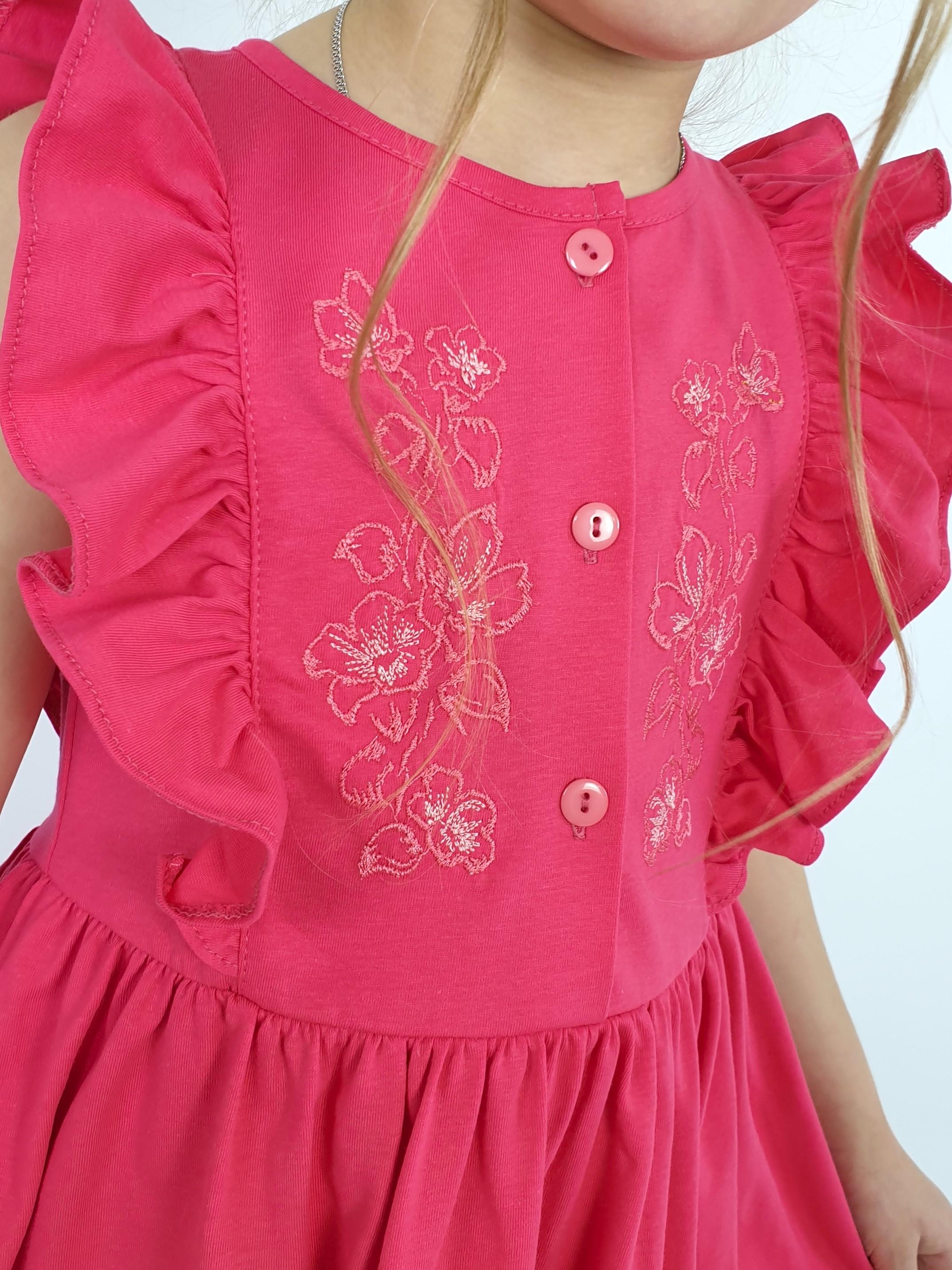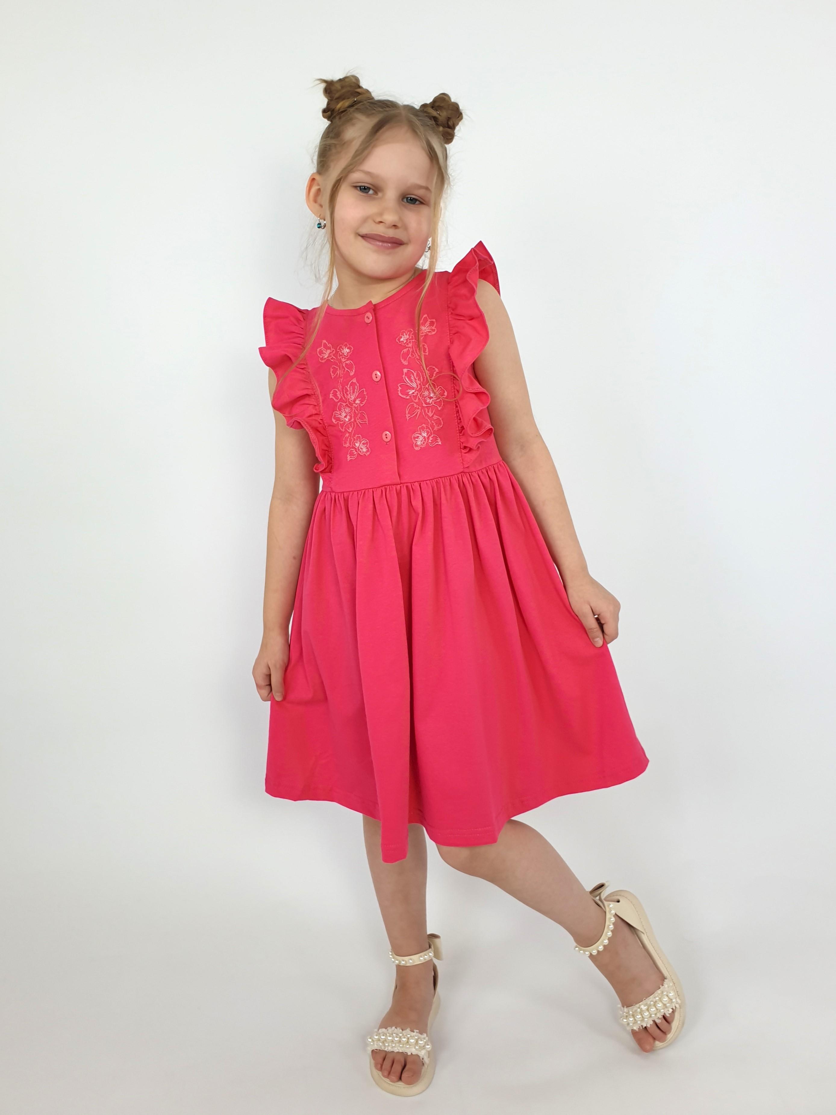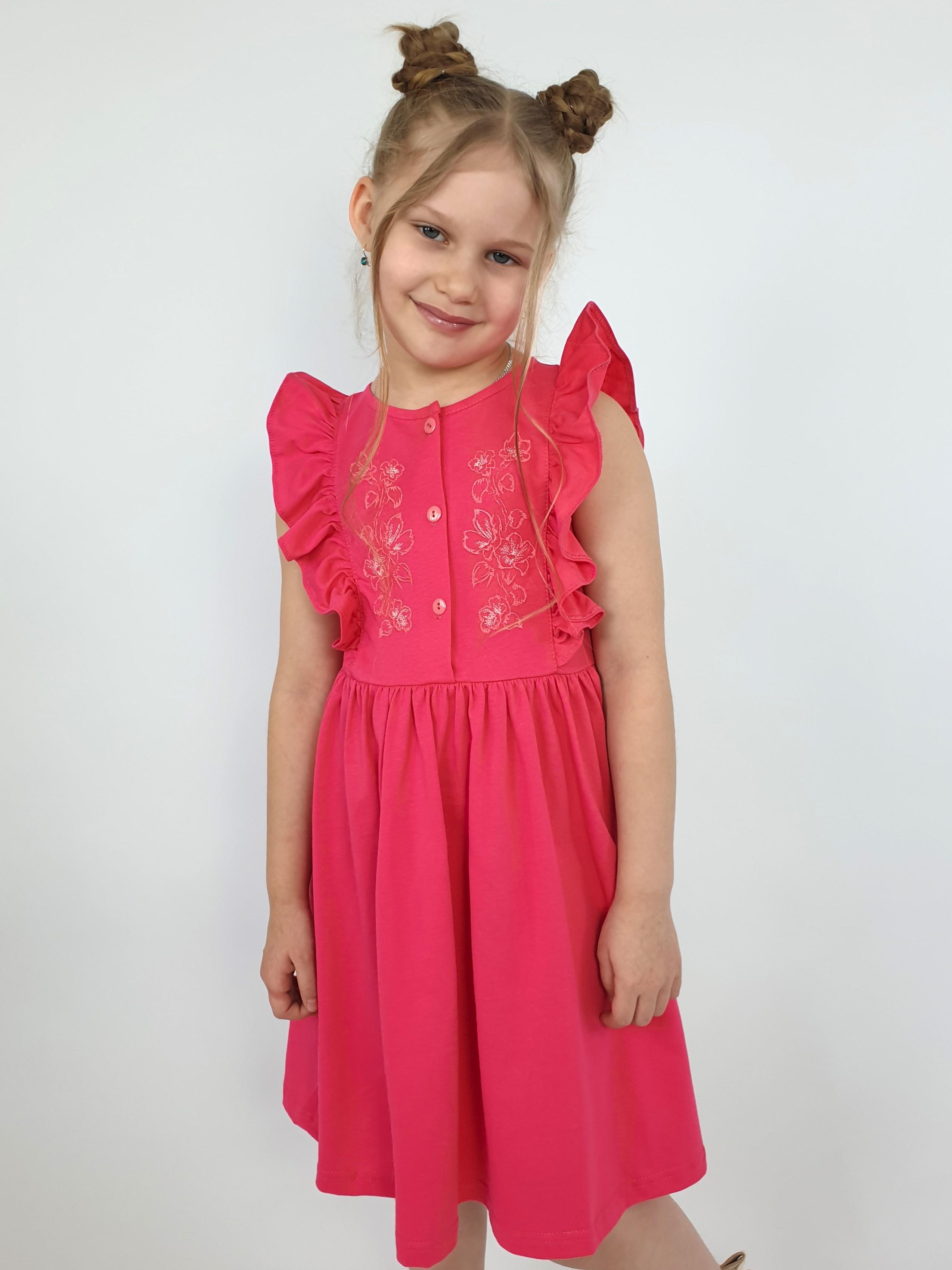 Летнее платье для девочки выполнено из качественного кулирного полотна ( 100% хлопок). Модель полуприлегающего силуэта ,декорирована оригинальным принтом с вышивкой и рюшами . Застёжка по центру на пуговицы.Такое платье идеально подойдёт как на каждый день, так и при особых случаях. Материал легкий, приятный на ощупь, устойчивый к частым стиркам.