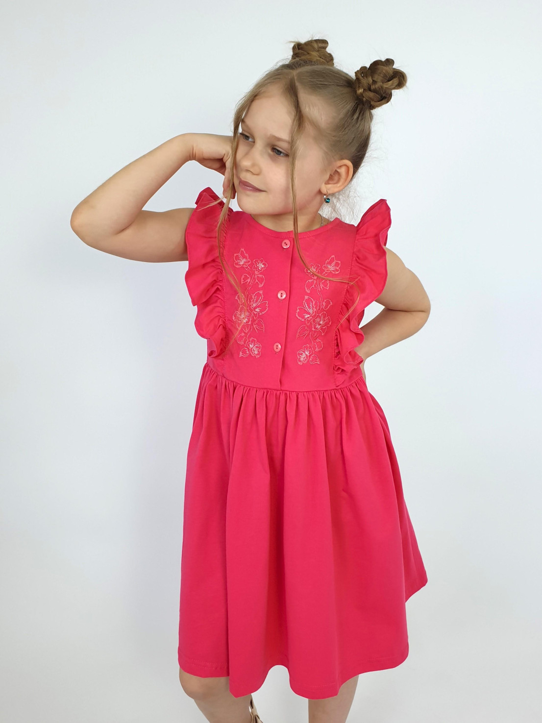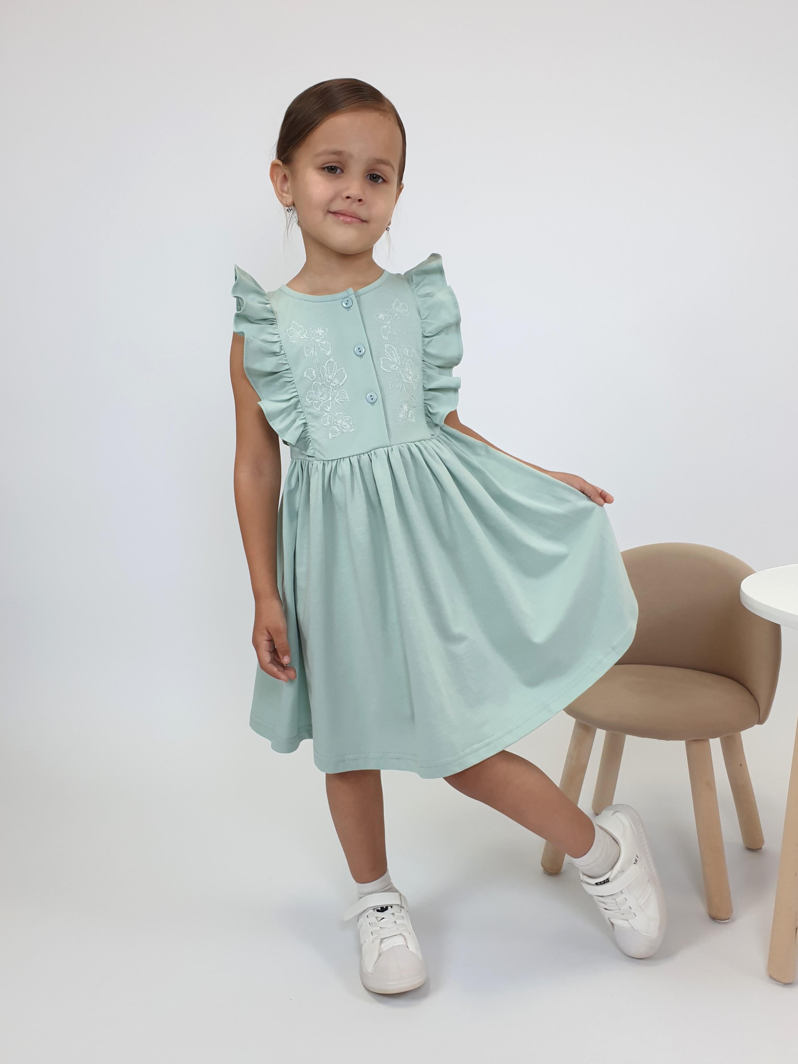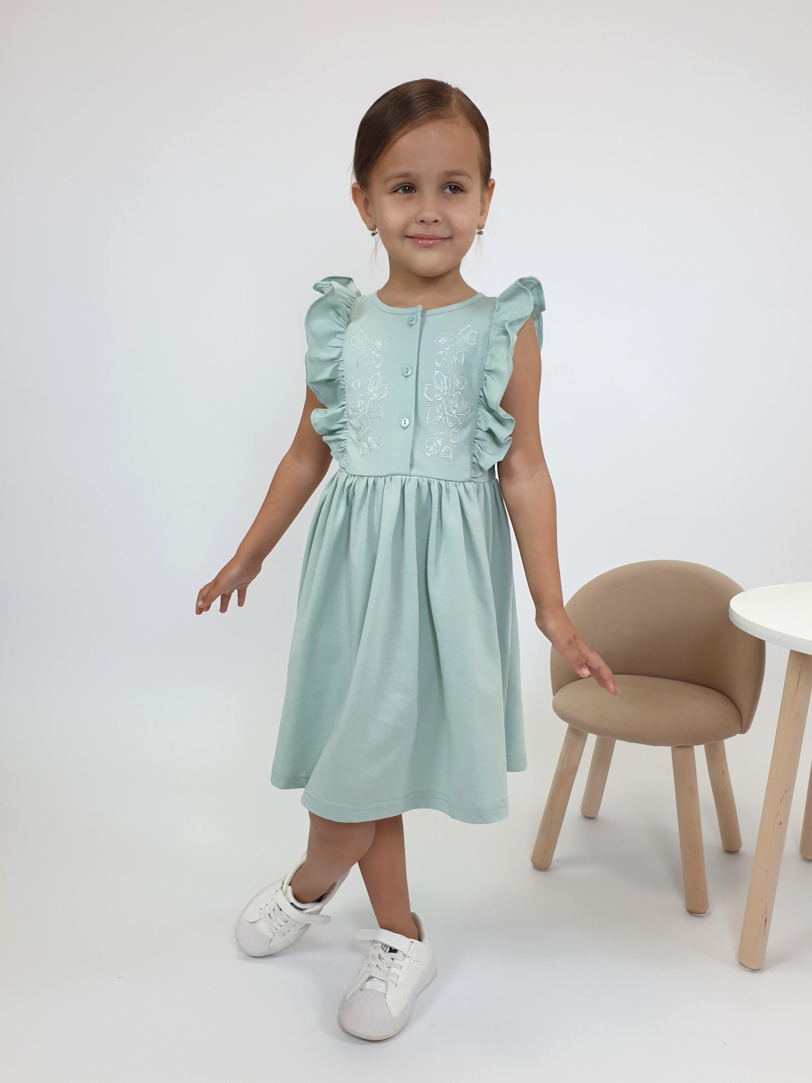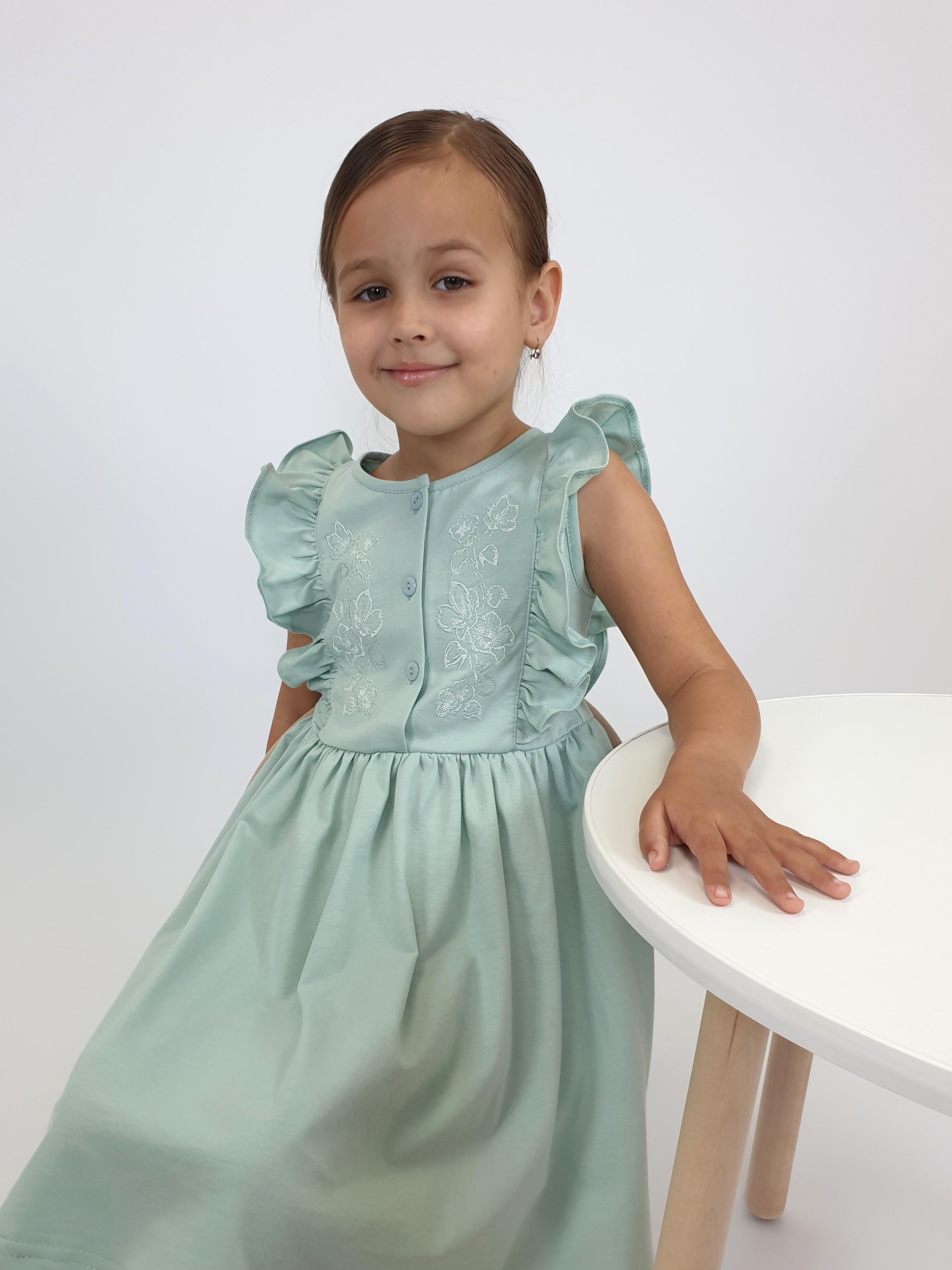 Летнее платье для девочки выполнено из качественного кулирного полотна ( 100% хлопок). Модель полуприлегающего силуэта ,декорирована оригинальным принтом с вышивкой и рюшами . Застёжка по центру на пуговицы.Такое платье идеально подойдёт как на каждый день, так и при особых случаях. Материал легкий, приятный на ощупь, устойчивый к частым стиркам.
