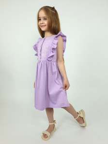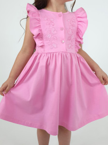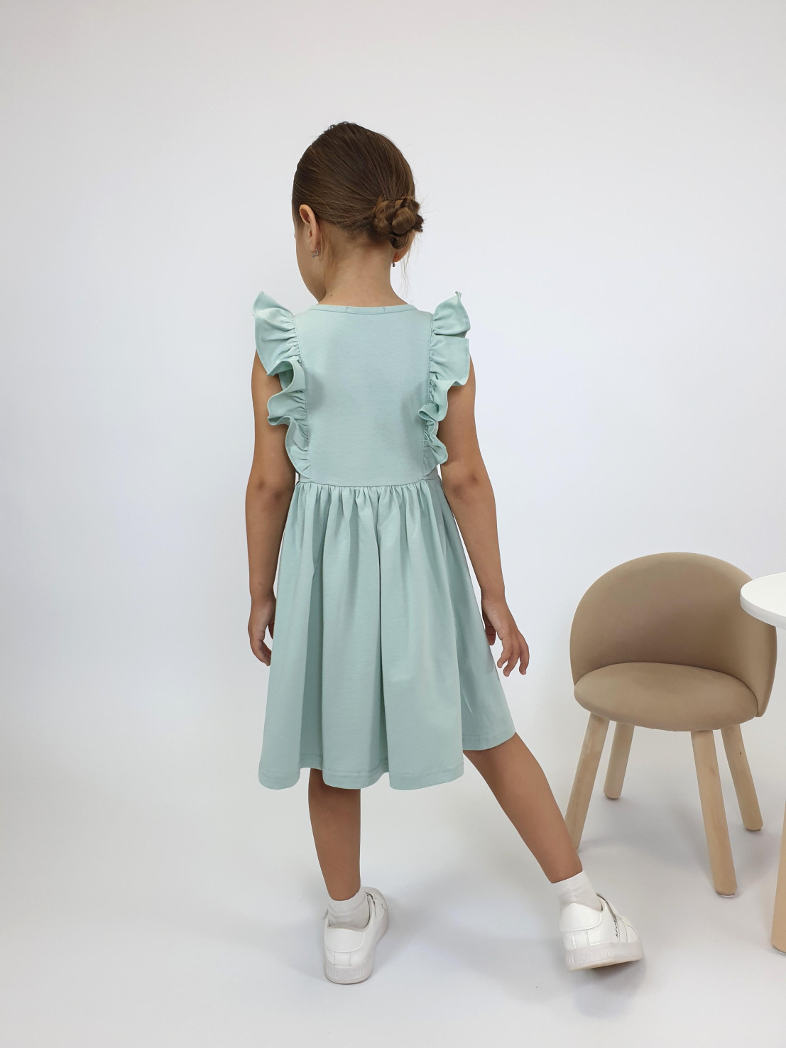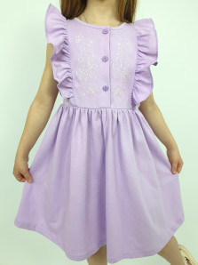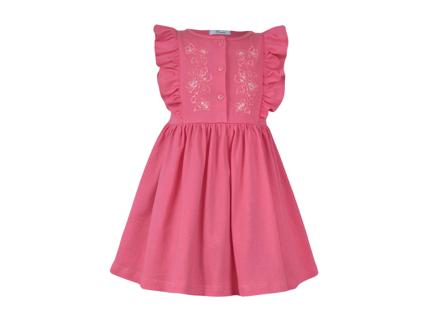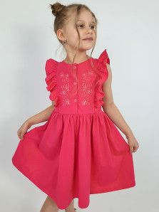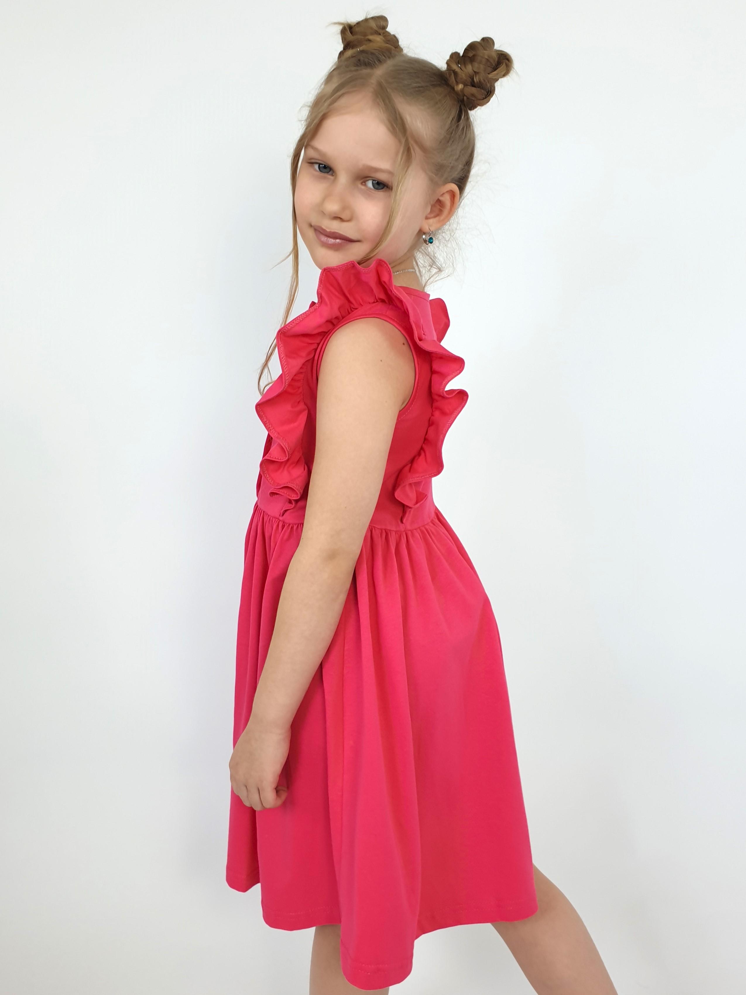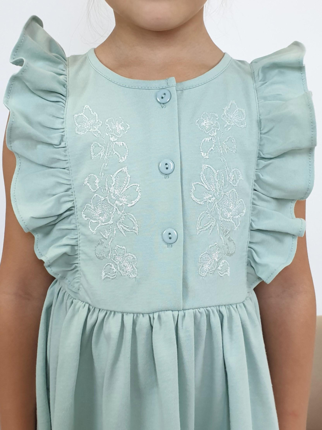 Летнее платье для девочки выполнено из качественного кулирного полотна ( 100% хлопок). Модель полуприлегающего силуэта ,декорирована оригинальным принтом с вышивкой и рюшами . Застёжка по центру на пуговицы.Такое платье идеально подойдёт как на каждый день, так и при особых случаях. Материал легкий, приятный на ощупь, устойчивый к частым стиркам.