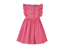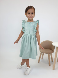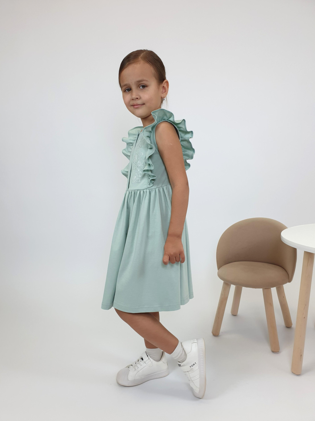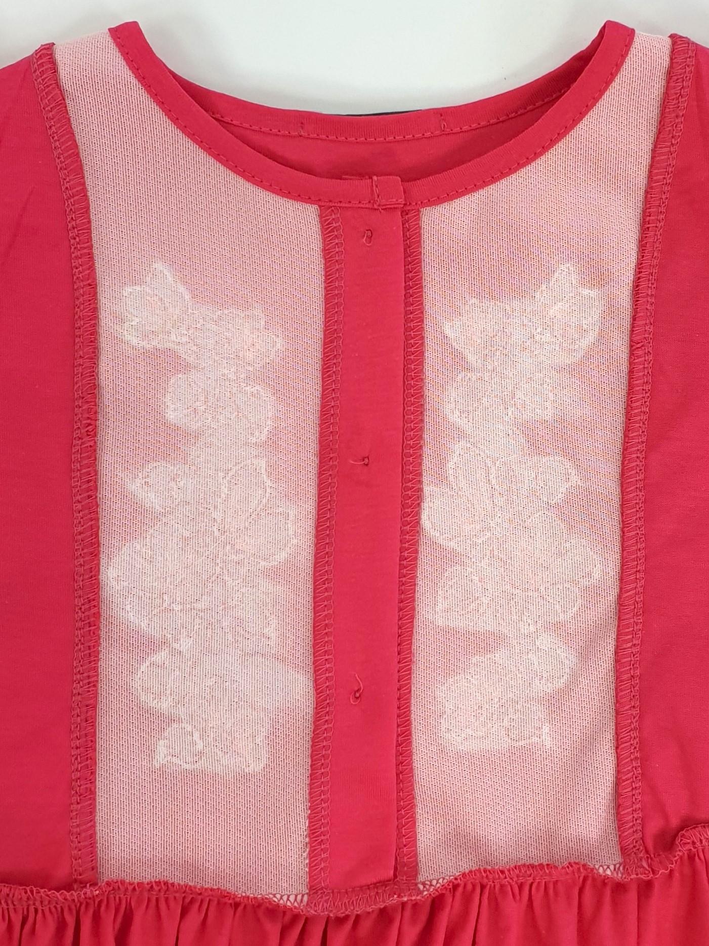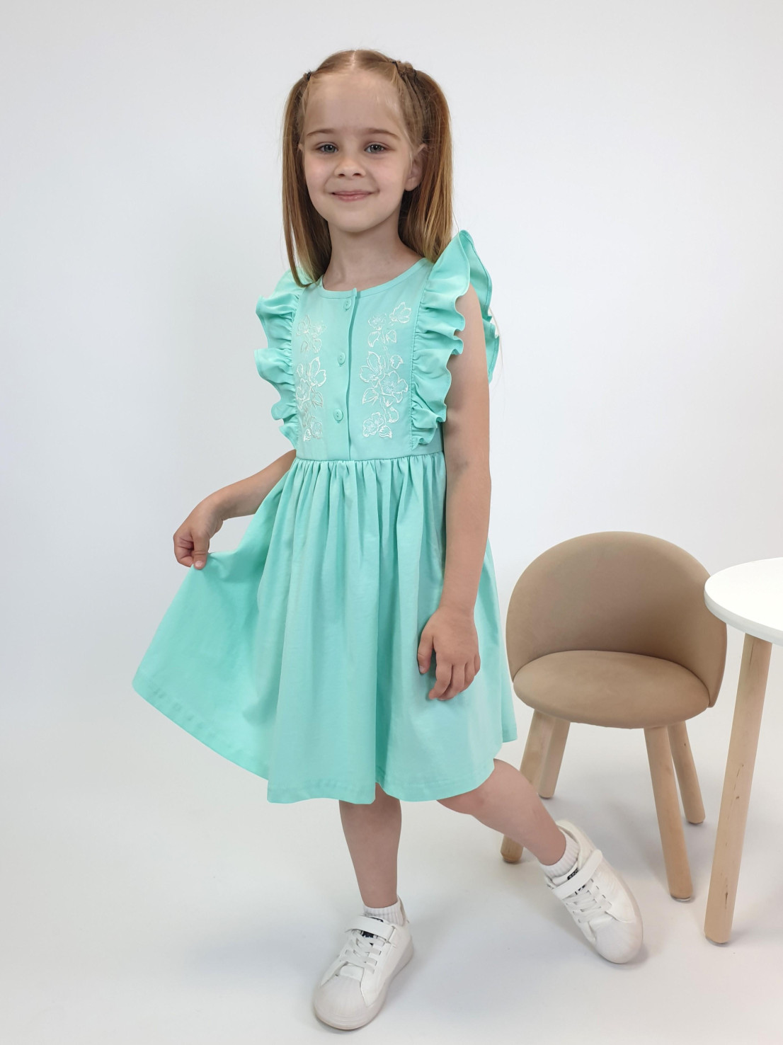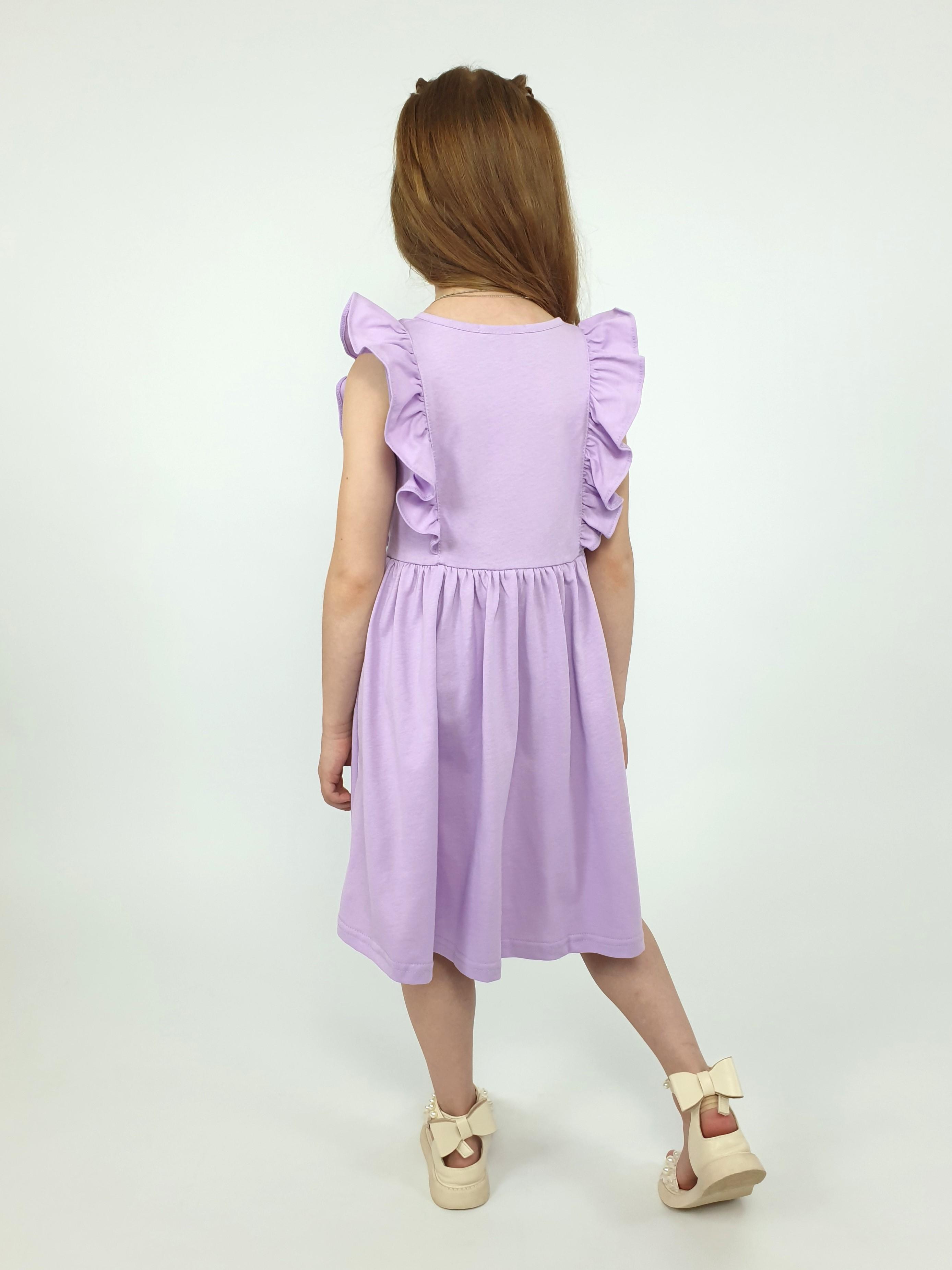 Летнее платье для девочки выполнено из качественного кулирного полотна ( 100% хлопок). Модель полуприлегающего силуэта ,декорирована оригинальным принтом с вышивкой и рюшами . Застёжка по центру на пуговицы.Такое платье идеально подойдёт как на каждый день, так и при особых случаях. Материал легкий, приятный на ощупь, устойчивый к частым стиркам.