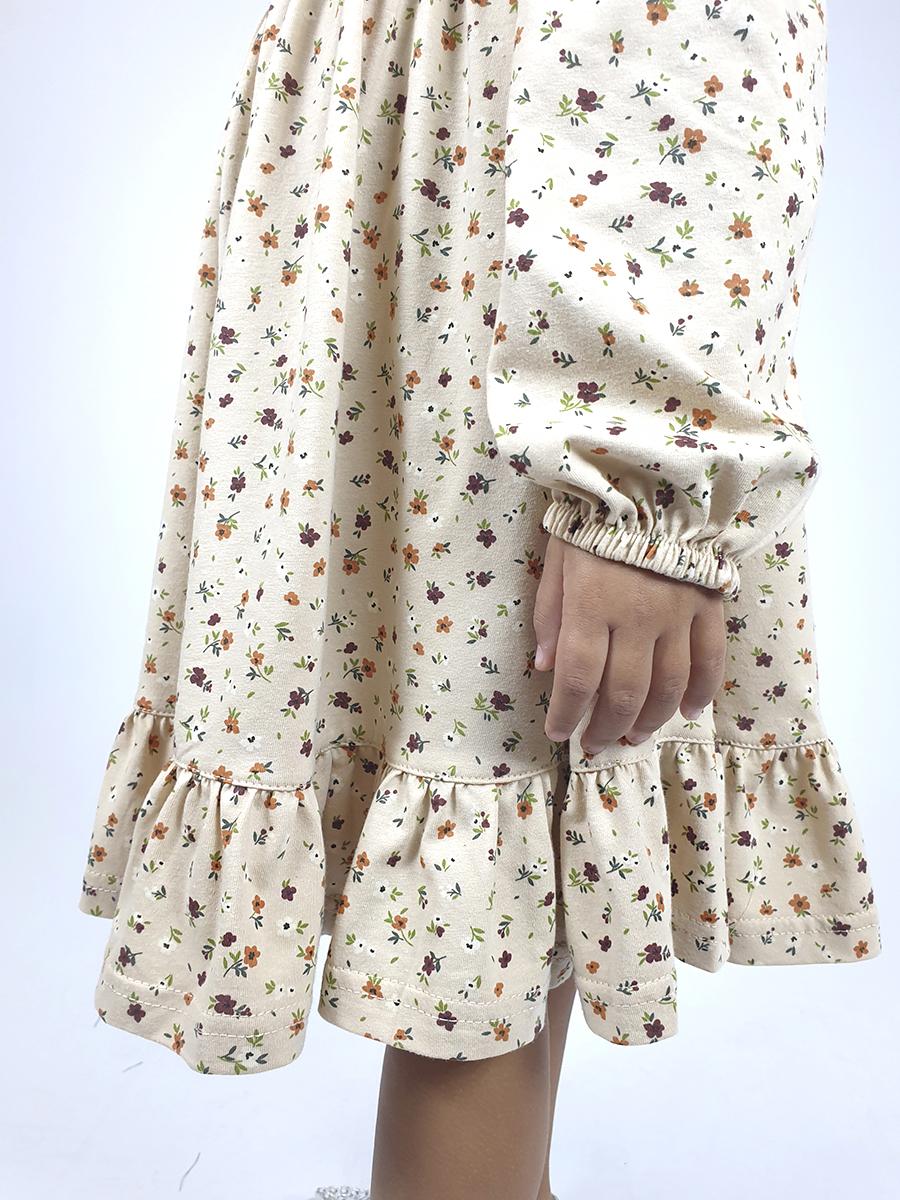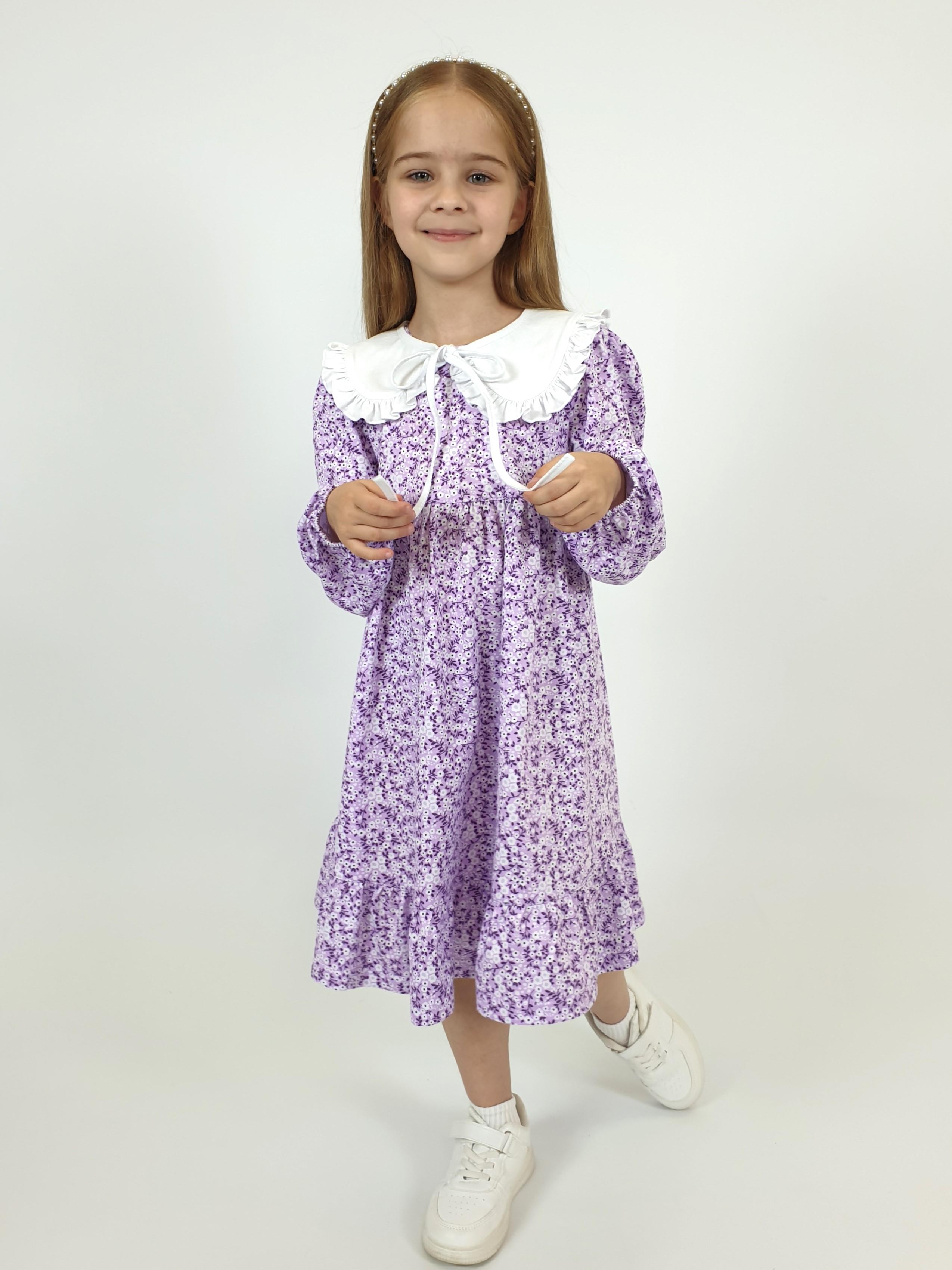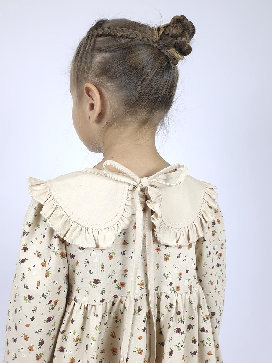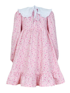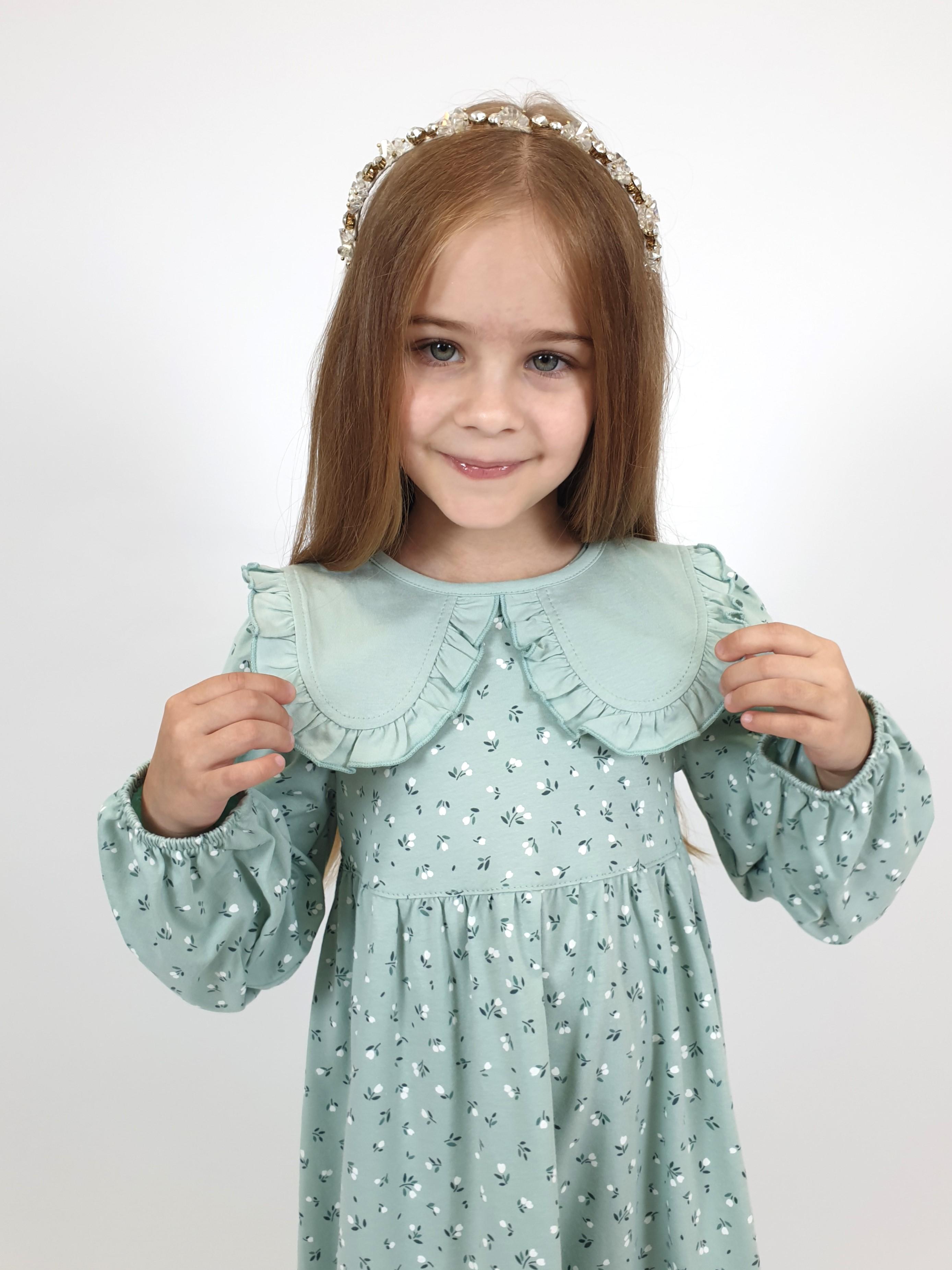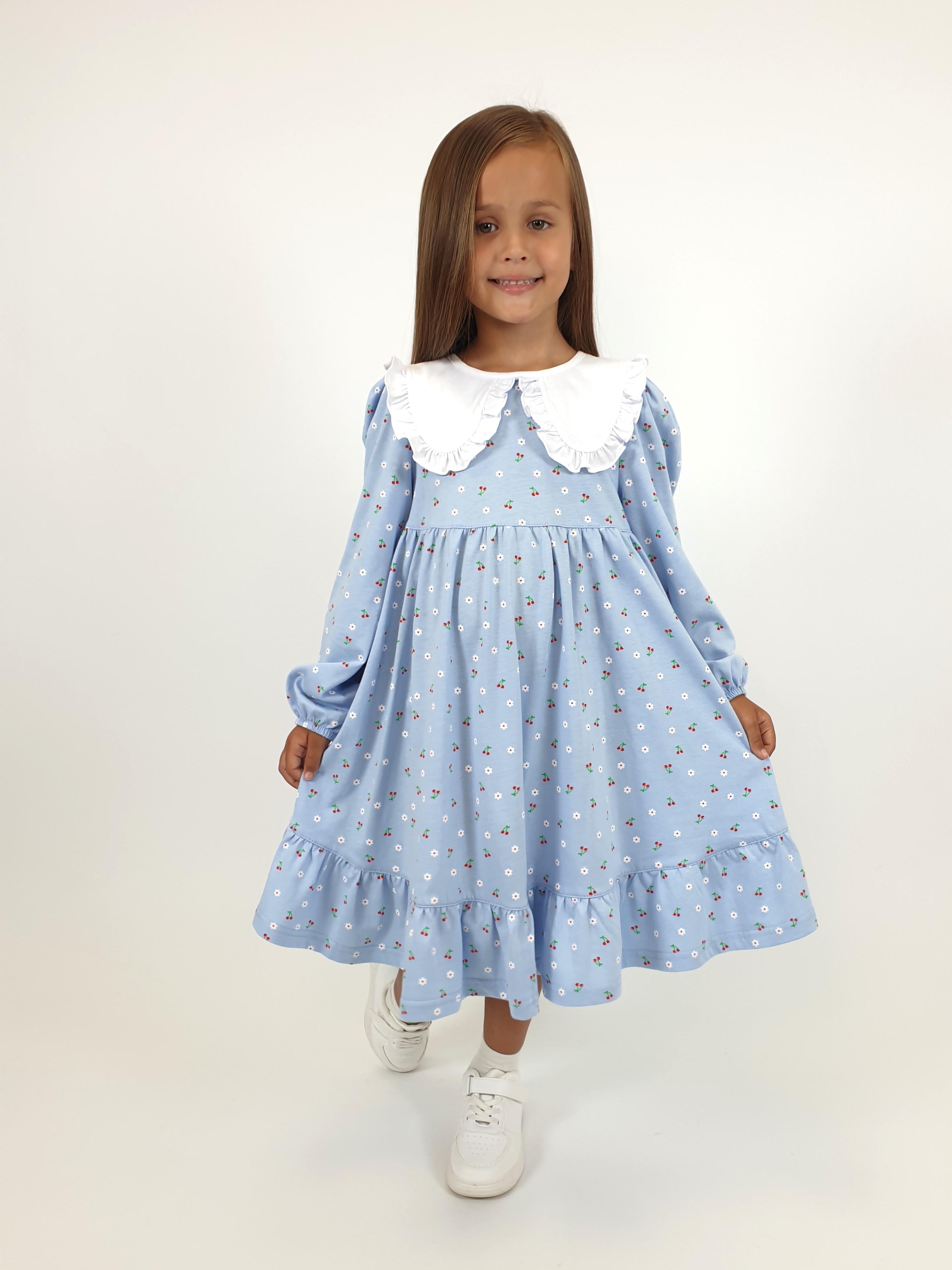 Кулирное полотно:100% х/б. Платье-силуэт трапеция,длинный втачной рукав сборка по окату,внизу на резинке.Юбка отрезная со сборкой,внизу с воланом.Горловина окантована и подшита,застежка на пуговицу по спинке.Отделочный,съемный воротник.