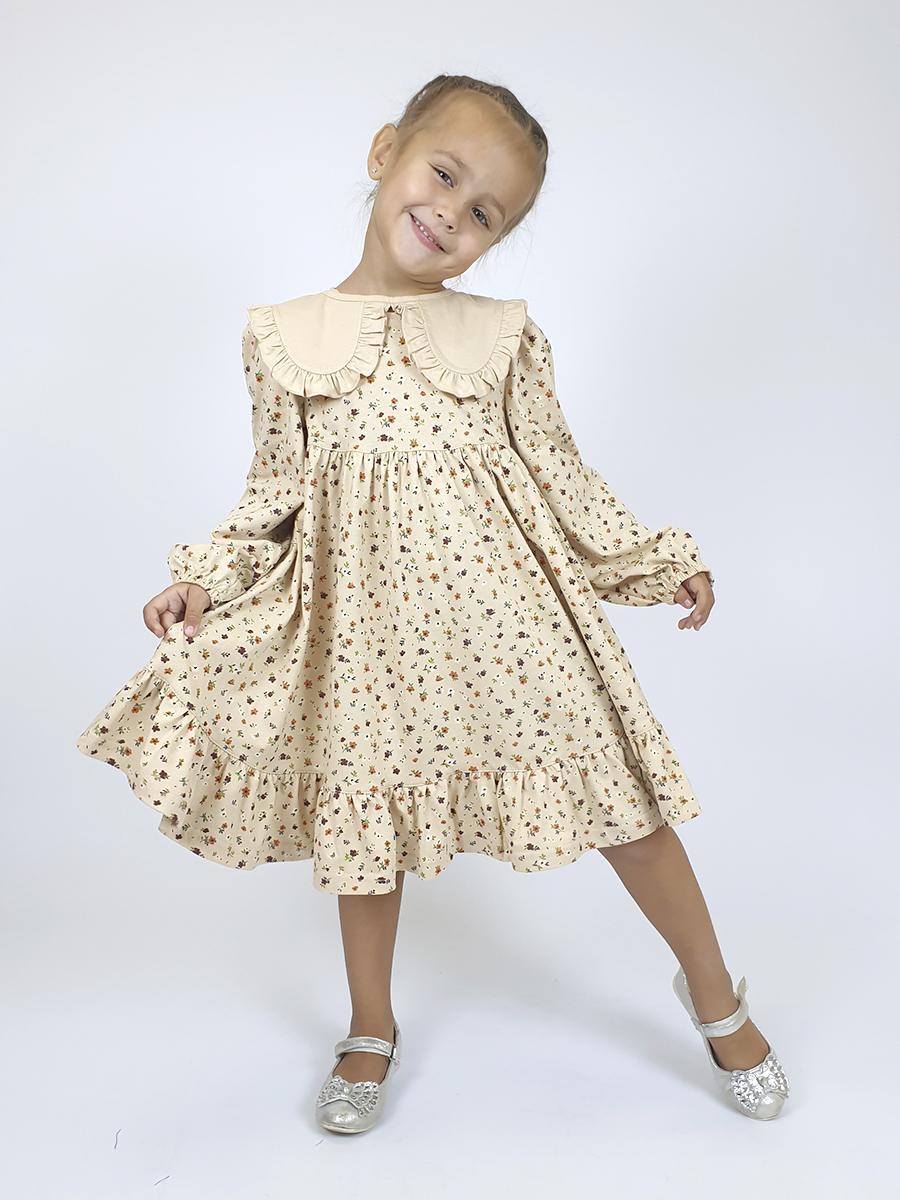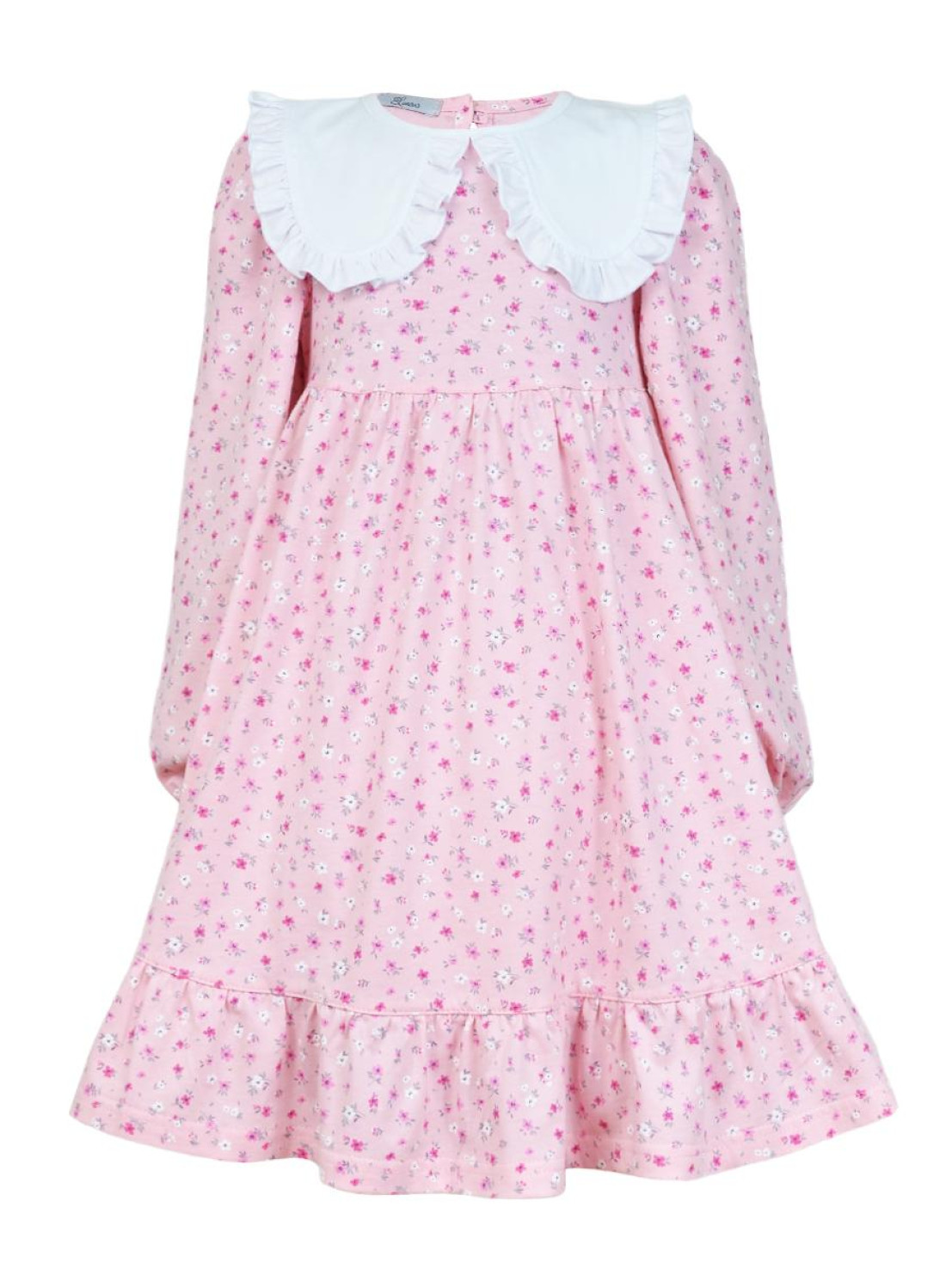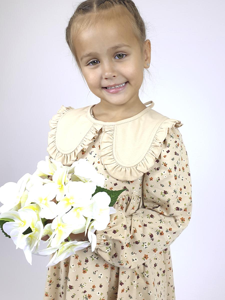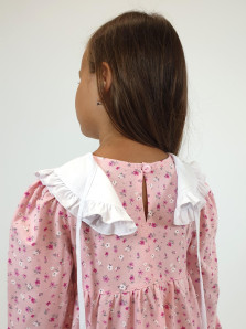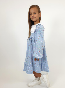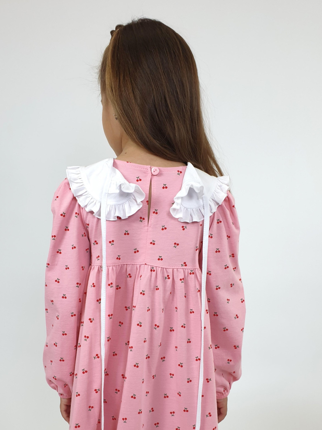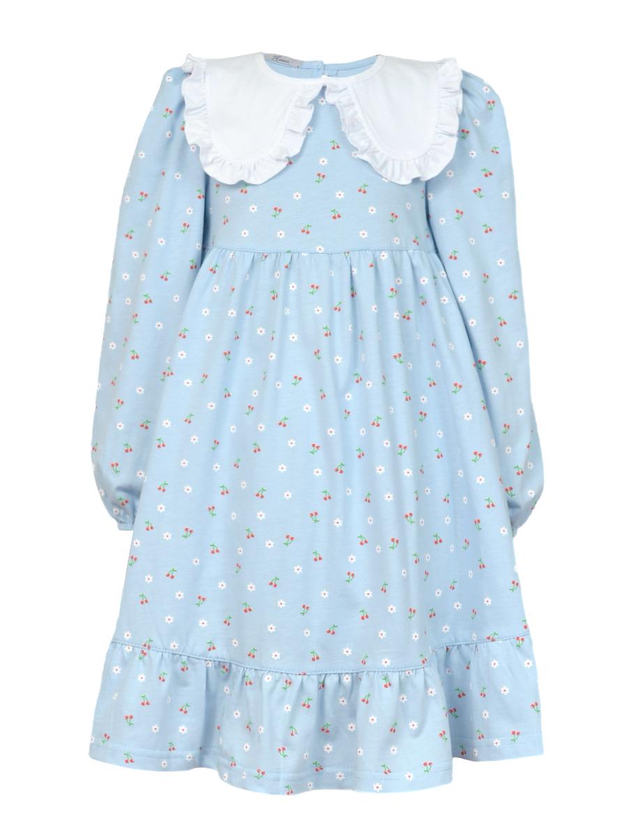 Кулирное полотно:100% х/б. Платье-силуэт трапеция,длинный втачной рукав сборка по окату,внизу на резинке.Юбка отрезная со сборкой,внизу с воланом.Горловина окантована и подшита,застежка на пуговицу по спинке.Отделочный,съемный воротник.