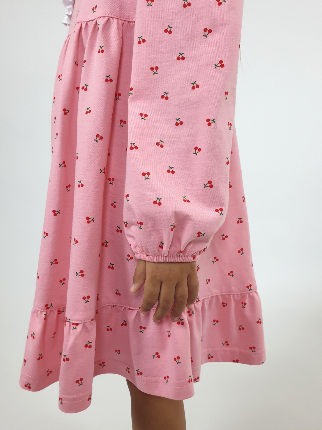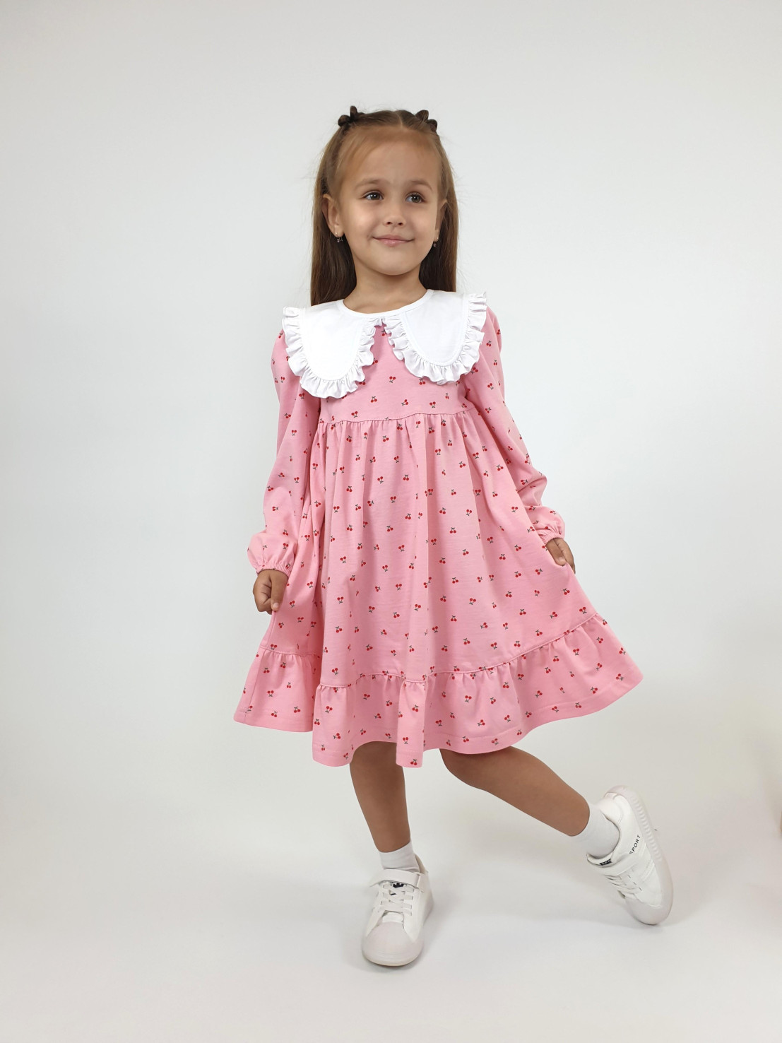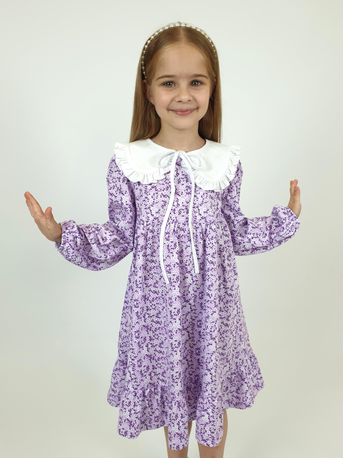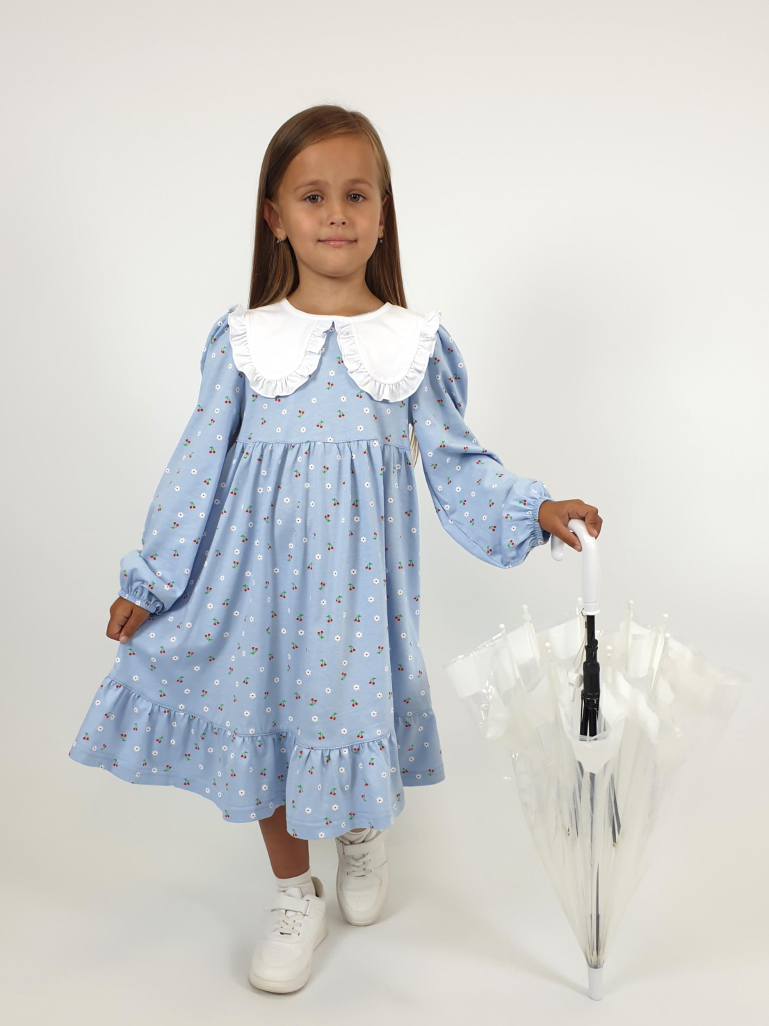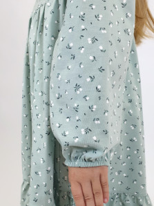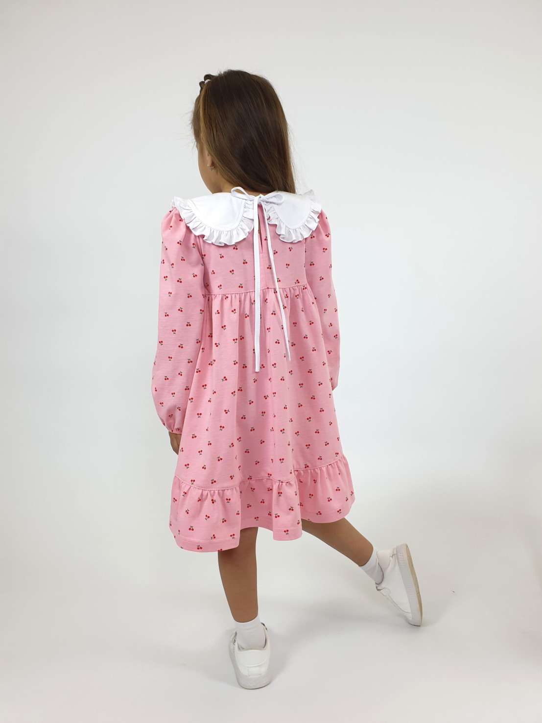 Кулирное полотно:100% х/б. Платье-силуэт трапеция,длинный втачной рукав сборка по окату,внизу на резинке.Юбка отрезная со сборкой,внизу с воланом.Горловина окантована и подшита,застежка на пуговицу по спинке.Отделочный,съемный воротник.