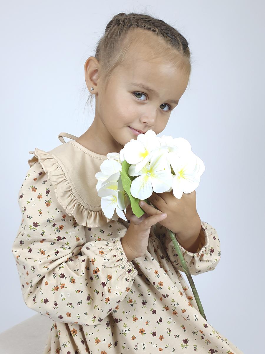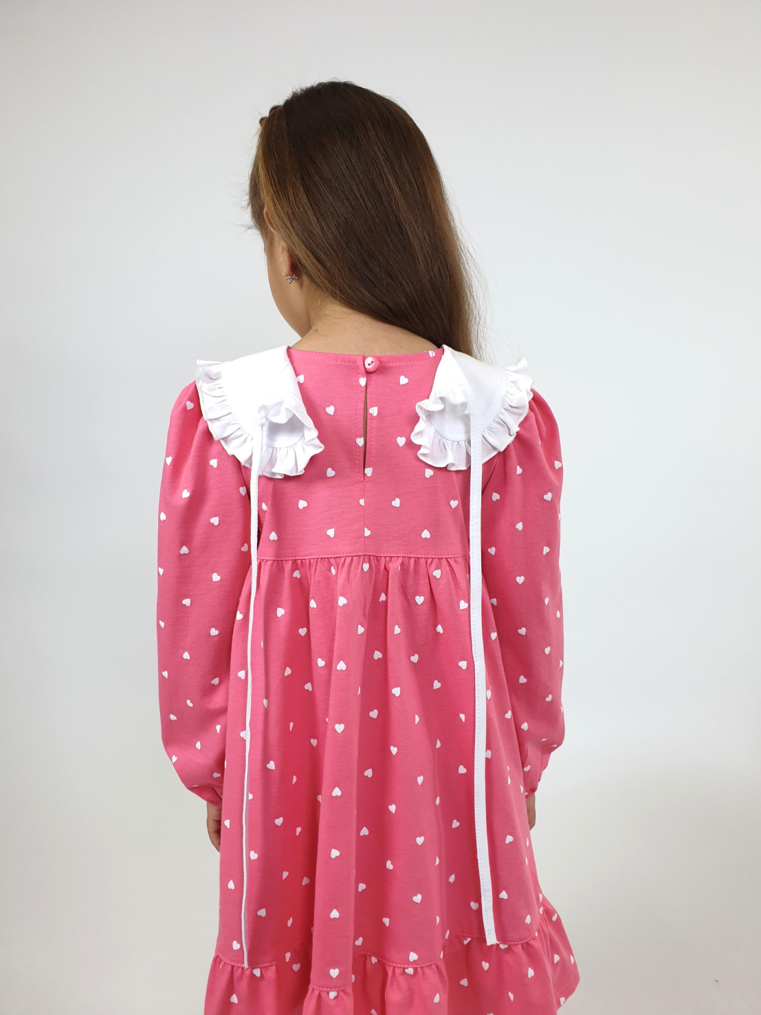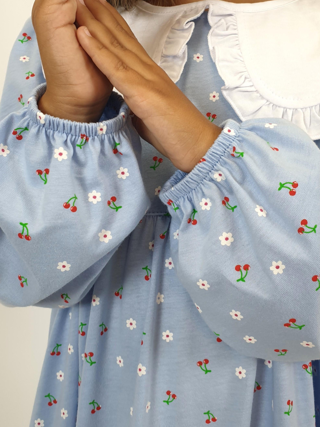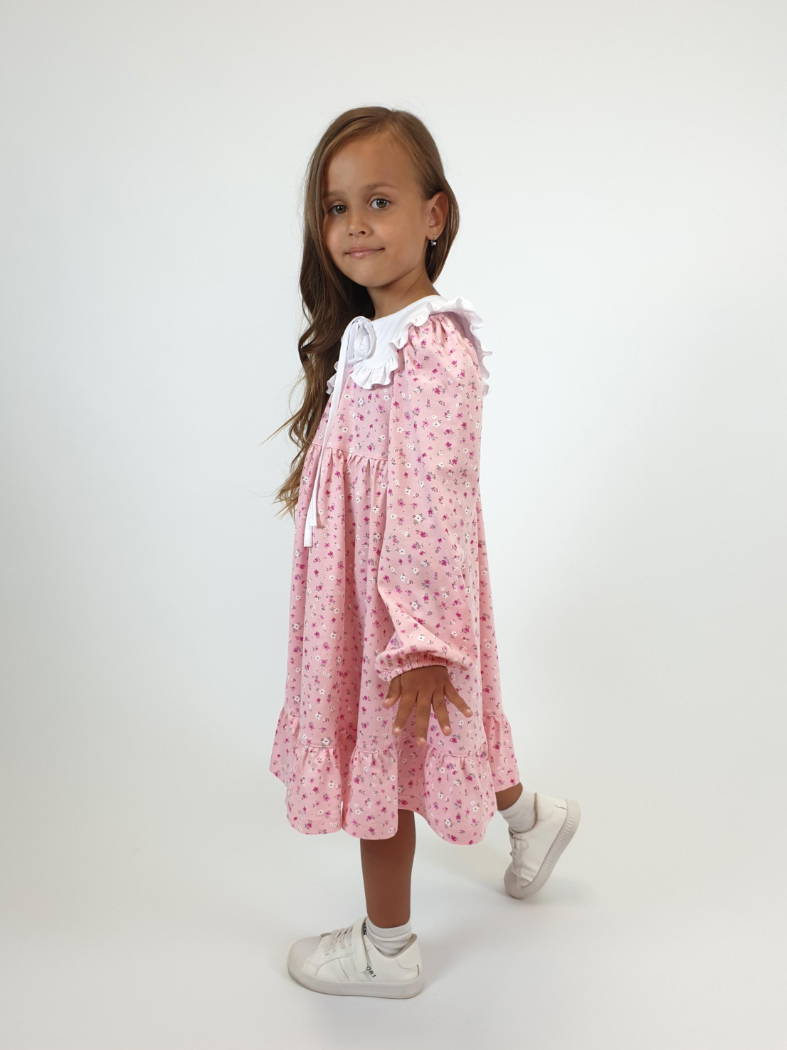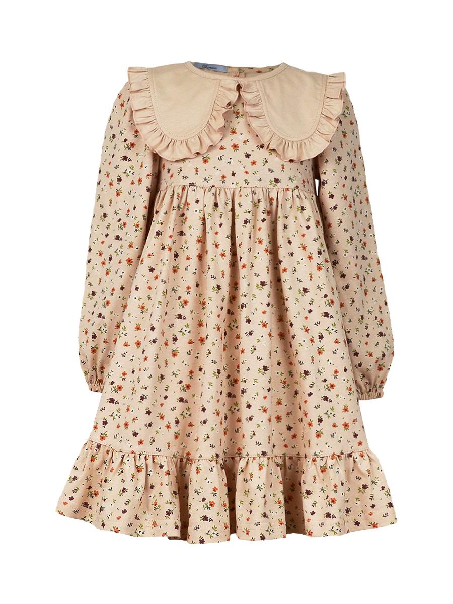 Кулирное полотно:100% х/б. Платье-силуэт трапеция,длинный втачной рукав сборка по окату,внизу на резинке.Юбка отрезная со сборкой,внизу с воланом.Горловина окантована и подшита,застежка на пуговицу по спинке.Отделочный,съемный воротник.