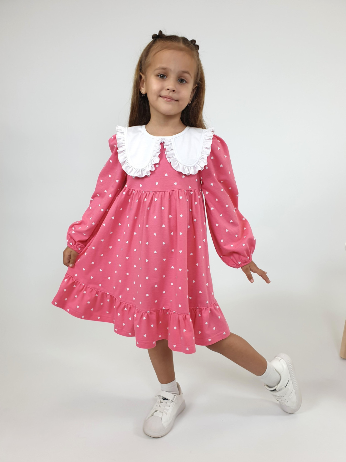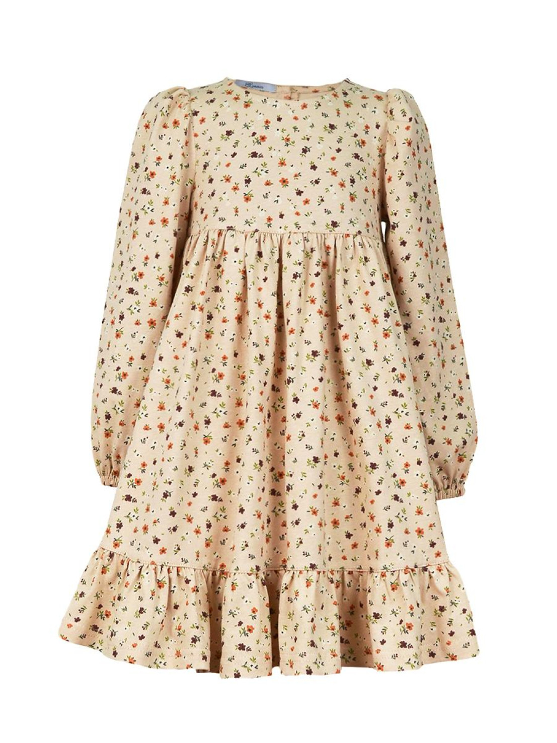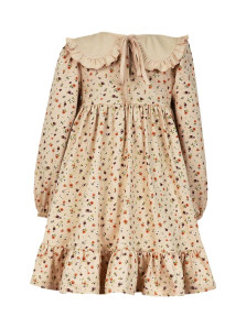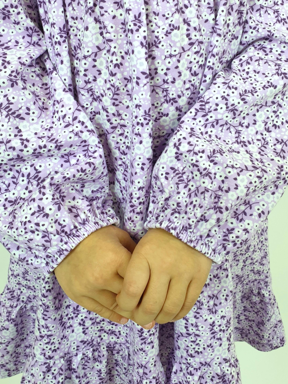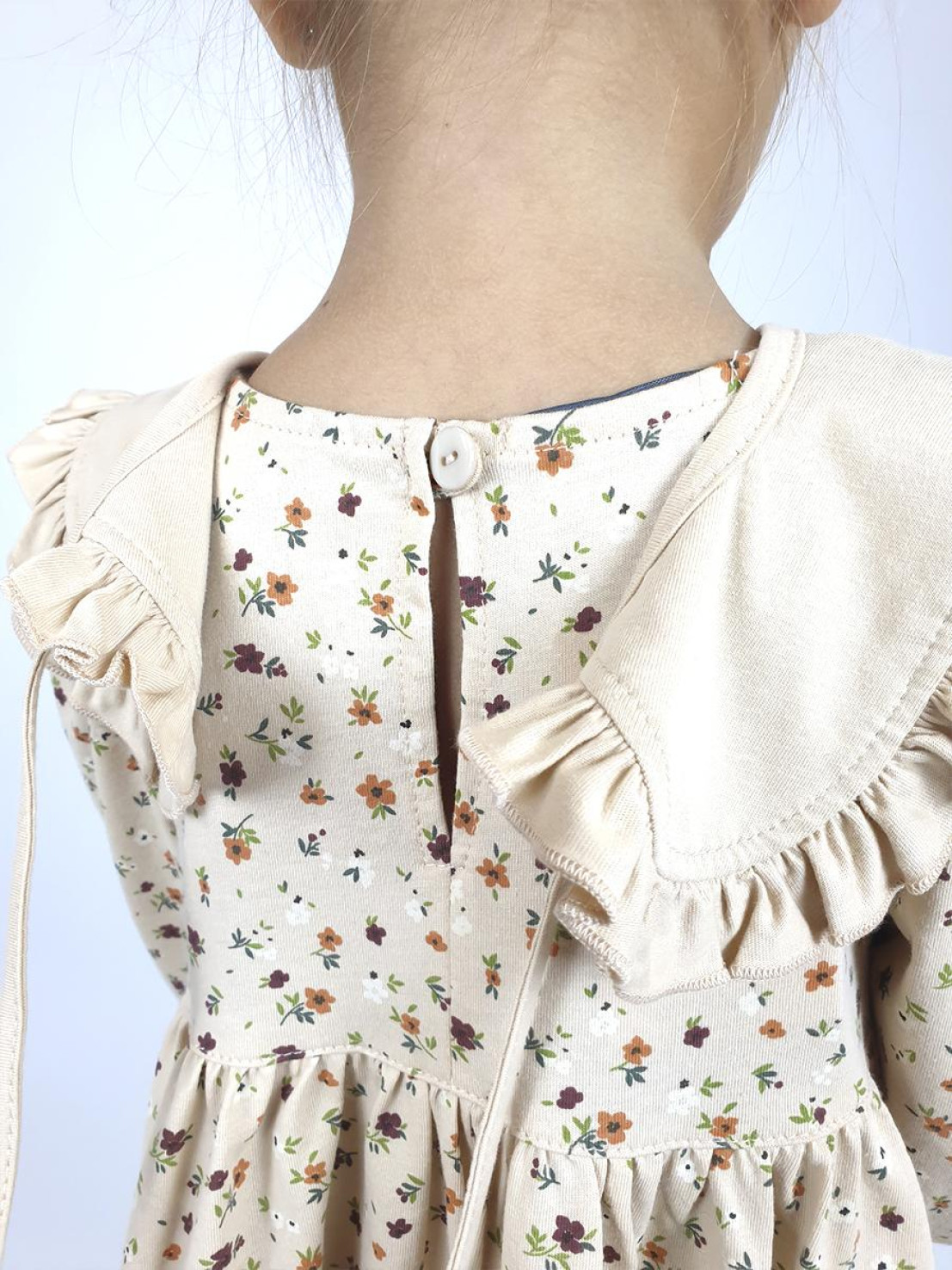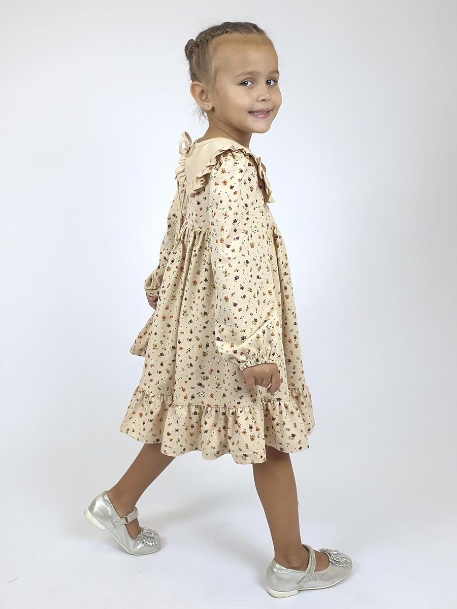 Кулирное полотно:100% х/б. Платье-силуэт трапеция,длинный втачной рукав сборка по окату,внизу на резинке.Юбка отрезная со сборкой,внизу с воланом.Горловина окантована и подшита,застежка на пуговицу по спинке.Отделочный,съемный воротник.