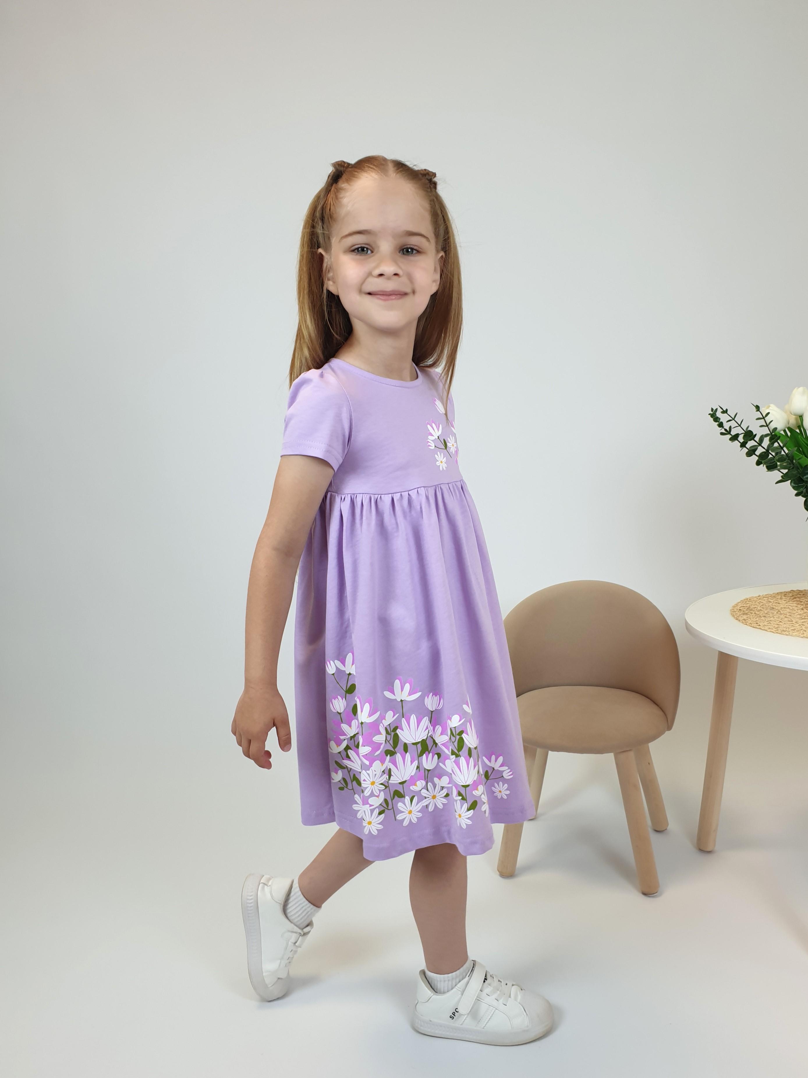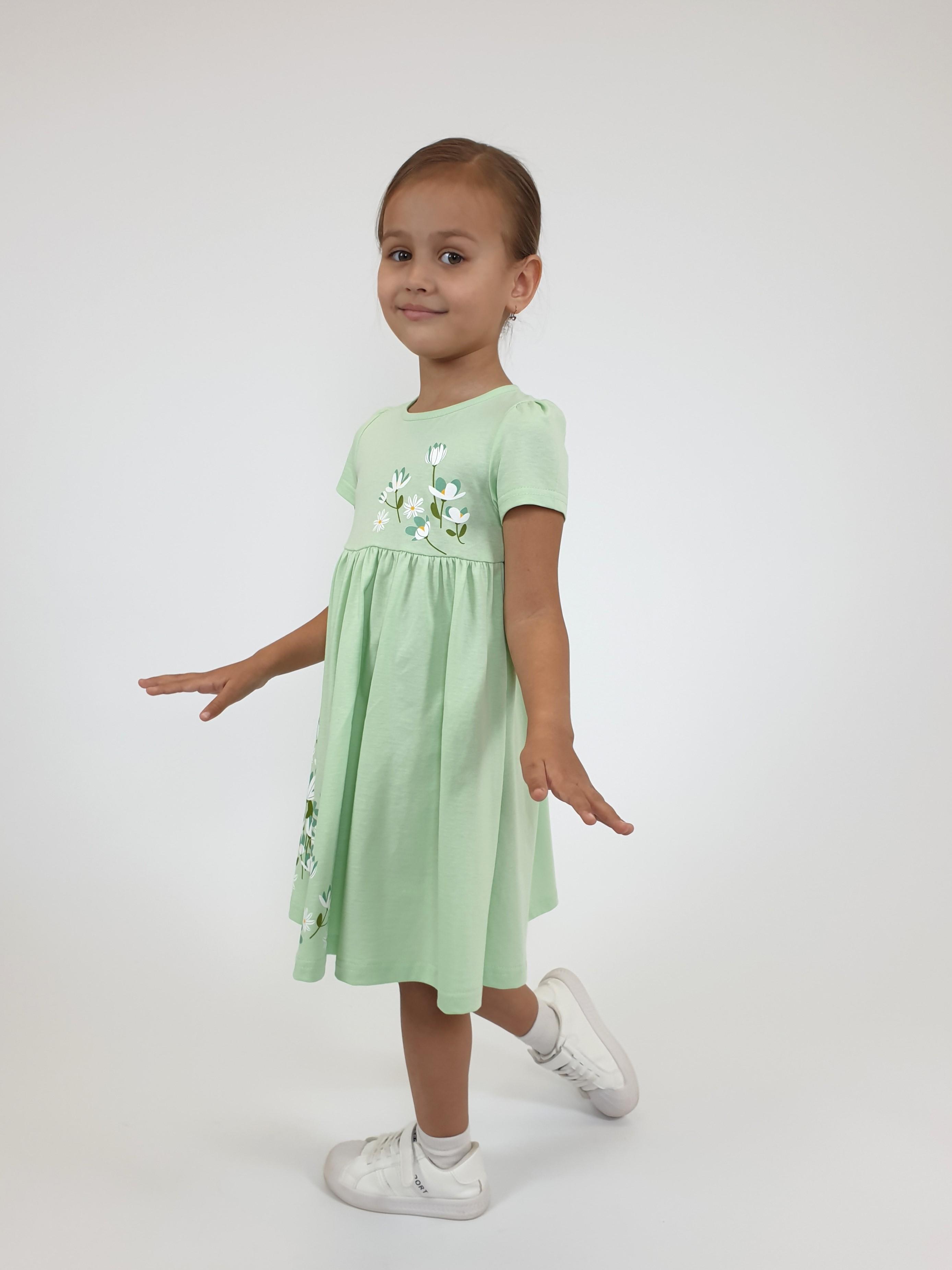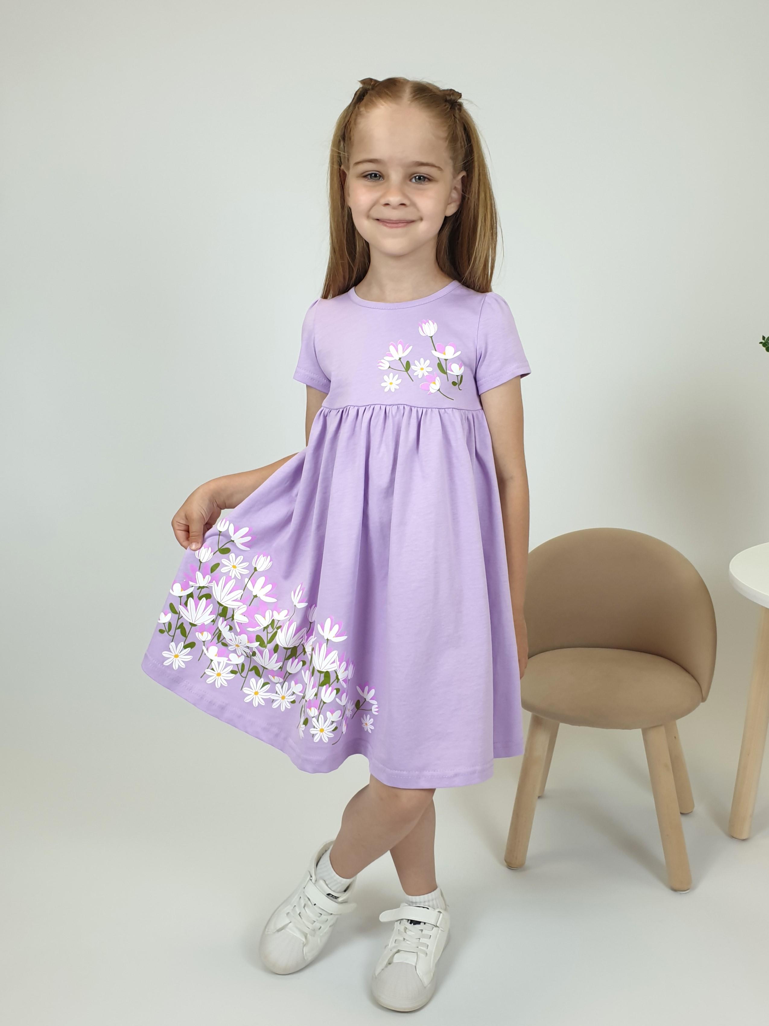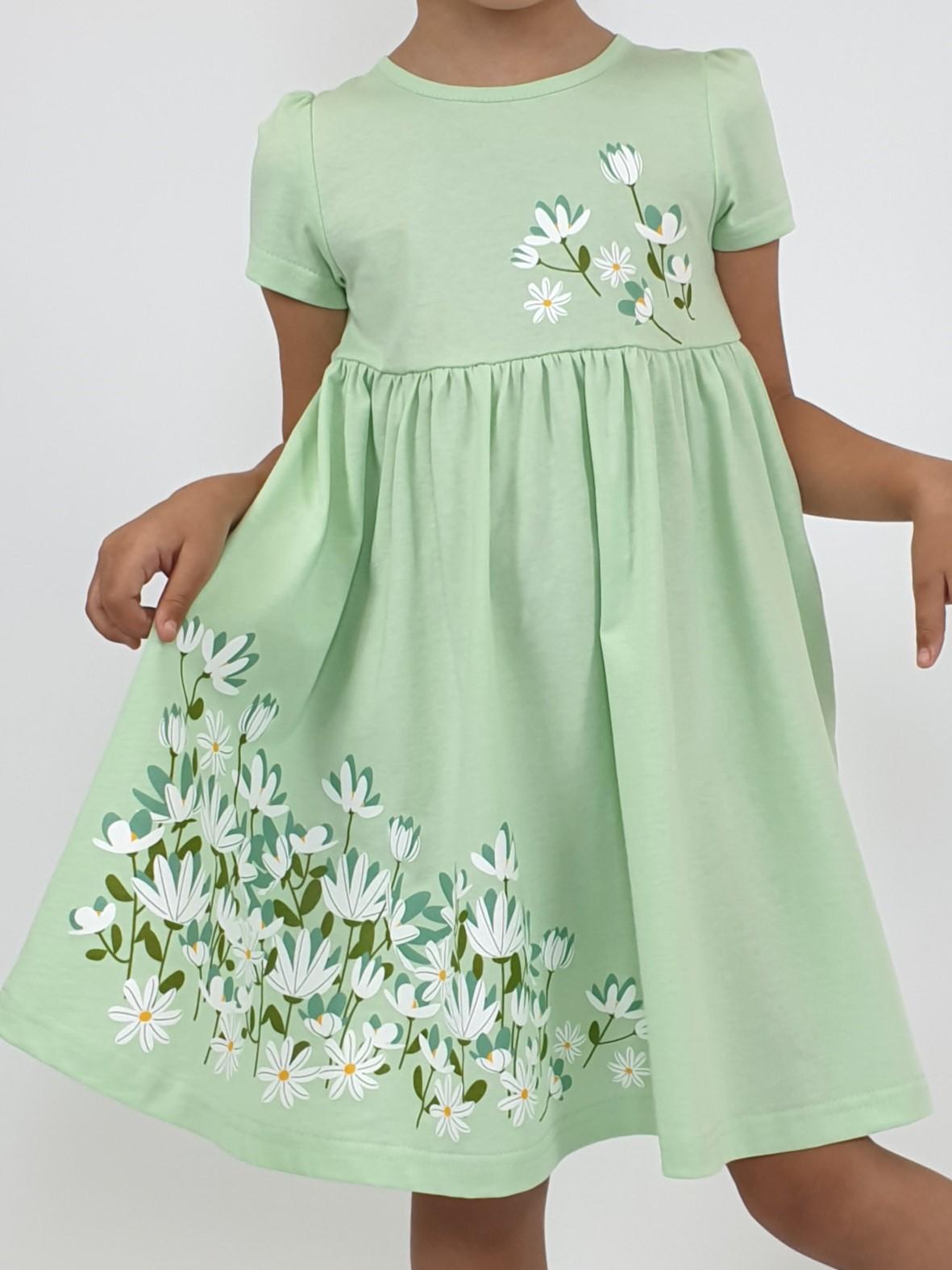 Кулирное полотно:100% х/б. Платье-силуэт трапеция,отрезная юбка со сборкой.Втачной,короткий рукав,сборка по окату.Печать на кокетке переда и юбки.Горловина окантована.застежка на пуговицу.