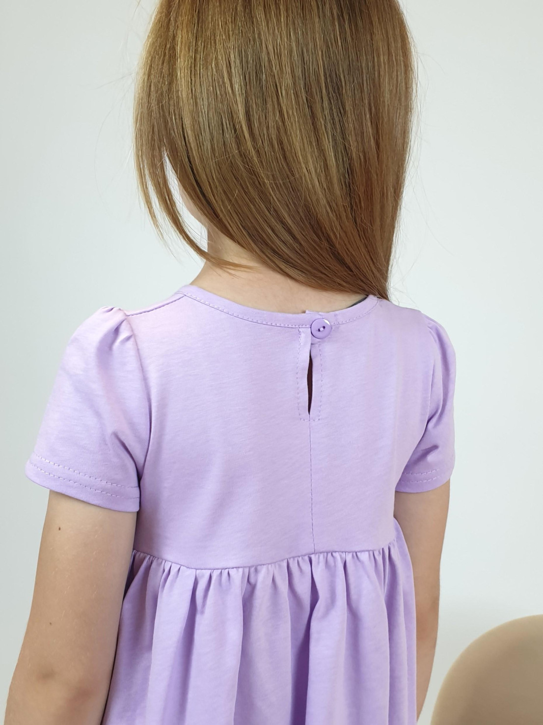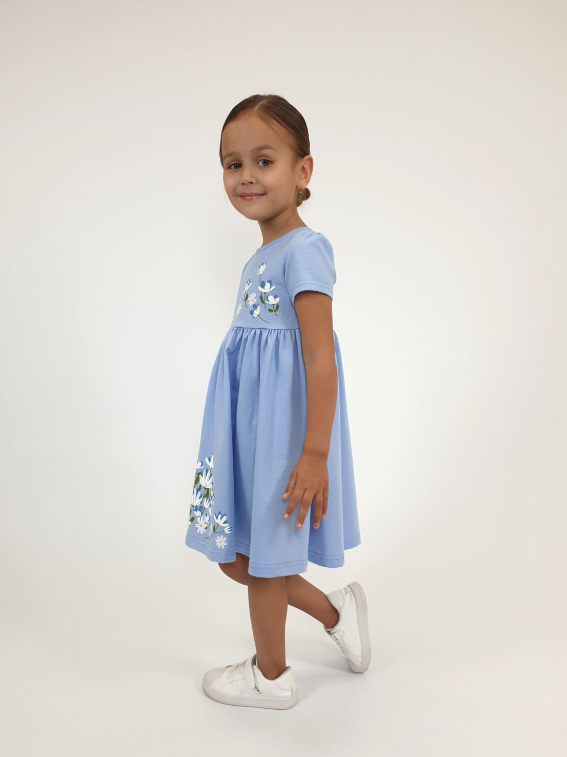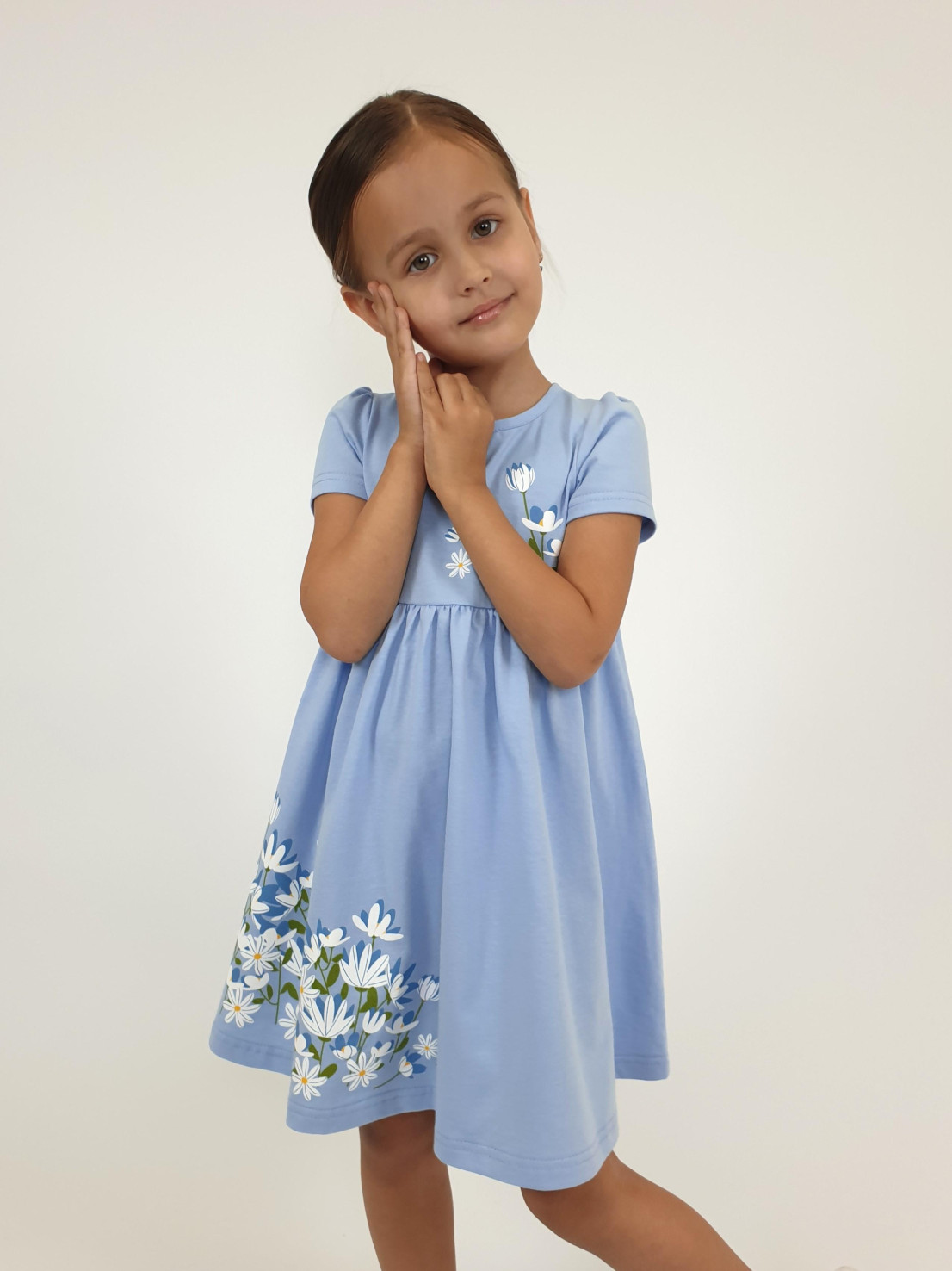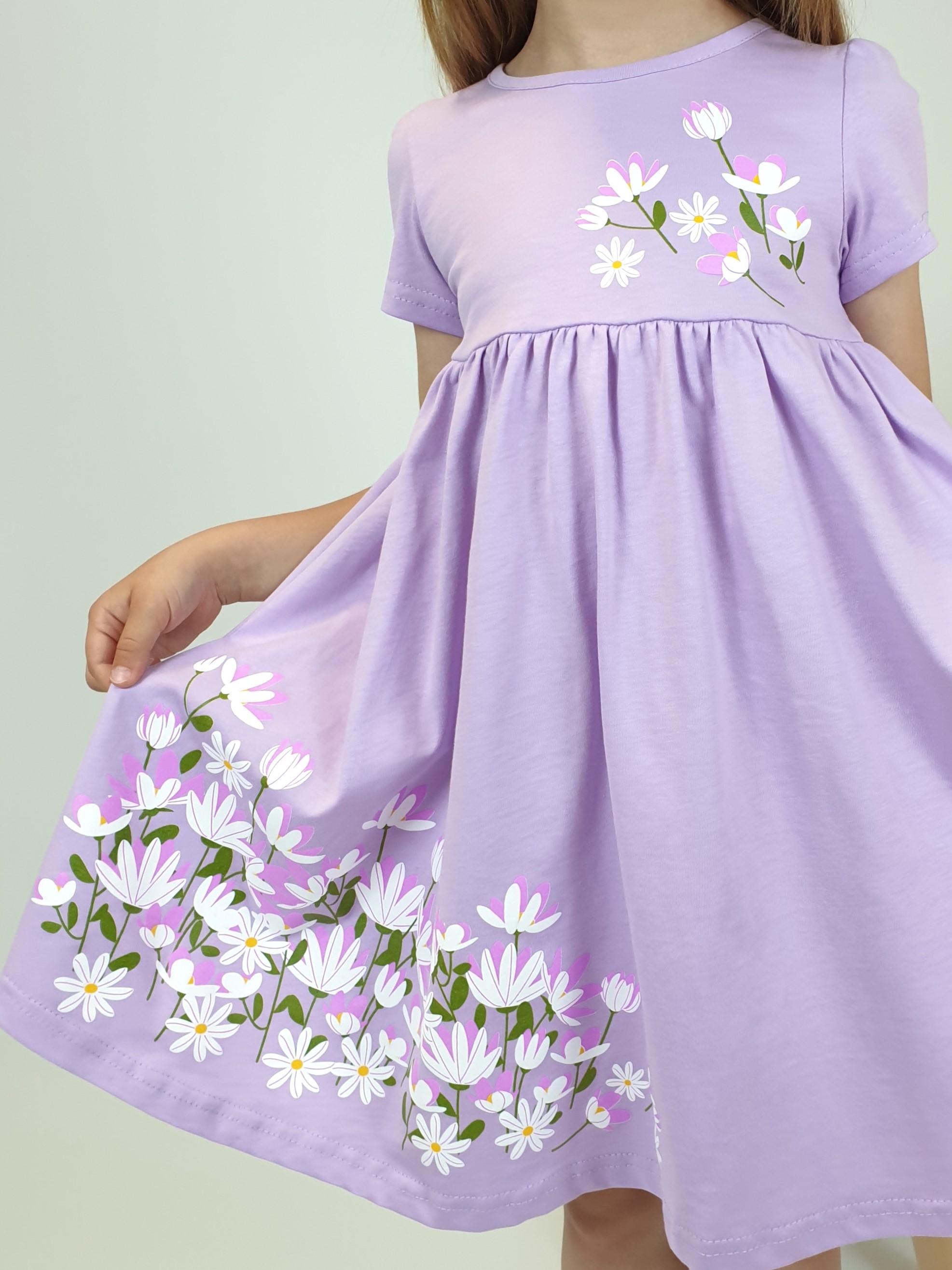Кулирное полотно:100% х/б. Платье-силуэт трапеция,отрезная юбка со сборкой.Втачной,короткий рукав,сборка по окату.Печать на кокетке переда и юбки.Горловина окантована.застежка на пуговицу.