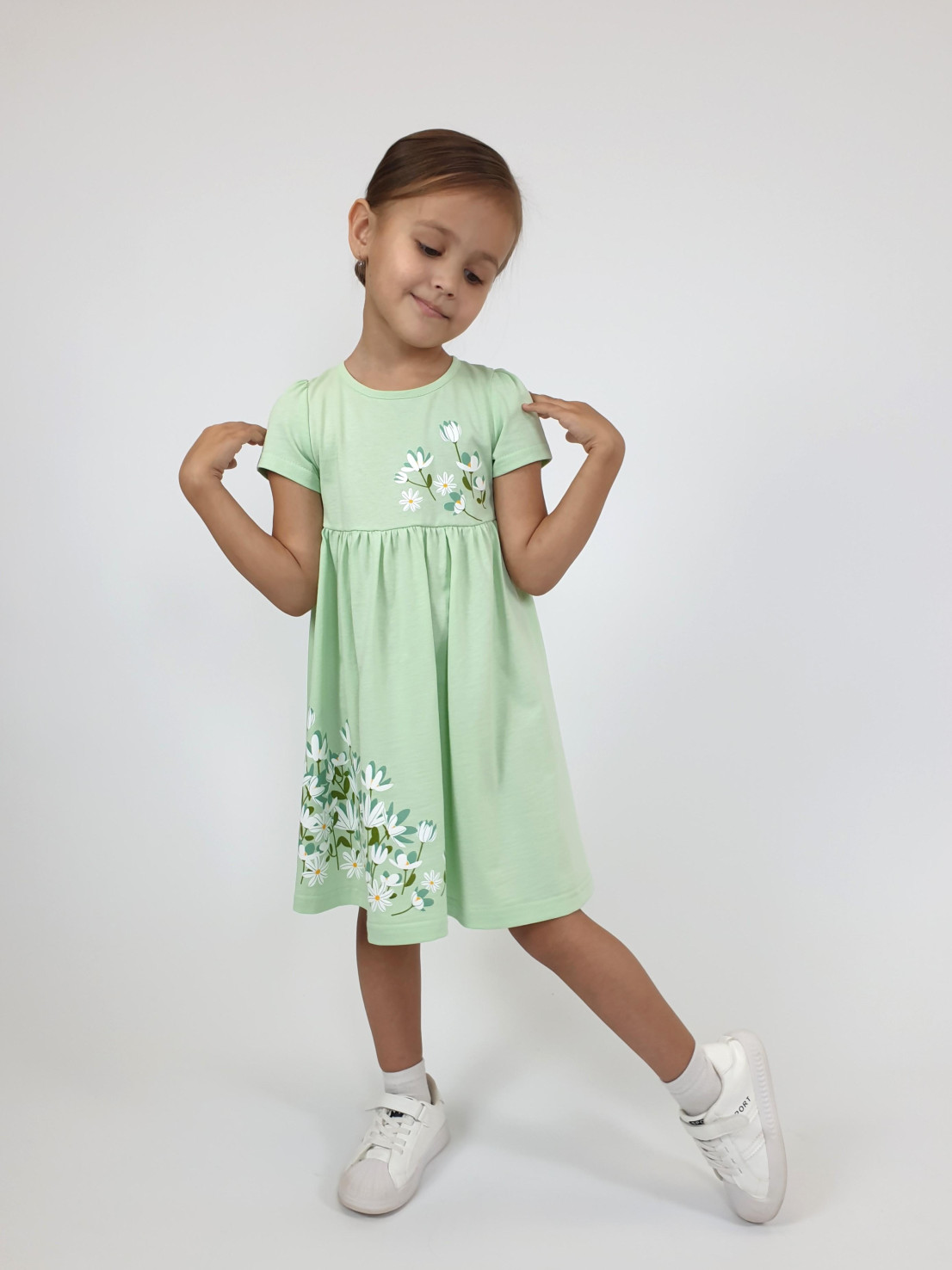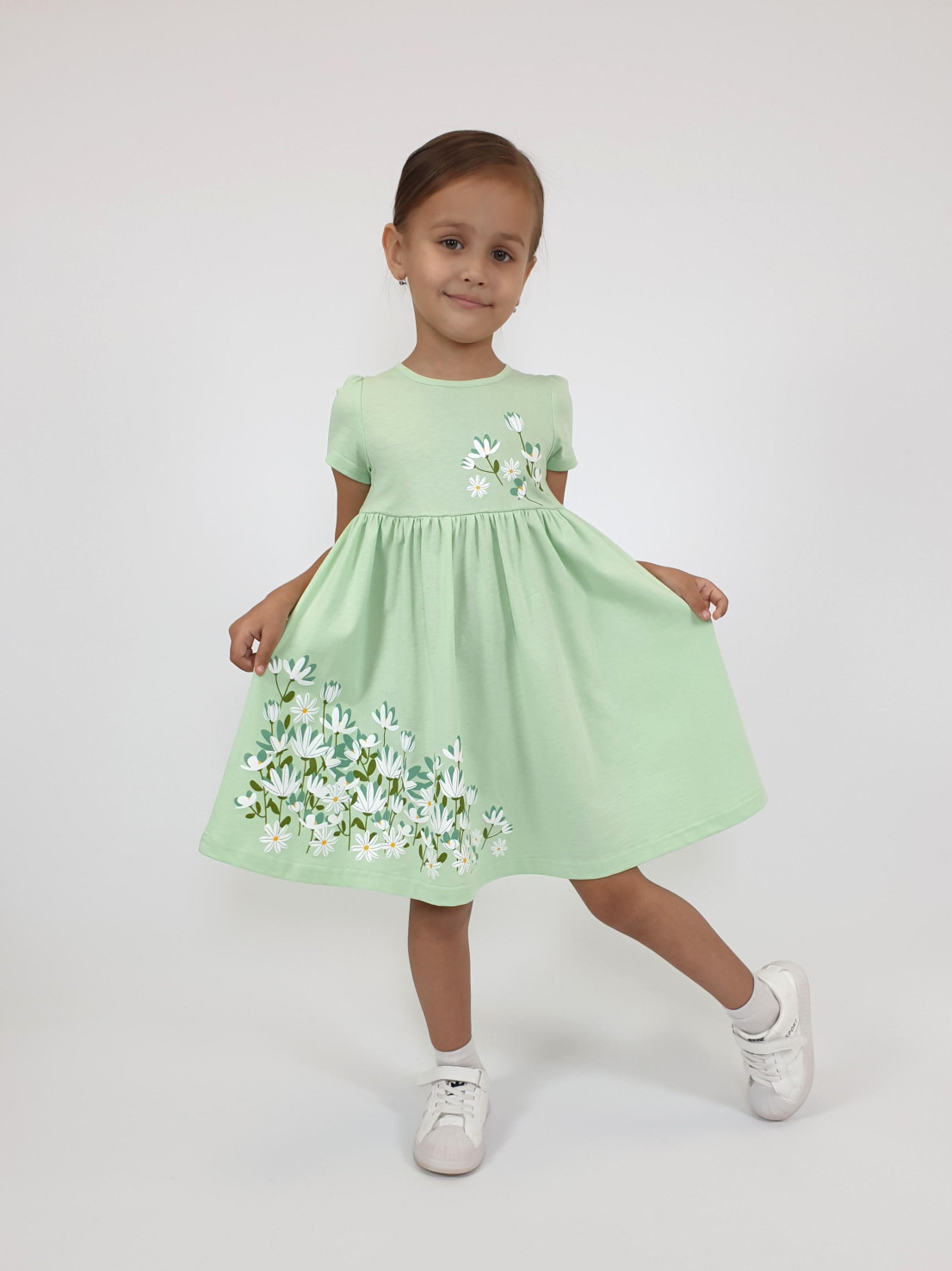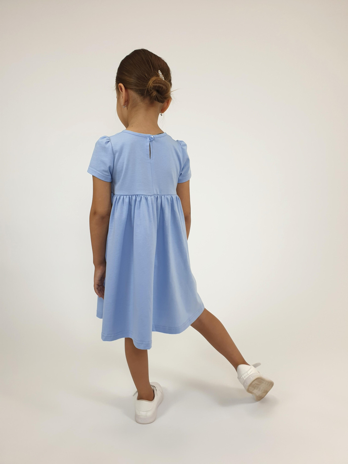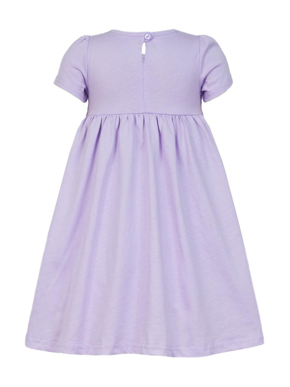 Кулирное полотно:100% х/б. Платье-силуэт трапеция,отрезная юбка со сборкой.Втачной,короткий рукав,сборка по окату.Печать на кокетке переда и юбки.Горловина окантована.застежка на пуговицу.