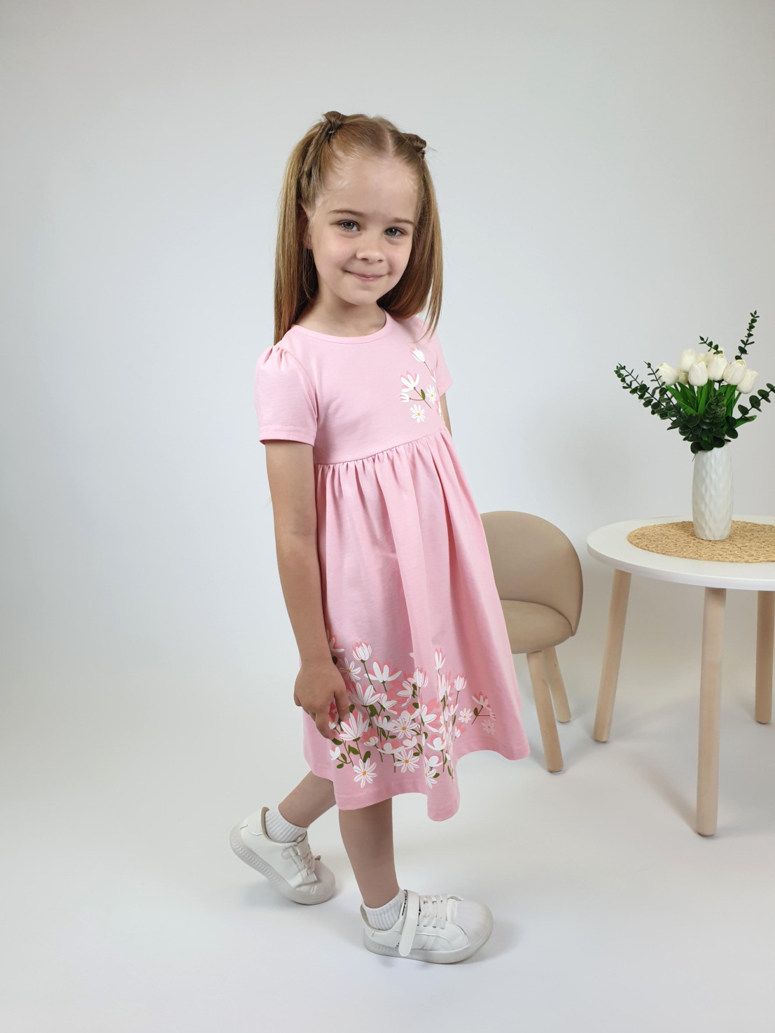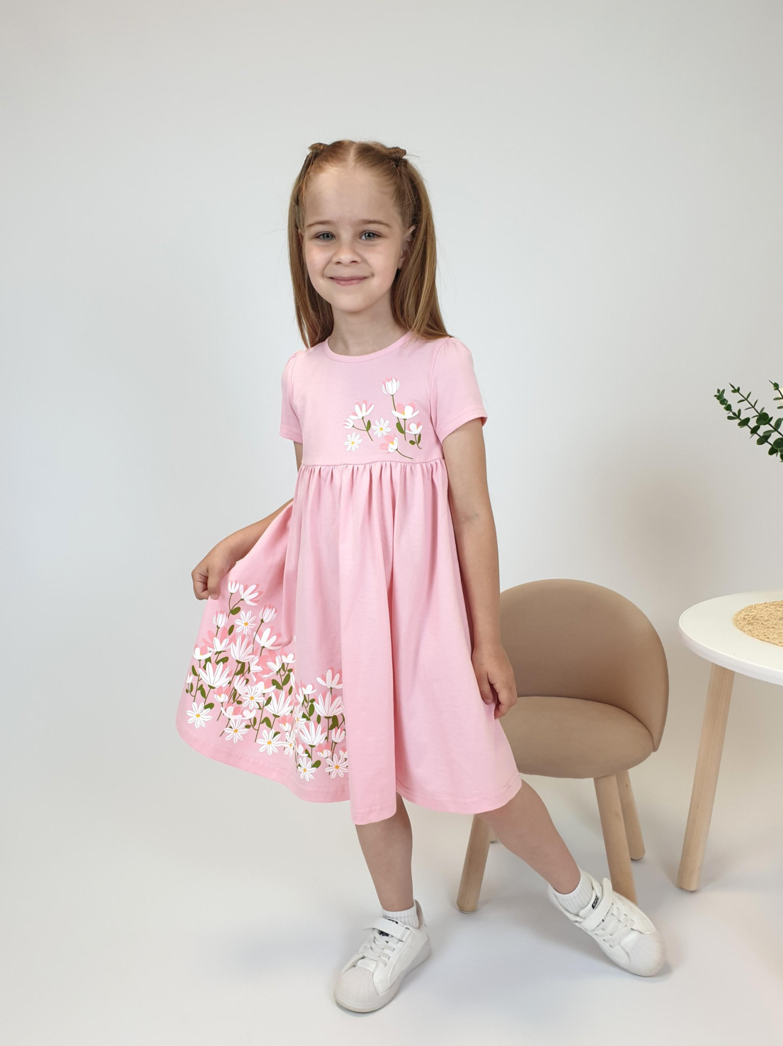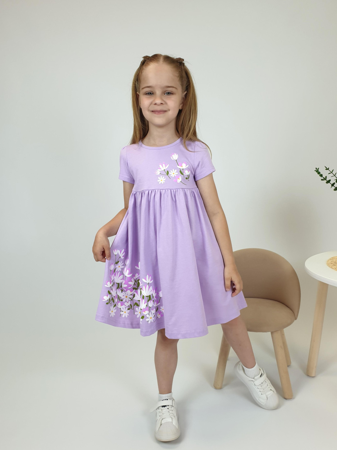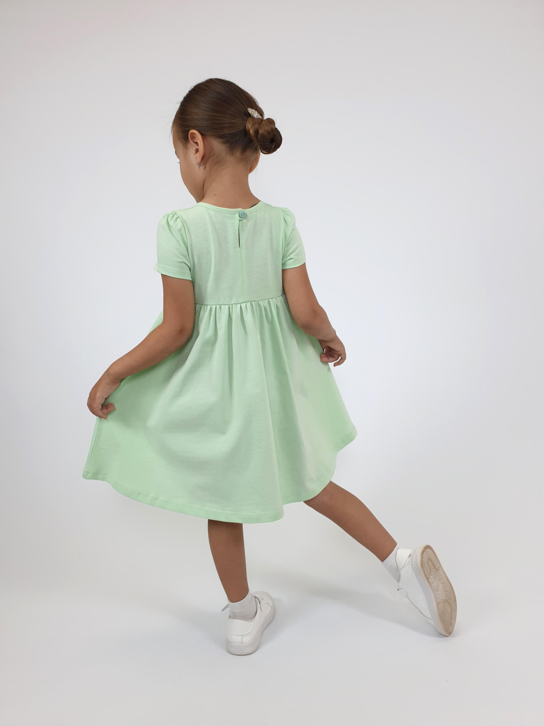 Кулирное полотно:100% х/б. Платье-силуэт трапеция,отрезная юбка со сборкой.Втачной,короткий рукав,сборка по окату.Печать на кокетке переда и юбки.Горловина окантована.застежка на пуговицу.