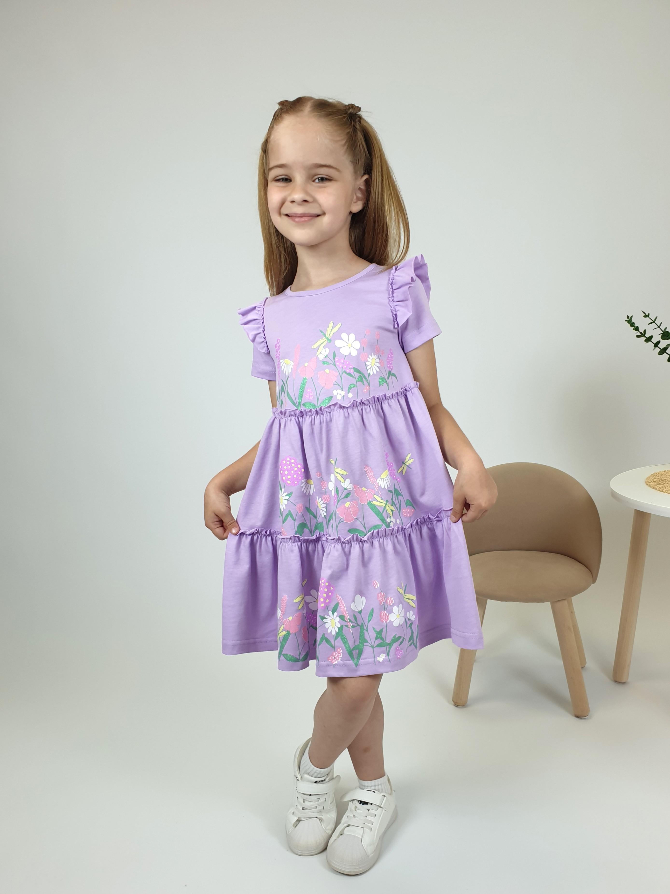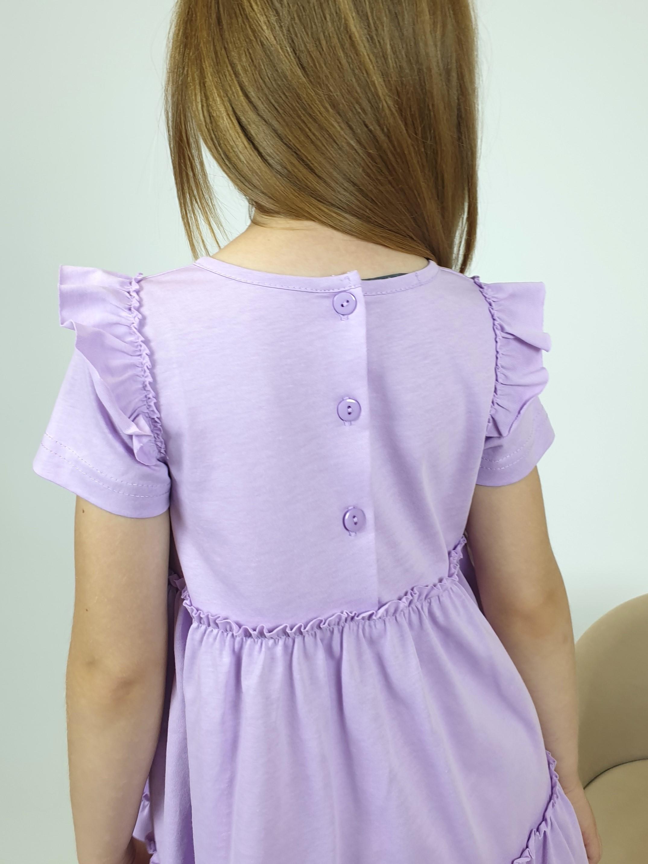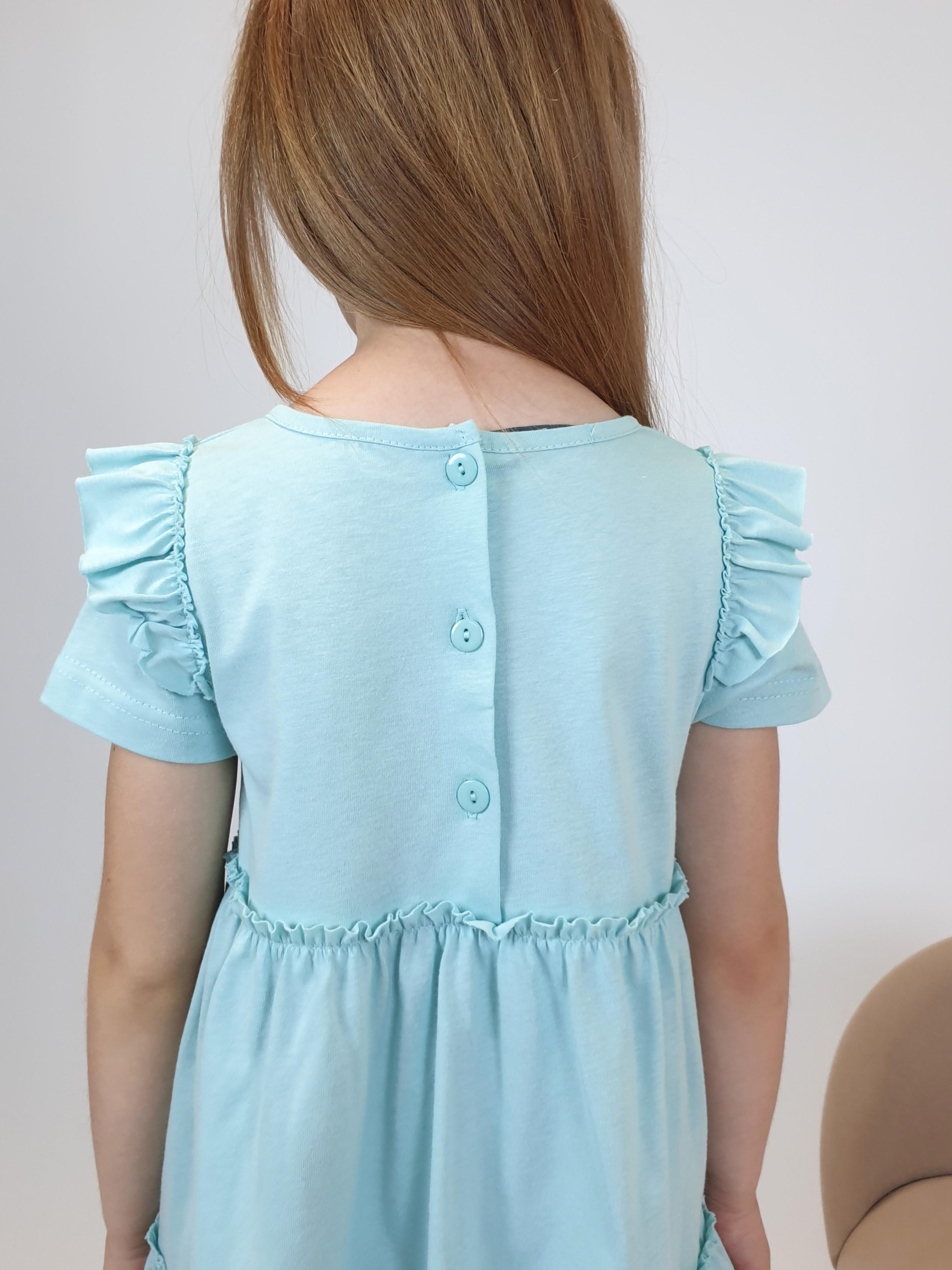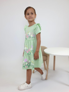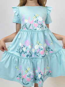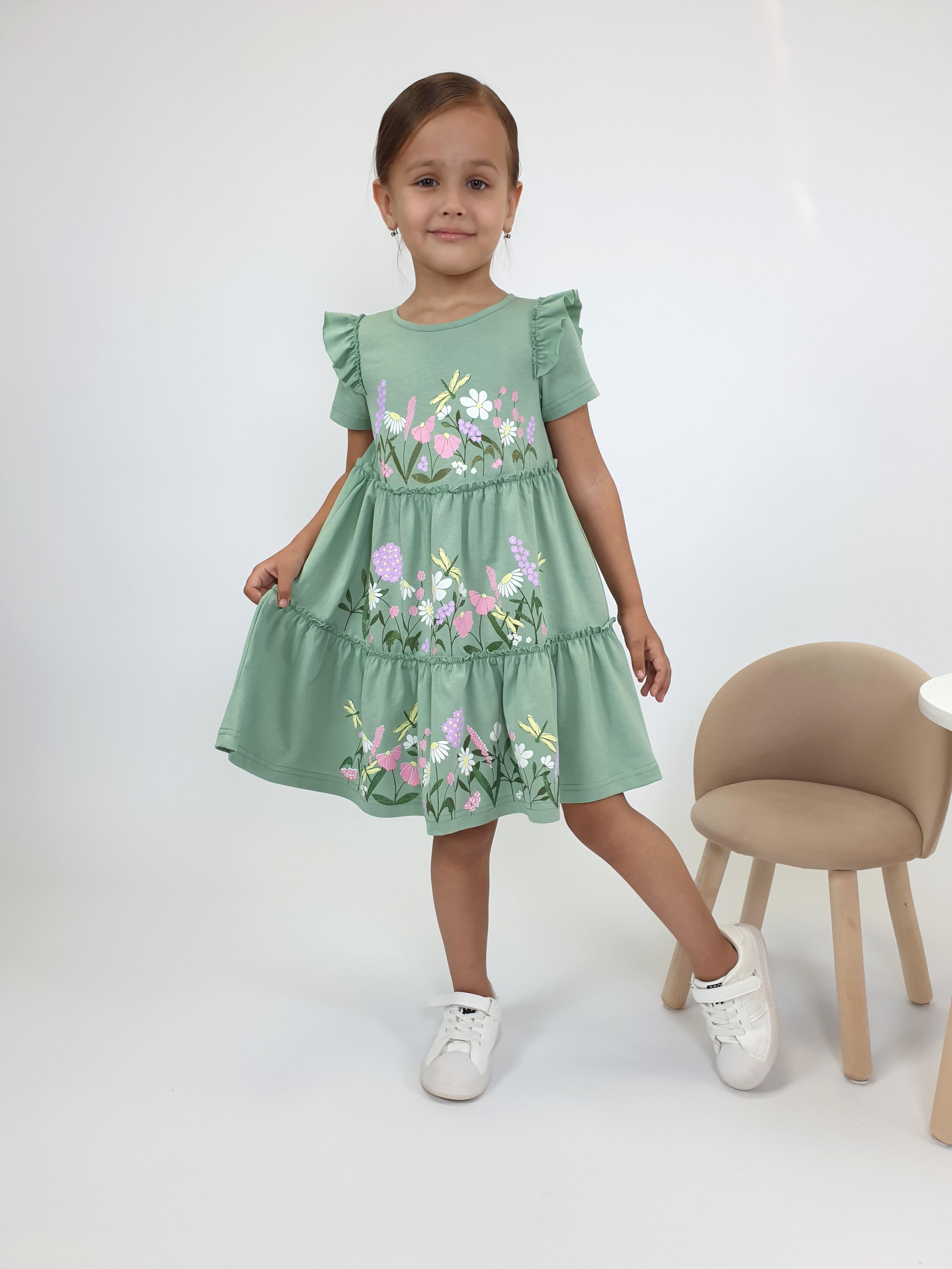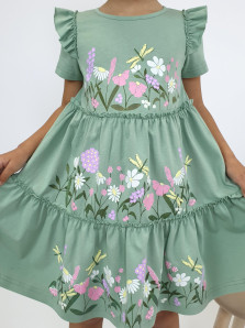 Кулирное полотно:100% х/б. Платье-силуэт трапеция,короткий втачной рукав с настрочной рюшей по пройме.Юбка переда и спинки из двух воланов,по передним воланам печать.Кокетка переда с печатью,застежка по спинке на пуговицы.Горловина окантована.