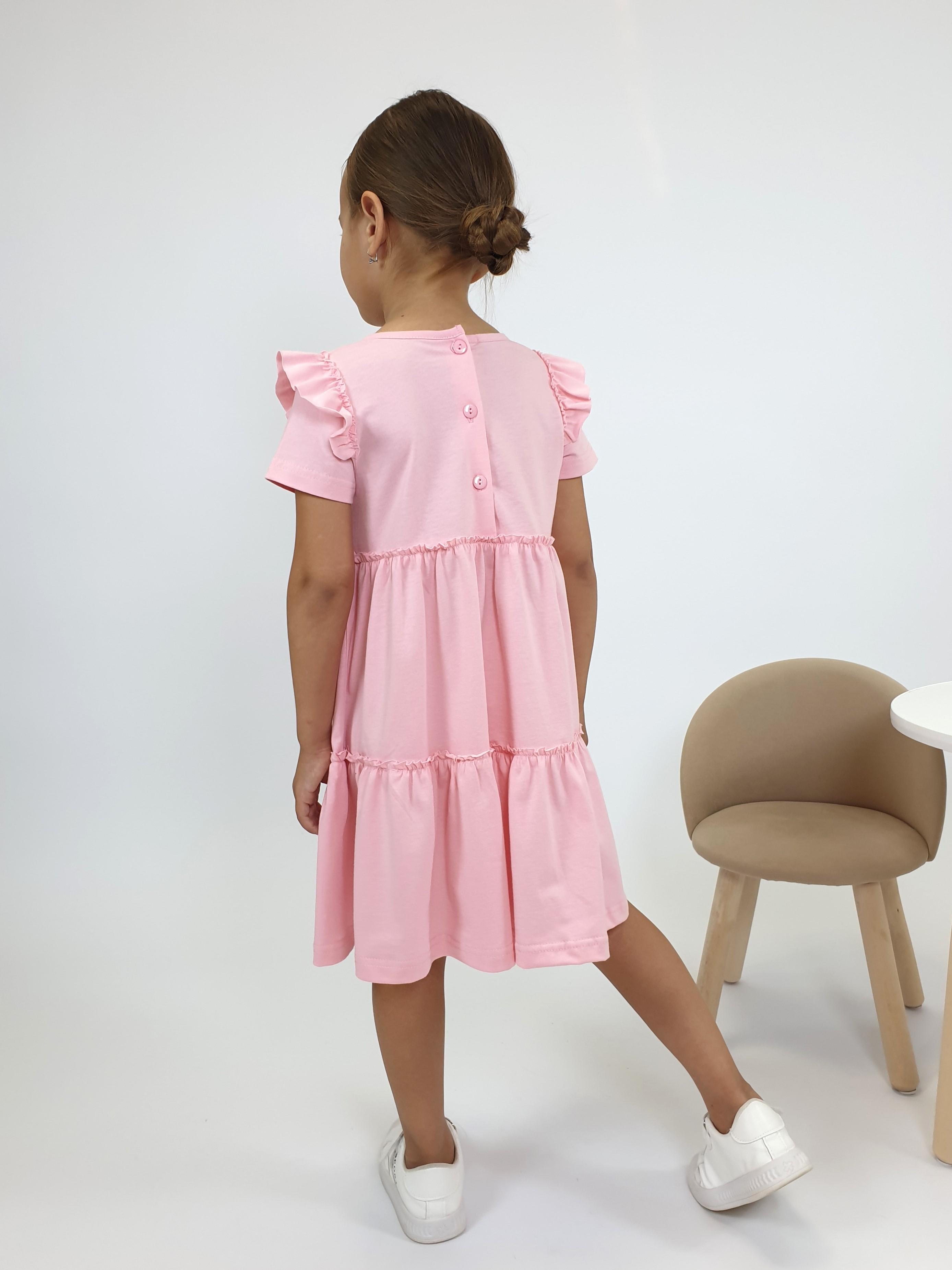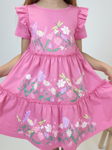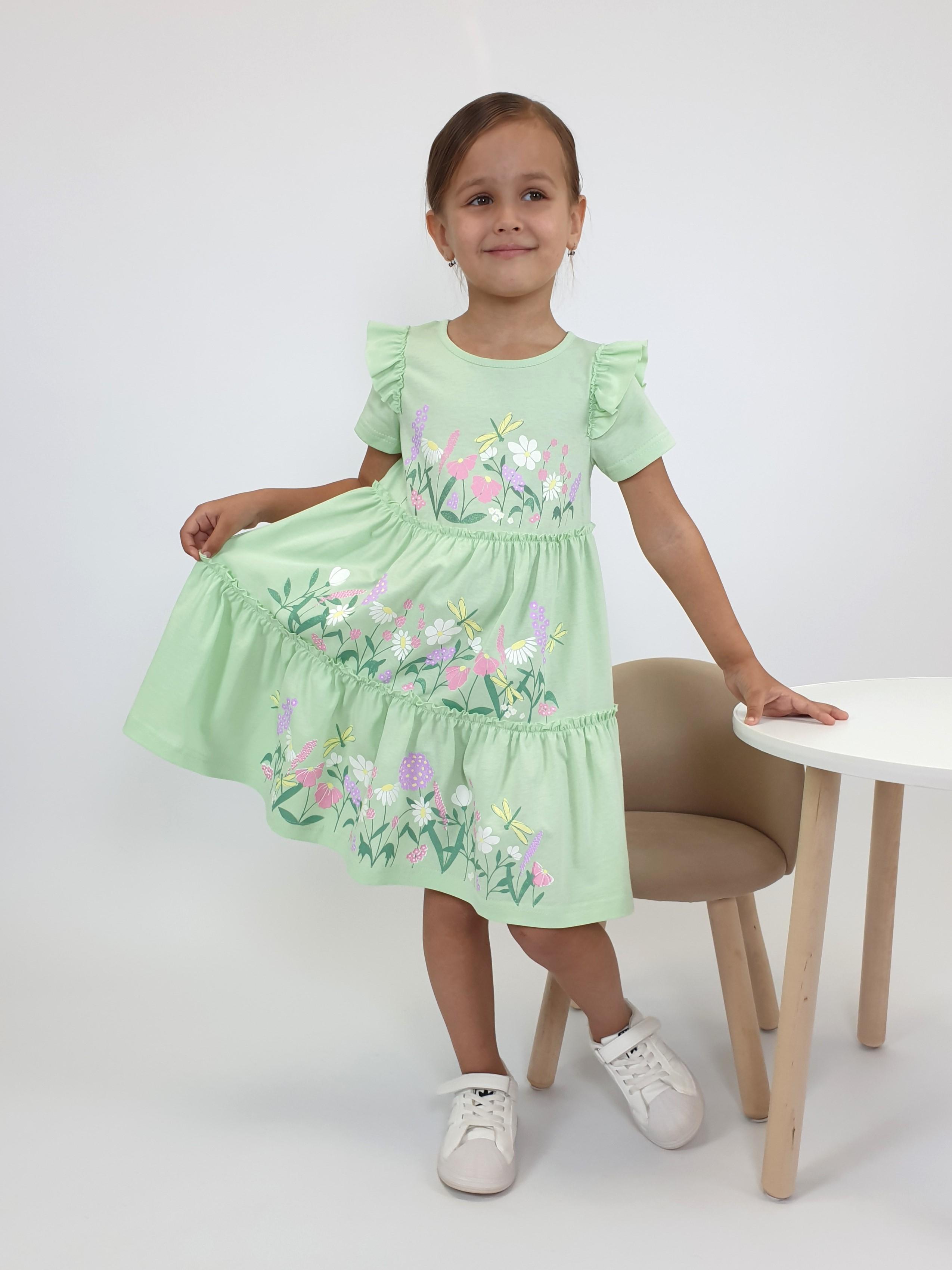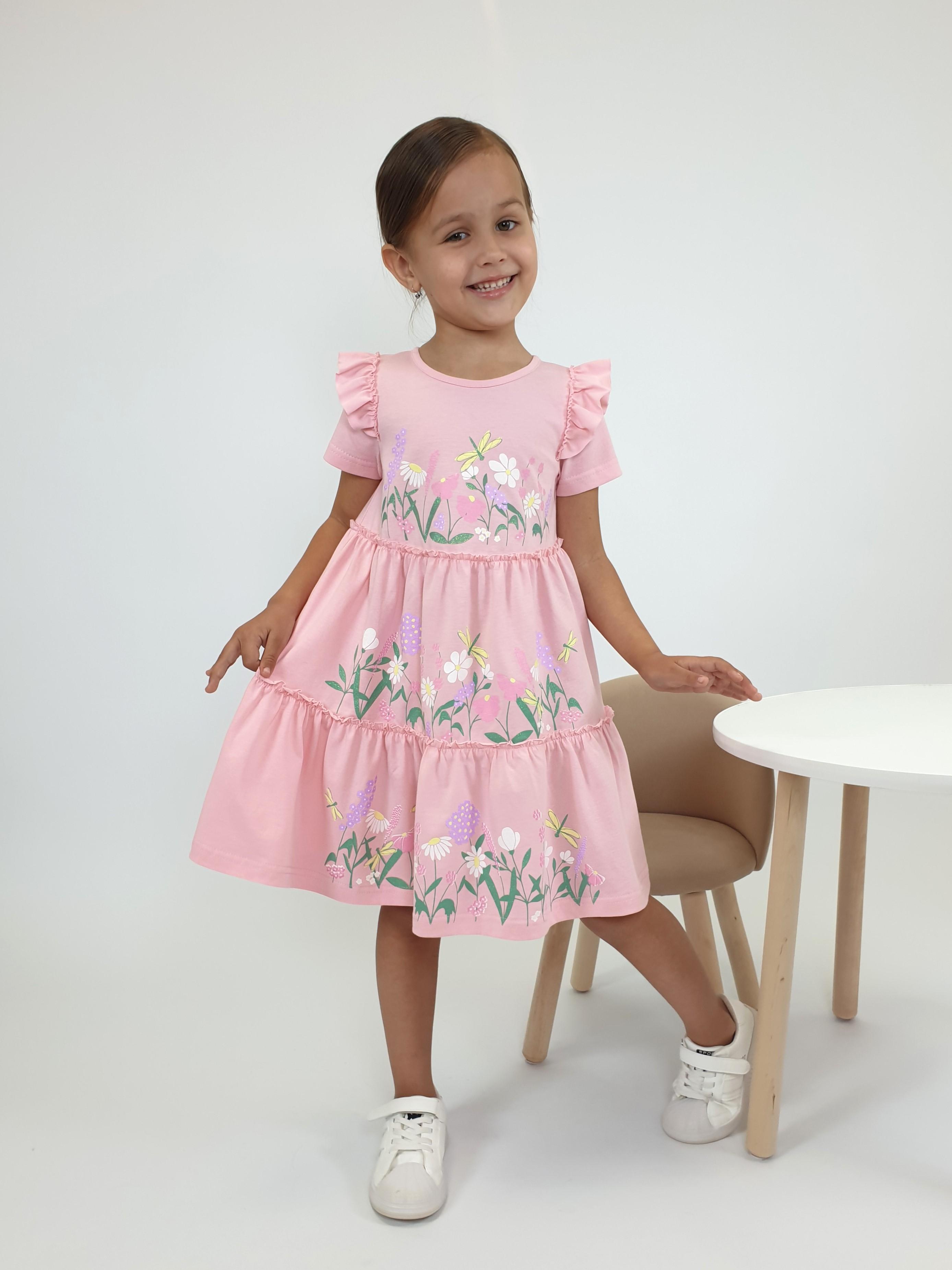 Кулирное полотно:100% х/б. Платье-силуэт трапеция,короткий втачной рукав с настрочной рюшей по пройме.Юбка переда и спинки из двух воланов,по передним воланам печать.Кокетка переда с печатью,застежка по спинке на пуговицы.Горловина окантована.