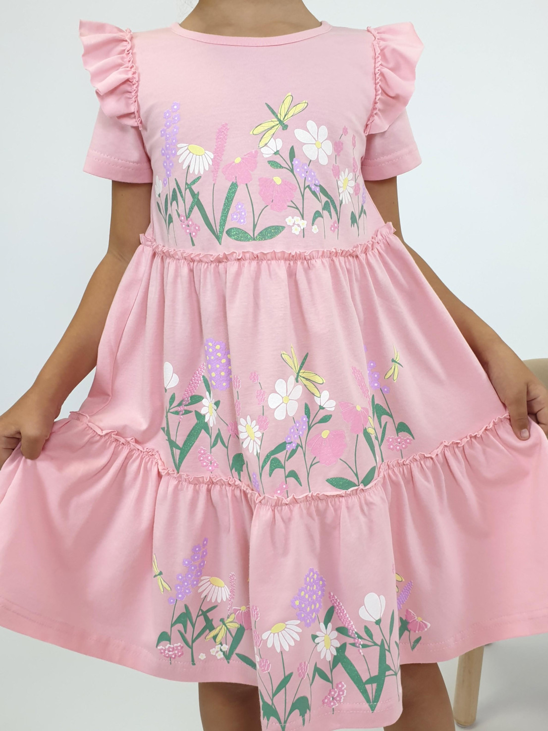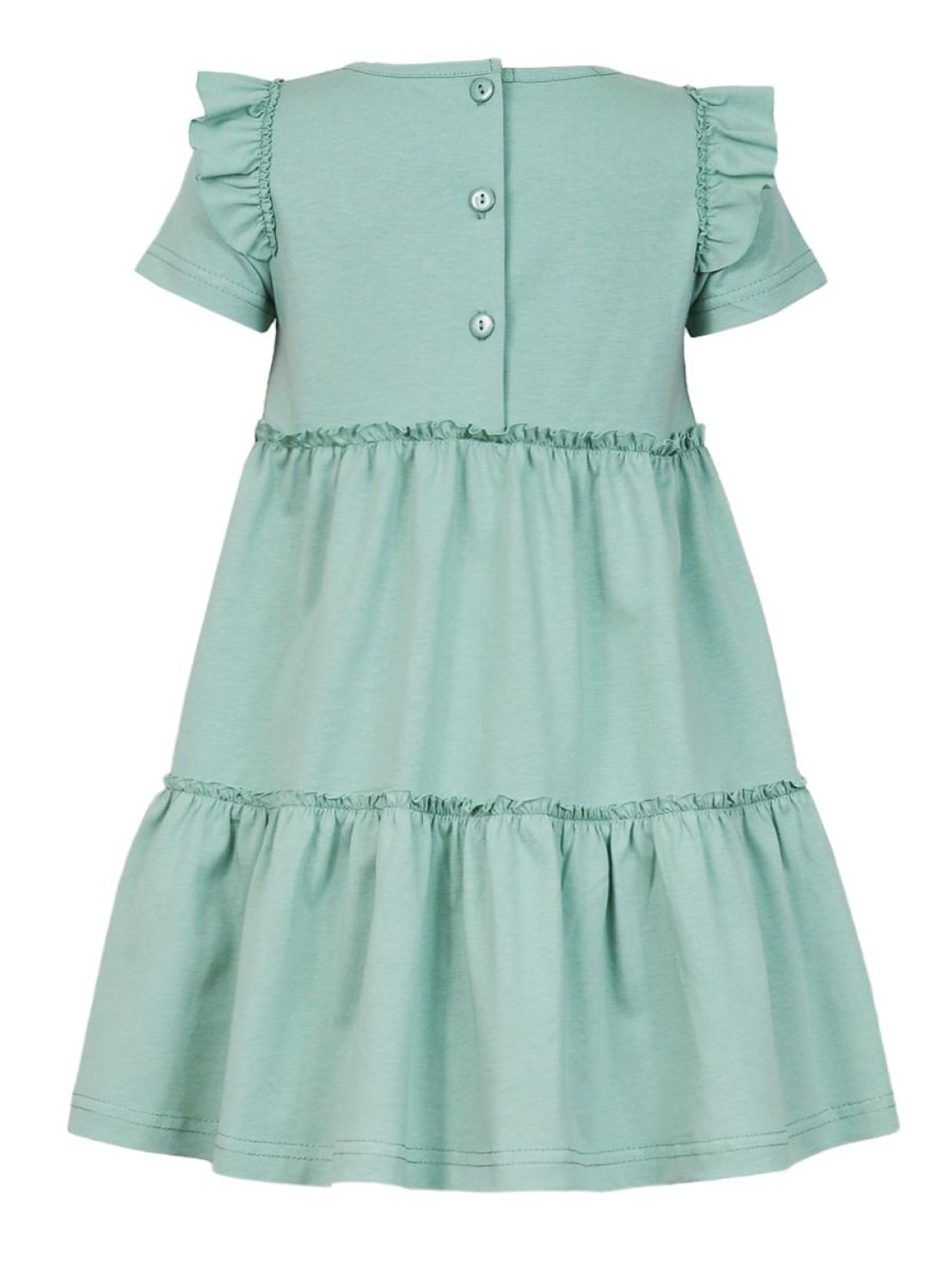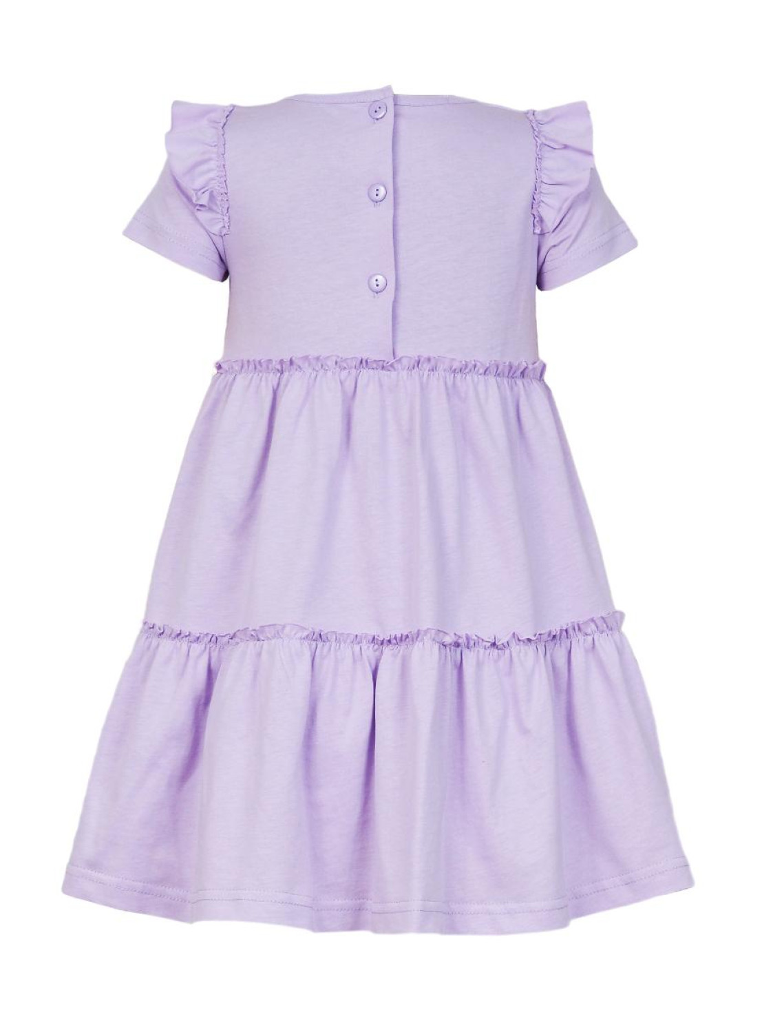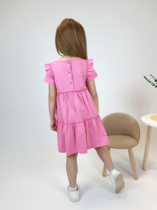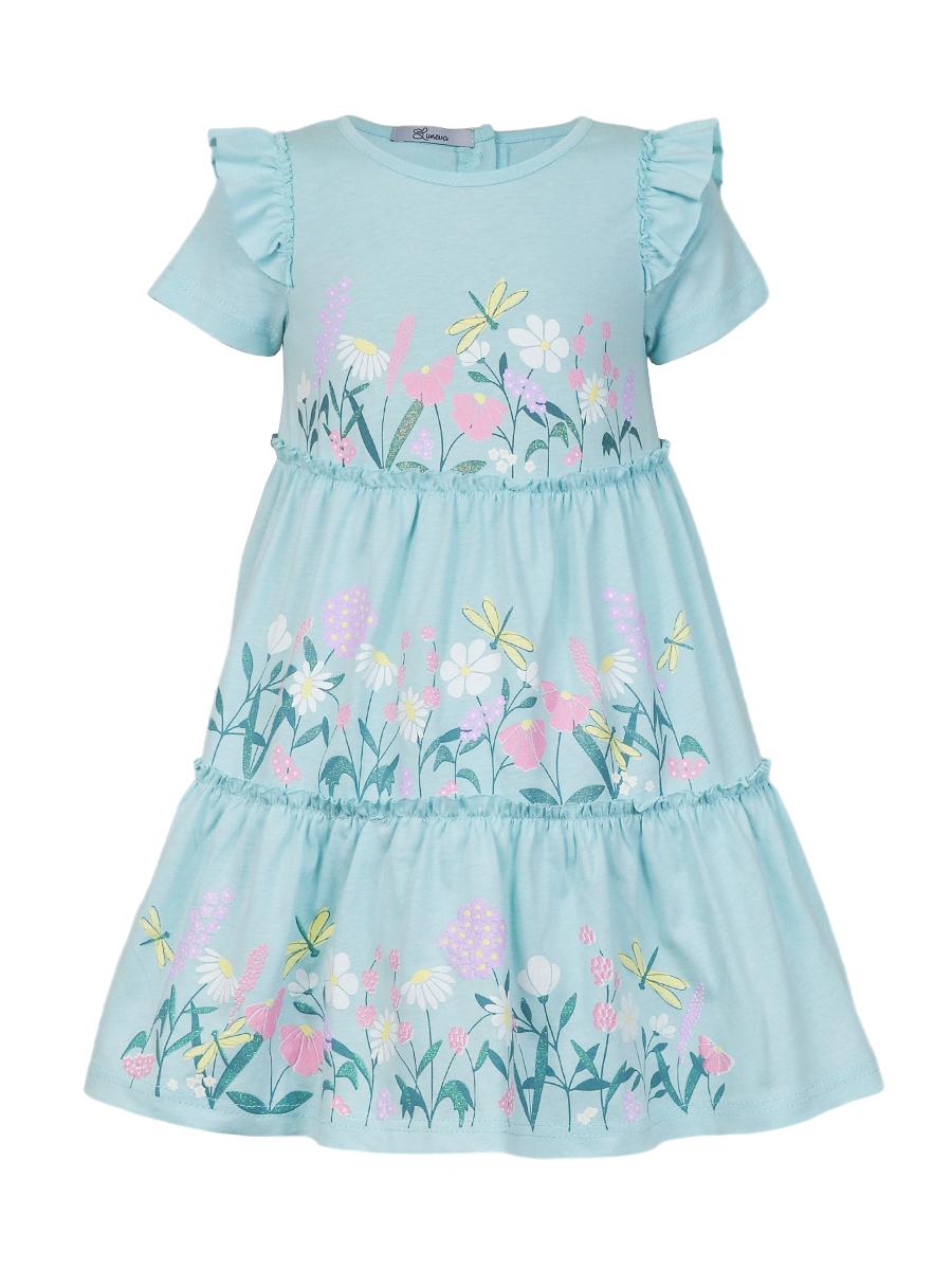 Кулирное полотно:100% х/б. Платье-силуэт трапеция,короткий втачной рукав с настрочной рюшей по пройме.Юбка переда и спинки из двух воланов,по передним воланам печать.Кокетка переда с печатью,застежка по спинке на пуговицы.Горловина окантована.