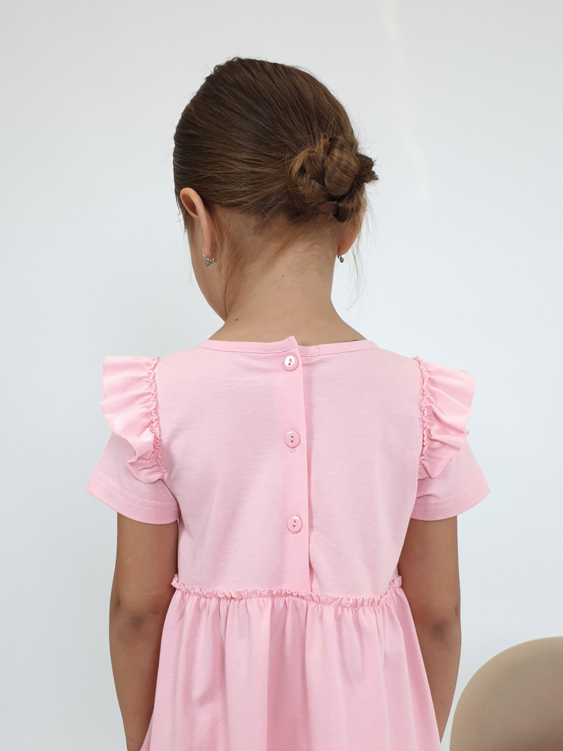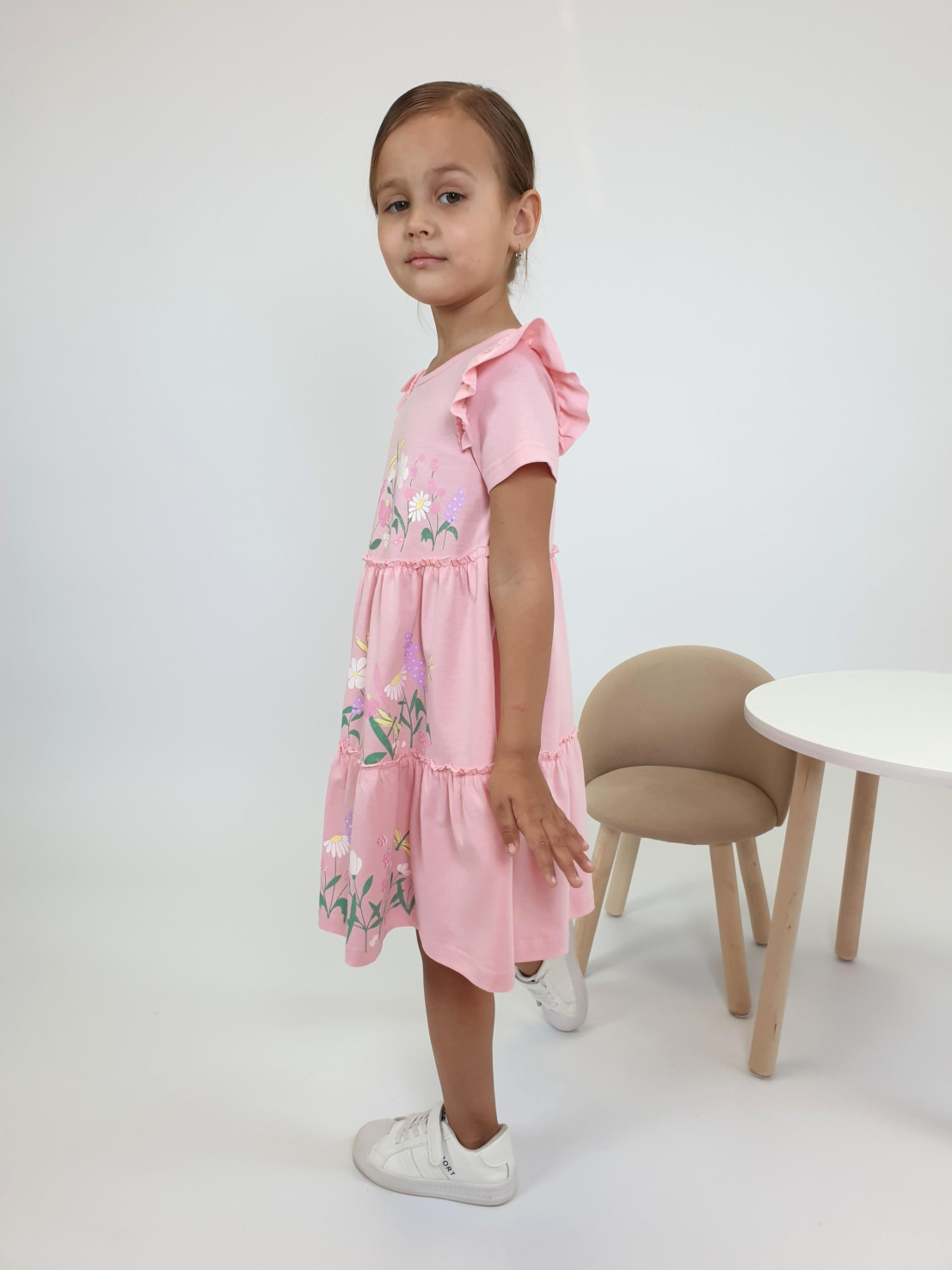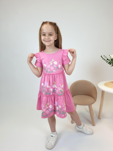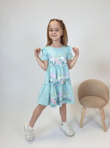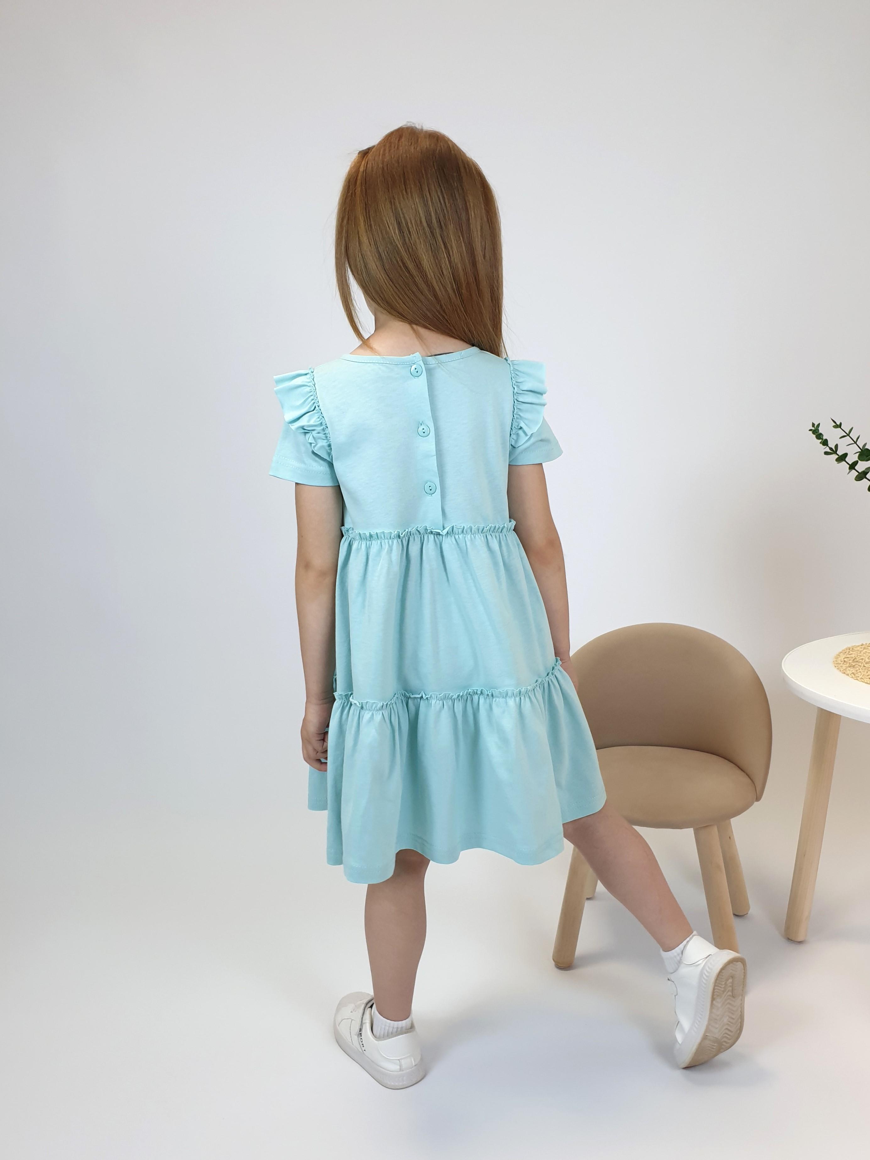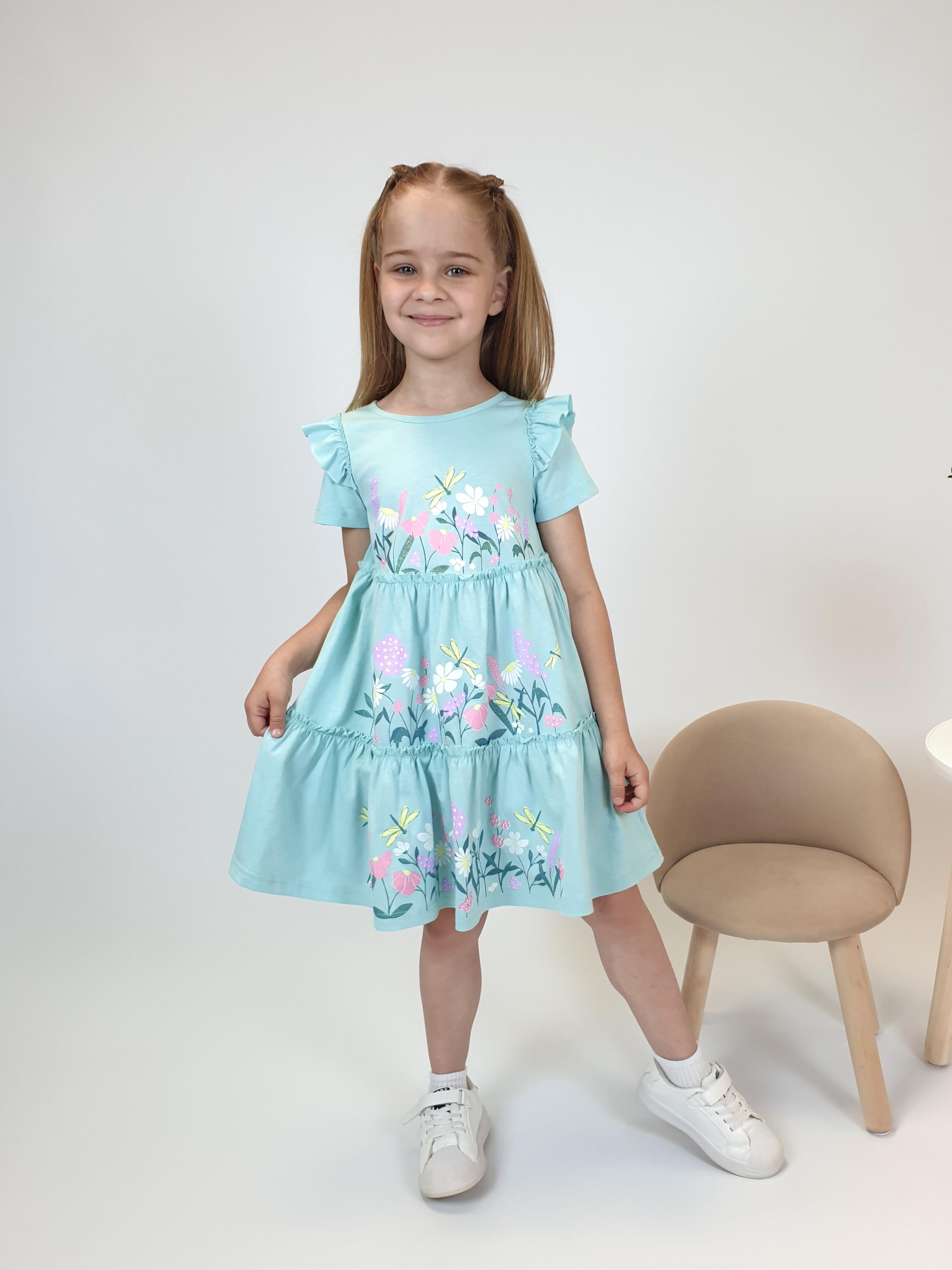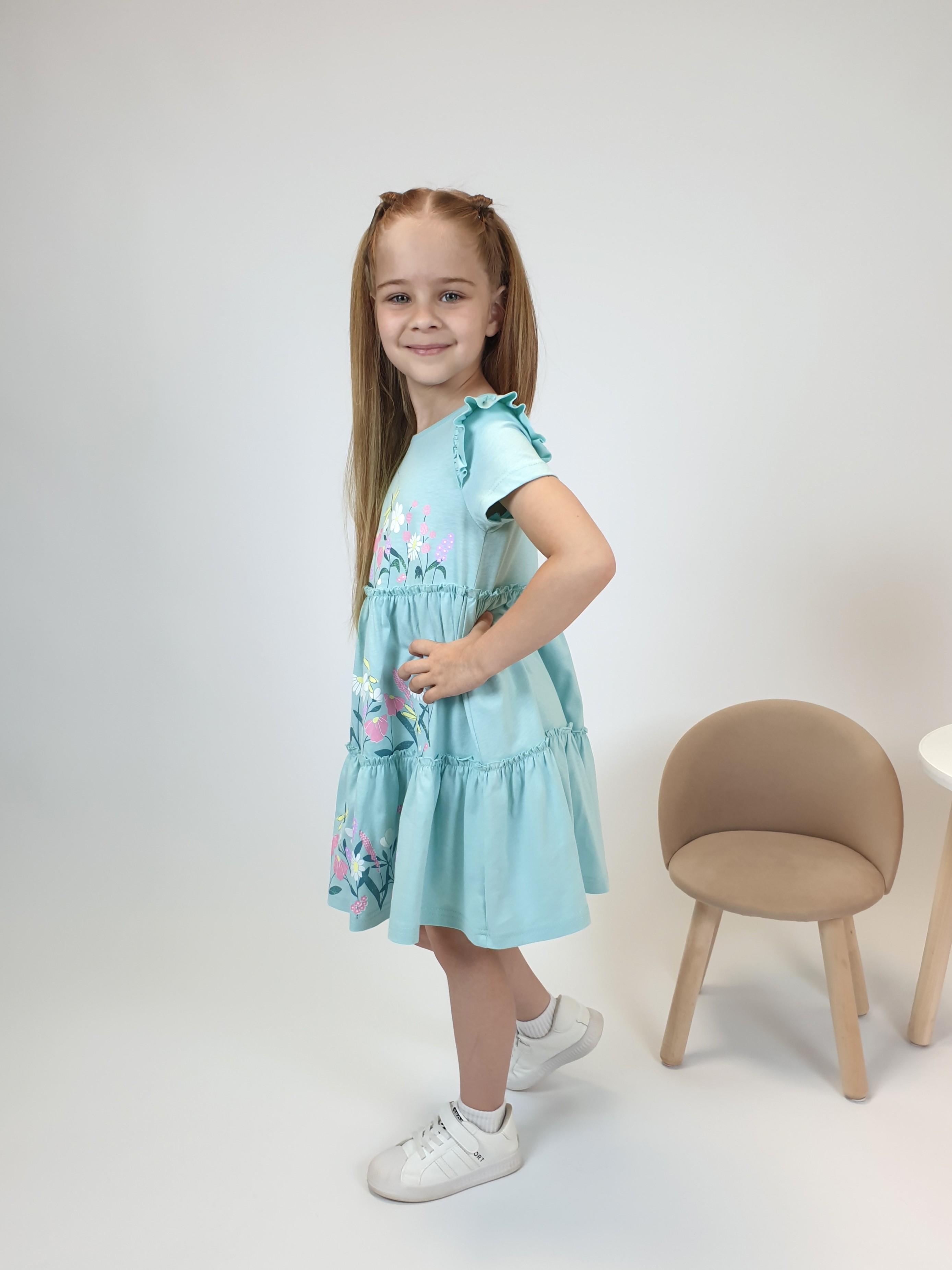 Кулирное полотно:100% х/б. Платье-силуэт трапеция,короткий втачной рукав с настрочной рюшей по пройме.Юбка переда и спинки из двух воланов,по передним воланам печать.Кокетка переда с печатью,застежка по спинке на пуговицы.Горловина окантована.