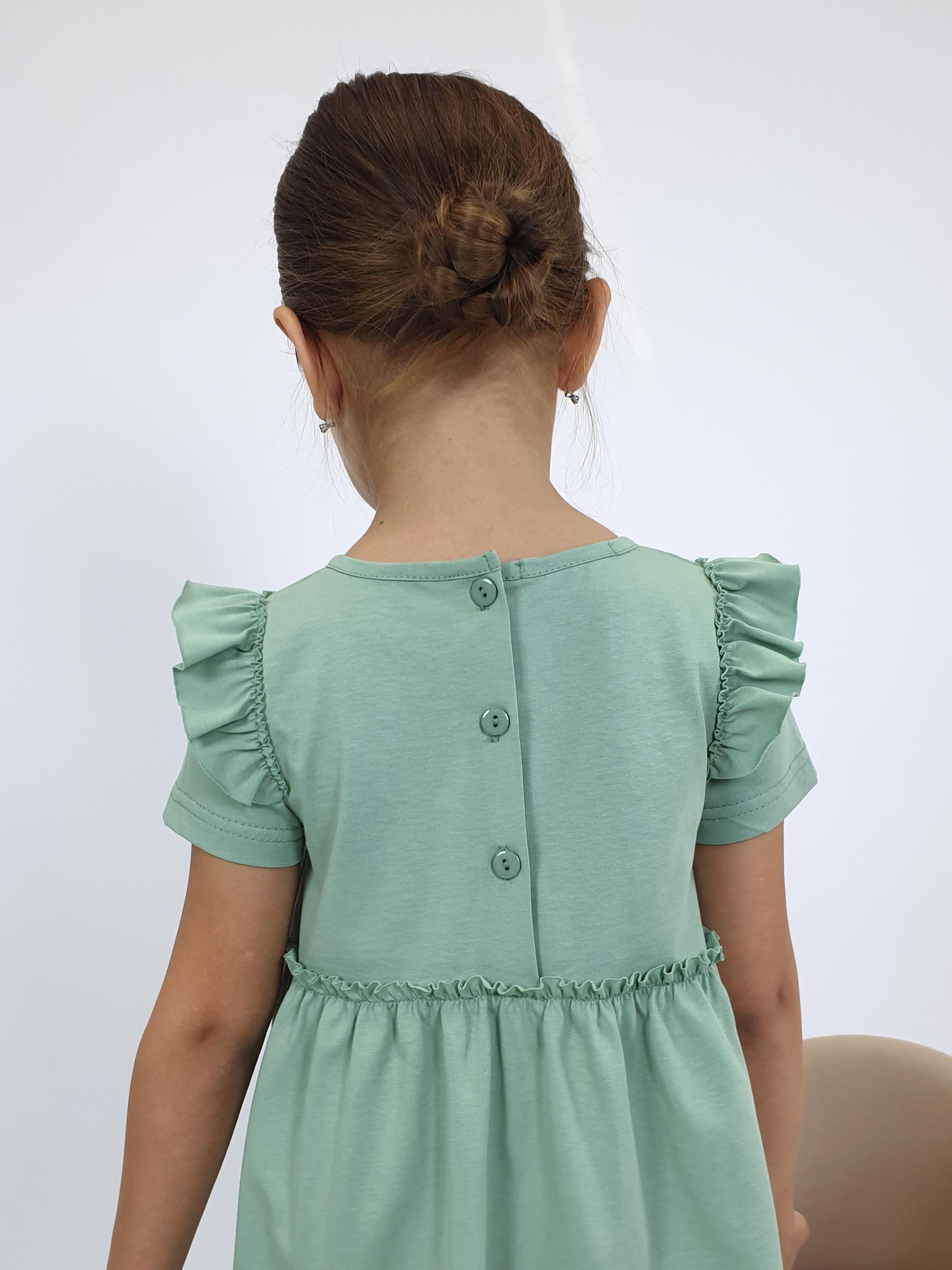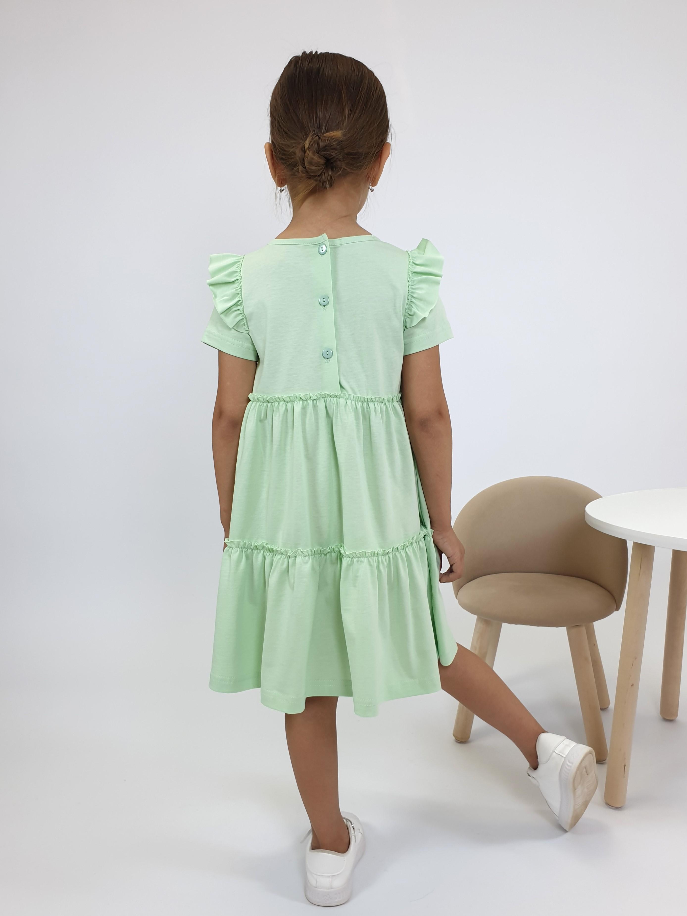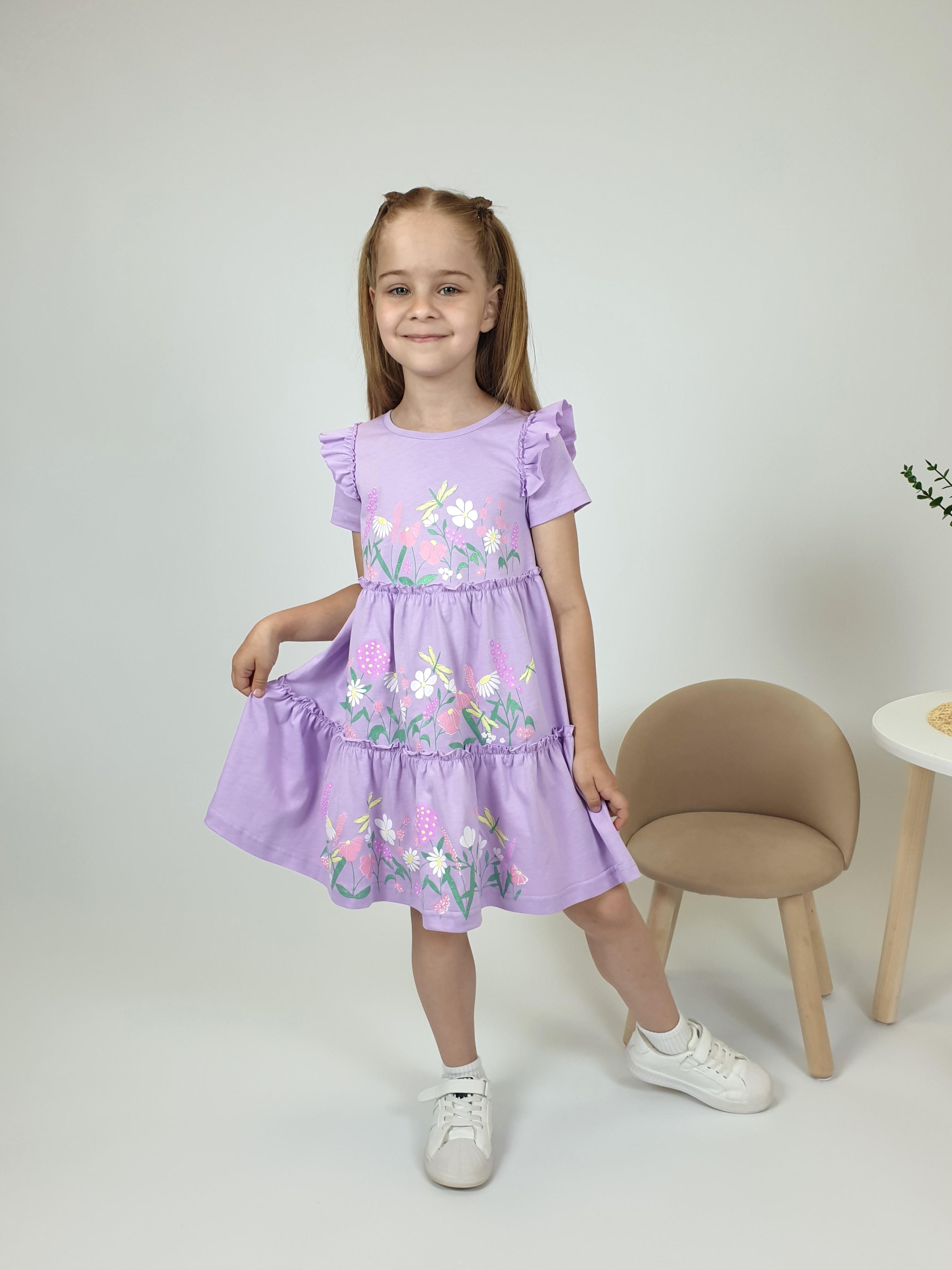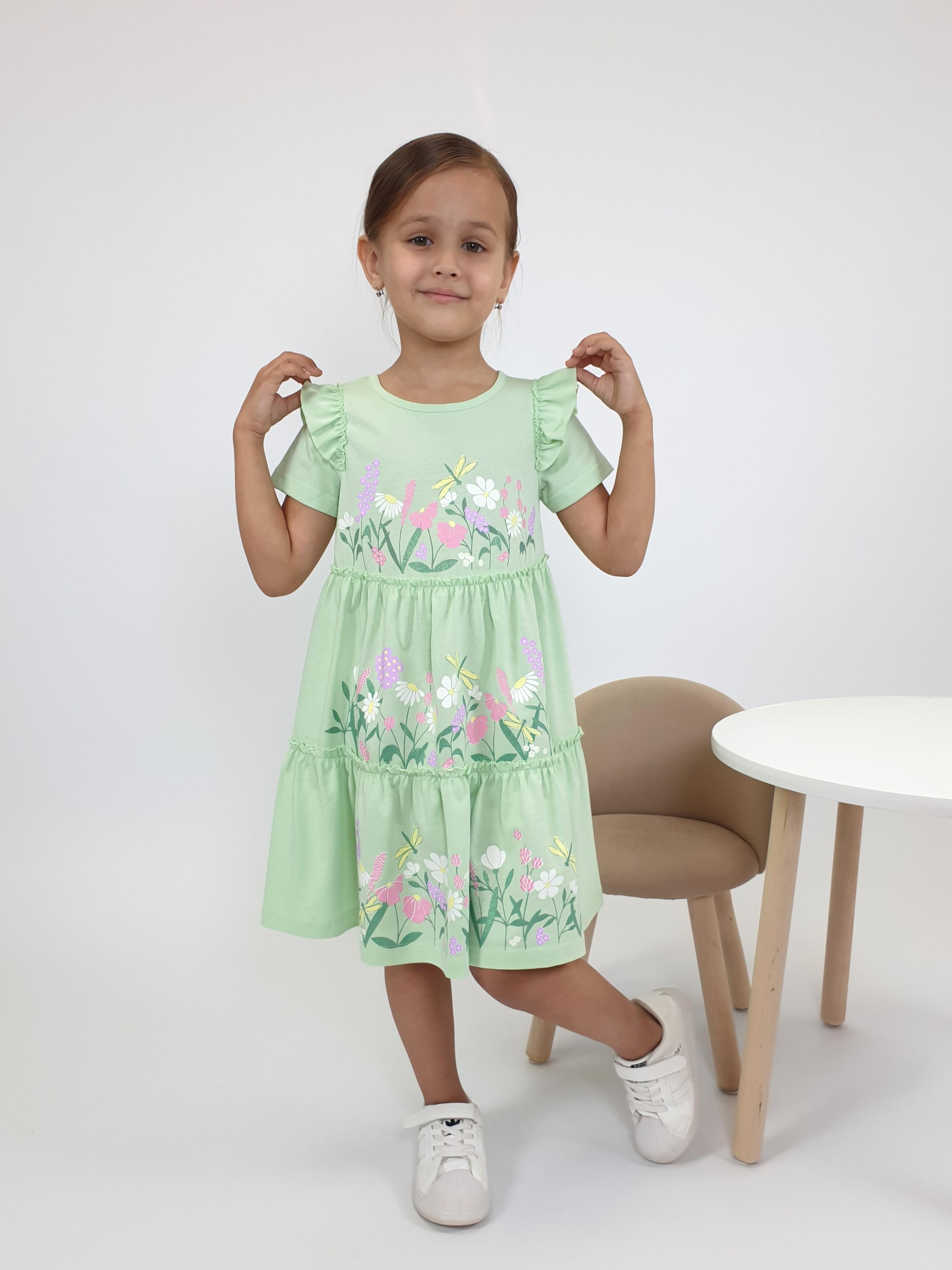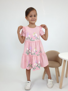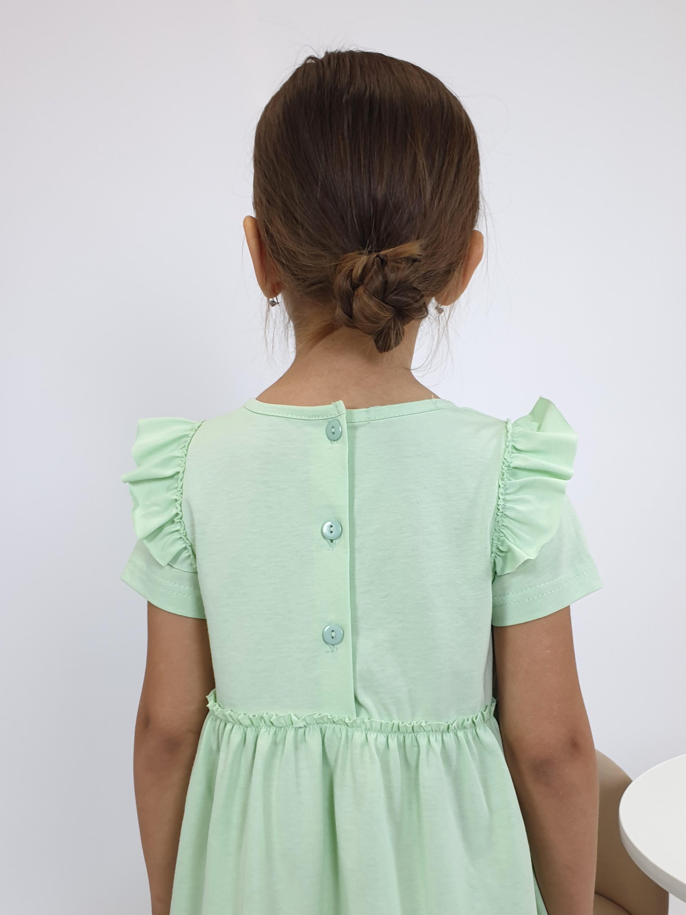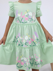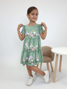 Кулирное полотно:100% х/б. Платье-силуэт трапеция,короткий втачной рукав с настрочной рюшей по пройме.Юбка переда и спинки из двух воланов,по передним воланам печать.Кокетка переда с печатью,застежка по спинке на пуговицы.Горловина окантована.