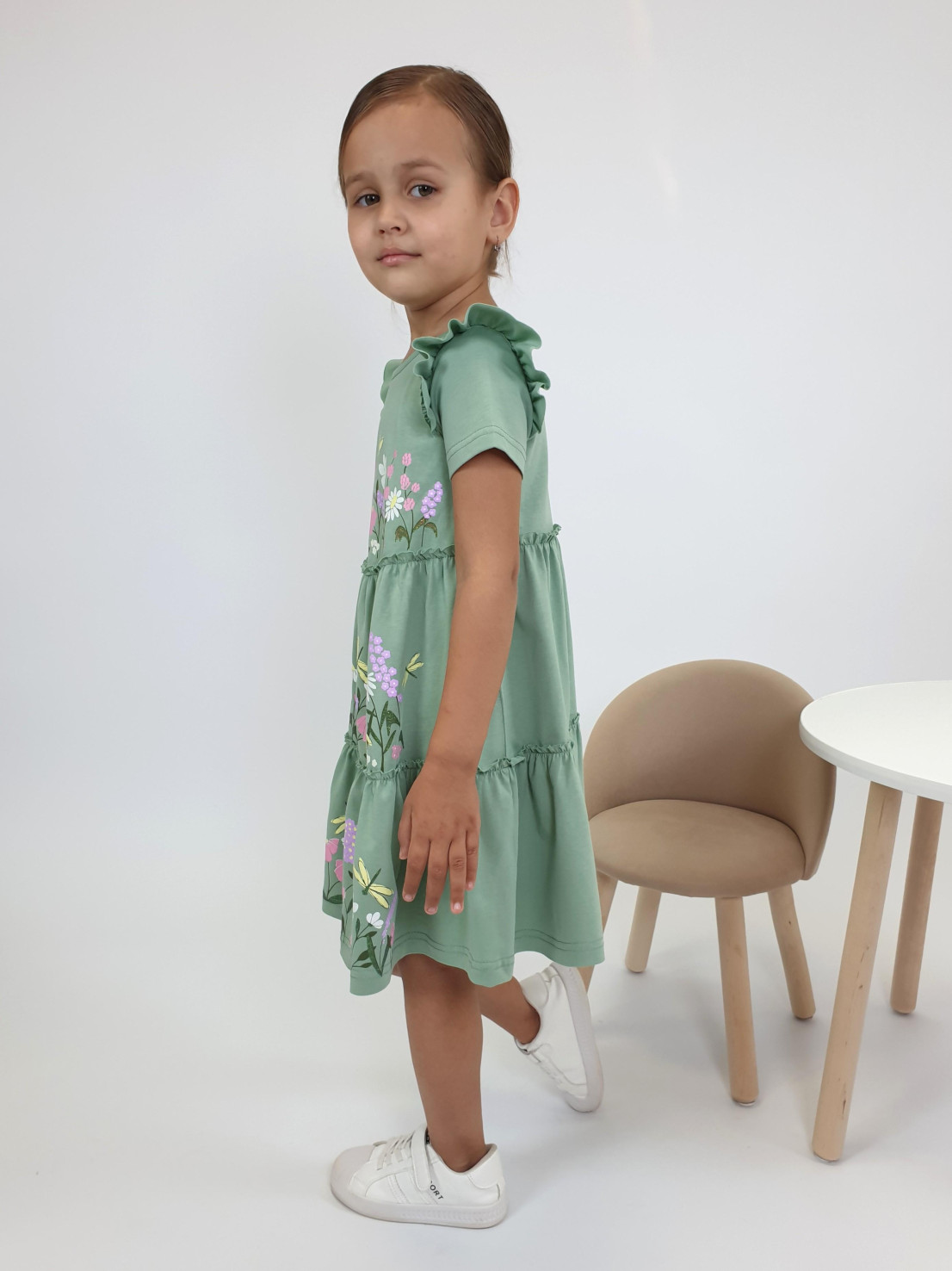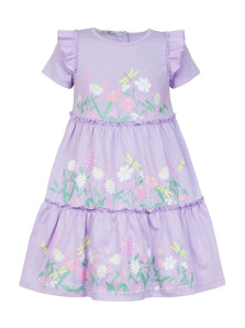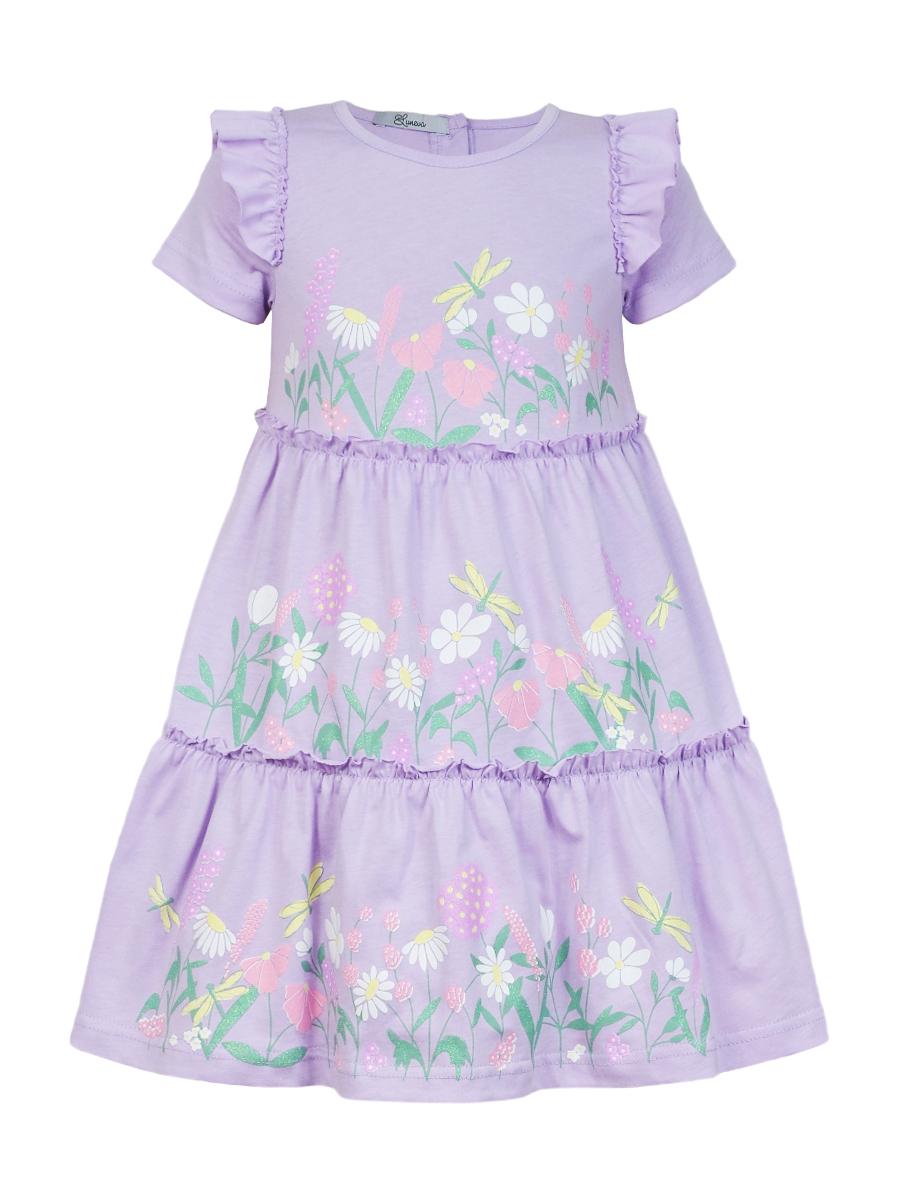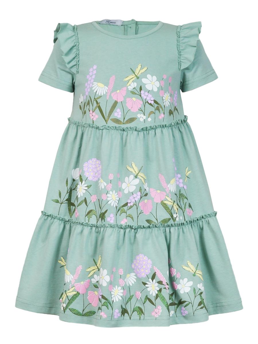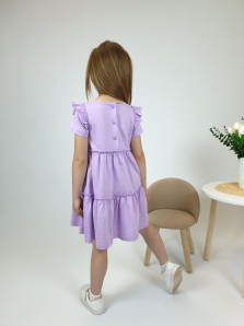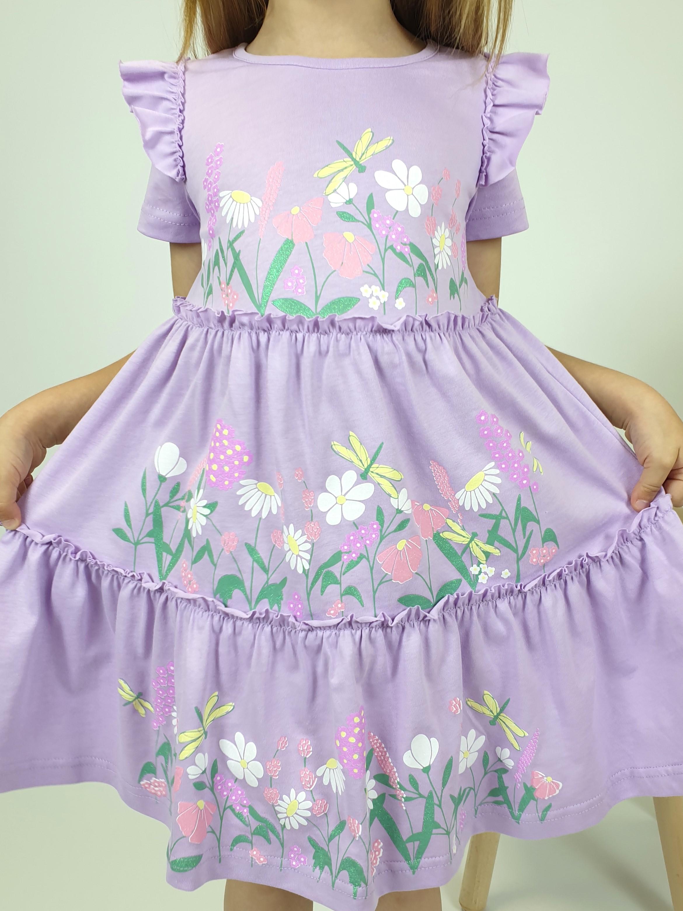 Кулирное полотно:100% х/б. Платье-силуэт трапеция,короткий втачной рукав с настрочной рюшей по пройме.Юбка переда и спинки из двух воланов,по передним воланам печать.Кокетка переда с печатью,застежка по спинке на пуговицы.Горловина окантована.