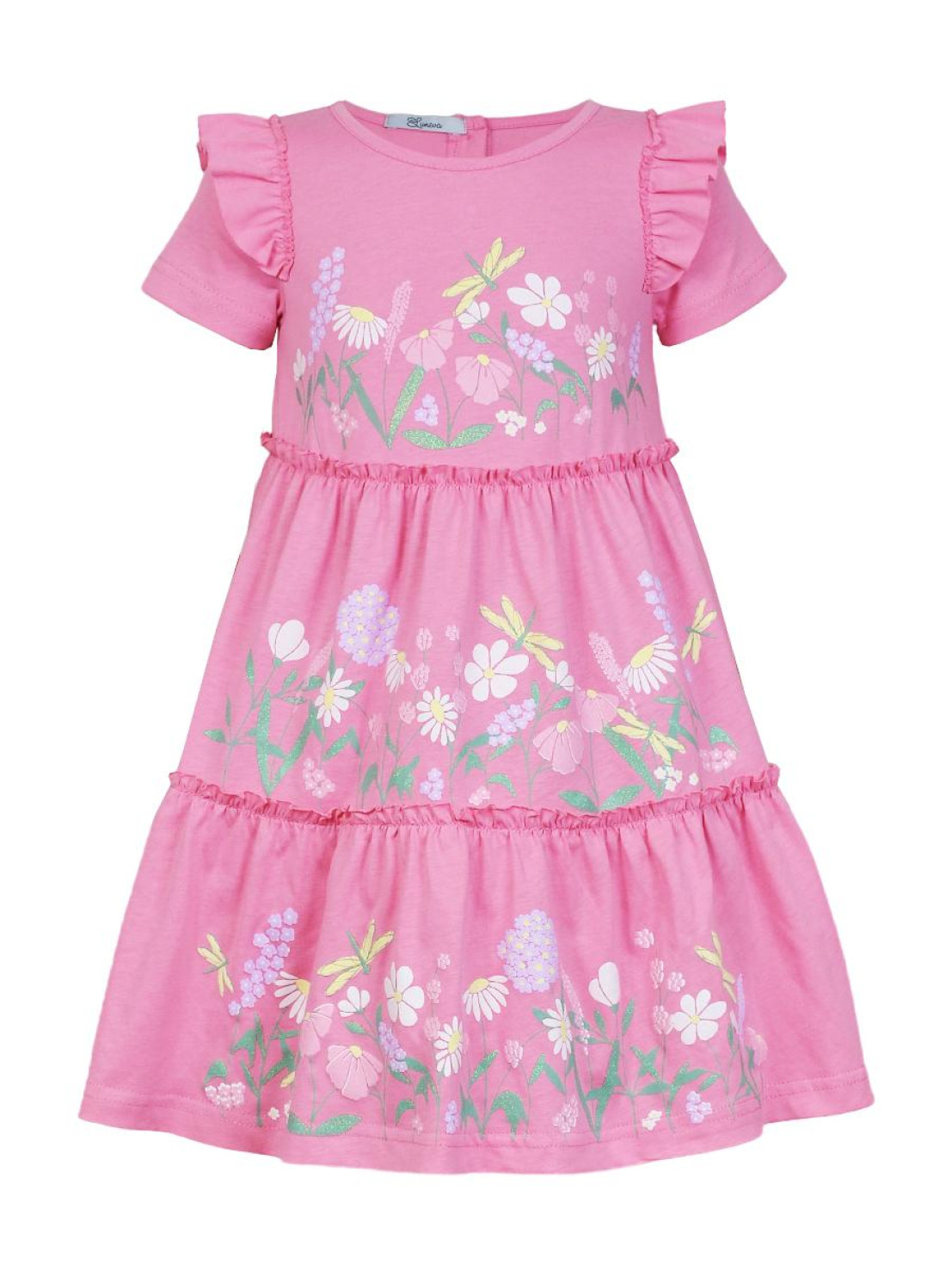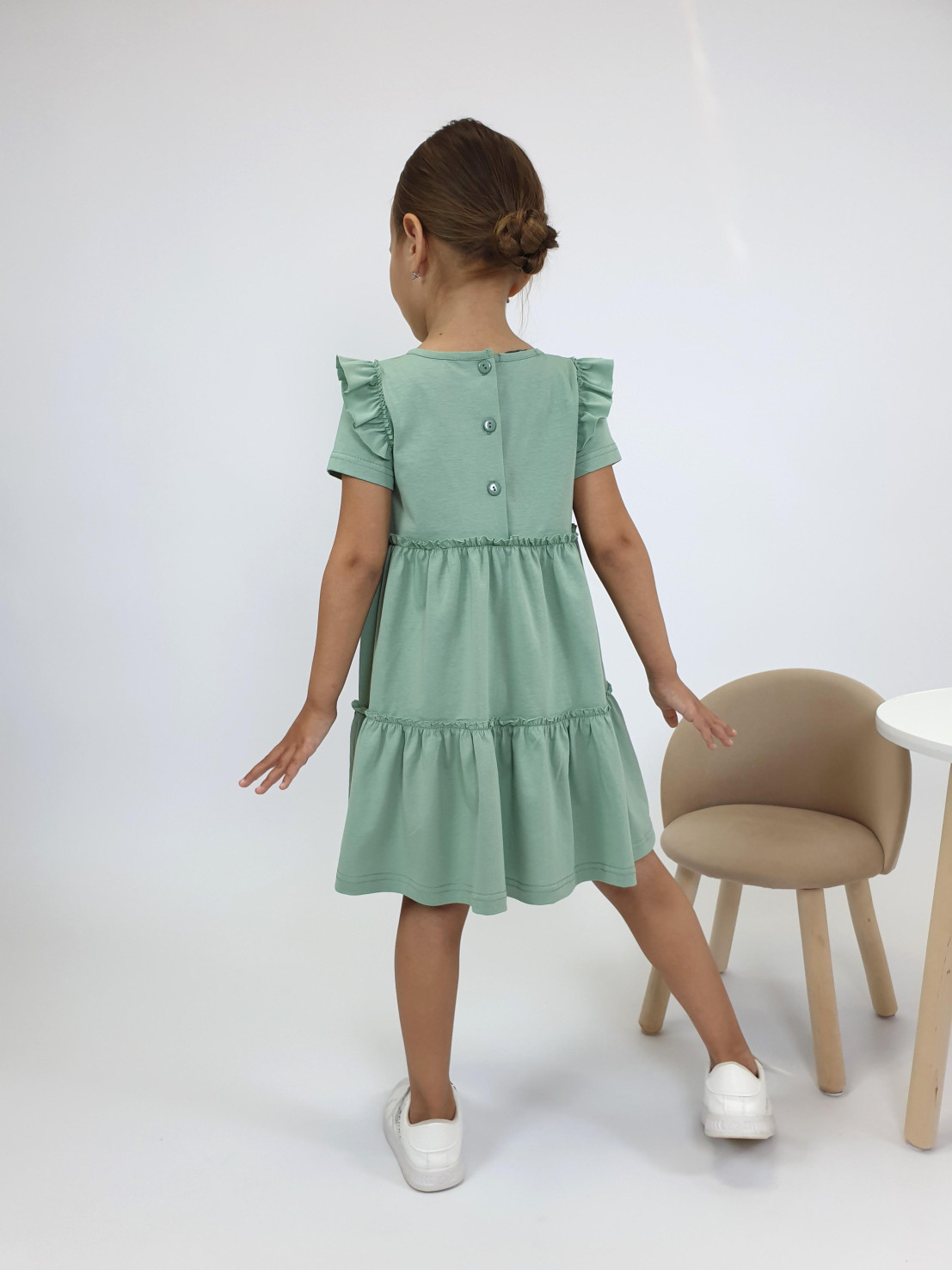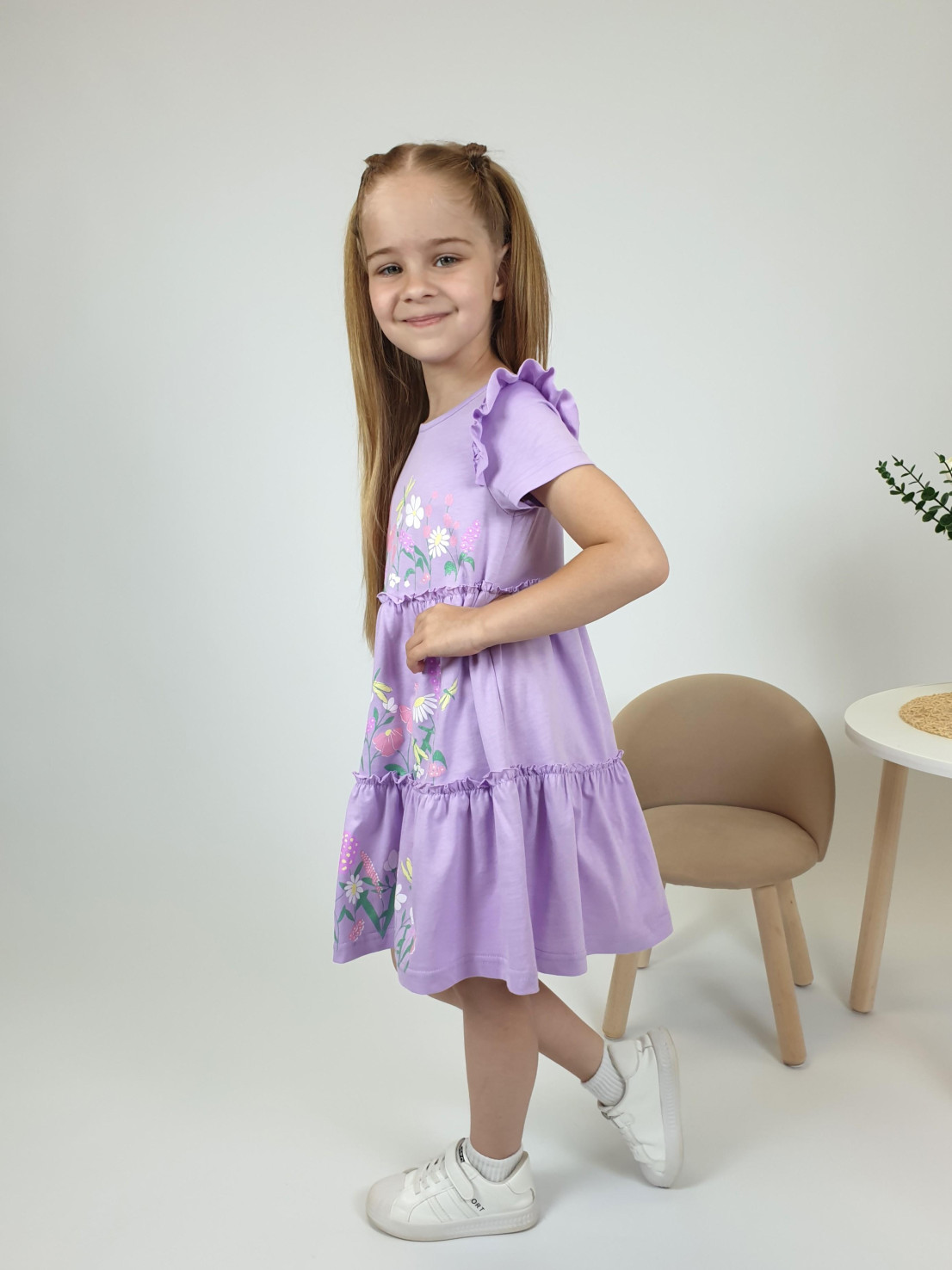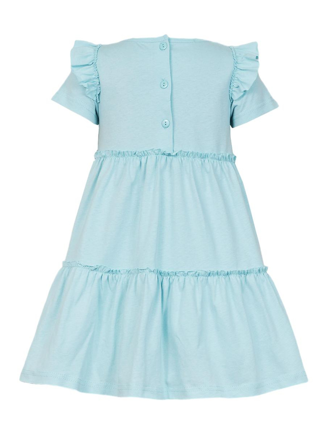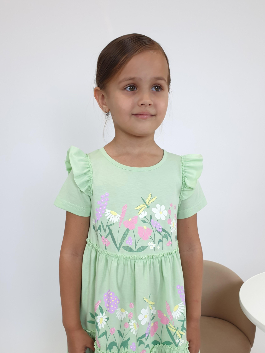 Кулирное полотно:100% х/б. Платье-силуэт трапеция,короткий втачной рукав с настрочной рюшей по пройме.Юбка переда и спинки из двух воланов,по передним воланам печать.Кокетка переда с печатью,застежка по спинке на пуговицы.Горловина окантована.