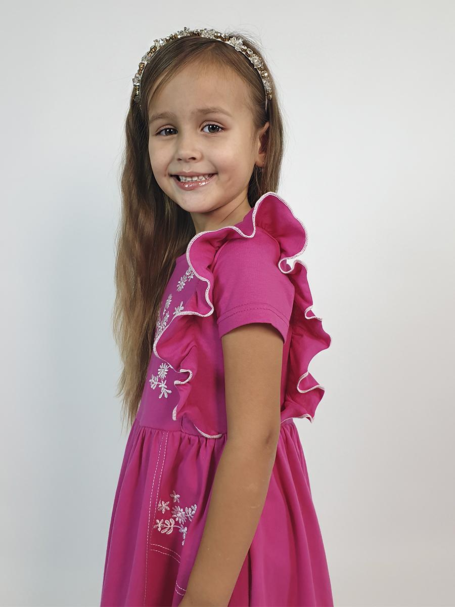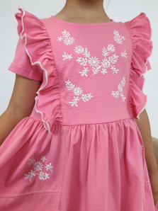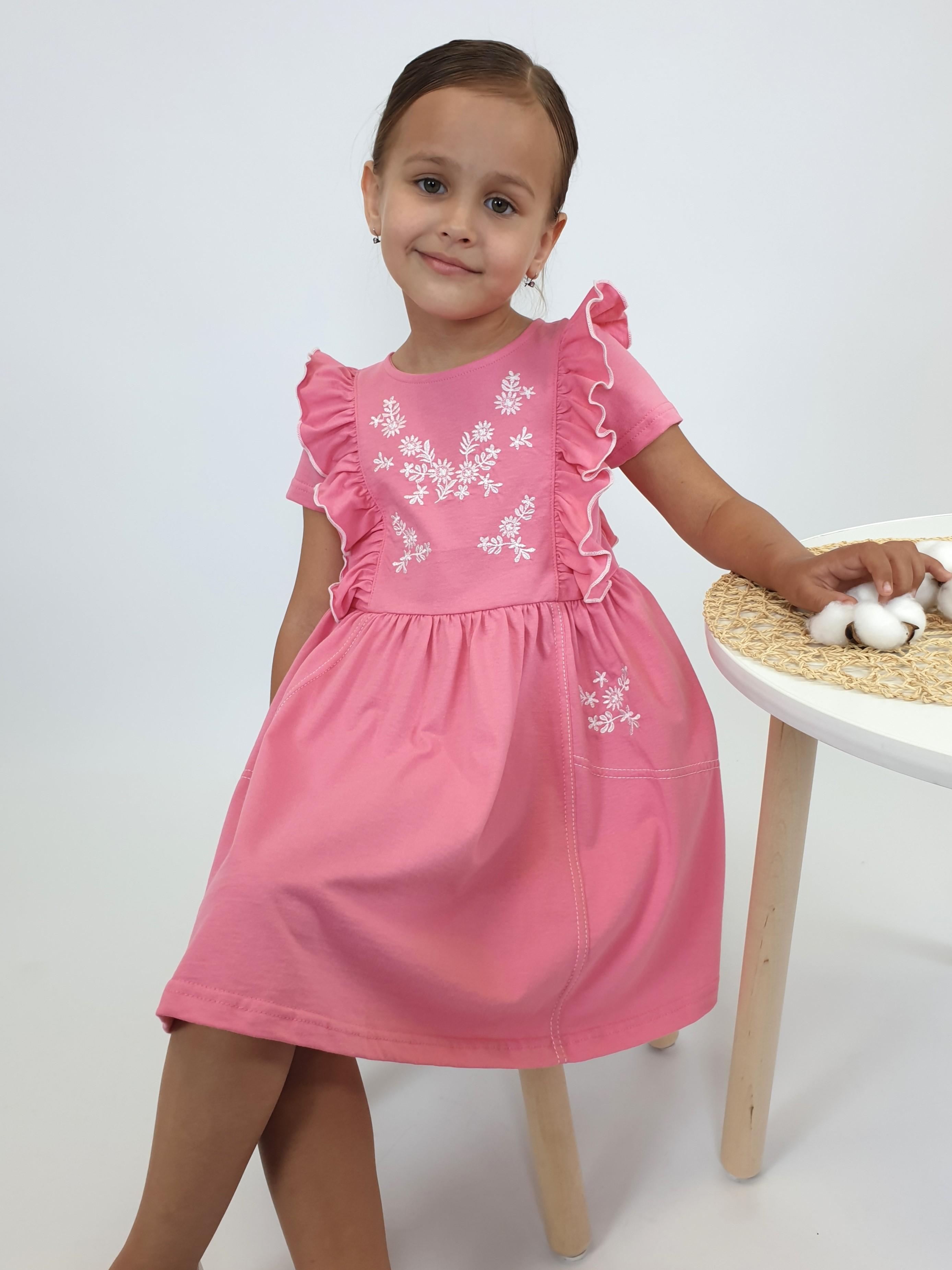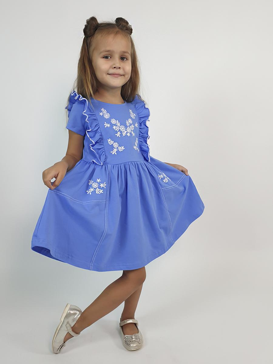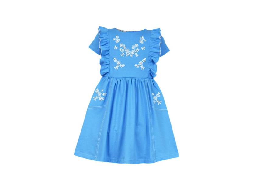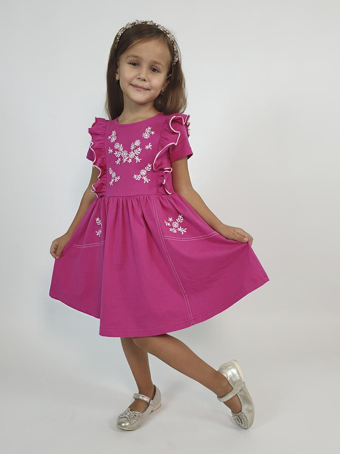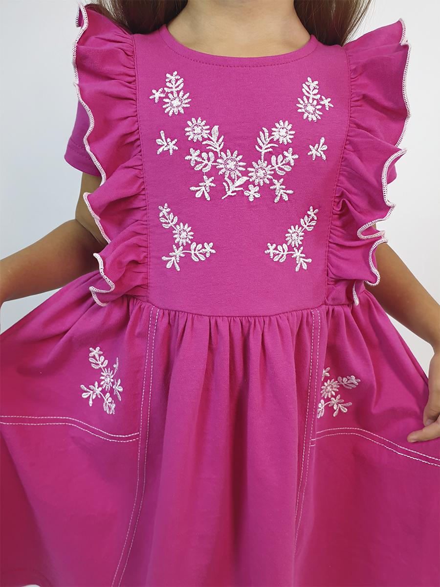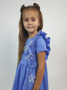Кулирное полотно:100% х/б. Платье-полуприлегающего силуэта,короткий рукав.Отрезная юбка со сборкой рельефами.Лиф с рельефами и рюшей.Вышивка на боковых клиньях юбки и центральной вставке переда.Горловина окантована и подшита,застежка сзади на пуговицы.