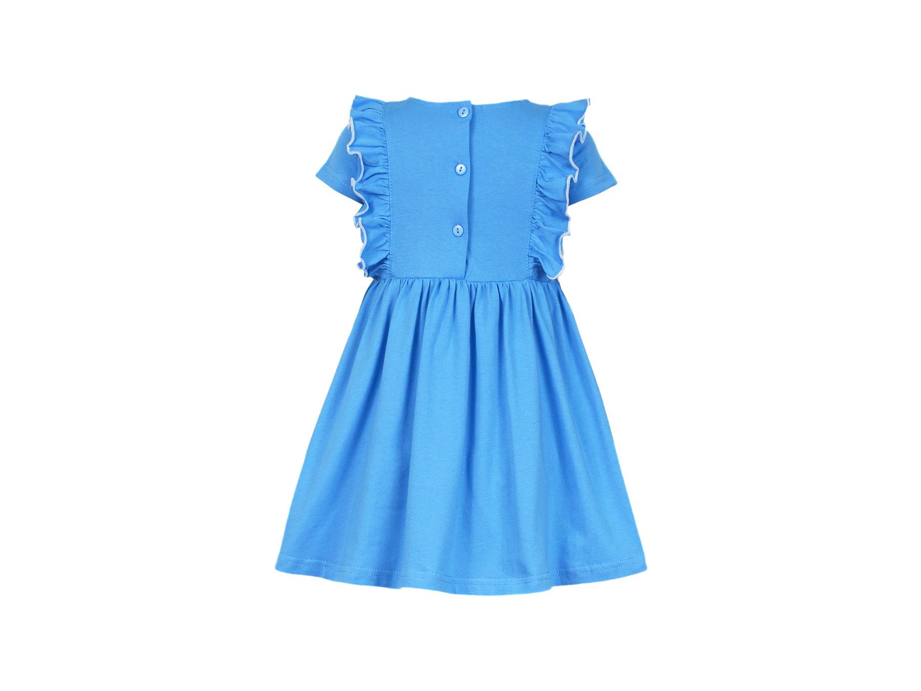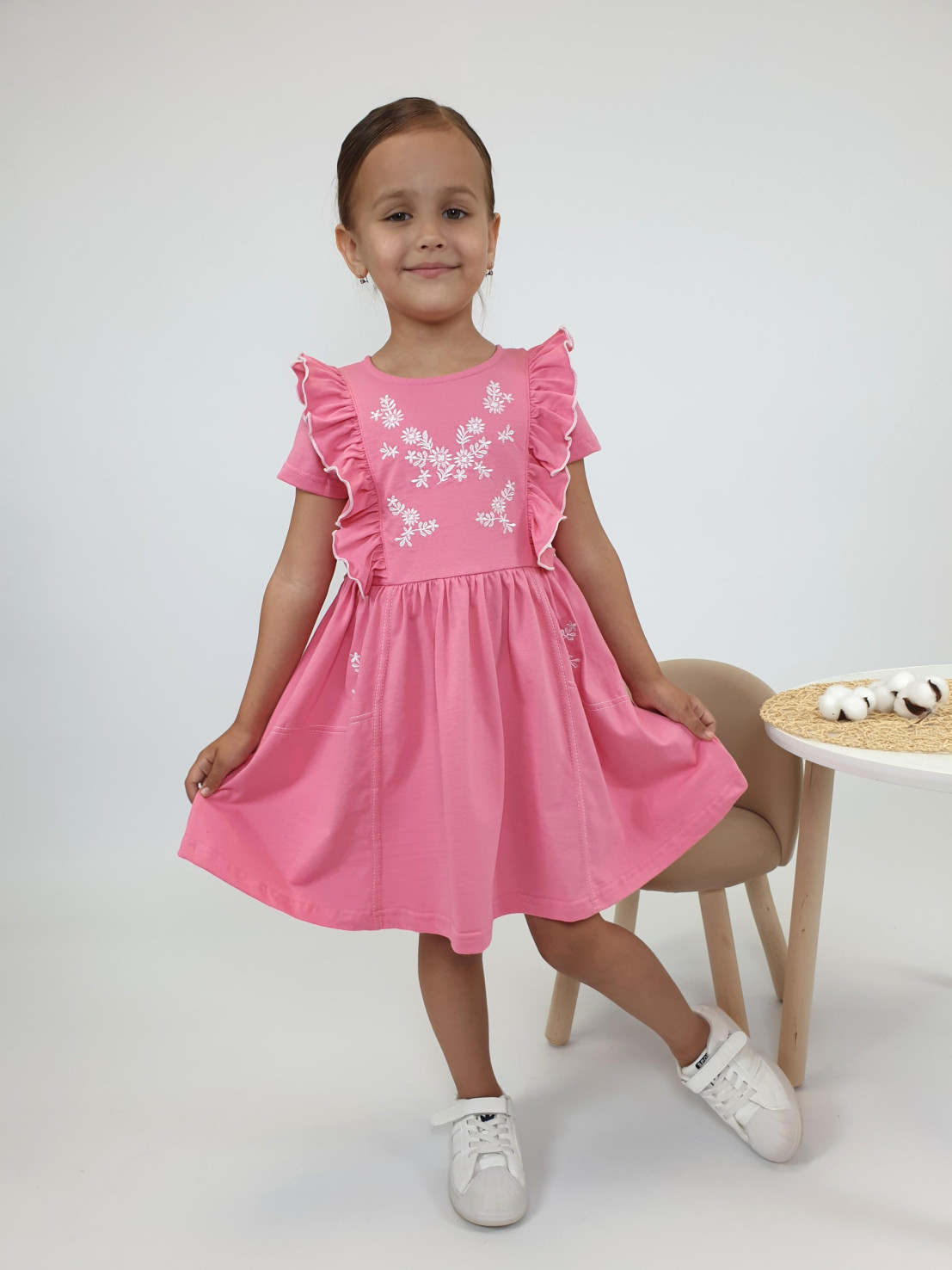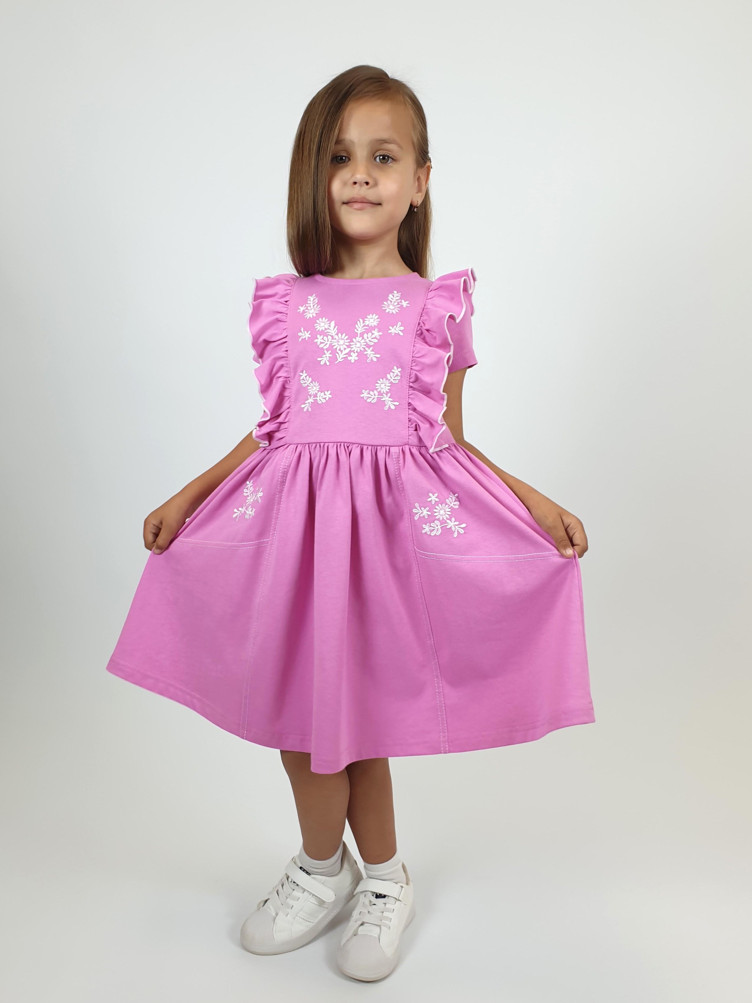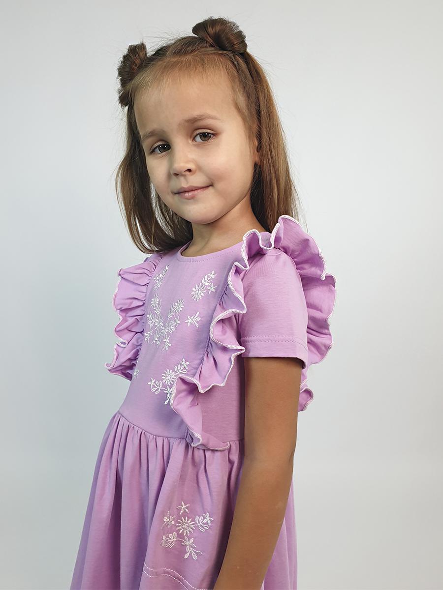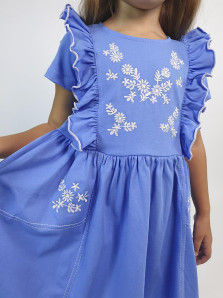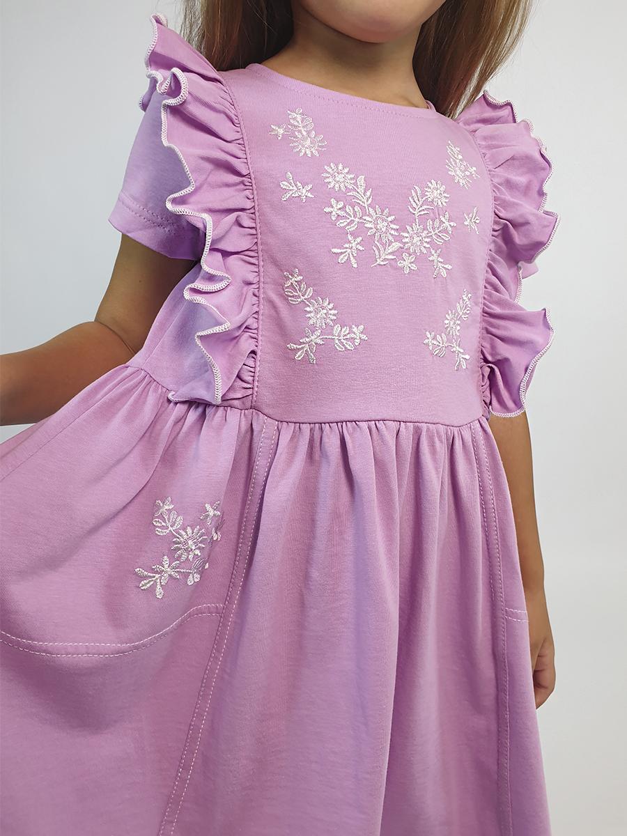 Кулирное полотно:100% х/б. Платье-полуприлегающего силуэта,короткий рукав.Отрезная юбка со сборкой рельефами.Лиф с рельефами и рюшей.Вышивка на боковых клиньях юбки и центральной вставке переда.Горловина окантована и подшита,застежка сзади на пуговицы.