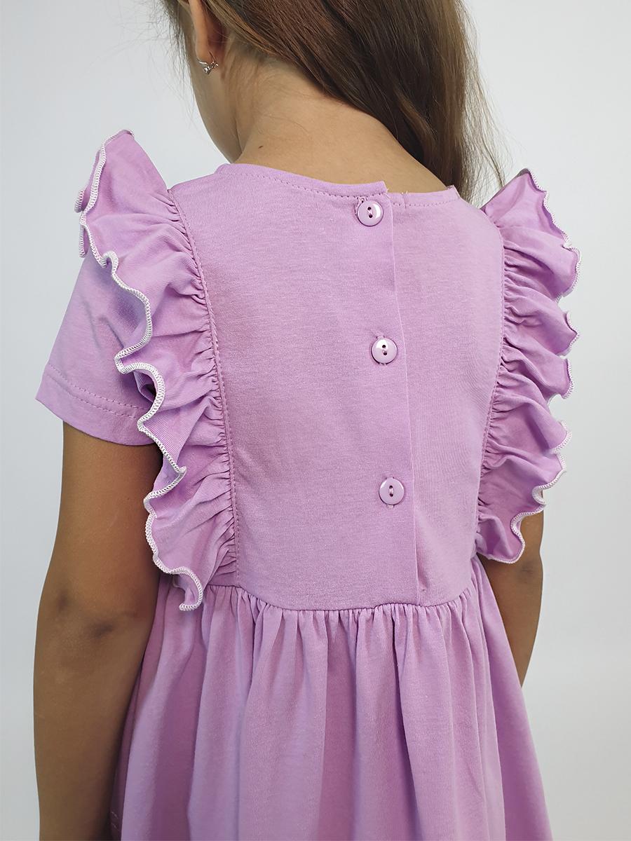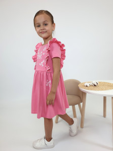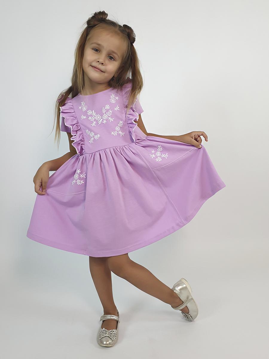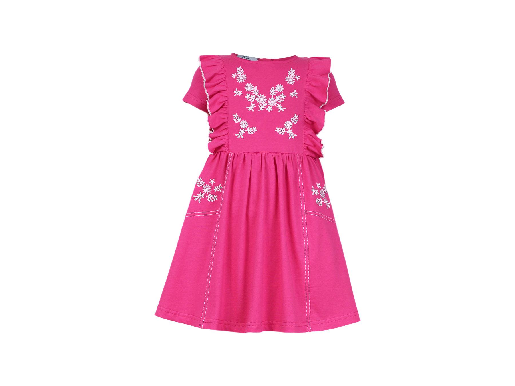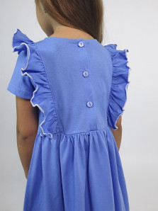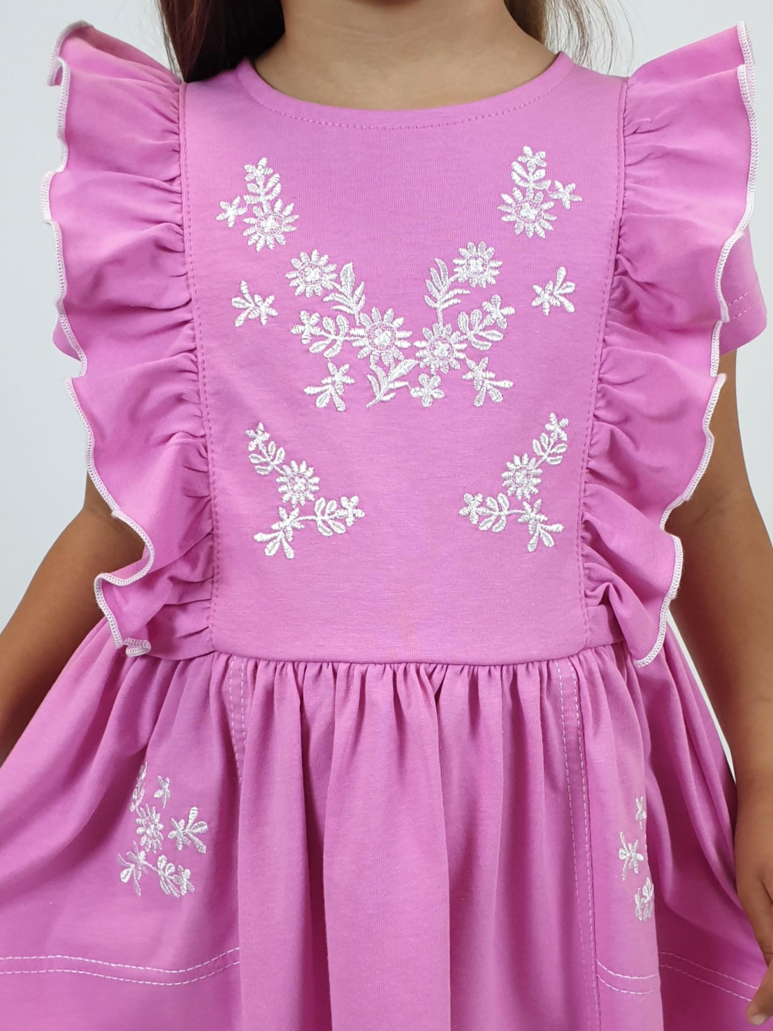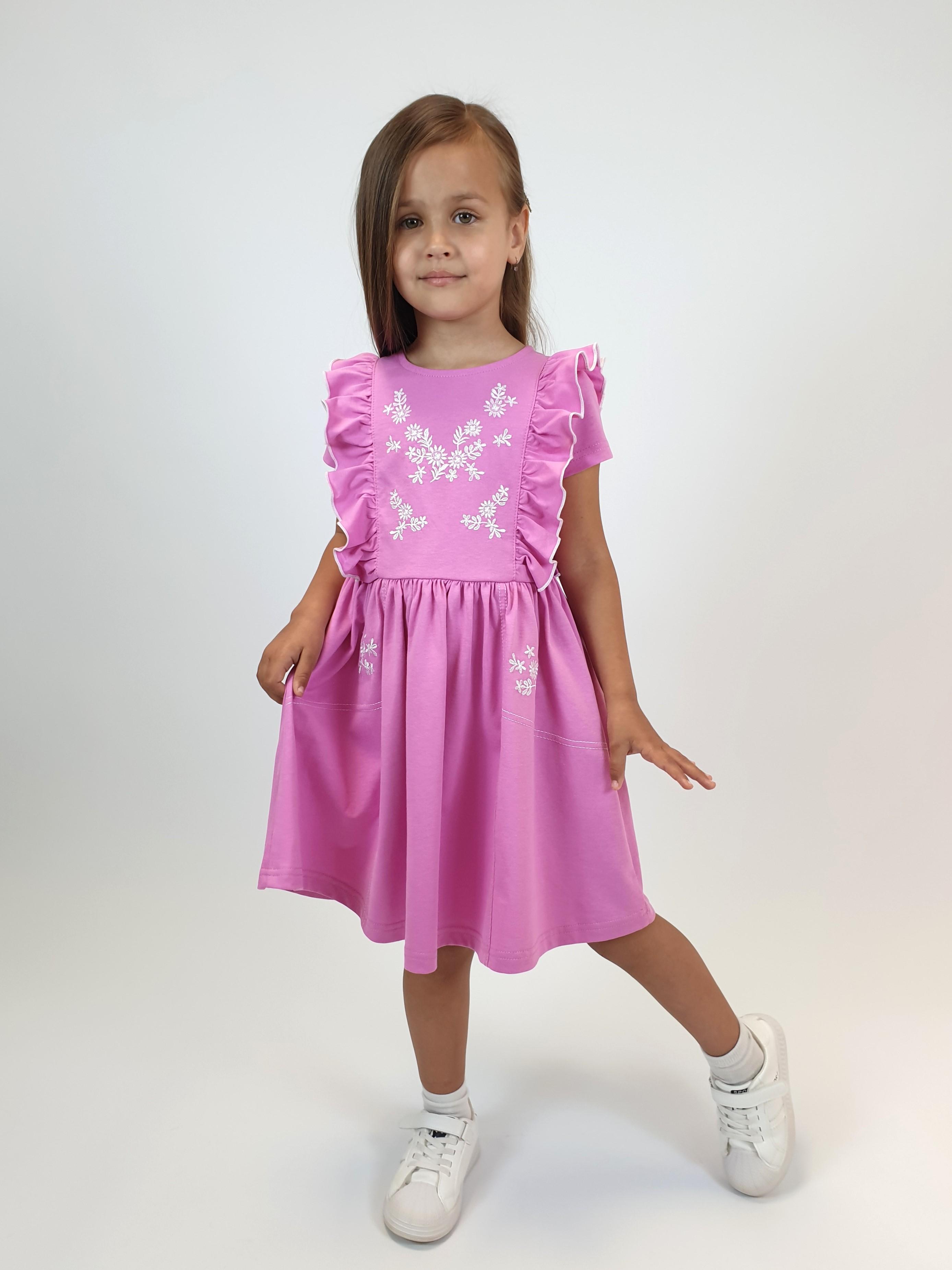 Кулирное полотно:100% х/б. Платье-полуприлегающего силуэта,короткий рукав.Отрезная юбка со сборкой рельефами.Лиф с рельефами и рюшей.Вышивка на боковых клиньях юбки и центральной вставке переда.Горловина окантована и подшита,застежка сзади на пуговицы.