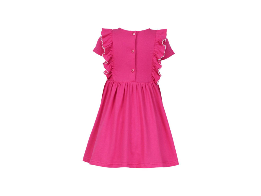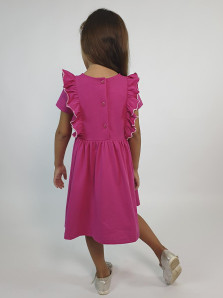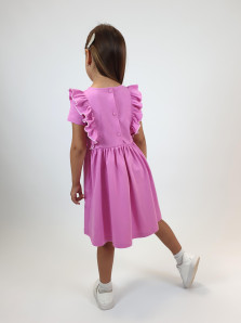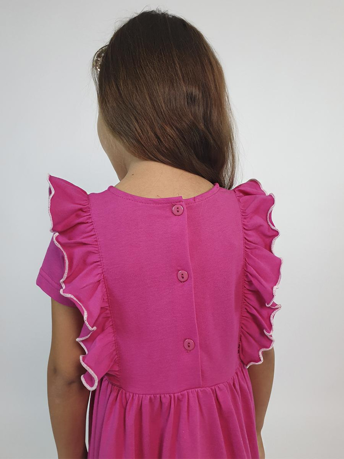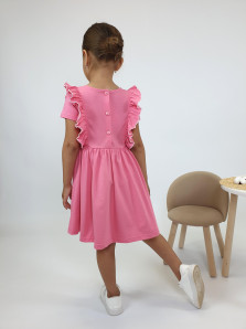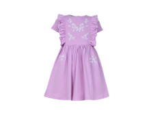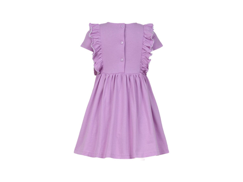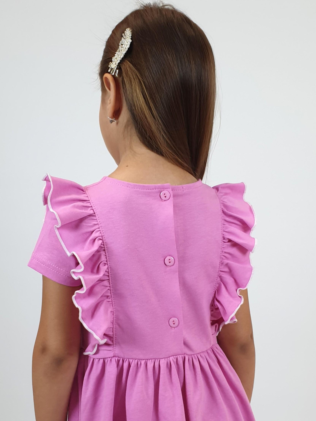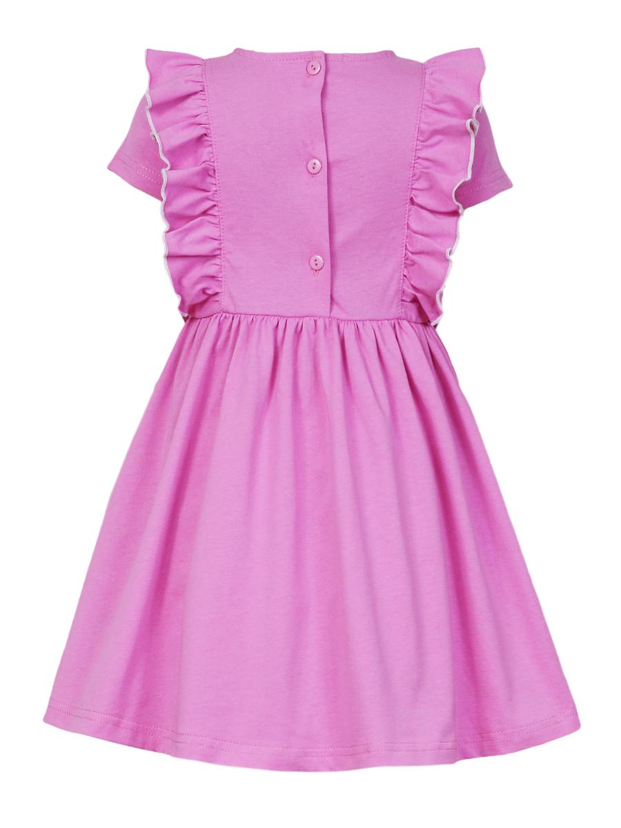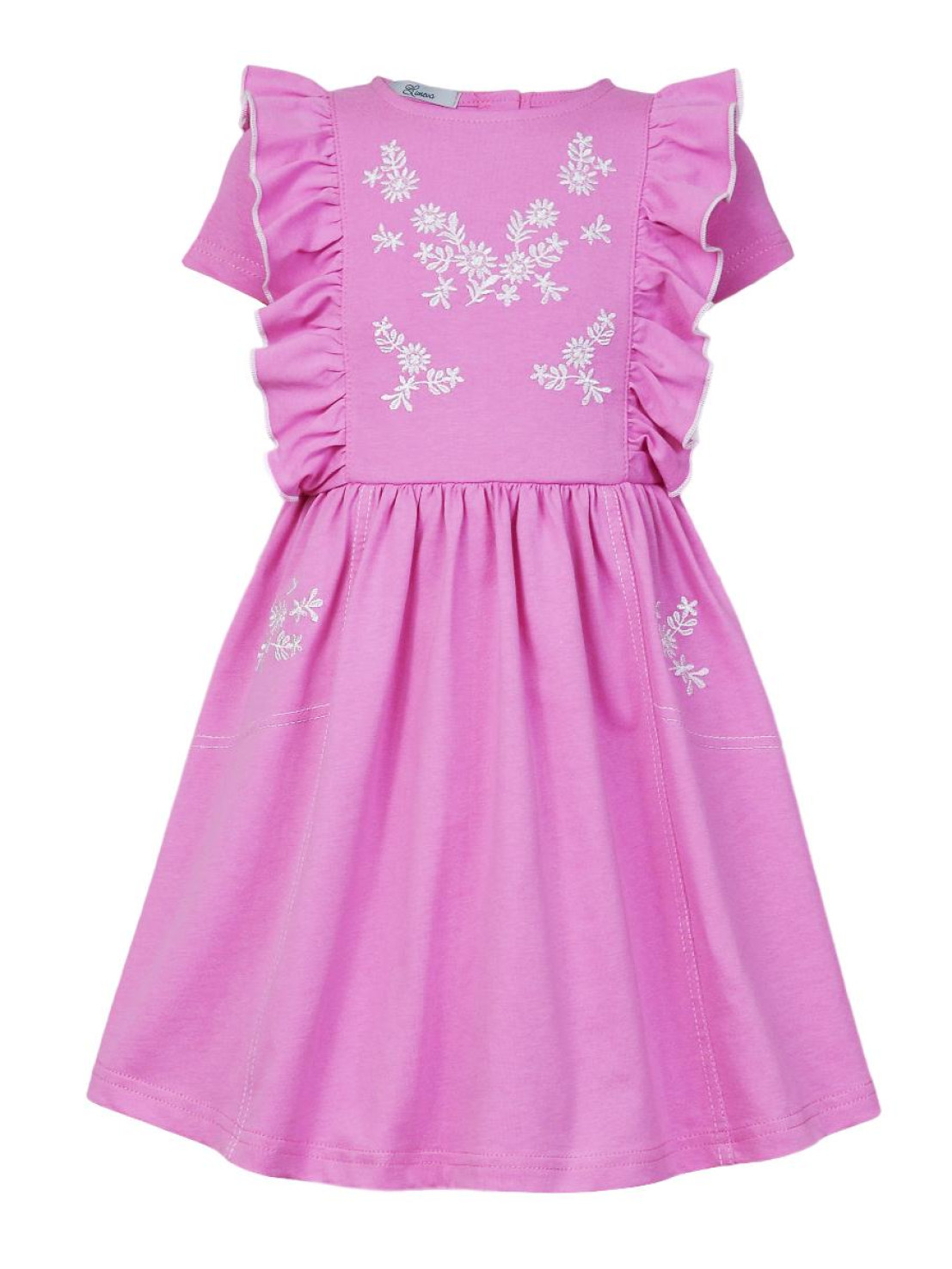 Кулирное полотно:100% х/б. Платье-полуприлегающего силуэта,короткий рукав.Отрезная юбка со сборкой рельефами.Лиф с рельефами и рюшей.Вышивка на боковых клиньях юбки и центральной вставке переда.Горловина окантована и подшита,застежка сзади на пуговицы.