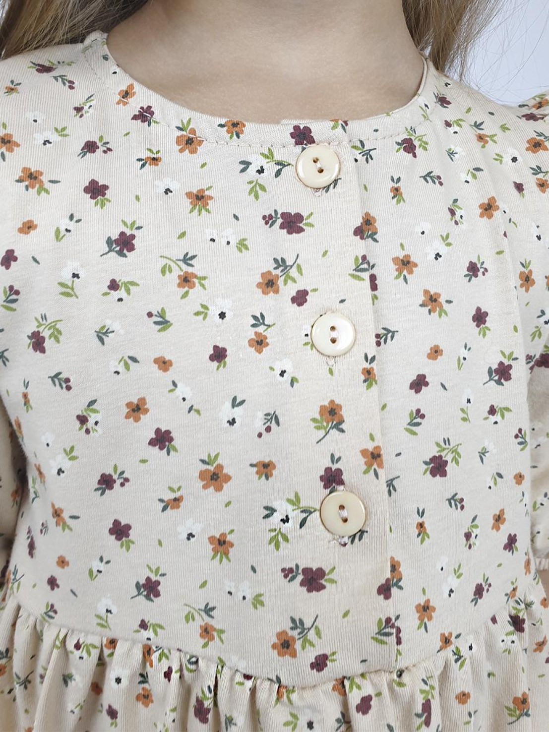 Кулирное полотно (набивка): 100% х/б. Платье-с отрезной юбкой в сборку.Короткий рукав с резинкой внизу,сборка по окату.Горловина окантована и подшита,застежка центральная на пуговицы.