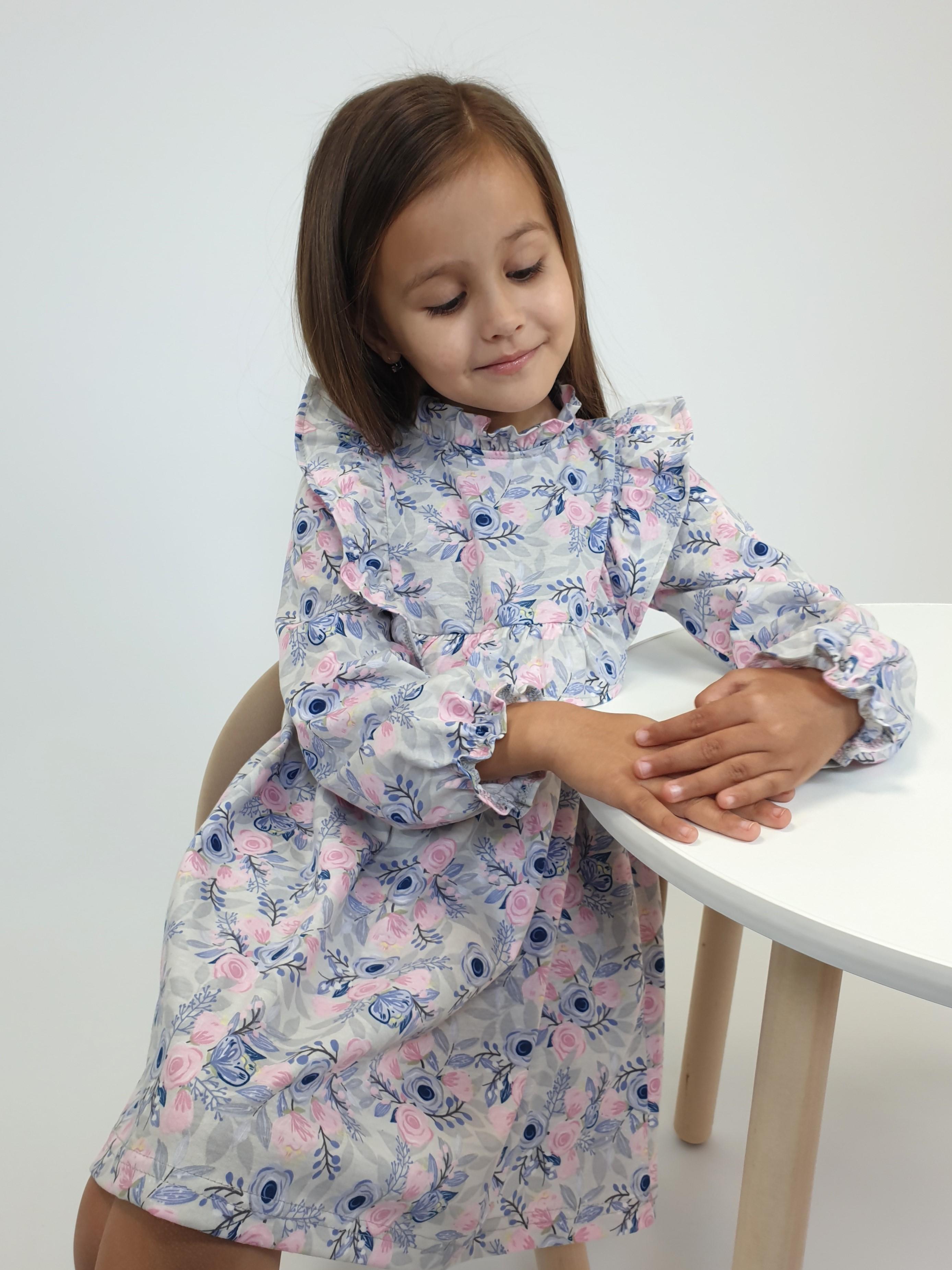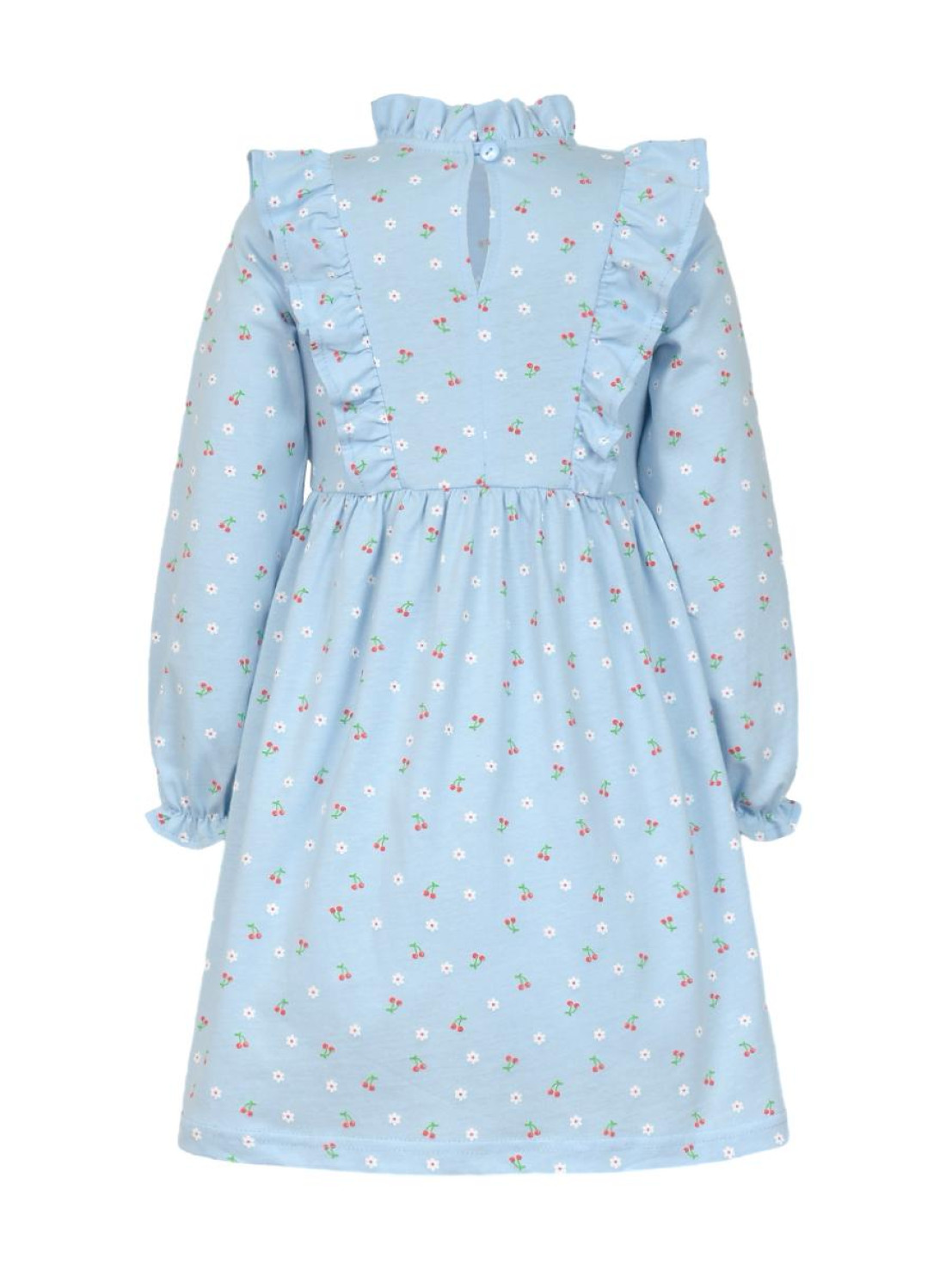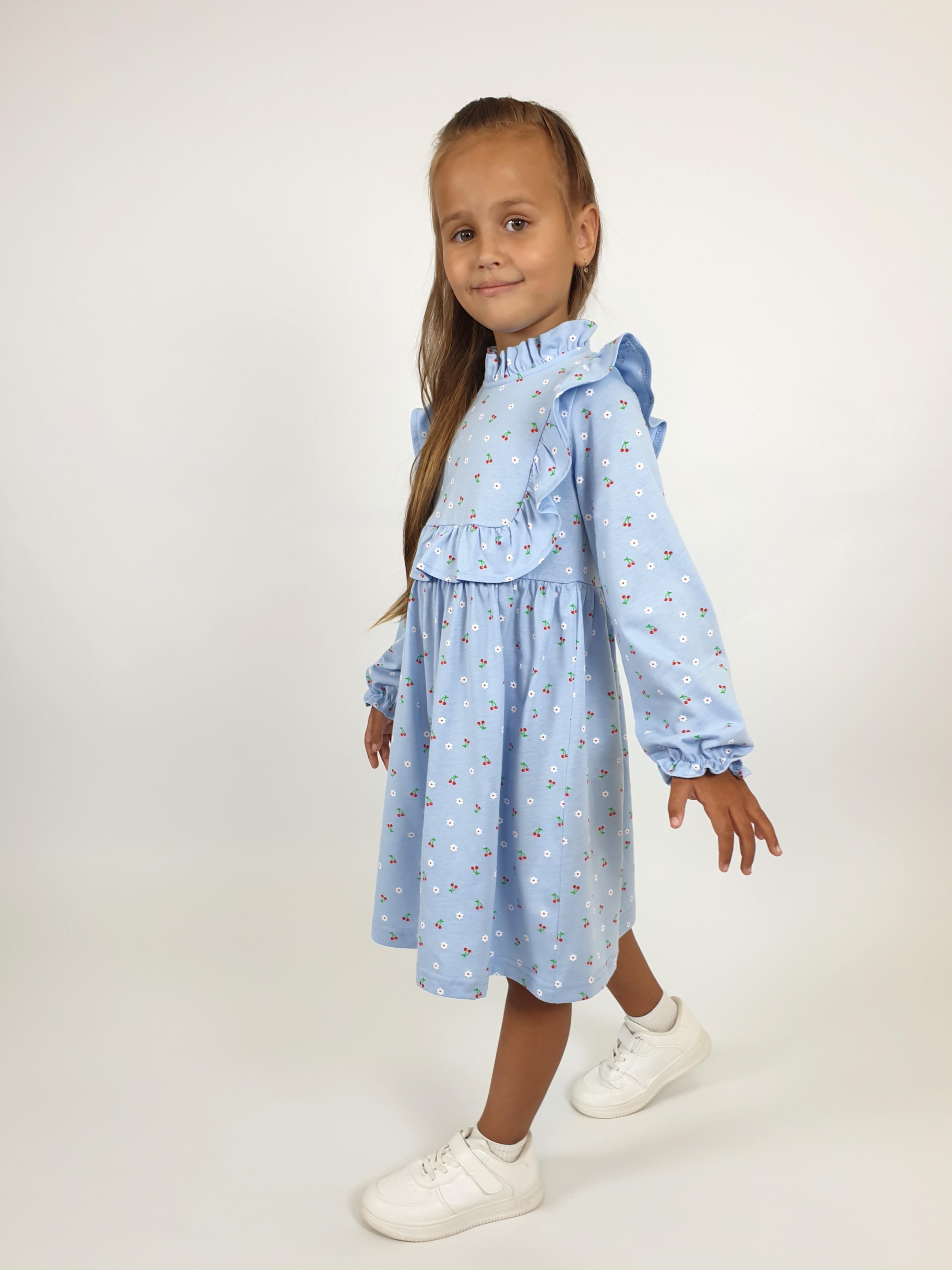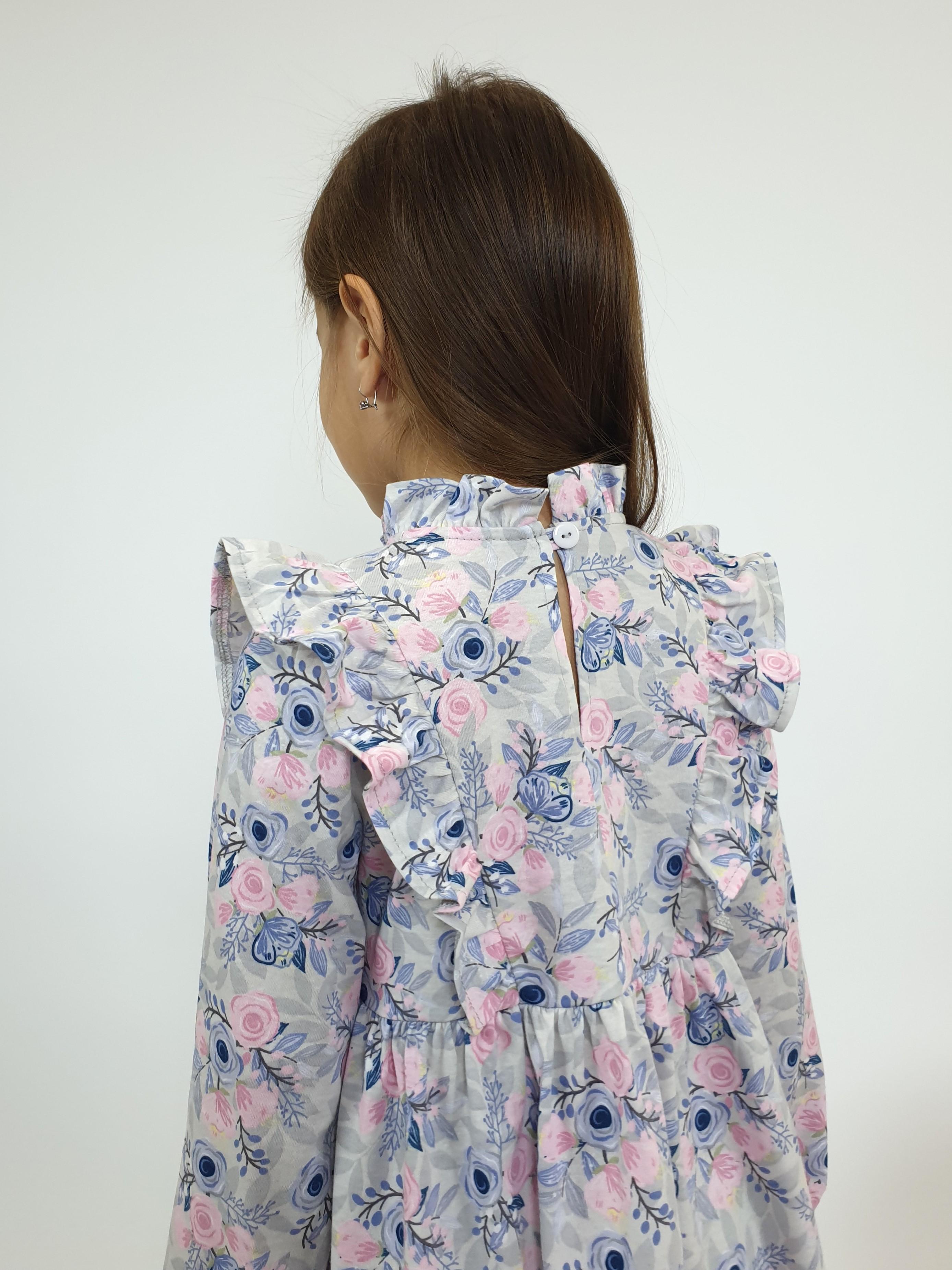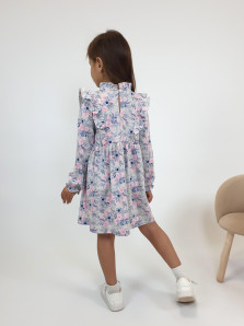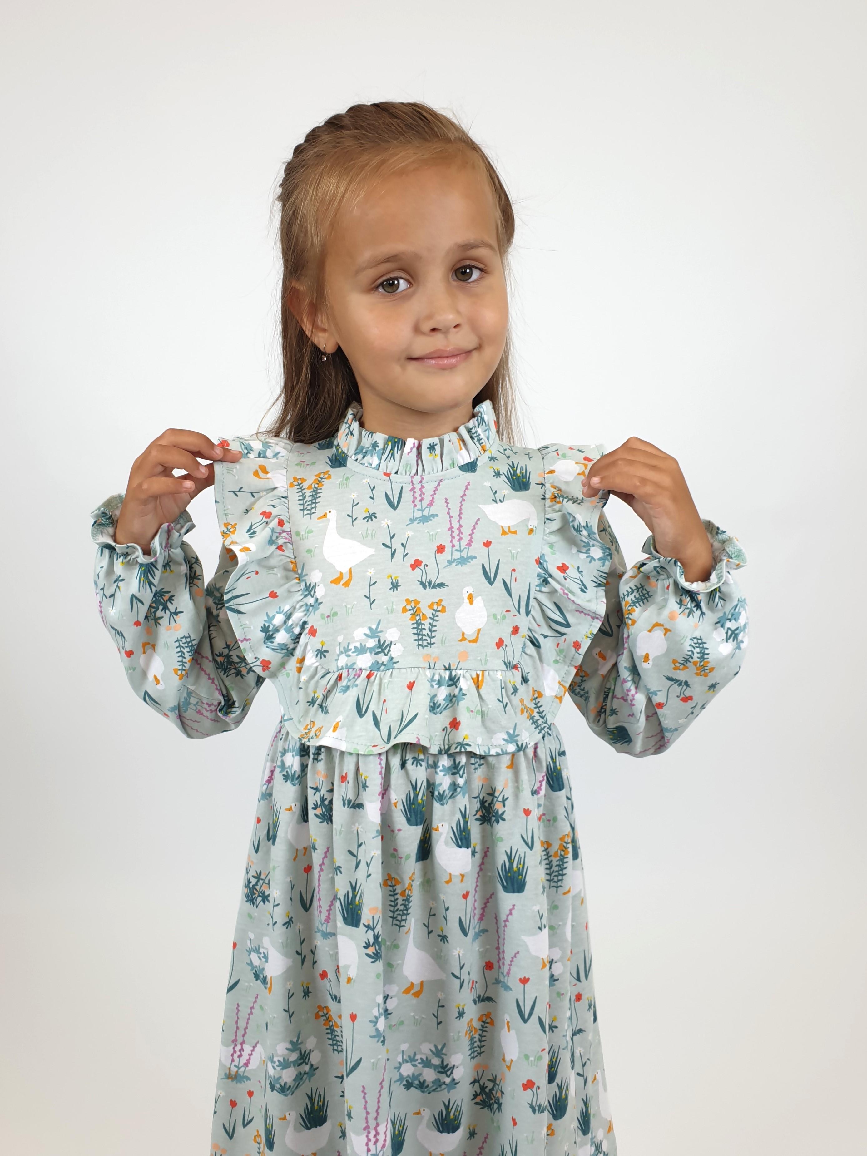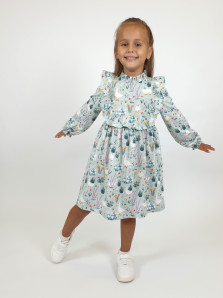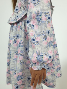 Кулирное полотно (набивка):100%х/б. Платье-отрезная юбка в сборку,кокетка переда и рельефы спинки с рюшей.Рукав длинный,внизу на резинке(венгерке).В горловине рюша со сгибом,шов окантован и подшит.Застежка по спинке на пуговицу.
