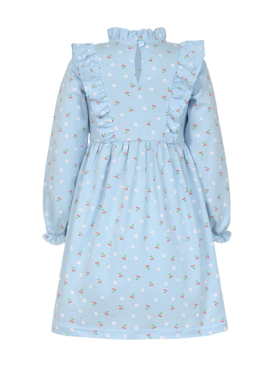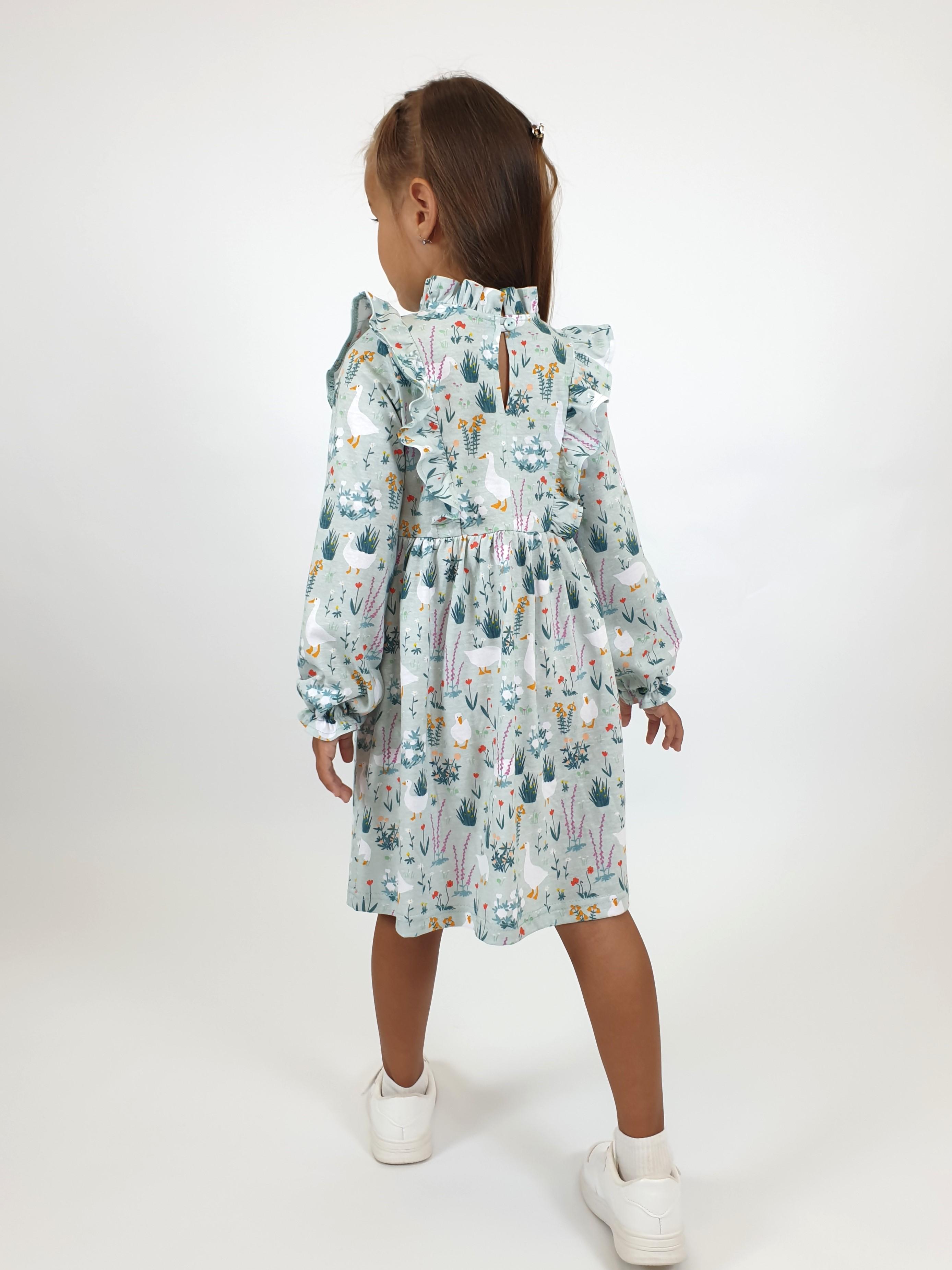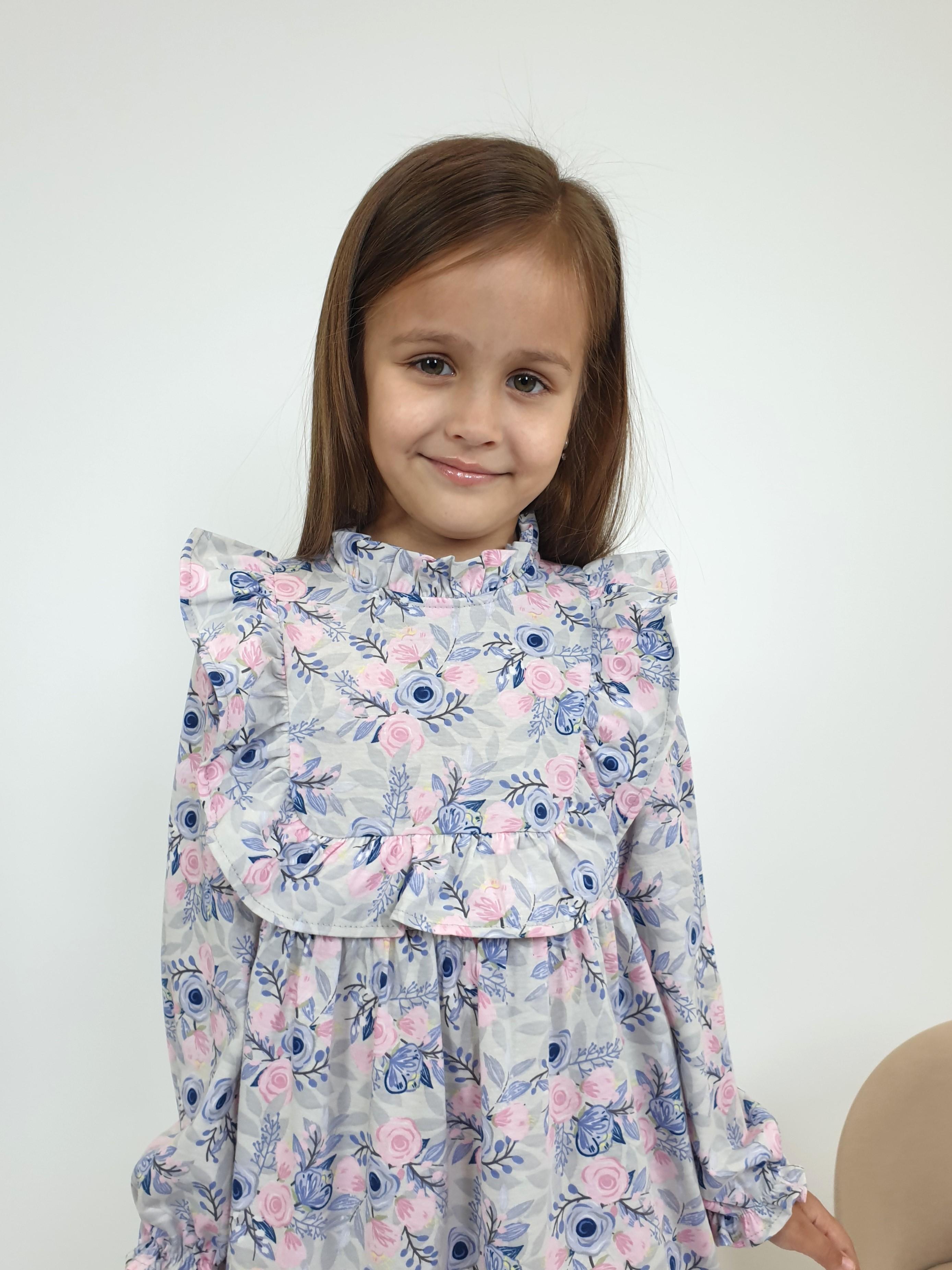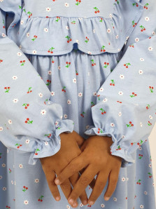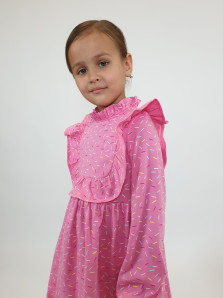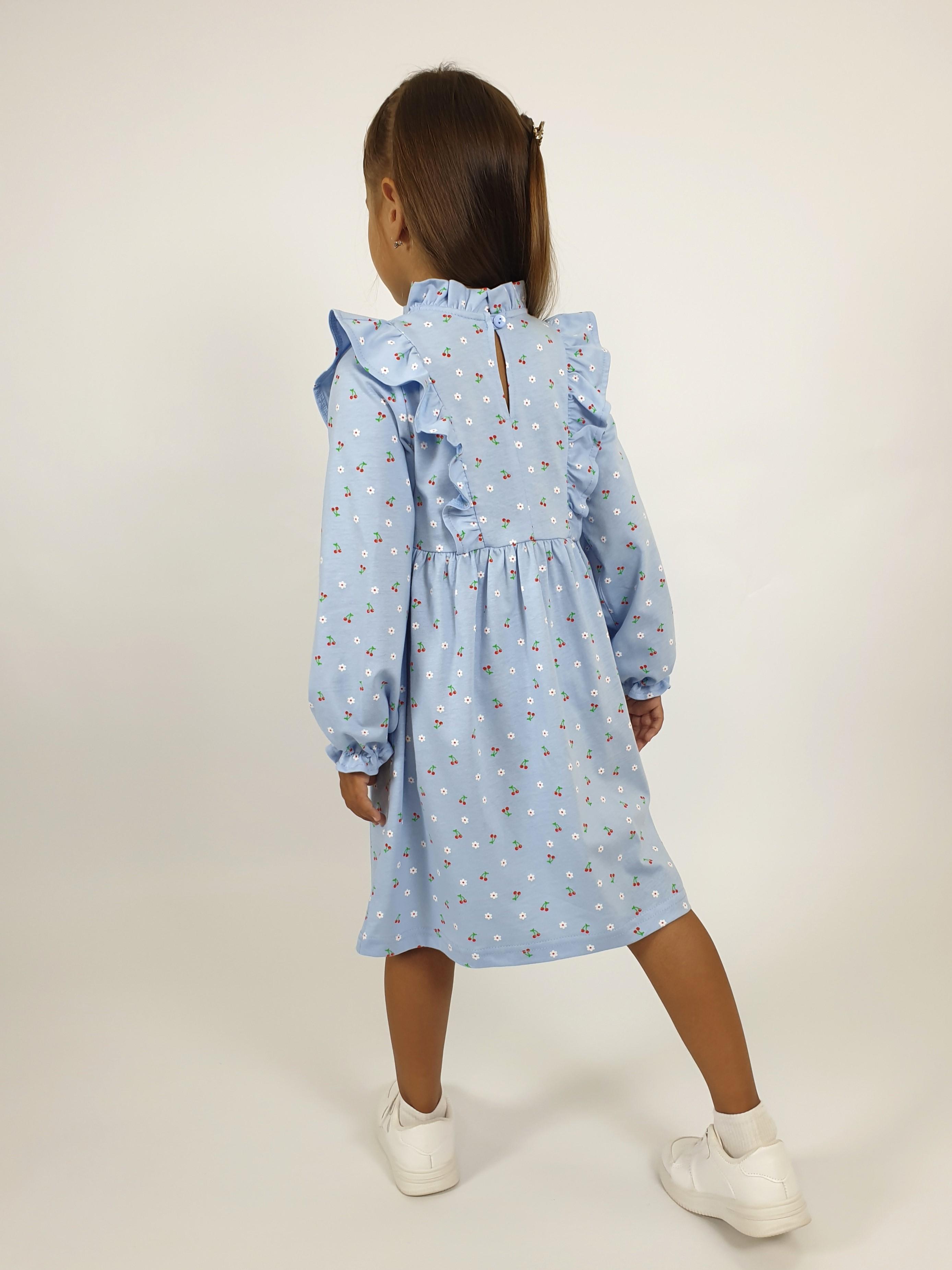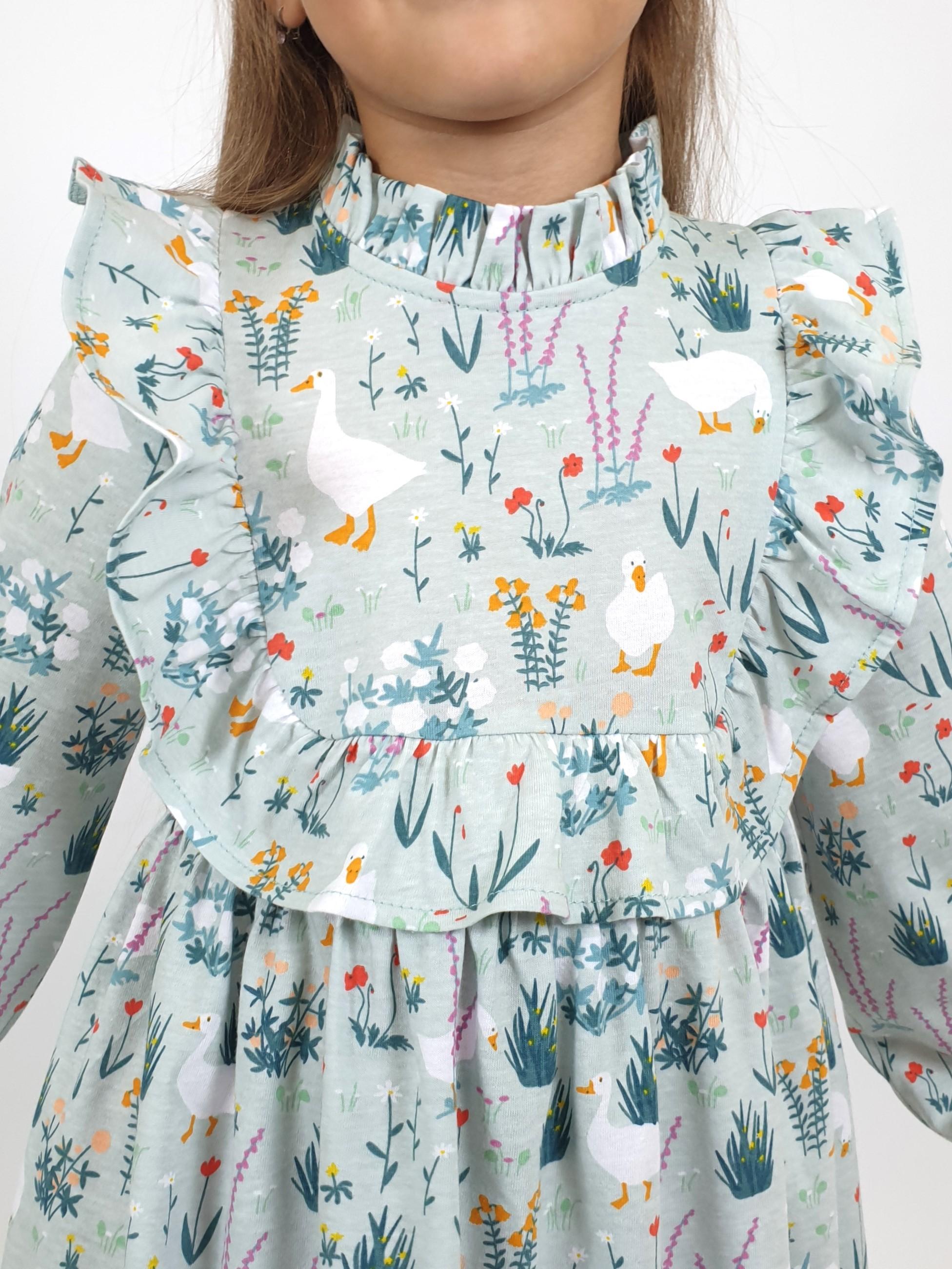 Кулирное полотно (набивка):100%х/б. Платье-отрезная юбка в сборку,кокетка переда и рельефы спинки с рюшей.Рукав длинный,внизу на резинке(венгерке).В горловине рюша со сгибом,шов окантован и подшит.Застежка по спинке на пуговицу.