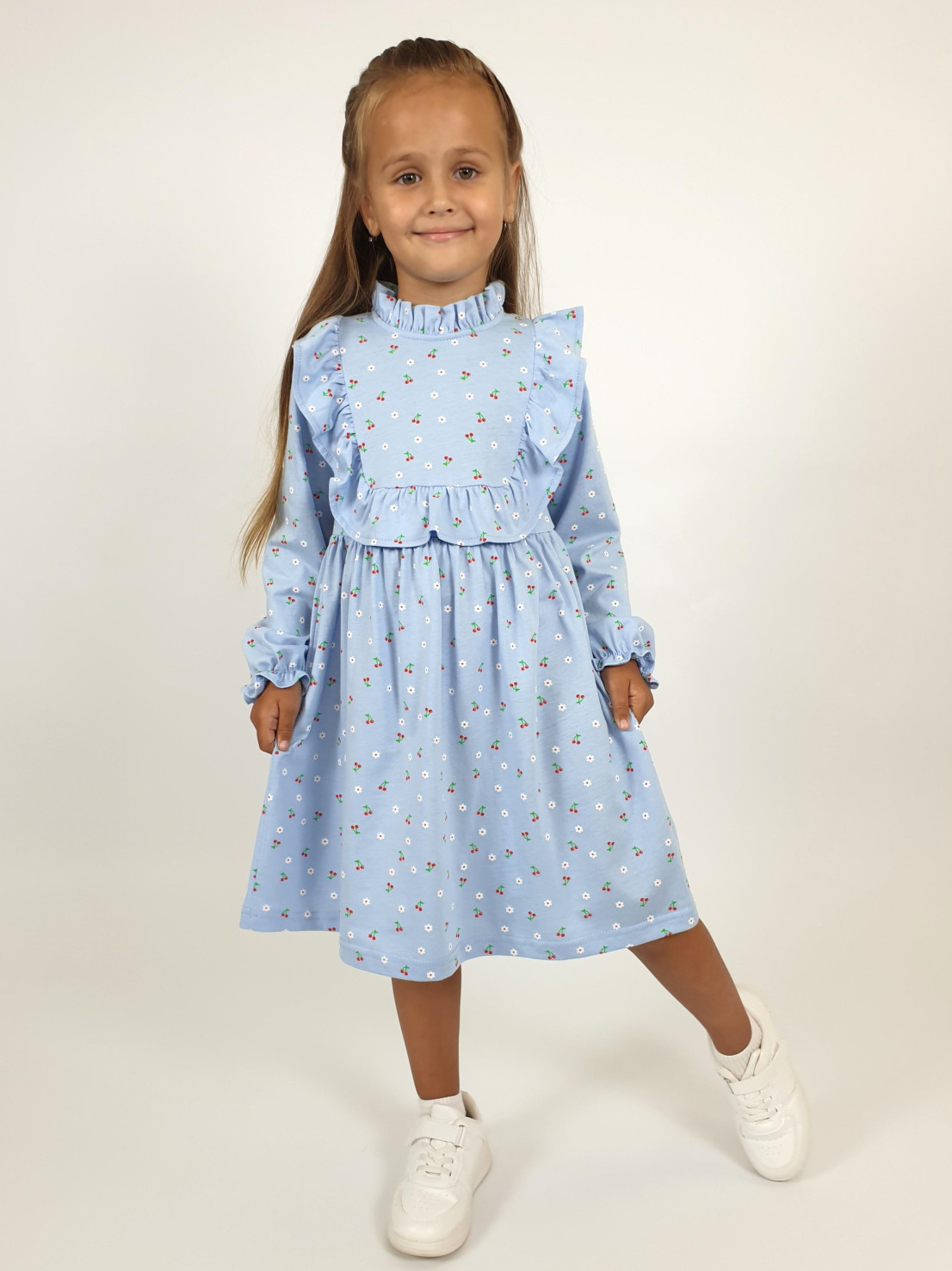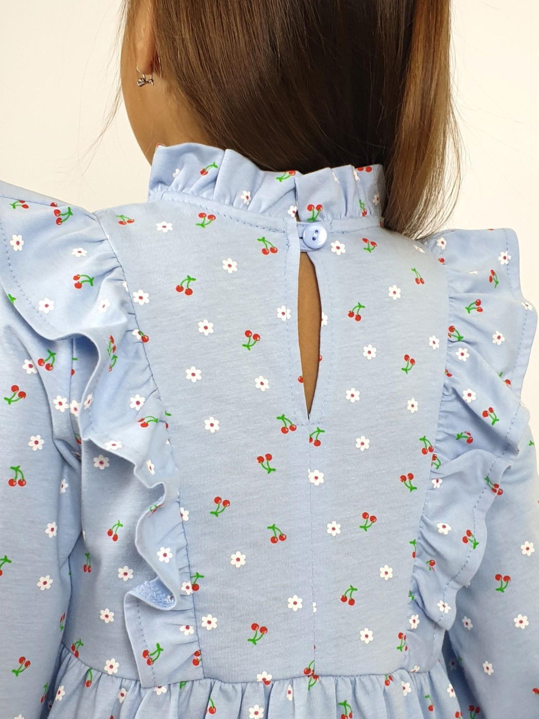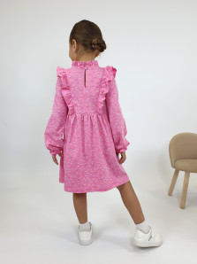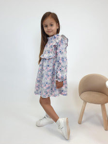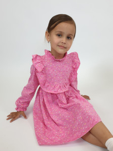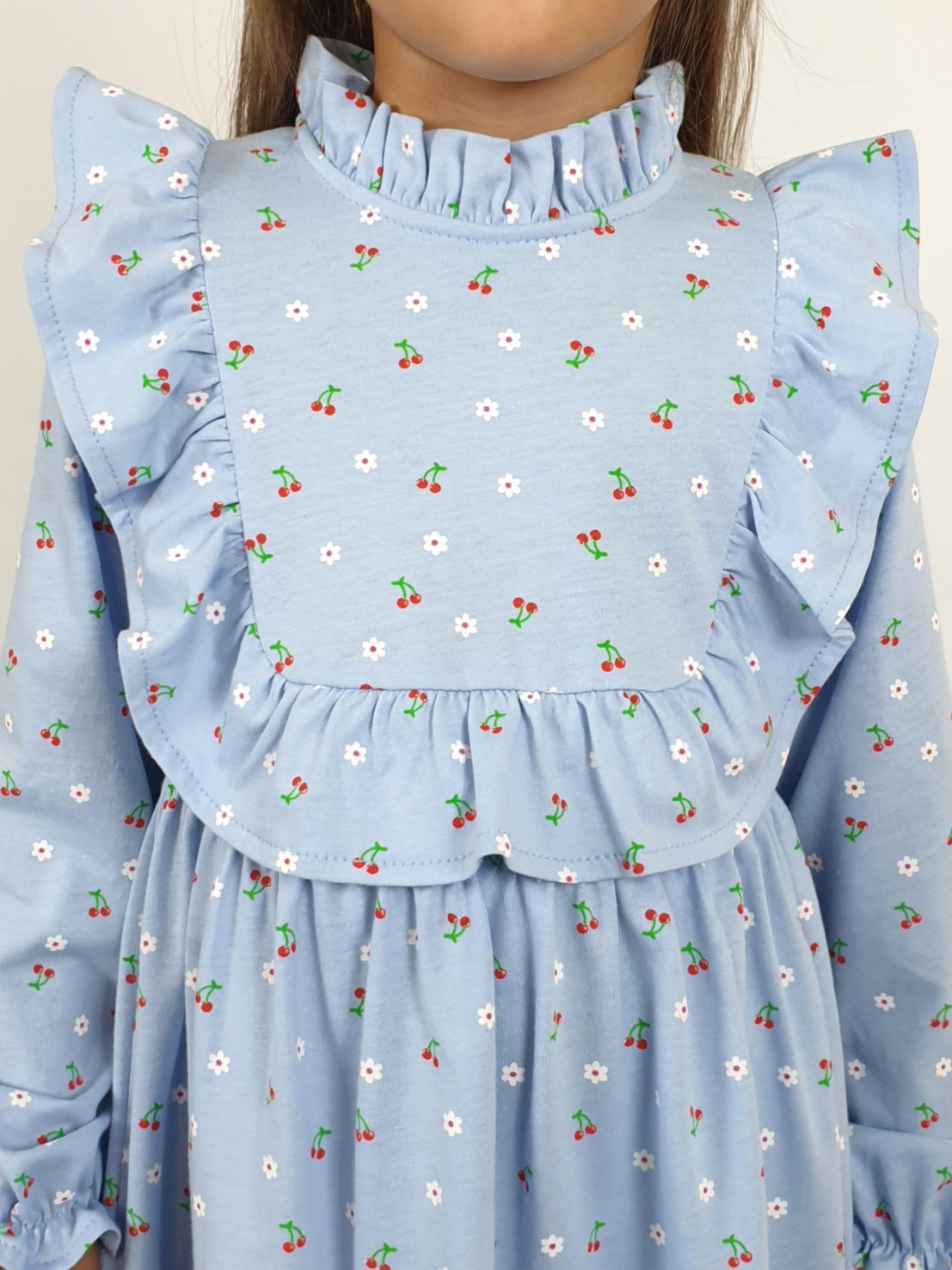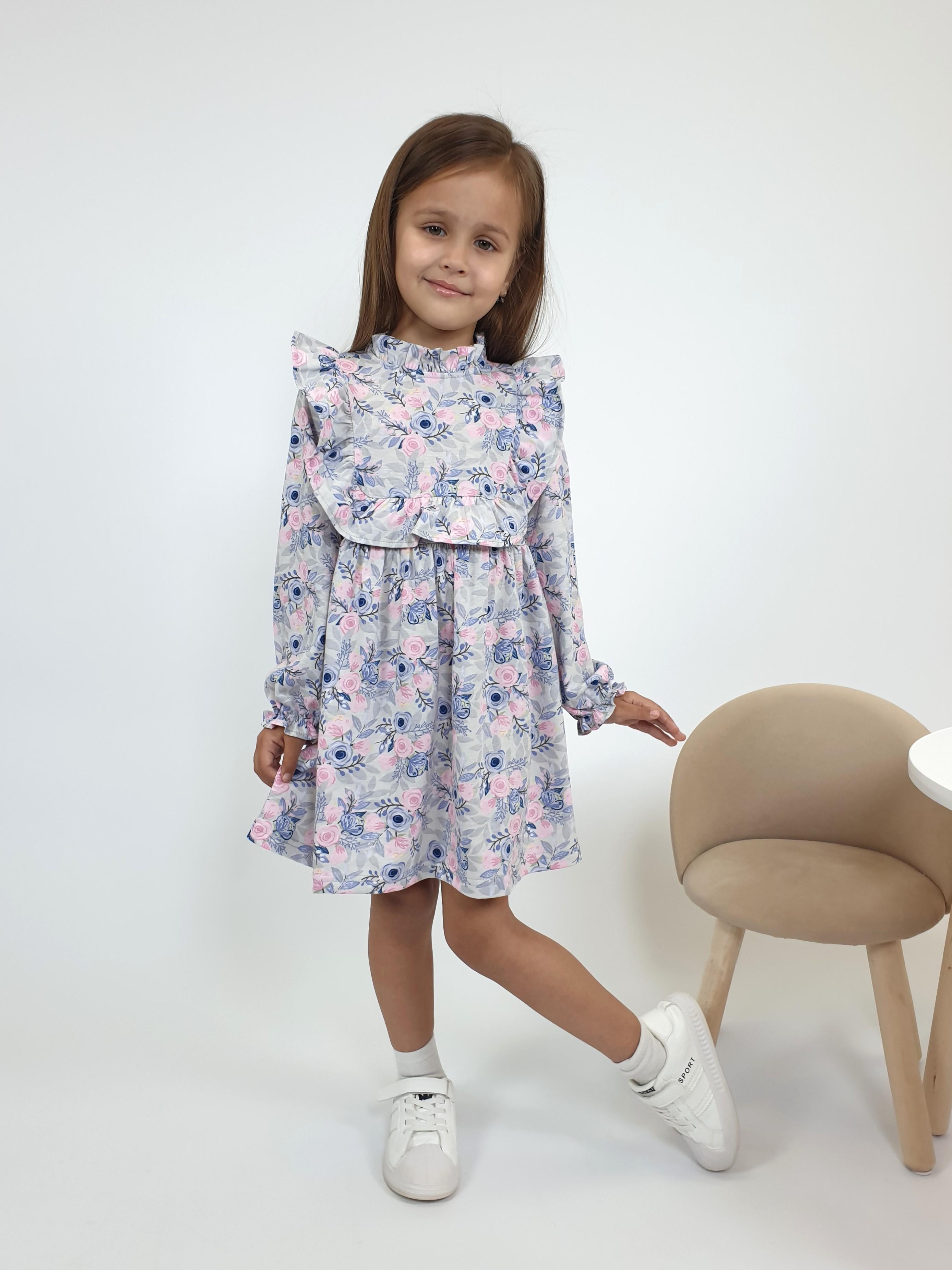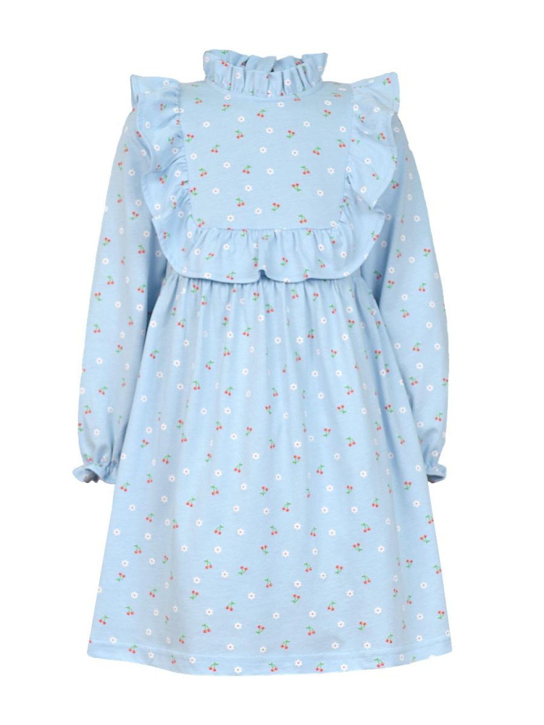 Кулирное полотно (набивка):100%х/б. Платье-отрезная юбка в сборку,кокетка переда и рельефы спинки с рюшей.Рукав длинный,внизу на резинке(венгерке).В горловине рюша со сгибом,шов окантован и подшит.Застежка по спинке на пуговицу.